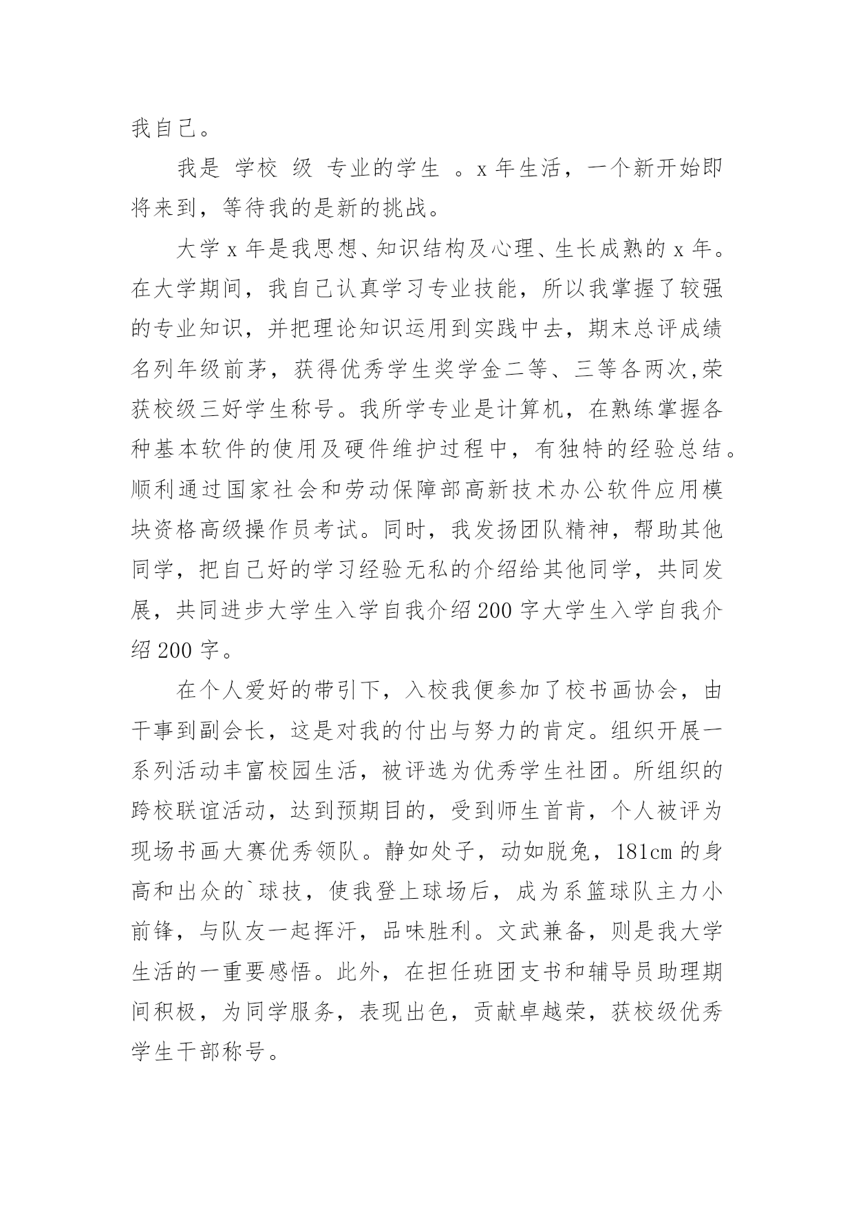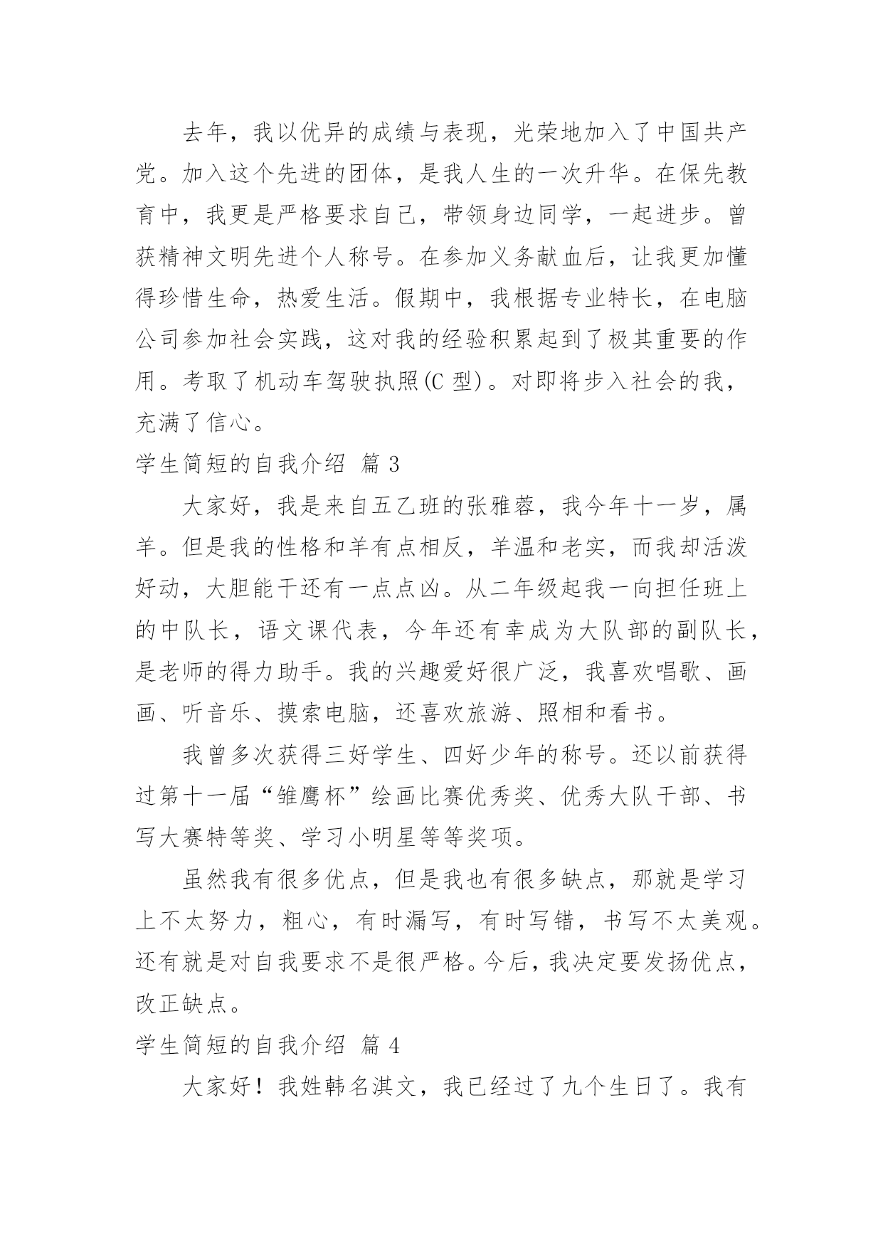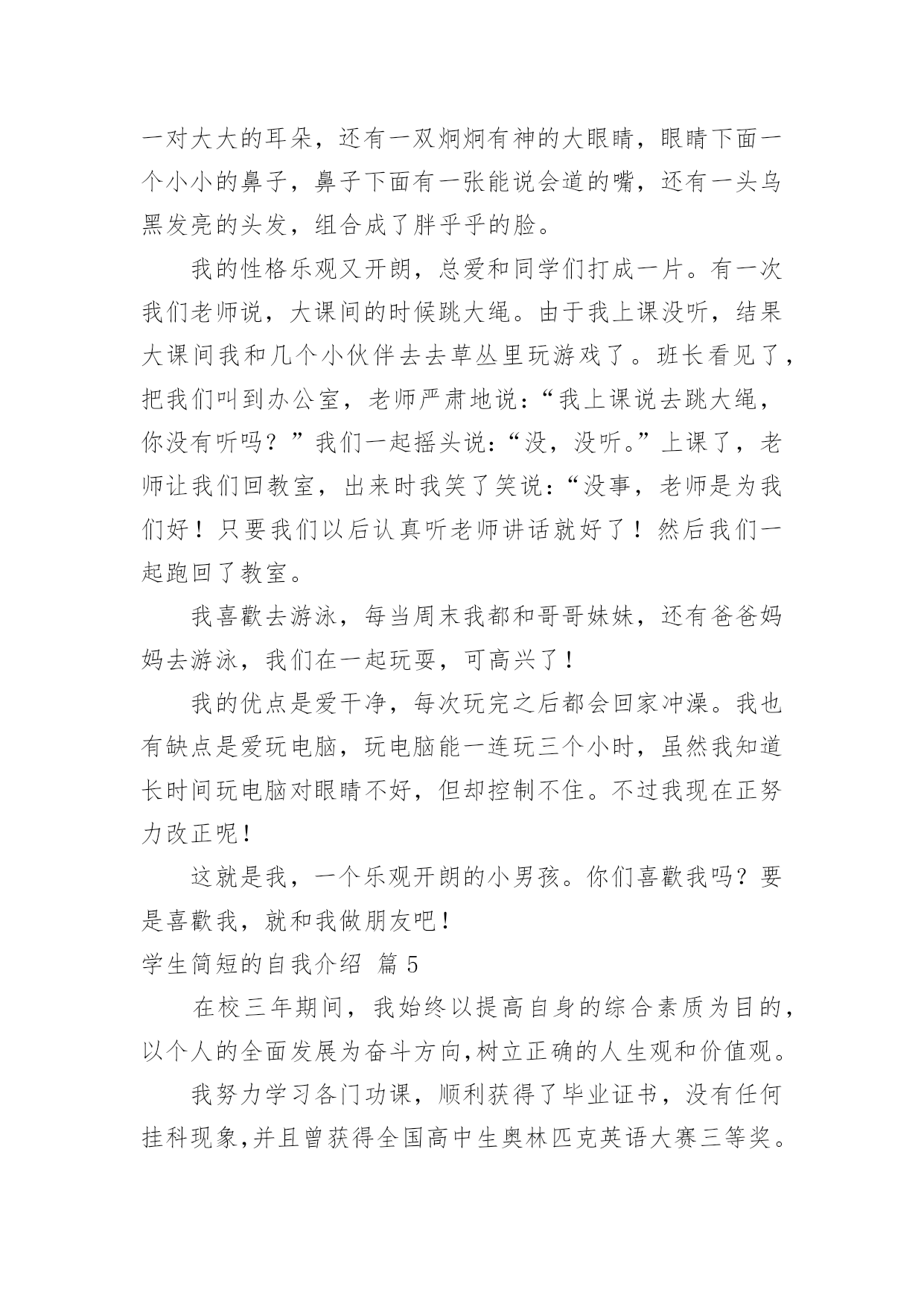 学生简短的自我介绍关于学生简短的自我介绍合集5篇当来到一个陌生的地方时,我们通常会被要求作自我介绍,自我介绍是我们重新认识自己的开始。千万不能认为自我介绍随便应付就可以,下面是小编为大家收集的学生简短的自我介绍5篇,欢迎阅读,希望大家能够喜欢。学生简短的自我介绍篇1我叫夏xx,今年八岁,上小学二年级。我有一张圆圆的脸,乌黑的大眼睛,大大的招风耳。我的头发又黑又亮,还有点卷。其实,我很想留长辫子,可妈妈就是不让我留,我不一样意,但也没办法,只好留了个短发。妈妈告诉我,我的名字很有好处。因为夏朝是中国第一个朝代,尧帝和舜帝是中国最早的最善良的君主,爸爸妈妈给我取这个名字,是期望我将来大有作为。我在班上是个好学生,每一天的作业都能按时完成,做完后也能自我检查。上课时能用心发言,爱帮忙同学,所以老师才选我当她的小助手。在家里我经常帮妈妈干家务,比如拖地板、抹桌子,帮妈妈买菜。爸妈没下班的时候,我还能自我到食堂打饭吃呢。你看,我是不是很棒?你愿意和我做朋友吗?学生简短的自我介绍篇2各位领导好!很荣幸有这样一个机会,让我相各位介绍我自己。我是学校级专业的学生。x年生活,一个新开始即将来到,等待我的是新的挑战。大学x年是我思想、知识结构及心理、生长成熟的x年。在大学期间,我自己认真学习专业技能,所以我掌握了较强的专业知识,并把理论知识运用到实践中去,期末总评成绩名列年级前茅,获得优秀学生奖学金二等、三等各两次,荣获校级三好学生称号。我所学专业是计算机,在熟练掌握各种基本软件的使用及硬件维护过程中,有独特的经验总结。顺利通过国家社会和劳动保障部高新技术办公软件应用模块资格高级操作员考试。同时,我发扬团队精神,帮助其他同学,把自己好的学习经验无私的介绍给其他同学,共同发展,共同进步大学生入学自我介绍200字大学生入学自我介绍200字。在个人爱好的带引下,入校我便参加了校书画协会,由干事到副会长,这是对我的付出与努力的肯定。组织开展一系列活动丰富校园生活,被评选为优秀学生社团。所组织的跨校联谊活动,达到预期目的,受到师生首肯,个人被评为现场书画大赛优秀领队。静如处子,动如脱兔,181cm的身高和出众的`球技,使我登上球场后,成为系篮球队主力小前锋,与队友一起挥汗,品味胜利。文武兼备,则是我大学生活的一重要感悟。此外,在担任班团支书和辅导员助理期间积极,为同学服务,表现出色,贡献卓越荣,获校级优秀学生干部称号。去年,我以优异的成绩与表现,光荣地加入了中国共产党。加入这个先进的团体,是我人生的一次升华。在保先教育中,我更是严格要求自己,带领身边同学,一起进步。曾获精神文明先进个人称号。在参加义务献血后,让我更加懂得珍惜生命,热爱生活。假期中,我根据专业特长,在电脑公司参加社会实践,这对我的经验积累起到了极其重要的作用。考取了机动车驾驶执照(C型)。对即将步入社会的我,充满了信心。学生简短的自我介绍篇3大家好,我是来自五乙班的张雅蓉,我今年十一岁,属羊。但是我的性格和羊有点相反,羊温和老实,而我却活泼好动,大胆能干还有一点点凶。从二年级起我一向担任班上的中队长,语文课代表,今年还有幸成为大队部的副队长,是老师的得力助手。我的兴趣爱好很广泛,我喜欢唱歌、画画、听音乐、摸索电脑,还喜欢旅游、照相和看书。我曾多次获得三好学生、四好少年的称号。还以前获得过第十一届“雏鹰杯”绘画比赛优秀奖、优秀大队干部、书写大赛特等奖、学习小明星等等奖项。虽然我有很多优点,但是我也有很多缺点,那就是学习上不太努力,粗心,有时漏写,有时写错,书写不太美观。还有就是对自我要求不是很严格。今后,我决定要发扬优点,改正缺点。学生简短的自我介绍篇4大家好!我姓韩名淇文,我已经过了九个生日了。我有一对大大的耳朵,还有一双炯炯有神的大眼睛,眼睛下面一个小小的鼻子,鼻子下面有一张能说会道的嘴,还有一头乌黑发亮的头发,组合成了胖乎乎的脸。我的性格乐观又开朗,总爱和同学们打成一片。有一次我们老师说,大课间的时候跳大绳。由于我上课没听,结果大课间我和几个小伙伴去去草丛里玩游戏了。班长看见了,把我们叫到办公室,老师严肃地说:“我上课说去跳大绳,你没有听吗?”我们一起摇头说:“没,没听。”上课了,老师让我们回教室,出来时我笑了笑说:“没事,老师是为我们好!只要我们以后认真听老师讲话就好了!然后我们一起跑回了教室。我喜歡去游泳,每当周末我都和哥哥妹妹,还有爸爸妈妈去游泳,我们在一起玩耍,可高兴了!我的优点是爱干净,每次玩完之后都会回家冲澡。我也有缺点是爱玩电脑,玩电脑能一连玩三个小时,虽然我知道长时间玩电脑对眼睛不好,但却控制不住。不过我现在正努力改正呢!这就是我,一个乐观开朗的小男孩。你们喜歡我吗?要是喜歡我,就和我做朋友吧!学生简短的自我介绍篇5在校三年期间,我始终以提高自身的综合素质为目的,以个