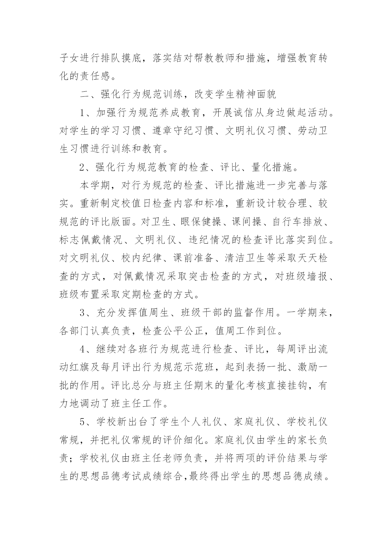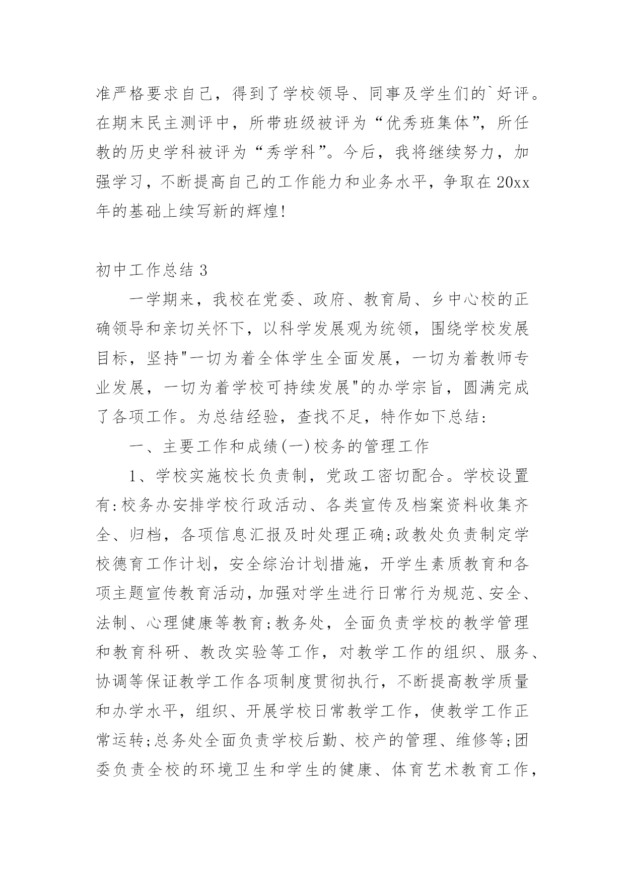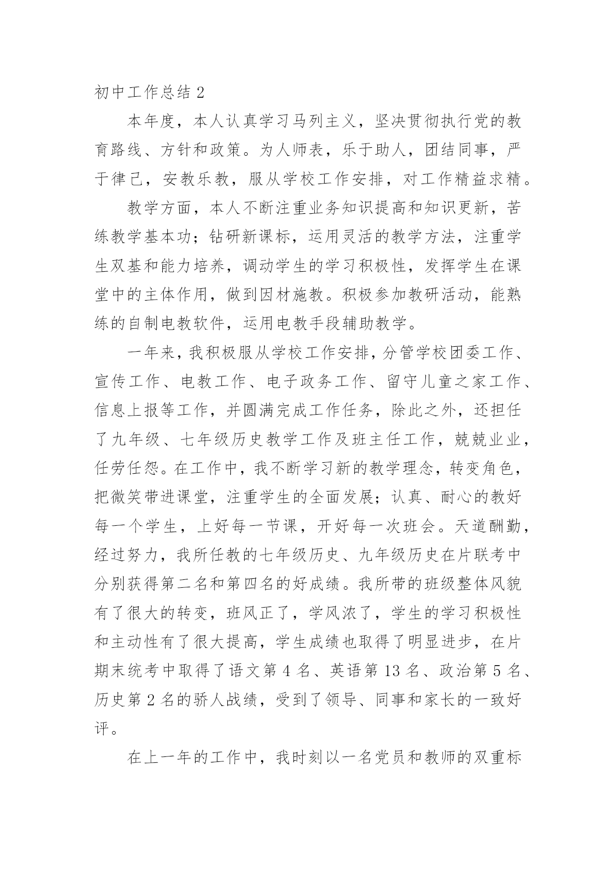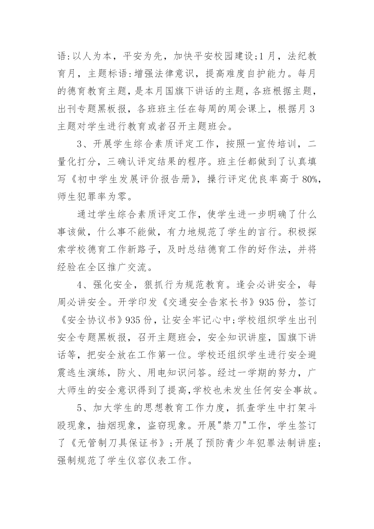 初中工作总结总结就是对一个时期的学习、工作或其完成情况进行一次全面系统的回顾和分析的书面材料,它能够给人努力工作的动力,因此,让我们写一份总结吧。那么总结应该包括什么内容呢?以下是小编收集整理的初中工作总结,欢迎阅读,希望大家能够喜欢。初中工作总结1本学期,根据学期初德育工作计划,我校以《小学生日常行为规范》为抓手,以《小学生守则》为基础,加强对学生的思想道德、行为规范和礼仪常规教育,坚持“突出重点,注重实效”地开展德育工作,围绕校园文化建设,积极开展各类主题教育活动,使学生学会做人,学会求知,学会生活,学会劳动,学会健体,学会审美,努力培养举止文明、日常礼仪、品德优良、心理健康且富有创新精神的一代新人。我们主要做了以下一些工作:一、改进德育工作方法,提高工作实效学校坚持德育为首的工作思路,积极研究德育工作内容,针对新时期德育新问题,提出学校德育工作新思路,改进学校德育工作的方法,努力提高德育工作的效率。1、加强师德师风建设搞好学校的德育工作,离不开一支经验丰富、方法独到的德育工作队伍。组织教师学习《中小学教师职业道德规范》等,使教师具有高尚的职业道德和良好的师表风范。爱生乐教,勤奋工作,勇于创新,乐于奉献。全面关心、爱护暂时落后的学生,杜绝体罚与变相体罚现象。构建平等、民主的师生关系。2、抓好班主任队伍管理适时召开班主任工作会议,与班主任老师一起探讨学校德育工作的方法,布置每月的工作重点和主题教育活动,及时反馈、处理班级中发现的问题。并不断完善班主任岗位职责,工作条例、考核、奖励制度,做好班主任工作的月查,加强班主任工作的过程化管理,并把班主任工作的实绩作为晋升、评优树先的重要依据。3、构建社会、家庭、学校同步教育网络德育工作离不开社会、家庭的配合,为此学校积极构建社会、家庭、学校德育工作网络。通过家长会,及时传达学校中心工作,各项主要活动,教育教学成果,指导家教工作等等。为广大学生、家长提供了一个交流的平台,努力使家庭教育与学校教育能默契配合。4、加强后进生管理做好品德差生的帮教转化工作。本学期,各班都能结合本班实际,做好品德差生的帮教转化工作,建立帮教档案,并制定了具体的帮教措施,记载好帮教情况,努力做到用爱心去关怀他们,用耐心去感化他们,尽量把一些苗头性问题消灭于萌芽状态之中。德育处做了大量的工作,对重点的问题学生“一对一”个别谈心,对本校的'后进生、单亲家庭子女进行排队摸底,落实结对帮教教师和措施,增强教育转化的责任感。二、强化行为规范训练,改变学生精神面貌1、加强行为规范养成教育,开展诚信从身边做起活动。对学生的学习习惯、遵章守纪习惯、文明礼仪习惯、劳动卫生习惯进行训练和教育。2、强化行为规范教育的检查、评比、量化措施。本学期,对行为规范的检查、评比措施进一步完善与落实。重新制定校值日检查内容和标准,重新设计较合理、较规范的评比版面。对卫生、眼保健操、课间操、自行车排放、标志佩戴情况、文明礼仪、违纪情况的检查评比落实到位。对文明礼仪、校内纪律、课前准备、清洁卫生等采取天天检查的方式,对佩戴情况采取突击检查的方式,对班级墙报、班级布置采取定期检查的方式。3、充分发挥值周生、班级干部的监督作用。一学期来,各部门认真负责,检查公平公正,值周工作到位。4、继续对各班行为规范进行检查、评比,每周评出流动红旗及每月评出行为规范示范班,起到表扬一批、激励一批的作用。评比总分与班主任期末的量化考核直接挂钩,有力地调动了班主任工作。5、学校新出台了学生个人礼仪、家庭礼仪、学校礼仪常规,并把礼仪常规的评价细化。家庭礼仪由学生的家长负责;学校礼仪由班主任老师负责,并将两项的评价结果与学生的思想品德考试成绩综合,最终得出学生的思想品德成绩。通过对学生的行为规范教育,让他们养成文明礼仪、劳动卫生习惯等。通过对行为规范教育的检查、评比,形成班级竞争,促进了全校的行为规范。三、交通安全教育同学们在本学期能够很好的遵守交通规则,上学能够自然成排走进校园,放学后各班能够由小组长负责有组织的离校。同学们能够按交通信号灯的指示过人行横道,不横穿马路。经过全校师生的努力,我校再次获得“平安校园”的光荣称号。四、继续深化健康教育5月份,面对日益蔓延的手足口病,学校推出多项举措加强预防“手足口病”的宣传教育,动员全体师生积极行动起来投入这项工作。向师生们介绍了手足口病的症状、危害、加强监测、发现病例的处理,如何对学生加强健康教育和防治工作指导等;校长利用晨会从手足口病的基本知识、防治要点等集对学生进行了详尽的宣传教育;各班主任利用夕会让学生更进一步的直观地了解了这一传染病的危害性,以引起全体师生的重视;学校对各班教室、食堂等公共场所进行了清洁消毒处理等等。使学校的广大师生加深了对手足口病的认识,科学、有序地做好传染病的预防控制工作,保障了校园卫生安全。如