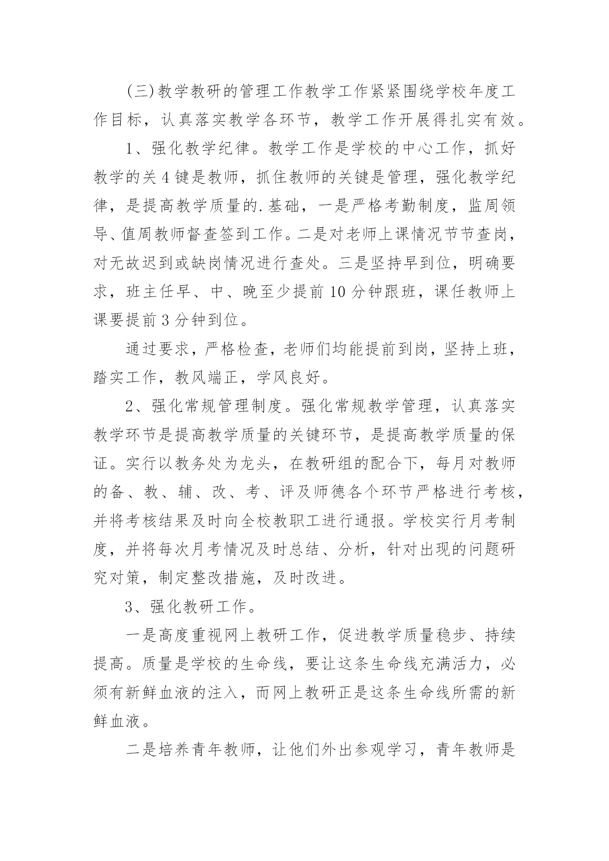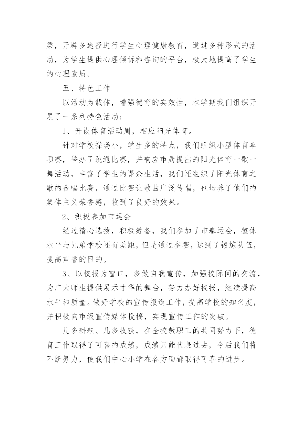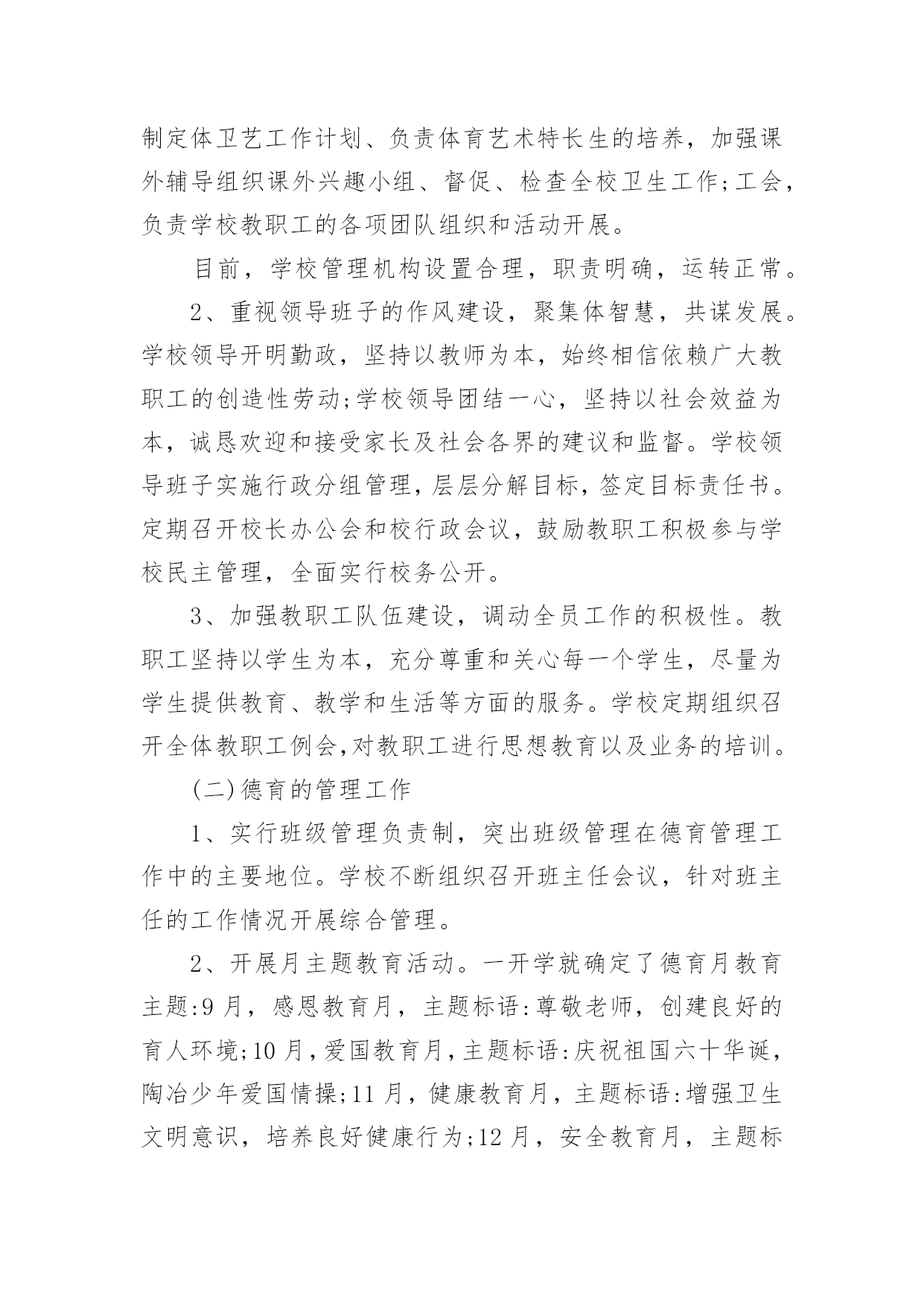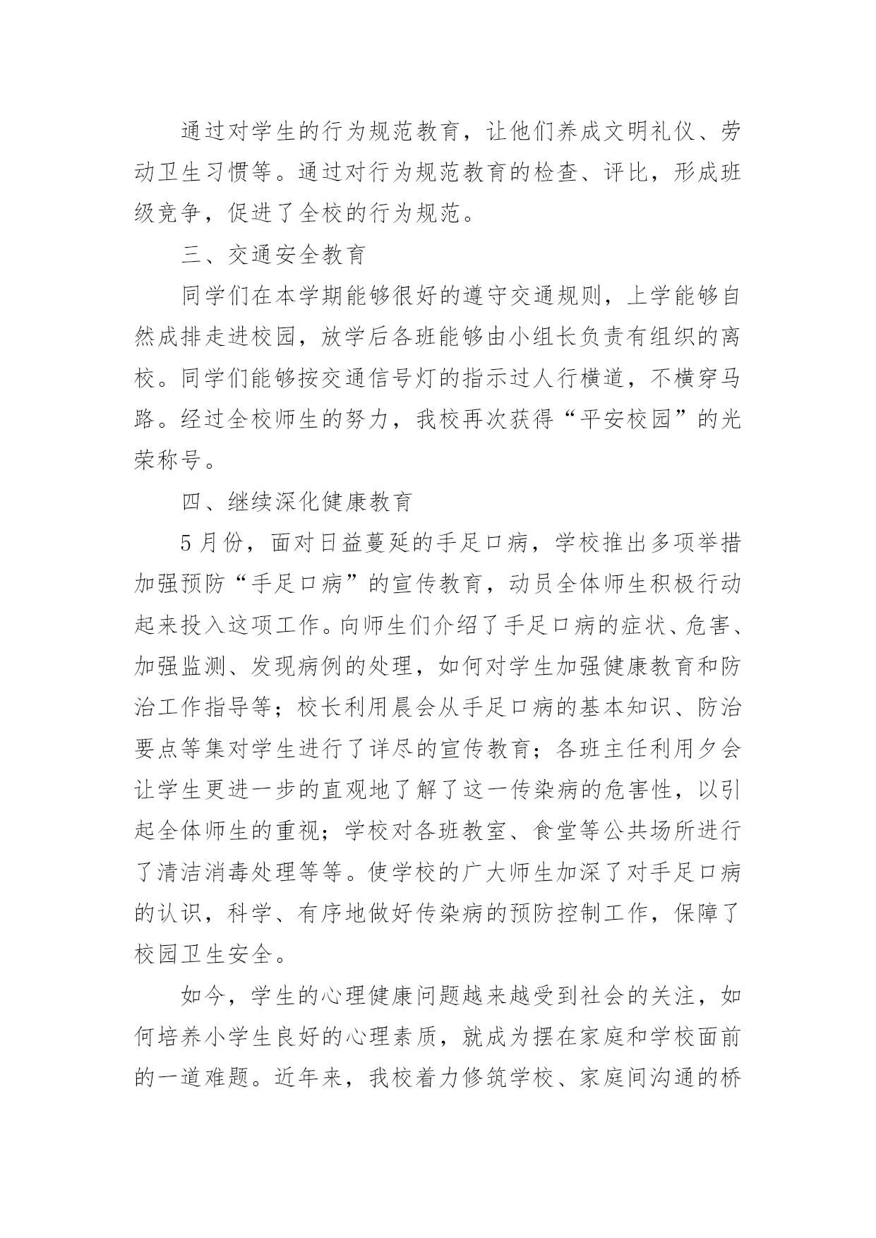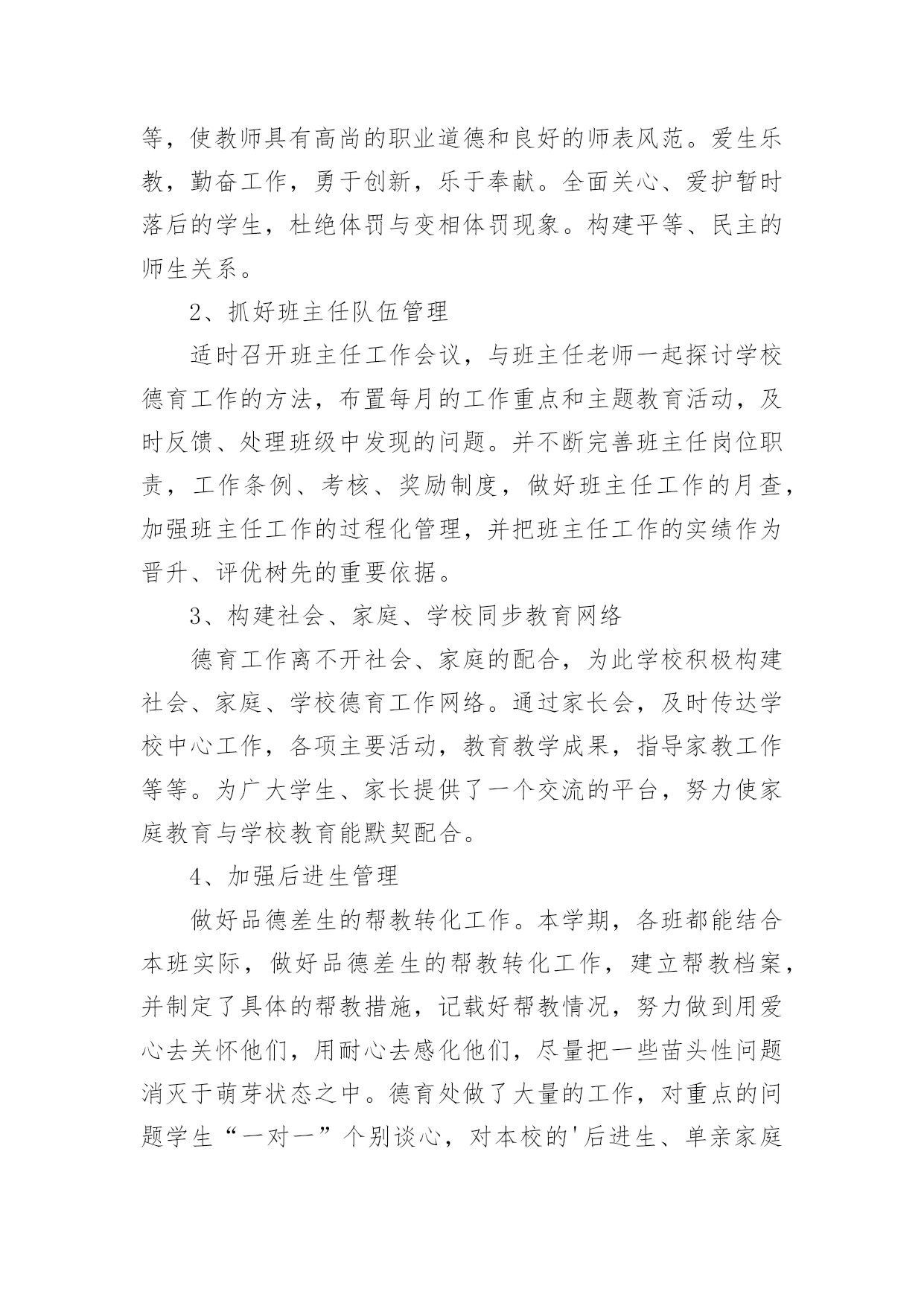 初中工作总结总结就是对一个时期的学习、工作或其完成情况进行一次全面系统的回顾和分析的书面材料,它能够给人努力工作的动力,因此,让我们写一份总结吧。那么总结应该包括什么内容呢?以下是小编收集整理的初中工作总结,欢迎阅读,希望大家能够喜欢。初中工作总结1本学期,根据学期初德育工作计划,我校以《小学生日常行为规范》为抓手,以《小学生守则》为基础,加强对学生的思想道德、行为规范和礼仪常规教育,坚持“突出重点,注重实效”地开展德育工作,围绕校园文化建设,积极开展各类主题教育活动,使学生学会做人,学会求知,学会生活,学会劳动,学会健体,学会审美,努力培养举止文明、日常礼仪、品德优良、心理健康且富有创新精神的一代新人。我们主要做了以下一些工作:一、改进德育工作方法,提高工作实效学校坚持德育为首的工作思路,积极研究德育工作内容,针对新时期德育新问题,提出学校德育工作新思路,改进学校德育工作的方法,努力提高德育工作的效率。1、加强师德师风建设搞好学校的德育工作,离不开一支经验丰富、方法独到的德育工作队伍。组织教师学习《中小学教师职业道德规范》等,使教师具有高尚的职业道德和良好的师表风范。爱生乐教,勤奋工作,勇于创新,乐于奉献。全面关心、爱护暂时落后的学生,杜绝体罚与变相体罚现象。构建平等、民主的师生关系。2、抓好班主任队伍管理适时召开班主任工作会议,与班主任老师一起探讨学校德育工作的方法,布置每月的工作重点和主题教育活动,及时反馈、处理班级中发现的问题。并不断完善班主任岗位职责,工作条例、考核、奖励制度,做好班主任工作的月查,加强班主任工作的过程化管理,并把班主任工作的实绩作为晋升、评优树先的重要依据。3、构建社会、家庭、学校同步教育网络德育工作离不开社会、家庭的配合,为此学校积极构建社会、家庭、学校德育工作网络。通过家长会,及时传达学校中心工作,各项主要活动,教育教学成果,指导家教工作等等。为广大学生、家长提供了一个交流的平台,努力使家庭教育与学校教育能默契配合。4、加强后进生管理做好品德差生的帮教转化工作。本学期,各班都能结合本班实际,做好品德差生的帮教转化工作,建立帮教档案,并制定了具体的帮教措施,记载好帮教情况,努力做到用爱心去关怀他们,用耐心去感化他们,尽量把一些苗头性问题消灭于萌芽状态之中。德育处做了大量的工作,对重点的问题学生“一对一”个别谈心,对本校的'后进生、单亲家庭子女进行排队摸底,落实结对帮教教师和措施,增强教育转化的责任感。二、强化行为规范训练,改变学生精神面貌1、加强行为规范养成教育,开展诚信从身边做起活动。对学生的学习习惯、遵章守纪习惯、文明礼仪习惯、劳动卫生习惯进行训练和教育。2、强化行为规范教育的检查、评比、量化措施。本学期,对行为规范的检查、评比措施进一步完善与落实。重新制定校值日检查内容和标准,重新设计较合理、较规范的评比版面。对卫生、眼保健操、课间操、自行车排放、标志佩戴情况、文明礼仪、违纪情况的检查评比落实到位。对文明礼仪、校内纪律、课前准备、清洁卫生等采取天天检查的方式,对佩戴情况采取突击检查的方式,对班级墙报、班级布置采取定期检查的方式。3、充分发挥值周生、班级干部的监督作用。一学期来,各部门认真负责,检查公平公正,值周工作到位。4、继续对各班行为规范进行检查、评比,每周评出流动红旗及每月评出行为规范示范班,起到表扬一批、激励一批的作用。评比总分与班主任期末的量化考核直接挂钩,有力地调动了班主任工作。5、学校新出台了学生个人礼仪、家庭礼仪、学校礼仪常规,并把礼仪常规的评价细化。家庭礼仪由学生的家长负责;学校礼仪由班主任老师负责,并将两项的评价结果与学生的思想品德考试成绩综合,最终得出学生的思想品德成绩。通过对学生的行为规范教育,让他们养成文明礼仪、劳动卫生习惯等。通过对行为规范教育的检查、评比,形成班级竞争,促进了全校的行为规范。三、交通安全教育同学们在本学期能够很好的遵守交通规则,上学能够自然成排走进校园,放学后各班能够由小组长负责有组织的离校。同学们能够按交通信号灯的指示过人行横道,不横穿马路。经过全校师生的努力,我校再次获得“平安校园”的光荣称号。四、继续深化健康教育5月份,面对日益蔓延的手足口病,学校推出多项举措加强预防“手足口病”的宣传教育,动员全体师生积极行动起来投入这项工作。向师生们介绍了手足口病的症状、危害、加强监测、发现病例的处理,如何对学生加强健康教育和防治工作指导等;校长利用晨会从手足口病的基本知识、防治要点等集对学生进行了详尽的宣传教育;各班主任利用夕会让学生更进一步的直观地了解了这一传染病的危害性,以引起全体师生的重视;学校对各班教室、食堂等公共场所进行了清洁消毒处理等等。使学校的广大师生加深了对手足口病的认识,科学、有序地做好传染病的预防控制工作,保障了校园卫生安全。如