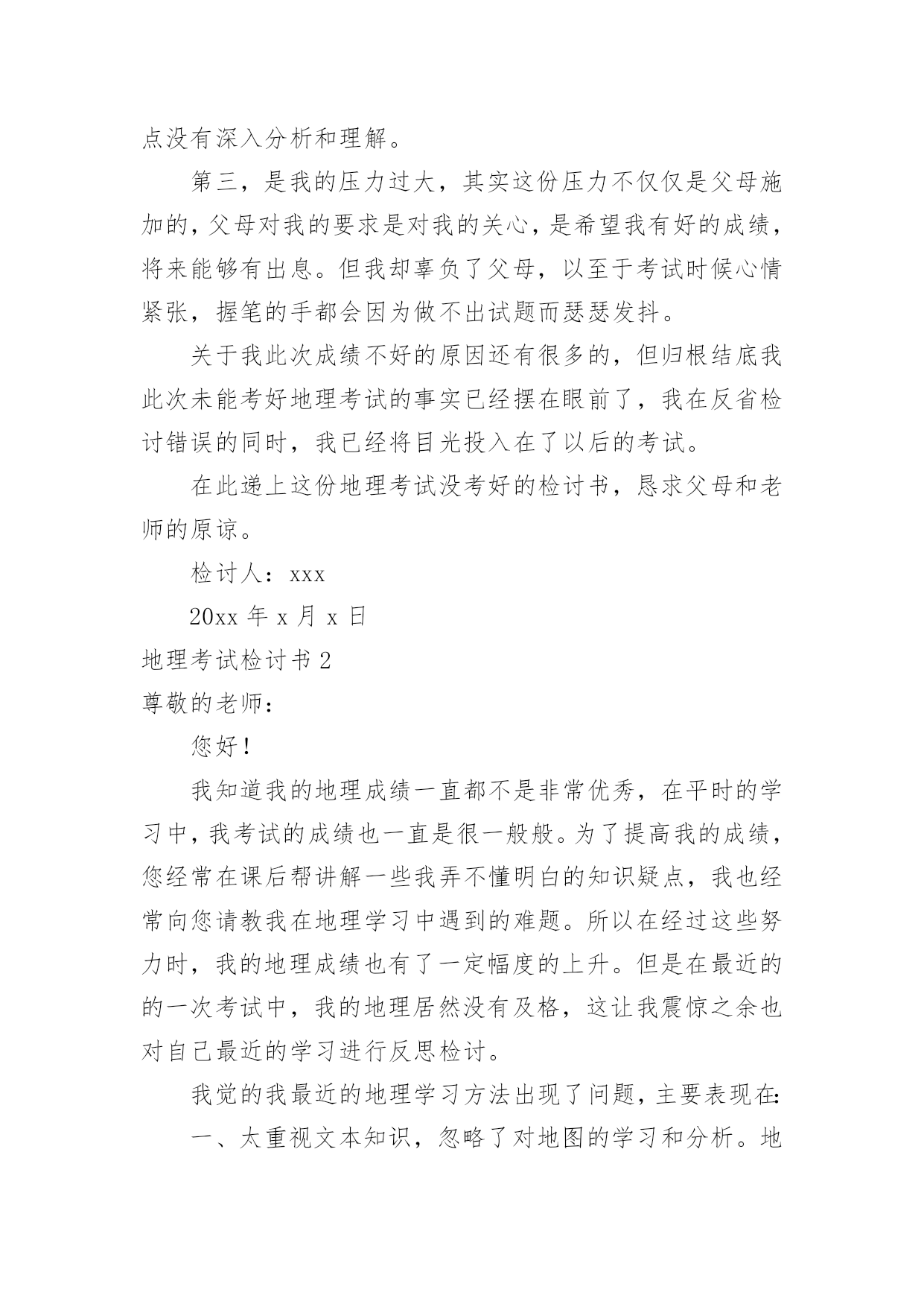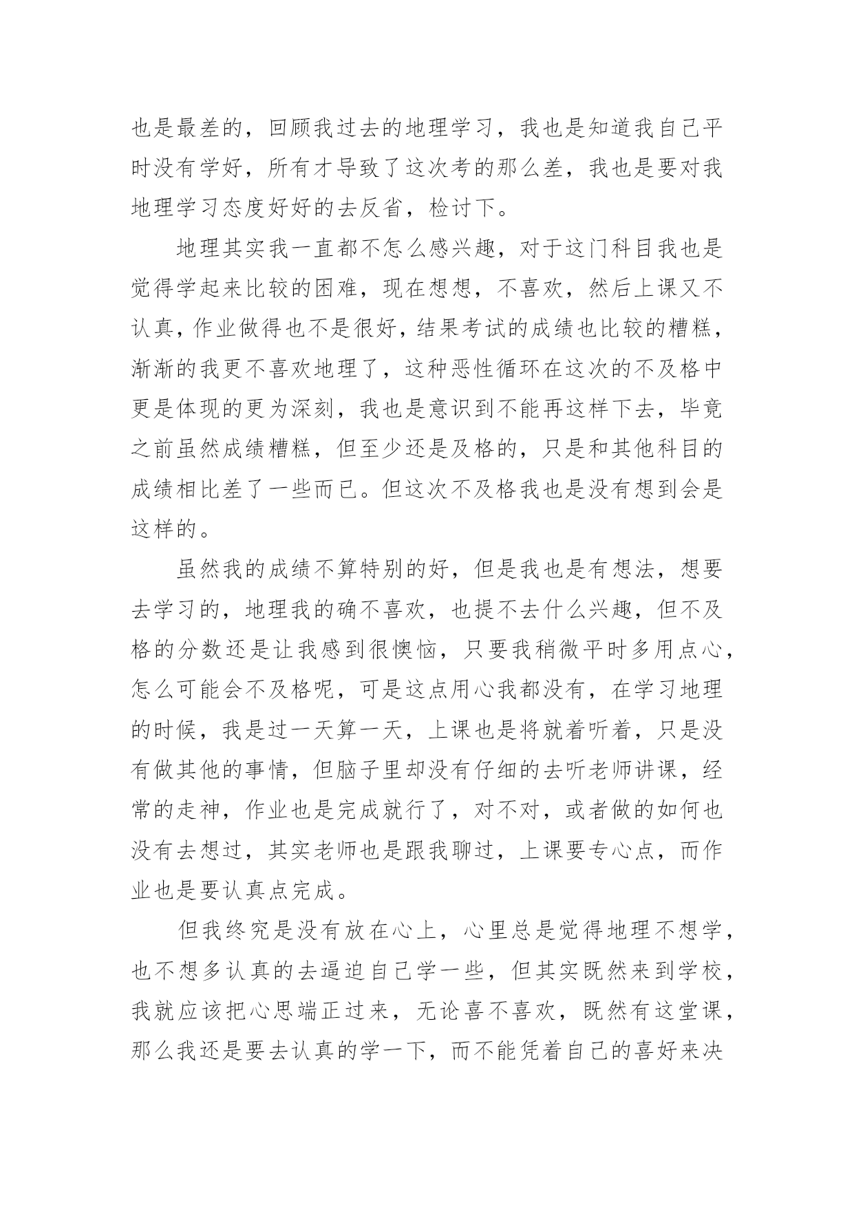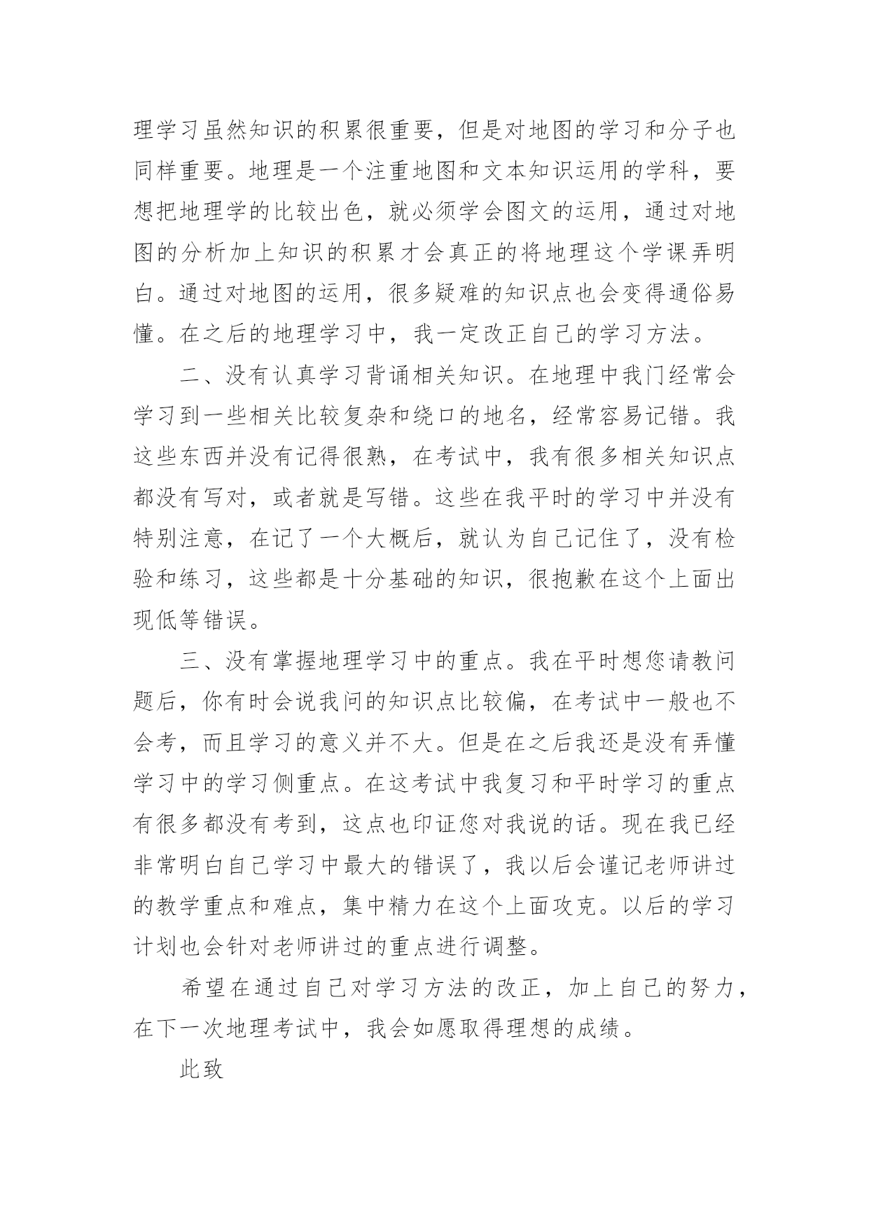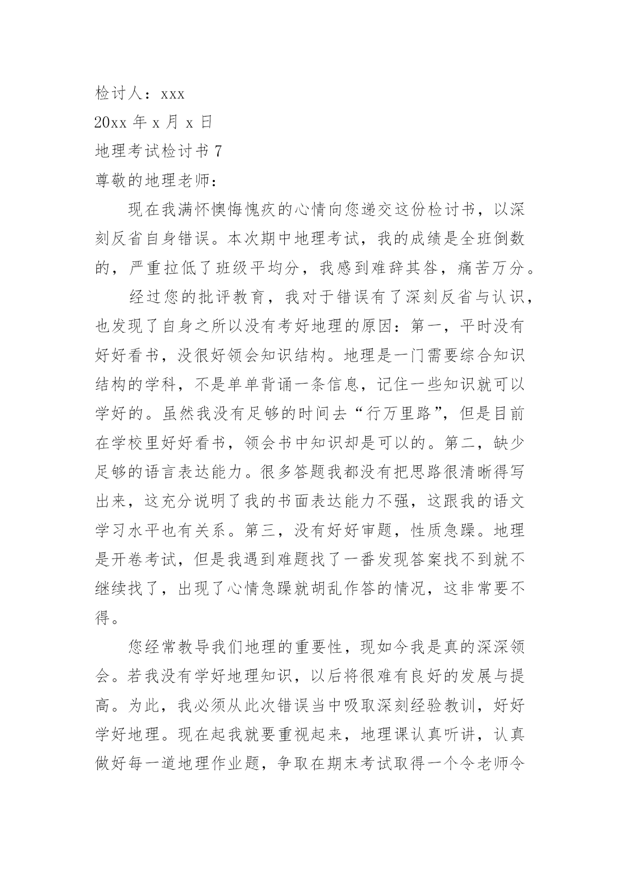 地理考试检讨书地理考试检讨书在学习、工作或生活中出现了过错后,为了避免再犯,我们要认真地反思检讨,请注意写检讨书的心态要端正。想写检讨书却不知道该请教谁?以下是小编帮大家整理的地理考试检讨书,欢迎阅读,希望大家能够喜欢。地理考试检讨书1尊敬的老师:您好!很遗憾地向你们递交这份地理考试没考好的检讨书。关于我此次的地理考试我未能及格,我感到深深地自责。我绝对有些对不起父母的关心和老师的教导,特此递交这份检讨书,表达我的歉意。关于我此次地理考试的成绩不理想,我总结了如下几点原因:第一,我的学习态度不好。在上半学期的学习当中,因为有时候上课不听讲,思想开小差常常错过老师讲到的知识点,也耽误了学习。第二,我在课后没有及时复习,在上半学期的学习当中要说我上课不听讲还可以在课后通过写练习题弥补过来,但因为总总原因我还是没有去补习回来,因此对于不懂的知识点没有深入分析和理解。第三,是我的压力过大,其实这份压力不仅仅是父母施加的,父母对我的要求是对我的关心,是希望我有好的成绩,将来能够有出息。但我却辜负了父母,以至于考试时候心情紧张,握笔的手都会因为做不出试题而瑟瑟发抖。关于我此次成绩不好的原因还有很多的,但归根结底我此次未能考好地理考试的事实已经摆在眼前了,我在反省检讨错误的同时,我已经将目光投入在了以后的考试。在此递上这份地理考试没考好的检讨书,恳求父母和老师的原谅。检讨人:xxx20xx年x月x日地理考试检讨书2尊敬的老师:您好!我知道我的地理成绩一直都不是非常优秀,在平时的学习中,我考试的成绩也一直是很一般般。为了提高我的成绩,您经常在课后帮讲解一些我弄不懂明白的知识疑点,我也经常向您请教我在地理学习中遇到的难题。所以在经过这些努力时,我的地理成绩也有了一定幅度的上升。但是在最近的的一次考试中,我的地理居然没有及格,这让我震惊之余也对自己最近的学习进行反思检讨。我觉的我最近的地理学习方法出现了问题,主要表现在:一、太重视文本知识,忽略了对地图的学习和分析。地理学习虽然知识的积累很重要,但是对地图的学习和分子也同样重要。地理是一个注重地图和文本知识运用的学科,要想把地理学的比较出色,就必须学会图文的运用,通过对地图的分析加上知识的积累才会真正的将地理这个学课弄明白。通过对地图的运用,很多疑难的知识点也会变得通俗易懂。在之后的地理学习中,我一定改正自己的学习方法。二、没有认真学习背诵相关知识。在地理中我门经常会学习到一些相关比较复杂和绕口的地名,经常容易记错。我这些东西并没有记得很熟,在考试中,我有很多相关知识点都没有写对,或者就是写错。这些在我平时的学习中并没有特别注意,在记了一个大概后,就认为自己记住了,没有检验和练习,这些都是十分基础的知识,很抱歉在这个上面出现低等错误。三、没有掌握地理学习中的重点。我在平时想您请教问题后,你有时会说我问的知识点比较偏,在考试中一般也不会考,而且学习的意义并不大。但是在之后我还是没有弄懂学习中的学习侧重点。在这考试中我复习和平时学习的重点有很多都没有考到,这点也印证您对我说的话。现在我已经非常明白自己学习中最大的错误了,我以后会谨记老师讲过的教学重点和难点,集中精力在这个上面攻克。以后的学习计划也会针对老师讲过的重点进行调整。希望在通过自己对学习方法的改正,加上自己的努力,在下一次地理考试中,我会如愿取得理想的成绩。此致敬礼!检讨人:xxx20xx年xx月xx日地理考试检讨书3尊敬的老师:您好!我是高一x班的xxx,这次的地理考试,我没有考好,不但是不及格,还是整个年级的最后一名。分数更是少的可怜,倒数第二名的分数居然还是我的两倍。地理科目其实并不是特别难的,只要理解了,稍微记住了一些,其实考试还是能及格的,可是我却考得那么差,可以说像一个完全没有学过地理的人才会考到这个分数。在课堂上,我不是睡觉,就是看小说,几次被地理老师抓到,劝导我,我都是一副无所谓的样子,反正以后我又不读文科,学这个干嘛,到时候加强突击下,会考及格就好了。而且我对地理一直以来都没什么兴趣,还要记忆那么多东西,还不如做几个物理题目来的好玩。可以说高中的学习,我最喜欢的是物理了,其余的科目我都没有什么太大的兴趣,成绩又不好,还那么偏科,老师您也经常劝导我,希望我改进。一开始我也没怎么放在心里,因为我就想着混过这三年,不用读书了就好了,没想其他的,更不想去读大学,读书对我来说,真的感觉特别累,可是在去年的寒假里面,我去帮我表哥店里的忙,发现工作居然那么艰辛,没有什么假期,每天要讨好客户,而且赚的钱不多,他总是说后悔没读书,不然以后坐在办公室里面,多好啊。从那个时候开始我也渐渐有了自己的想法,觉得这样混日子不是很行,还是要学点东西,那就先从物理开始吧,我最喜欢的就是那门课了。其他的科目我也是会听一下,虽然有时候不想做作业,偷懒,但是