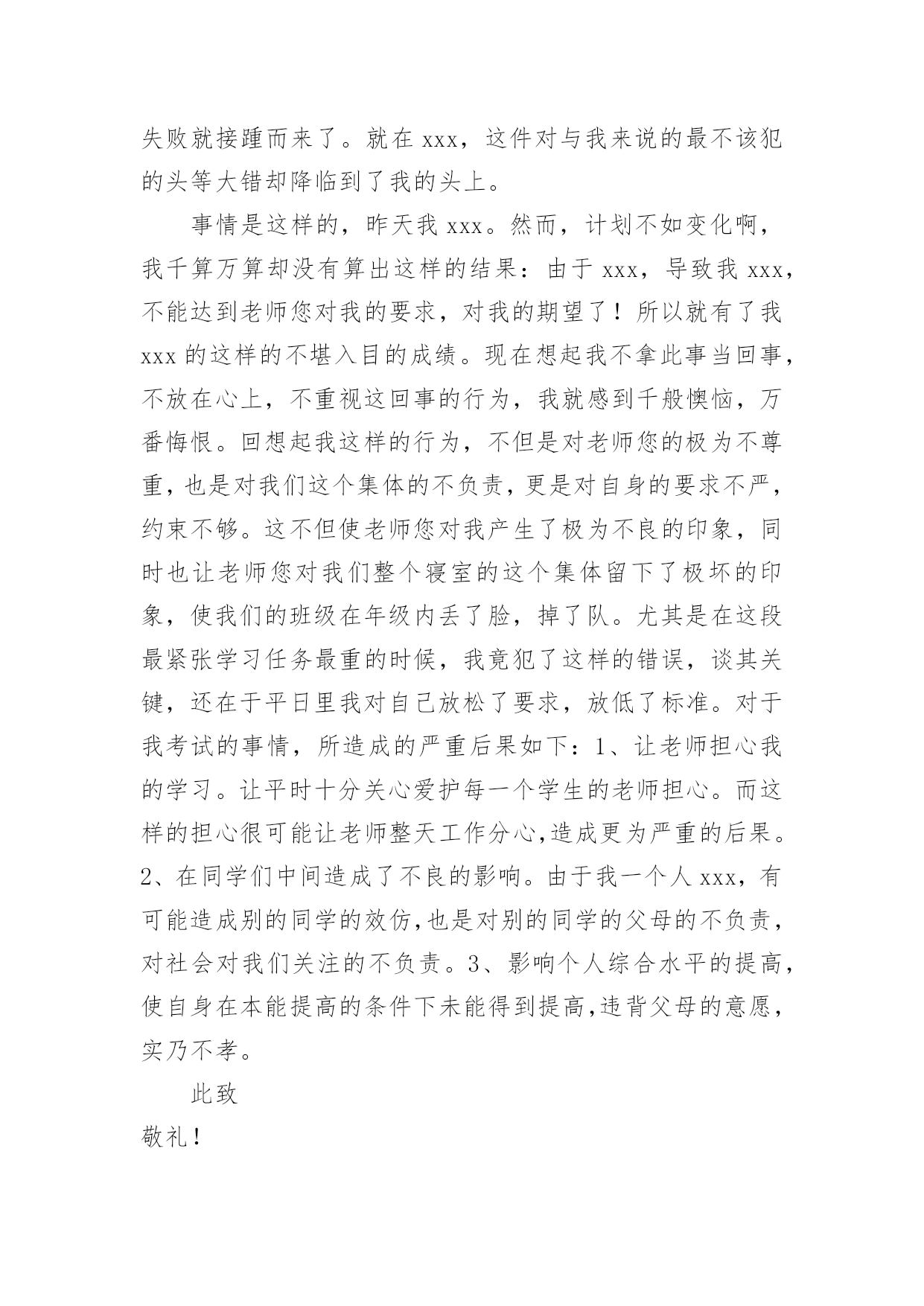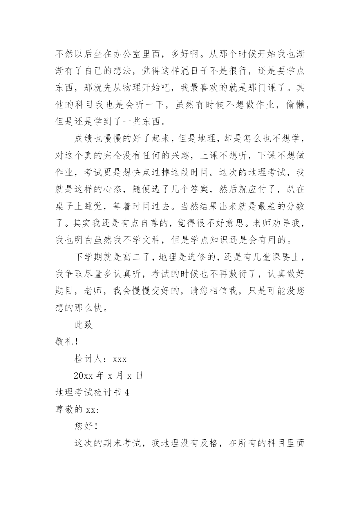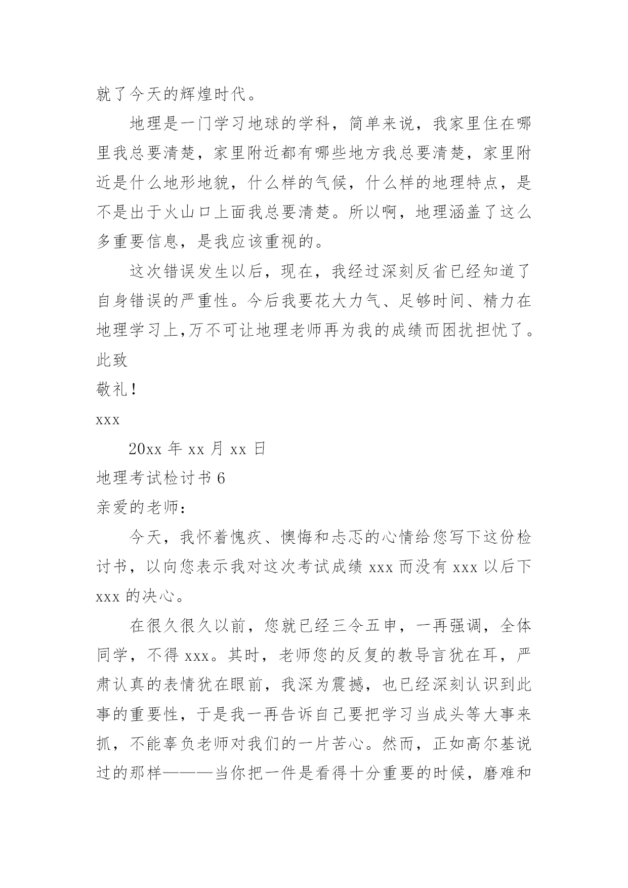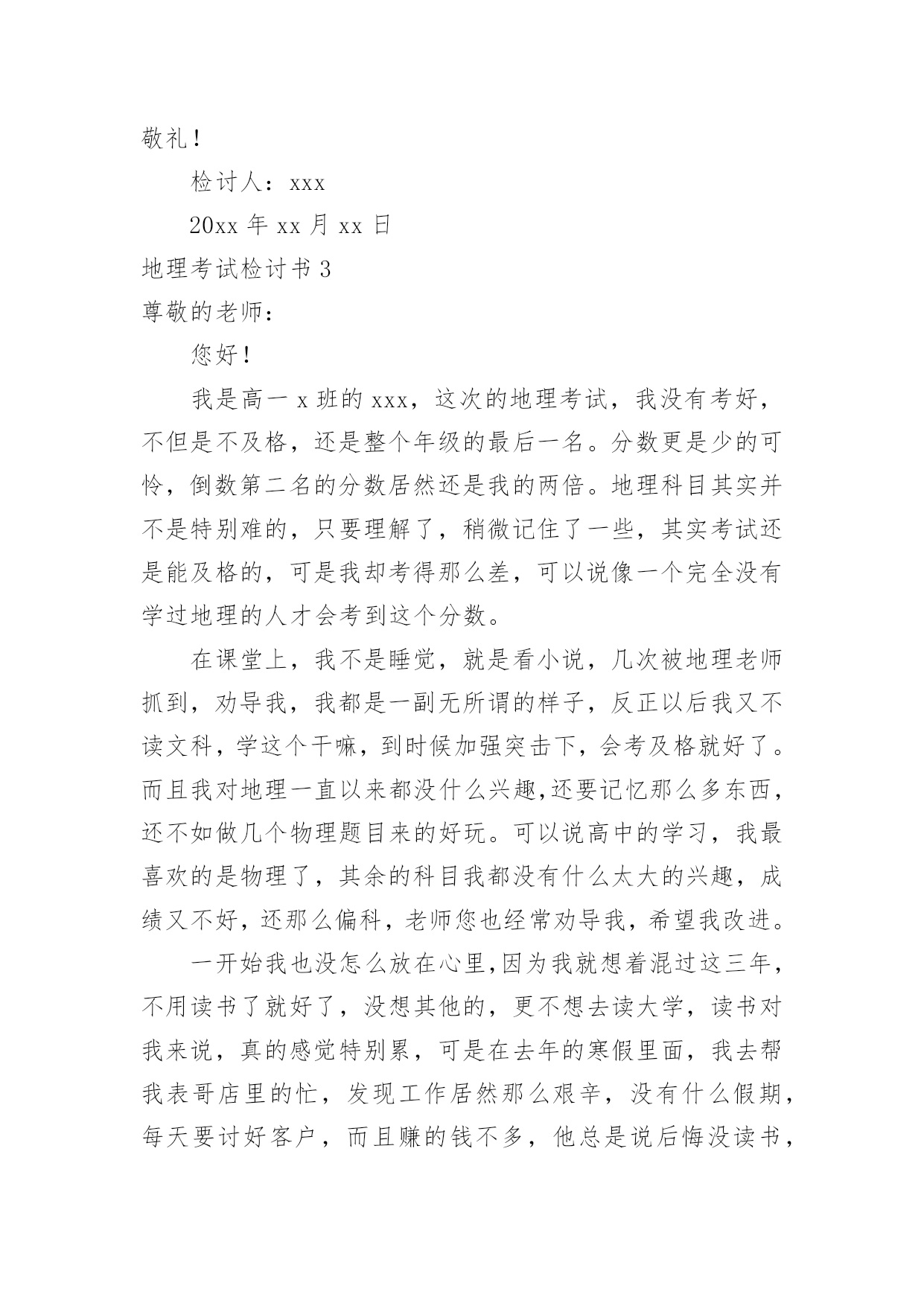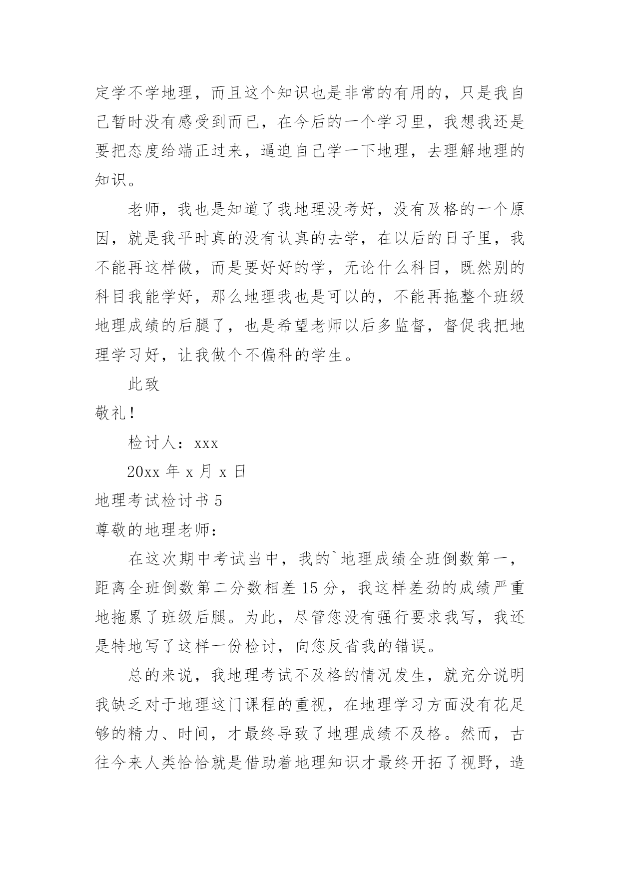 地理考试检讨书地理考试检讨书在学习、工作或生活中出现了过错后,为了避免再犯,我们要认真地反思检讨,请注意写检讨书的心态要端正。想写检讨书却不知道该请教谁?以下是小编帮大家整理的地理考试检讨书,欢迎阅读,希望大家能够喜欢。地理考试检讨书1尊敬的老师:您好!很遗憾地向你们递交这份地理考试没考好的检讨书。关于我此次的地理考试我未能及格,我感到深深地自责。我绝对有些对不起父母的关心和老师的教导,特此递交这份检讨书,表达我的歉意。关于我此次地理考试的成绩不理想,我总结了如下几点原因:第一,我的学习态度不好。在上半学期的学习当中,因为有时候上课不听讲,思想开小差常常错过老师讲到的知识点,也耽误了学习。第二,我在课后没有及时复习,在上半学期的学习当中要说我上课不听讲还可以在课后通过写练习题弥补过来,但因为总总原因我还是没有去补习回来,因此对于不懂的知识点没有深入分析和理解。第三,是我的压力过大,其实这份压力不仅仅是父母施加的,父母对我的要求是对我的关心,是希望我有好的成绩,将来能够有出息。但我却辜负了父母,以至于考试时候心情紧张,握笔的手都会因为做不出试题而瑟瑟发抖。关于我此次成绩不好的原因还有很多的,但归根结底我此次未能考好地理考试的事实已经摆在眼前了,我在反省检讨错误的同时,我已经将目光投入在了以后的考试。在此递上这份地理考试没考好的检讨书,恳求父母和老师的原谅。检讨人:xxx20xx年x月x日地理考试检讨书2尊敬的老师:您好!我知道我的地理成绩一直都不是非常优秀,在平时的学习中,我考试的成绩也一直是很一般般。为了提高我的成绩,您经常在课后帮讲解一些我弄不懂明白的知识疑点,我也经常向您请教我在地理学习中遇到的难题。所以在经过这些努力时,我的地理成绩也有了一定幅度的上升。但是在最近的的一次考试中,我的地理居然没有及格,这让我震惊之余也对自己最近的学习进行反思检讨。我觉的我最近的地理学习方法出现了问题,主要表现在:一、太重视文本知识,忽略了对地图的学习和分析。地理学习虽然知识的积累很重要,但是对地图的学习和分子也同样重要。地理是一个注重地图和文本知识运用的学科,要想把地理学的比较出色,就必须学会图文的运用,通过对地图的分析加上知识的积累才会真正的将地理这个学课弄明白。通过对地图的运用,很多疑难的知识点也会变得通俗易懂。在之后的地理学习中,我一定改正自己的学习方法。二、没有认真学习背诵相关知识。在地理中我门经常会学习到一些相关比较复杂和绕口的地名,经常容易记错。我这些东西并没有记得很熟,在考试中,我有很多相关知识点都没有写对,或者就是写错。这些在我平时的学习中并没有特别注意,在记了一个大概后,就认为自己记住了,没有检验和练习,这些都是十分基础的知识,很抱歉在这个上面出现低等错误。三、没有掌握地理学习中的重点。我在平时想您请教问题后,你有时会说我问的知识点比较偏,在考试中一般也不会考,而且学习的意义并不大。但是在之后我还是没有弄懂学习中的学习侧重点。在这考试中我复习和平时学习的重点有很多都没有考到,这点也印证您对我说的话。现在我已经非常明白自己学习中最大的错误了,我以后会谨记老师讲过的教学重点和难点,集中精力在这个上面攻克。以后的学习计划也会针对老师讲过的重点进行调整。希望在通过自己对学习方法的改正,加上自己的努力,在下一次地理考试中,我会如愿取得理想的成绩。此致敬礼!检讨人:xxx20xx年xx月xx日地理考试检讨书3尊敬的老师:您好!我是高一x班的xxx,这次的地理考试,我没有考好,不但是不及格,还是整个年级的最后一名。分数更是少的可怜,倒数第二名的分数居然还是我的两倍。地理科目其实并不是特别难的,只要理解了,稍微记住了一些,其实考试还是能及格的,可是我却考得那么差,可以说像一个完全没有学过地理的人才会考到这个分数。在课堂上,我不是睡觉,就是看小说,几次被地理老师抓到,劝导我,我都是一副无所谓的样子,反正以后我又不读文科,学这个干嘛,到时候加强突击下,会考及格就好了。而且我对地理一直以来都没什么兴趣,还要记忆那么多东西,还不如做几个物理题目来的好玩。可以说高中的学习,我最喜欢的是物理了,其余的科目我都没有什么太大的兴趣,成绩又不好,还那么偏科,老师您也经常劝导我,希望我改进。一开始我也没怎么放在心里,因为我就想着混过这三年,不用读书了就好了,没想其他的,更不想去读大学,读书对我来说,真的感觉特别累,可是在去年的寒假里面,我去帮我表哥店里的忙,发现工作居然那么艰辛,没有什么假期,每天要讨好客户,而且赚的钱不多,他总是说后悔没读书,不然以后坐在办公室里面,多好啊。从那个时候开始我也渐渐有了自己的想法,觉得这样混日子不是很行,还是要学点东西,那就先从物理开始吧,我最喜欢的就是那门课了。其他的科目我也是会听一下,虽然有时候不想做作业,偷懒,但是