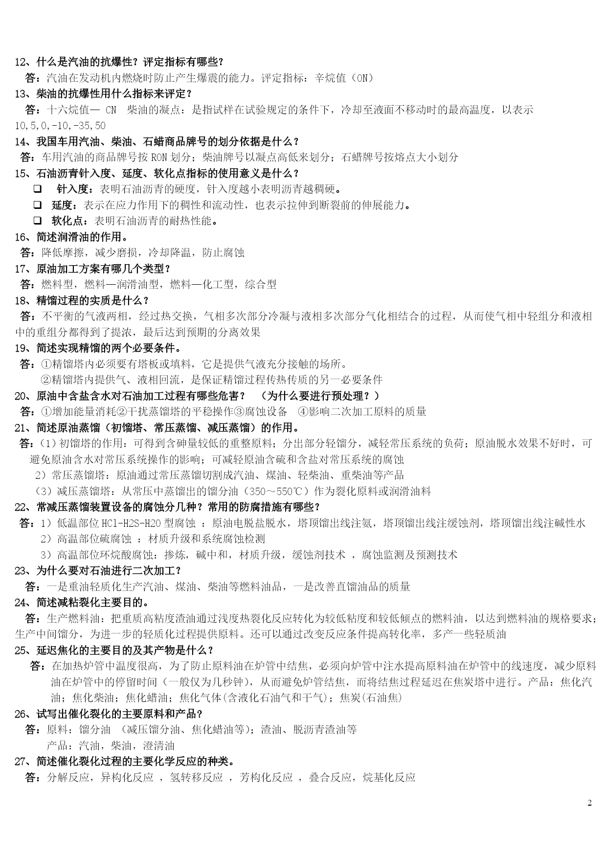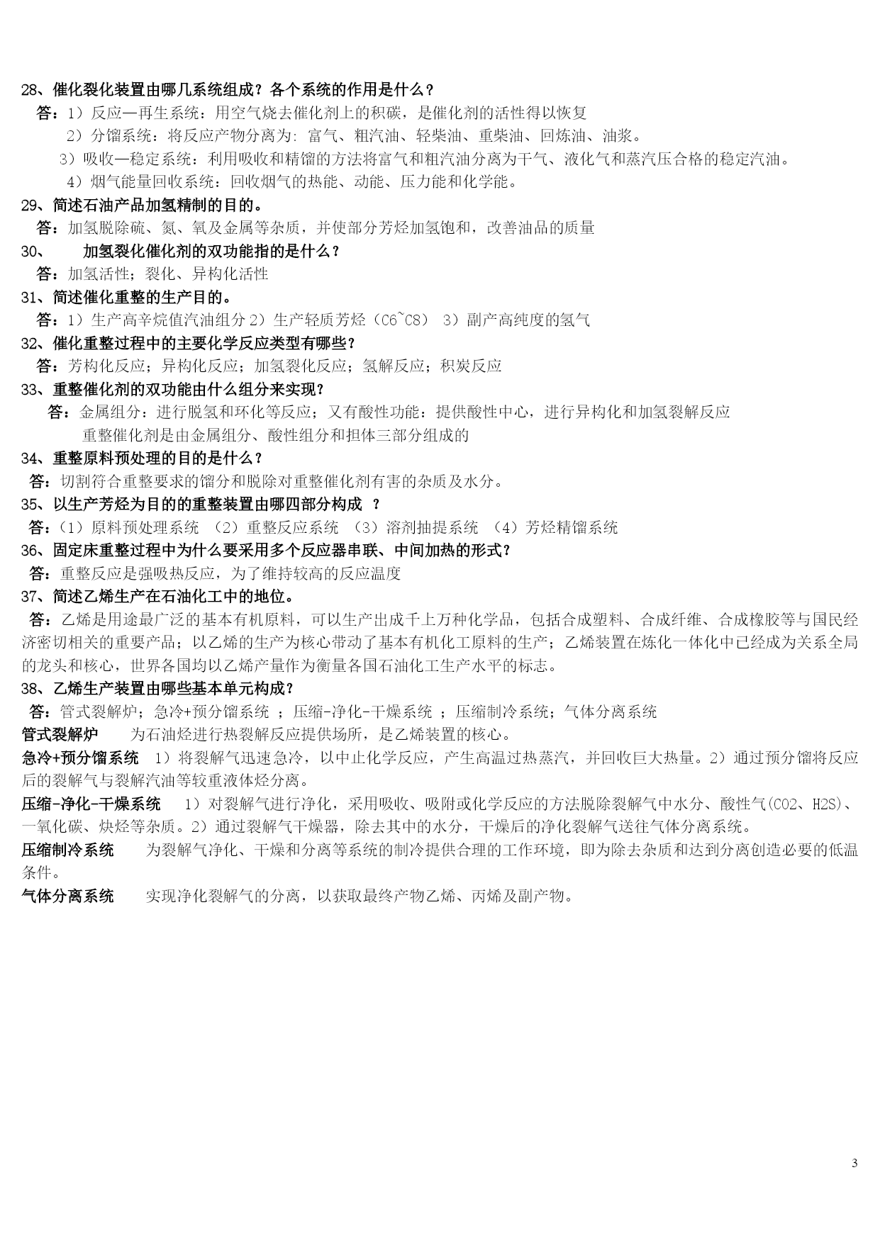 PAGEPAGE31、石油化学工业由哪几部分组成?答:石油炼制工业体系和石油化工体系2、简述石油化学工业在国民经济中的作用。答:石油从20世纪50年代开始就跃居世界能源消费首位,石油及其产品作为重要动力燃料和化工原料广泛应用于国民经济的各个部门,石油化工已成为化学工业中的基干工业,也是近代发达国家的重要基干工业。由石油和天然气出发,生产出一系列石油产品及石油化工中间体、塑料、合成纤维、合成橡胶、合成洗涤剂、溶剂、涂料、农药、染料、医药等与国计民生密切相关的重要产品。3、“三大合成”、“三苯”、“三烯”各指的是什么?答:三大合成;纤维、橡胶、塑料;“三苯”:苯、甲苯、二甲苯;“三烯”:乙烯、丙烯、丁二烯4、石油的一般性质如何?答:石油是由各种元素组成的多种化合物的混合物,绝大多数为黑色,有特殊气味,在常温下多为流动或半流动的粘稠液体,相对密度:大多数介于0.8~0.98之间5、组成石油的主要元素有哪些?答:碳和氢,硫、氧、氮和微量元素石油中有哪些烃类化合物?答:烷烃,环烷烃,芳香烃7、石油中非烃化合物有哪些?对石油加工及石油产品有何危害?答:含硫化合物,含氧化合物,含氮化合物,胶状、沥青状物质危害:腐蚀设备;污染环境;影响二次加工过程(如使催化剂中毒);影响油品质量(安定性差,易生胶)8、概念:蒸气压、馏程、密度与相对密度、凝点、闪点、自燃点蒸气压:在某温度下,液体与其液面上方的蒸汽呈平衡状态时,由此蒸汽所产生的压力称为饱和蒸汽压,简称蒸汽压馏程:初馏点到终馏点这一温度范围密度:单位体积的物质具有的质量相对密度:油品密度与标准温度下水的密度之比凝点:试样在规定条件下冷却至停止移动时的最高温度闪点:用规定的开/闭口闪点测定器所测得的闪点自燃点:在规定条件下,油品在没有火焰时,自发着火的温度9、石油产品分哪六大类?答:F(燃料),L(润滑剂),S(溶剂和化工原料),B(石油沥青),W(石油蜡),C(石油焦10、简述四冲程汽油机/柴油机的工作过程。答:汽油机:1)进气行程:活塞在曲轴的带动下由上止点移至下止点。此时进气门开启,排气门关闭,曲轴转动180°。在活塞移动过程中,汽缸容积逐渐增大(2)压缩行程:压缩行程时,进、排气门同时关闭。活塞从下止点向上止点运动,曲轴转动180°。活塞上移时,工作容积逐渐缩小,缸内混合气受压缩后压力和温度不断升高(3)做功行程:当活塞接近上止点时,由火花塞点燃可燃混合气,混合气燃烧释放出大量的热能,使汽缸内气体的压力和温度迅速提高。(4)排气行程:排气行程时,排气门开启,进气门仍然关闭,活塞从下止点向上止点运动,曲轴转动180°。排气门开启时,燃烧后的废气一方面在汽缸内外压差作用下向缸外排出,另一方面通过活塞的排挤作用向缸外排气。柴油机:过程与汽油机一样,但第三应为:(3)膨胀(做功)冲程。当活塞上行将终了时,喷油器开始将柴油喷人气缸,与空气混合成可燃混合气,并立即自燃,使汽缸内气体的压力和温度迅速提高11、汽油馏程、蒸气压指标的含义及其使用意义是什么?答:镏程:①t10%:反映了汽油中轻组分的多少。使用意义:用来保证具有良好的启动性②t50%:反映汽油的平均汽化性。意义:用来保证汽车的发动机加速性能、最大功率及爬坡能力③t90%和终馏点:t90%反映了汽油中重组分含量的多少,终馏点(干点)反映了汽油中最重组分的程度。使用意义:用来控制汽油的蒸发完全性及燃烧完全性。蒸气压:蒸气压的大小表明汽油蒸发性的高低。使用意义:控制汽油在使用中不易产生气阻12、什么是汽油的抗爆性?评定指标有哪些?答:汽油在发动机内燃烧时防止产生爆震的能力。评定指标:辛烷值(ON)13、柴油的抗爆性用什么指标来评定?答:十六烷值—CN柴油的凝点:是指试样在试验规定的条件下,冷却至液面不移动时的最高温度,以表示10,5,0,-10,-35,5014、我国车用汽油、柴油、石蜡商品牌号的划分依据是什么?答:车用汽油的商品牌号按RON划分;柴油牌号以凝点高低来划分;石蜡牌号按熔点大小划分15、石油沥青针入度、延度、软化点指标的使用意义是什么?针入度:表明石油沥青的硬度,针入度越小表明沥青越稠硬。延度:表示在应力作用下的稠性和流动性,也表示拉伸到断裂前的伸展能力。软化点:表明石油沥青的耐热性能。16、简述润滑油的作用。答:降低摩擦,减少磨损,冷却降温,防止腐蚀17、原油加工方案有哪几个类型?答:燃料型,燃料—润滑油型,燃料—化工型,综合型18、精馏过程的实质是什么?答:不平衡的气液两相,经过热交换,气相多次部分冷凝与液相多次部分气化相结合的过程,从而使气相中轻组分和液相中的重组分都得到了提浓,最后达到预期的分离效