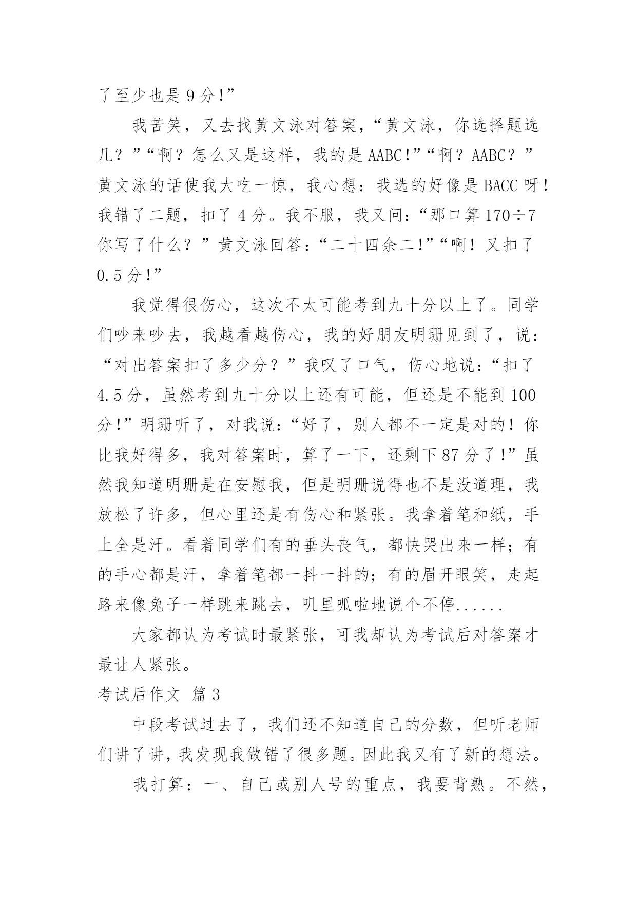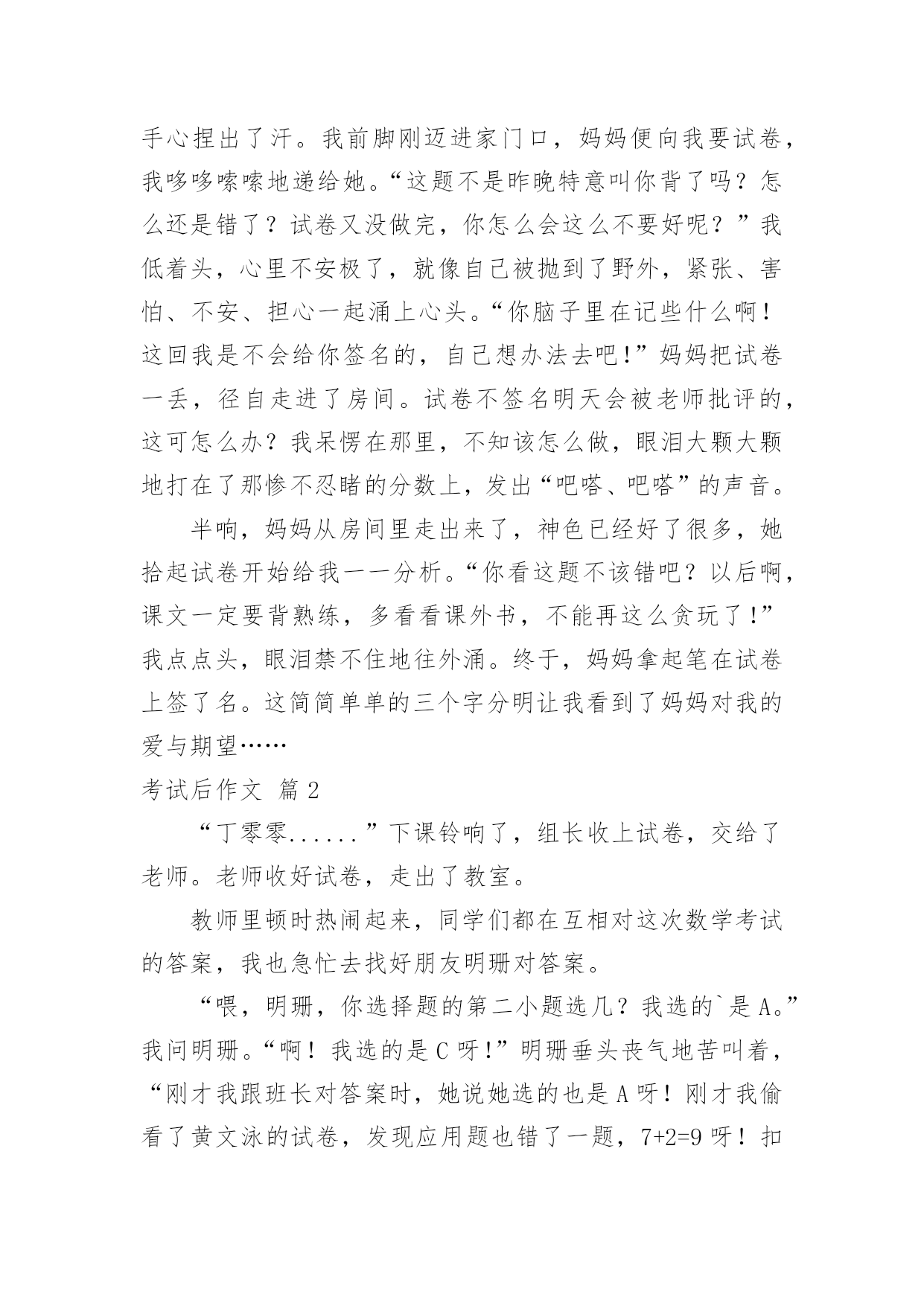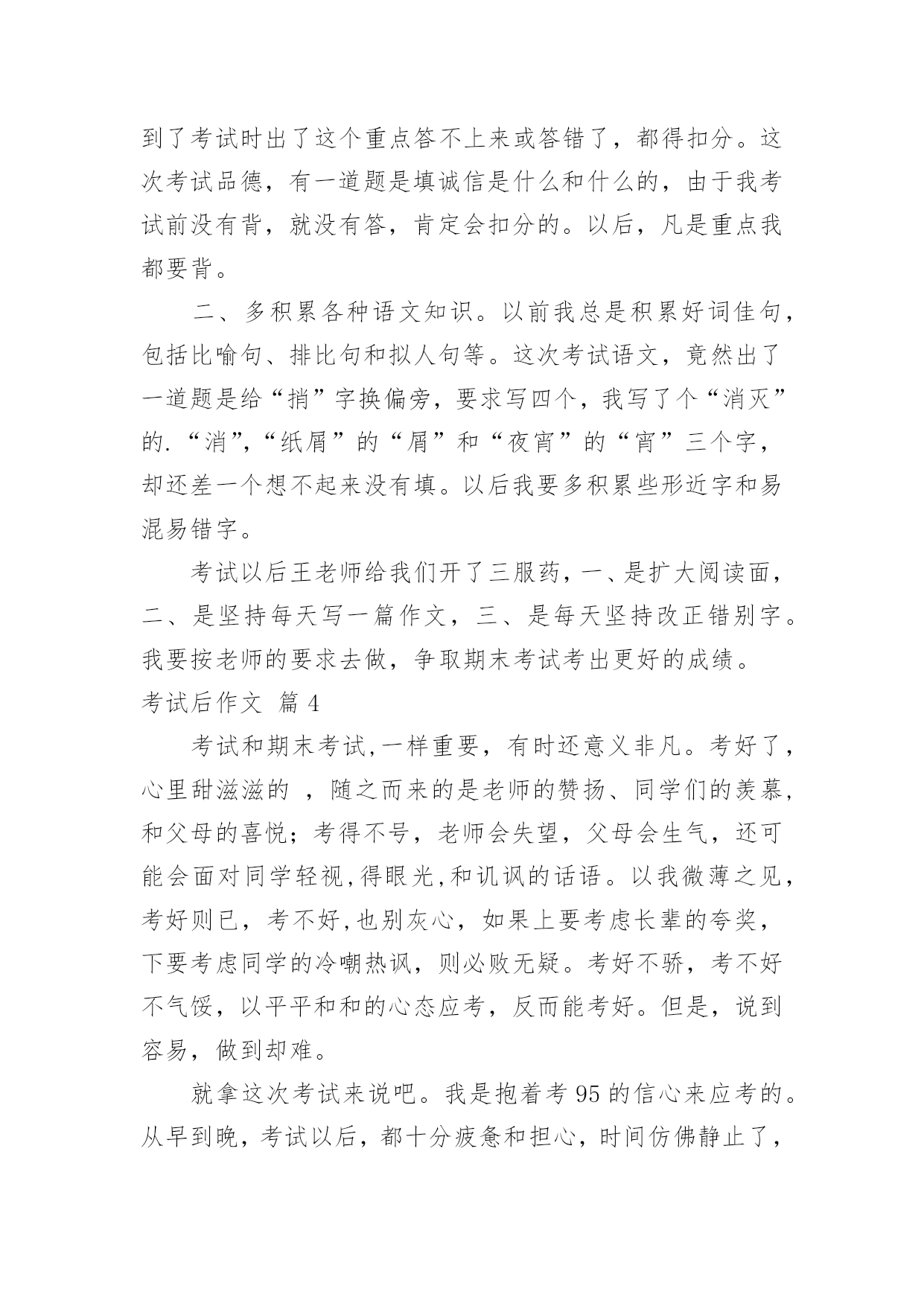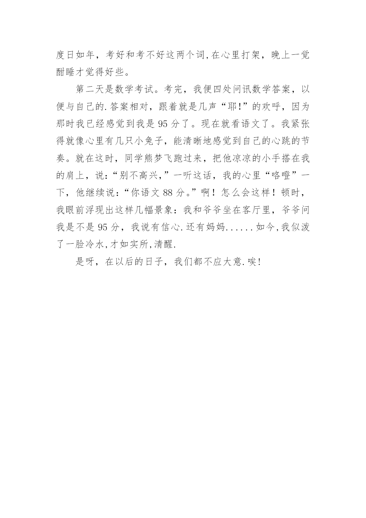 考试后作文【推荐】考试后作文四篇在学习、工作、生活中,许多人都有过写作文的经历,对作文都不陌生吧,写作文是培养人们的观察力、联想力、想象力、思考力和记忆力的重要手段。那要怎么写好作文呢?以下是小编整理的考试后作文4篇,欢迎阅读,希望大家能够喜欢。考试后作文篇1“扑通,扑通,扑通……”听!这是什么声音,考试了?no!no!no!这可是发试卷时我的心跳声。“发试卷了!”“啊,这么快?这……这……这可怎么办?这次考试我太没有把握了。”我暗暗地想着,拳头不禁自觉地打颤。“诺!”我微微张开眯缝着的眼睛,朝着那惨不忍睹的分数瞥了一眼。“78分。”我惊呆了,瞪大眼睛看那白纸上鲜红的分数,那一刻我多么希望是同学跟自己开的玩笑,或许是发错试卷了,可是,一点都没错。放学了,我走在路队的最后边,多希望妈妈临时出差不回家了。可是人算不如天算,妈妈早已在校门口对着我笑。我快步走过去勉强对她咧了咧嘴。“这回试卷发了吗?”“嗯。”“几分呀?”“七、七十八分。”我用眼角瞟了瞟妈妈的.神色。“糟了,仿佛上一秒还是万里无云,下一秒就乌云密布了。”我想着,心里一点边也没有。一路上妈妈再也没说过话,我松开手指又握住,好让自己的心平静一下,直到手心捏出了汗。我前脚刚迈进家门口,妈妈便向我要试卷,我哆哆嗦嗦地递给她。“这题不是昨晚特意叫你背了吗?怎么还是错了?试卷又没做完,你怎么会这么不要好呢?”我低着头,心里不安极了,就像自己被抛到了野外,紧张、害怕、不安、担心一起涌上心头。“你脑子里在记些什么啊!这回我是不会给你签名的,自己想办法去吧!”妈妈把试卷一丢,径自走进了房间。试卷不签名明天会被老师批评的,这可怎么办?我呆愣在那里,不知该怎么做,眼泪大颗大颗地打在了那惨不忍睹的分数上,发出“吧嗒、吧嗒”的声音。半响,妈妈从房间里走出来了,神色已经好了很多,她拾起试卷开始给我一一分析。“你看这题不该错吧?以后啊,课文一定要背熟练,多看看课外书,不能再这么贪玩了!”我点点头,眼泪禁不住地往外涌。终于,妈妈拿起笔在试卷上签了名。这简简单单的三个字分明让我看到了妈妈对我的爱与期望……考试后作文篇2“丁零零......”下课铃响了,组长收上试卷,交给了老师。老师收好试卷,走出了教室。教师里顿时热闹起来,同学们都在互相对这次数学考试的答案,我也急忙去找好朋友明珊对答案。“喂,明珊,你选择题的第二小题选几?我选的`是A。”我问明珊。“啊!我选的是C呀!”明珊垂头丧气地苦叫着,“刚才我跟班长对答案时,她说她选的也是A呀!刚才我偷看了黄文泳的试卷,发现应用题也错了一题,7+2=9呀!扣了至少也是9分!”我苦笑,又去找黄文泳对答案,“黄文泳,你选择题选几?”“啊?怎么又是这样,我的是AABC!”“啊?AABC?”黄文泳的话使我大吃一惊,我心想:我选的好像是BACC呀!我错了二题,扣了4分。我不服,我又问:“那口算170÷7你写了什么?”黄文泳回答:“二十四余二!”“啊!又扣了0.5分!”我觉得很伤心,这次不太可能考到九十分以上了。同学们吵来吵去,我越看越伤心,我的好朋友明珊见到了,说:“对出答案扣了多少分?”我叹了口气,伤心地说:“扣了4.5分,虽然考到九十分以上还有可能,但还是不能到100分!”明珊听了,对我说:“好了,别人都不一定是对的!你比我好得多,我对答案时,算了一下,还剩下87分了!”虽然我知道明珊是在安慰我,但是明珊说得也不是没道理,我放松了许多,但心里还是有伤心和紧张。我拿着笔和纸,手上全是汗。看着同学们有的垂头丧气,都快哭出来一样;有的手心都是汗,拿着笔都一抖一抖的;有的眉开眼笑,走起路来像兔子一样跳来跳去,叽里呱啦地说个不停......大家都认为考试时最紧张,可我却认为考试后对答案才最让人紧张。考试后作文篇3中段考试过去了,我们还不知道自己的分数,但听老师们讲了讲,我发现我做错了很多题。因此我又有了新的想法。我打算:一、自己或别人号的重点,我要背熟。不然,到了考试时出了这个重点答不上来或答错了,都得扣分。这次考试品德,有一道题是填诚信是什么和什么的,由于我考试前没有背,就没有答,肯定会扣分的。以后,凡是重点我都要背。二、多积累各种语文知识。以前我总是积累好词佳句,包括比喻句、排比句和拟人句等。这次考试语文,竟然出了一道题是给“捎”字换偏旁,要求写四个,我写了个“消灭”的.“消”,“纸屑”的“屑”和“夜宵”的“宵”三个字,却还差一个想不起来没有填。以后我要多积累些形近字和易混易错字。考试以后王老师给我们开了三服药,一、是扩大阅读面,二、是坚持每天写一篇作文,三、是每天坚持改正错别字。我要按老师的要求去做,争取期末考试考出更好的成绩。考试后作文篇4考试和期末考试,一样重要,有时还意义非凡。考好了,心里甜滋滋的,随之而来的是老师的赞扬、同学们的羡慕,和父母的喜悦;考得不号,老师