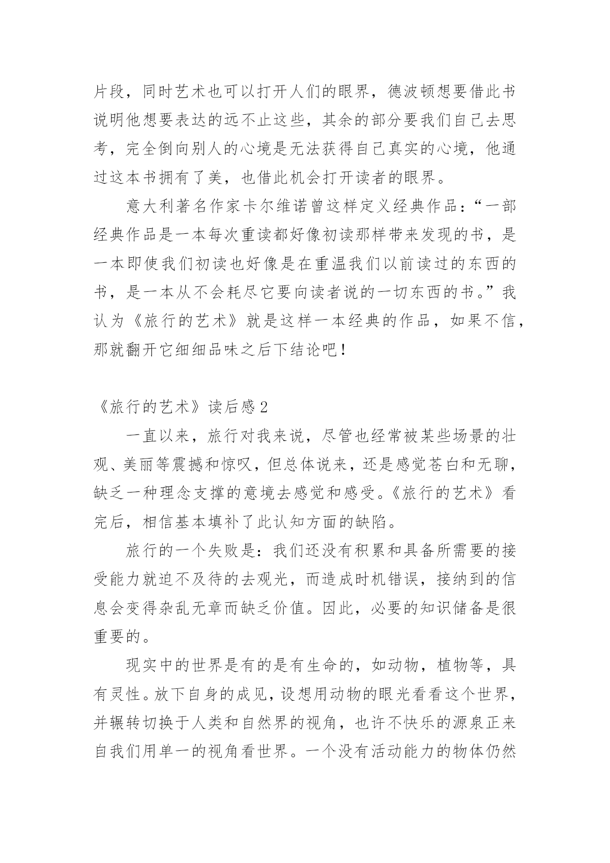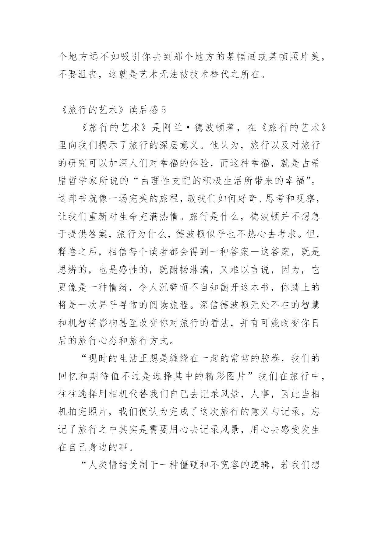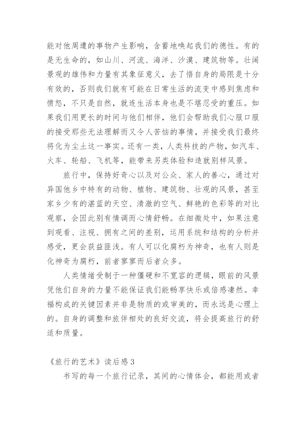 《旅行的艺术》读后感《旅行的艺术》读后感范文(精选10篇)读完一本名著以后,相信大家的视野一定开拓了不少,这时就有必须要写一篇读后感了!那么你会写读后感吗?以下是小编为大家整理的《旅行的艺术》读后感范文(精选10篇),欢迎大家分享。《旅行的艺术》读后感1不记得是哪部童话里描述过一个通天的藤蔓,细细长长,直通云霄之上,它可以到天上感受另一番场景。对于旅行,通过精美的艺术品和心里的期待达到旅行的目的,而在《旅行的艺术》中,德波顿将直通云霄之上的细长藤蔓增加了枝叶,同样是通天的藤蔓,但是增加的枝叶可以接触更多的阳光和空气,感受更多的场景,看到天上的另一番场景不再是一个简单的动作就能完成。你要做的就是尽可能地打开你的触角,你的旅行不会只是固定思维模式下的身体和心智互相矛盾,最终只留下几片回忆的旅行,你的生活也不会因为对它的视若无睹而变得一片黑暗。德波顿认为旅行过程中的心境的重要性,无论是在卧室里的旅行,还是环游世界的旅行,目的地不是重点,心境才是构成获得旅行亦或者是生活乐趣的来源。满足心理需求的旅行才是旅行的意义,反过来说转换心境才能获得旅行的意义。旅行的过程中,身体和心境的分离是客观存在的,那就不去刻意逃避,让思绪在旅行的过程中思考,思考也是构成旅行意义的一部分,因为它是属于心境的一种漫步。来到旅行目的地首先感受到的是异域风情,如何将自己固有的有关国籍等等的思想抛弃,让心境彻底融入其中。好奇心,是将对身体的不适、旅游指南固有的事物等等转向对其他事物的关注,哪怕是一些细枝末节的东西。之后,是城市心境与乡村风景的碰撞,更多细节的东西撞入视线。走到这里,德波顿化身心理医生,将之前对于自身处境的焦虑的解决转向壮阔的风景。暂时忘记你所焦虑的怀着好奇心,如果少了一双被打开的眼睛,什么都是徒劳。艺术品因为它的特质可以打开眼界,看到更多平时不会注意的美的事物,那么想要拥有美的事物也可以通过绘画和写作这些艺术品产生过程来达到目的。最后,德波顿回归故乡,目的地发生了变换,但只要旅行的心境不变,这里他强调依据自己的心境而不是受到旁人心境影响,那么这样的旅行也可以拥有美,满足自己的心理需求。关于德波顿每章共同的写作特点就是善于用别人的思想完美的表达自己的想法。这个过程中,德波顿像是高挑美丽的模特走T台,其他人的思想就像他身上华丽的礼服给了他足够的自信,很多哲人深刻的思想贯穿全书就像走台时适当的背景音乐让你迷醉其中,三者的完美结合,缺少任何其中的一个,整个的美感就会缺失。《旅行的艺术》,通过它的书名也可以窥探出作者德波顿的写作意图,艺术的想象省略、压缩,甚至切割掉了一些片段,同时艺术也可以打开人们的眼界,德波顿想要借此书说明他想要表达的远不止这些,其余的部分要我们自己去思考,完全倒向别人的心境是无法获得自己真实的心境,他通过这本书拥有了美,也借此机会打开读者的眼界。意大利著名作家卡尔维诺曾这样定义经典作品:“一部经典作品是一本每次重读都好像初读那样带来发现的书,是一本即使我们初读也好像是在重温我们以前读过的东西的书,是一本从不会耗尽它要向读者说的一切东西的书。”我认为《旅行的艺术》就是这样一本经典的作品,如果不信,那就翻开它细细品味之后下结论吧!《旅行的艺术》读后感2一直以来,旅行对我来说,尽管也经常被某些场景的壮观、美丽等震撼和惊叹,但总体说来,还是感觉苍白和无聊,缺乏一种理念支撑的意境去感觉和感受。《旅行的艺术》看完后,相信基本填补了此认知方面的缺陷。旅行的一个失败是:我们还没有积累和具备所需要的接受能力就迫不及待的去观光,而造成时机错误,接纳到的信息会变得杂乱无章而缺乏价值。因此,必要的知识储备是很重要的。现实中的世界是有的是有生命的,如动物,植物等,具有灵性。放下自身的成见,设想用动物的眼光看看这个世界,并辗转切换于人类和自然界的视角,也许不快乐的源泉正来自我们用单一的视角看世界。一个没有活动能力的物体仍然能对他周遭的事物产生影响,含蓄地唤起我们的德性。有的是无生命的,如山川、河流、海洋、沙漠、建筑物等。壮阔景观的雄伟和力量有其象征意义,去了悟自身的局限是十分有效的,否则我们就有可能在日常生活的流变中感到焦虑和愤怒,不只是自然,就连生活本身也是不堪忍受的重压。如果我们用更长的时间与他们相伴,他们会帮助我们心服口服的接受那些无法理解而又令人苦恼的事情,并接受我们最终将化为尘土这一事实。还有一类,人类科技的产物,如汽车、火车、轮船、飞机等,能带来另类体验和造就别样风景。旅行中,保持好奇心以及对公众、家人的善心,通过对异国他乡中特有的动物、植物、建筑物、壮观的风景,甚至家乡少有的湛蓝的天空、清澈的空气、鲜艳的色彩等的对比观察,会因此别有情调而心情舒畅。在细微处中,如果注意到观看、注视、拥有之间的差别,运用系统和结构的分析并感受,更会获益匪浅。有人可以化