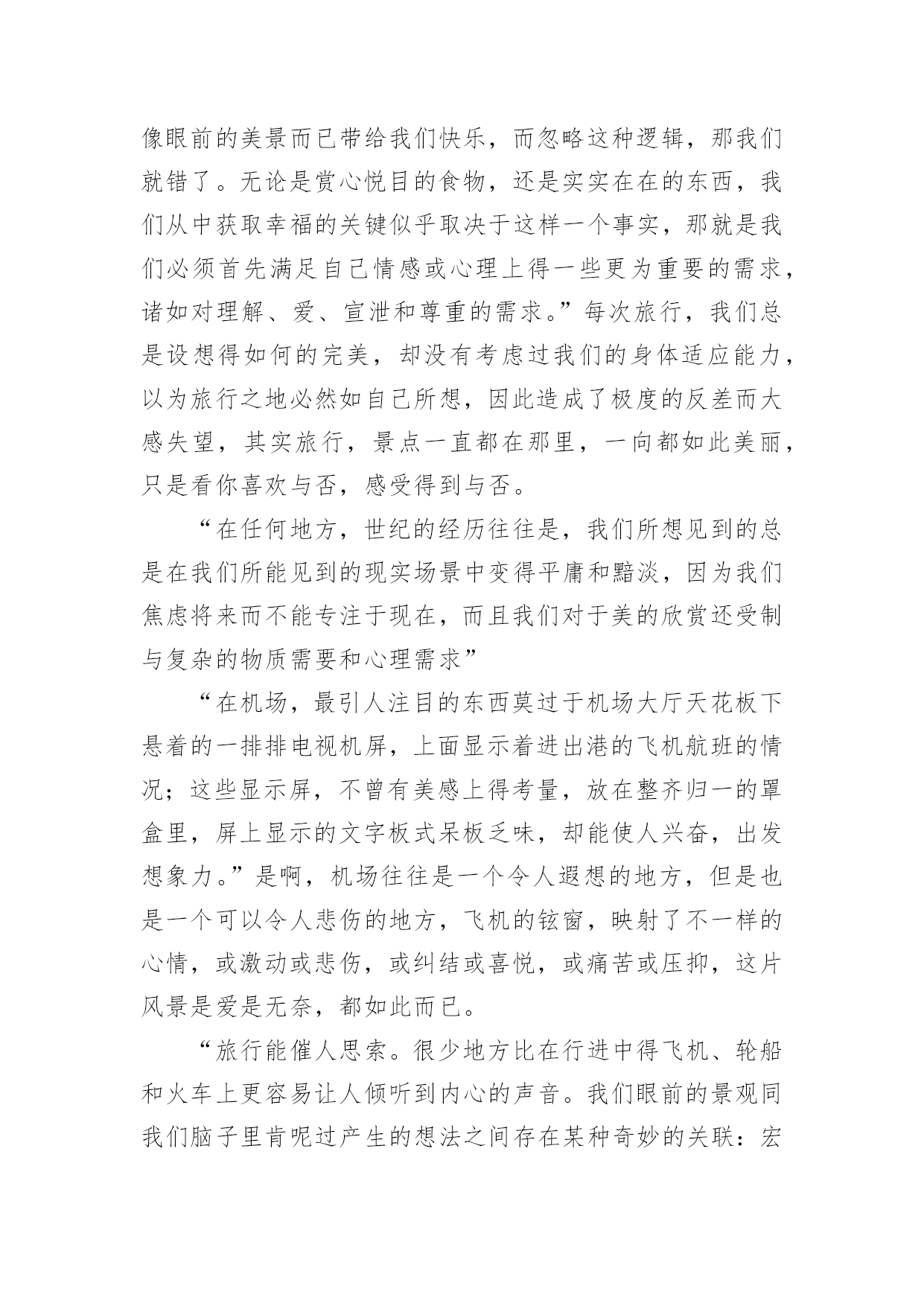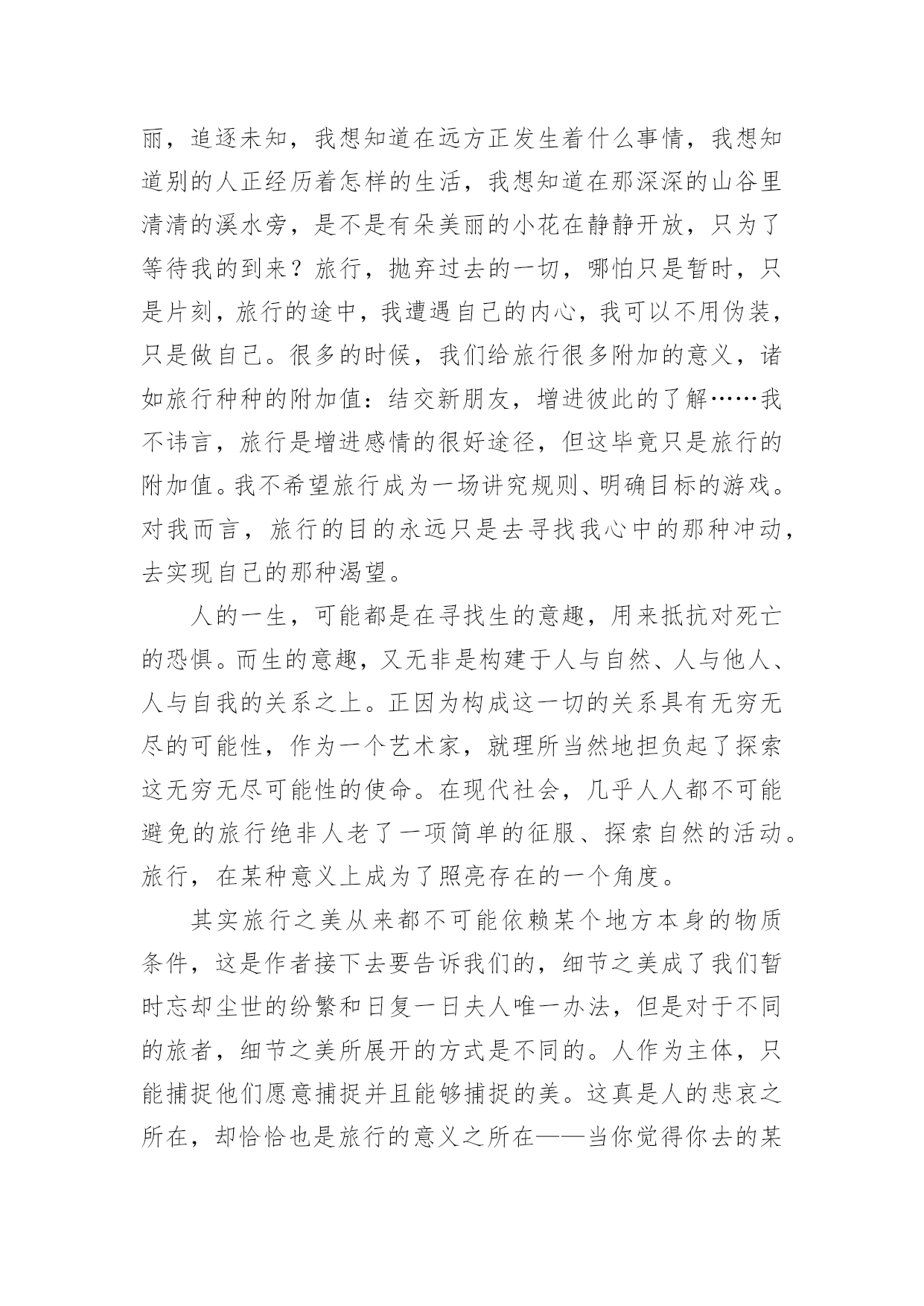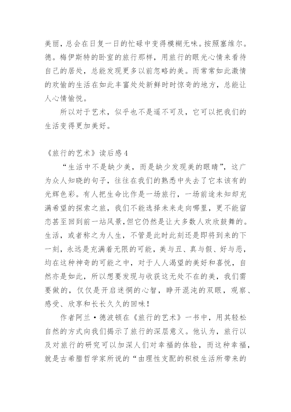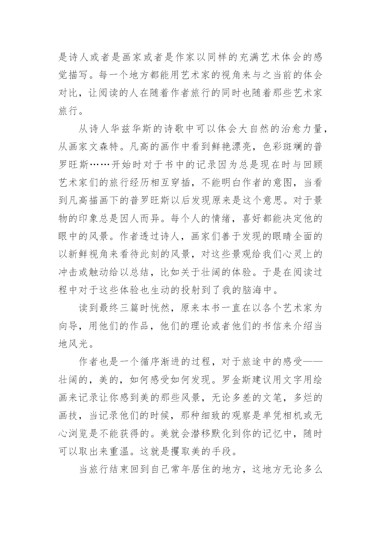 《旅行的艺术》读后感《旅行的艺术》读后感范文(精选10篇)读完一本名著以后,相信大家的视野一定开拓了不少,这时就有必须要写一篇读后感了!那么你会写读后感吗?以下是小编为大家整理的《旅行的艺术》读后感范文(精选10篇),欢迎大家分享。《旅行的艺术》读后感1不记得是哪部童话里描述过一个通天的藤蔓,细细长长,直通云霄之上,它可以到天上感受另一番场景。对于旅行,通过精美的艺术品和心里的期待达到旅行的目的,而在《旅行的艺术》中,德波顿将直通云霄之上的细长藤蔓增加了枝叶,同样是通天的藤蔓,但是增加的枝叶可以接触更多的阳光和空气,感受更多的场景,看到天上的另一番场景不再是一个简单的动作就能完成。你要做的就是尽可能地打开你的触角,你的旅行不会只是固定思维模式下的身体和心智互相矛盾,最终只留下几片回忆的旅行,你的生活也不会因为对它的视若无睹而变得一片黑暗。德波顿认为旅行过程中的心境的重要性,无论是在卧室里的旅行,还是环游世界的旅行,目的地不是重点,心境才是构成获得旅行亦或者是生活乐趣的来源。满足心理需求的旅行才是旅行的意义,反过来说转换心境才能获得旅行的意义。旅行的过程中,身体和心境的分离是客观存在的,那就不去刻意逃避,让思绪在旅行的过程中思考,思考也是构成旅行意义的一部分,因为它是属于心境的一种漫步。来到旅行目的地首先感受到的是异域风情,如何将自己固有的有关国籍等等的思想抛弃,让心境彻底融入其中。好奇心,是将对身体的不适、旅游指南固有的事物等等转向对其他事物的关注,哪怕是一些细枝末节的东西。之后,是城市心境与乡村风景的碰撞,更多细节的东西撞入视线。走到这里,德波顿化身心理医生,将之前对于自身处境的焦虑的解决转向壮阔的风景。暂时忘记你所焦虑的怀着好奇心,如果少了一双被打开的眼睛,什么都是徒劳。艺术品因为它的特质可以打开眼界,看到更多平时不会注意的美的事物,那么想要拥有美的事物也可以通过绘画和写作这些艺术品产生过程来达到目的。最后,德波顿回归故乡,目的地发生了变换,但只要旅行的心境不变,这里他强调依据自己的心境而不是受到旁人心境影响,那么这样的旅行也可以拥有美,满足自己的心理需求。关于德波顿每章共同的写作特点就是善于用别人的思想完美的表达自己的想法。这个过程中,德波顿像是高挑美丽的模特走T台,其他人的思想就像他身上华丽的礼服给了他足够的自信,很多哲人深刻的思想贯穿全书就像走台时适当的背景音乐让你迷醉其中,三者的完美结合,缺少任何其中的一个,整个的美感就会缺失。《旅行的艺术》,通过它的书名也可以窥探出作者德波顿的写作意图,艺术的想象省略、压缩,甚至切割掉了一些片段,同时艺术也可以打开人们的眼界,德波顿想要借此书说明他想要表达的远不止这些,其余的部分要我们自己去思考,完全倒向别人的心境是无法获得自己真实的心境,他通过这本书拥有了美,也借此机会打开读者的眼界。意大利著名作家卡尔维诺曾这样定义经典作品:“一部经典作品是一本每次重读都好像初读那样带来发现的书,是一本即使我们初读也好像是在重温我们以前读过的东西的书,是一本从不会耗尽它要向读者说的一切东西的书。”我认为《旅行的艺术》就是这样一本经典的作品,如果不信,那就翻开它细细品味之后下结论吧!《旅行的艺术》读后感2一直以来,旅行对我来说,尽管也经常被某些场景的壮观、美丽等震撼和惊叹,但总体说来,还是感觉苍白和无聊,缺乏一种理念支撑的意境去感觉和感受。《旅行的艺术》看完后,相信基本填补了此认知方面的缺陷。旅行的一个失败是:我们还没有积累和具备所需要的接受能力就迫不及待的去观光,而造成时机错误,接纳到的信息会变得杂乱无章而缺乏价值。因此,必要的知识储备是很重要的。现实中的世界是有的是有生命的,如动物,植物等,具有灵性。放下自身的成见,设想用动物的眼光看看这个世界,并辗转切换于人类和自然界的视角,也许不快乐的源泉正来自我们用单一的视角看世界。一个没有活动能力的物体仍然能对他周遭的事物产生影响,含蓄地唤起我们的德性。有的是无生命的,如山川、河流、海洋、沙漠、建筑物等。壮阔景观的雄伟和力量有其象征意义,去了悟自身的局限是十分有效的,否则我们就有可能在日常生活的流变中感到焦虑和愤怒,不只是自然,就连生活本身也是不堪忍受的重压。如果我们用更长的时间与他们相伴,他们会帮助我们心服口服的接受那些无法理解而又令人苦恼的事情,并接受我们最终将化为尘土这一事实。还有一类,人类科技的产物,如汽车、火车、轮船、飞机等,能带来另类体验和造就别样风景。旅行中,保持好奇心以及对公众、家人的善心,通过对异国他乡中特有的动物、植物、建筑物、壮观的风景,甚至家乡少有的湛蓝的天空、清澈的空气、鲜艳的色彩等的对比观察,会因此别有情调而心情舒畅。在细微处中,如果注意到观看、注视、拥有之间的差别,运用系统和结构的分析并感受,更会获益匪浅。有人可以化