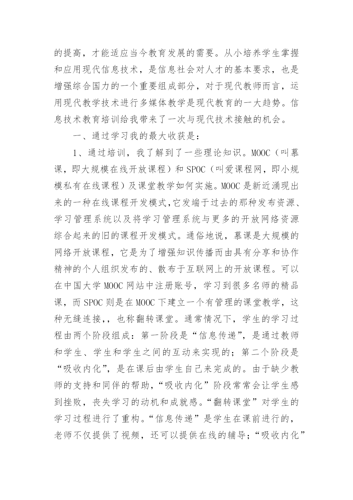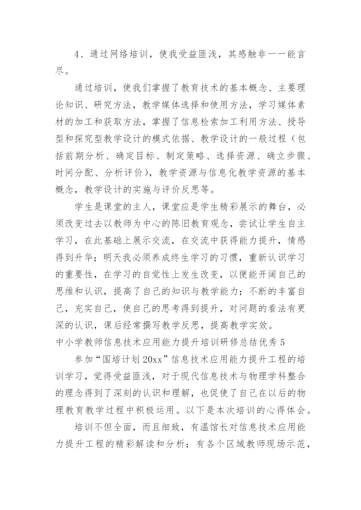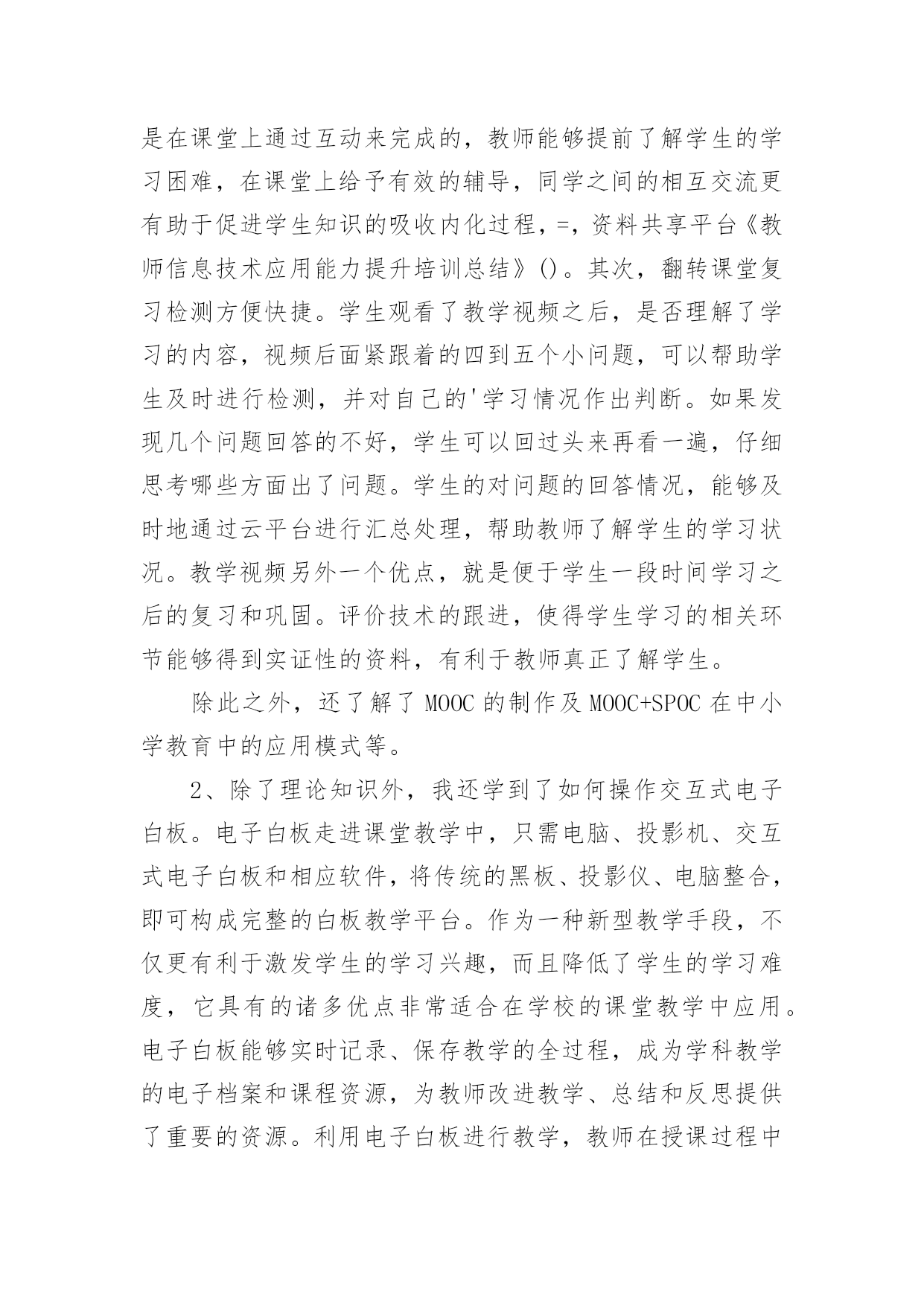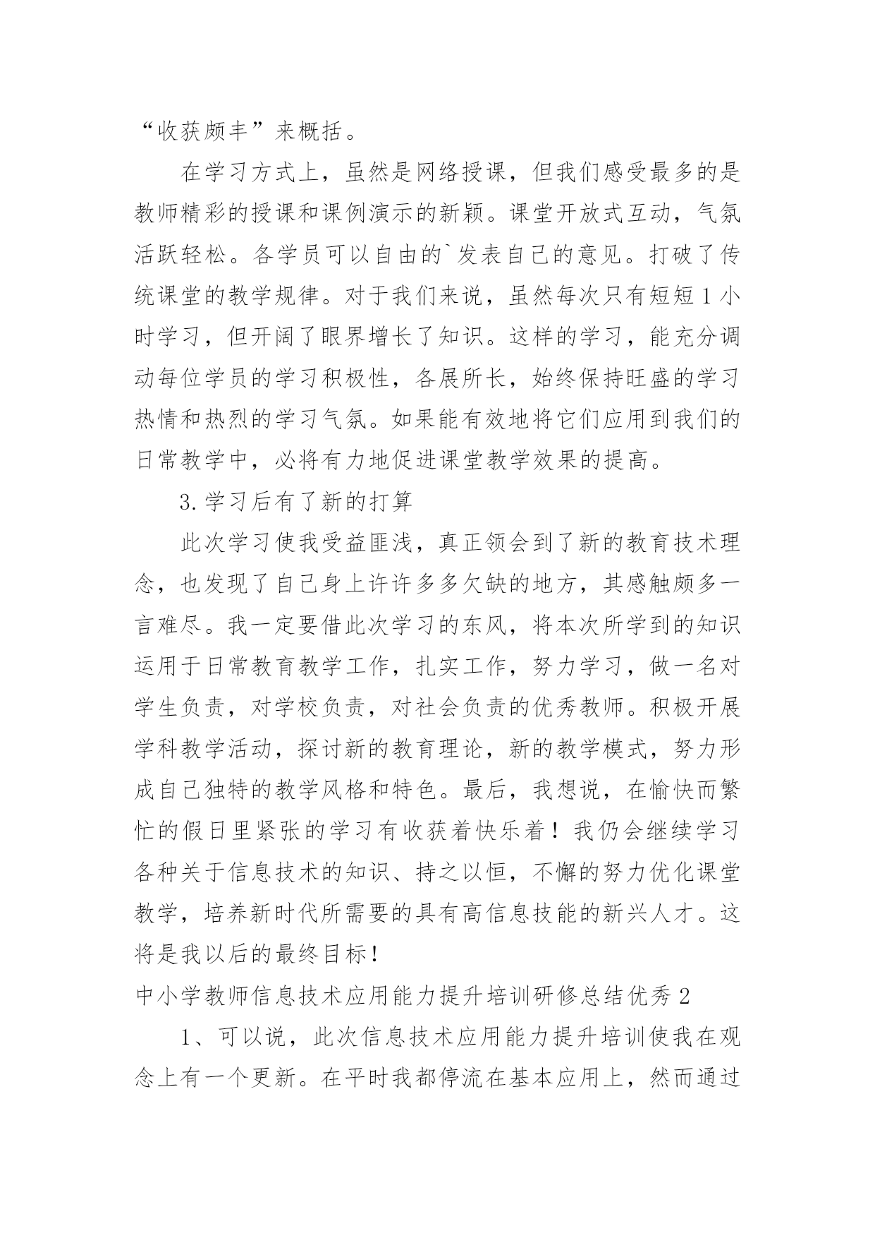 中小学教师信息技术应用能力提升培训研修总结优秀中小学教师信息技术应用能力提升培训研修总结优秀总结就是把一个时段的学习、工作或其完成情况进行一次全面系统的总结,它可以帮助我们总结以往思想,发扬成绩,不如静下心来好好写写总结吧。你所见过的总结应该是什么样的?以下是小编为大家收集的中小学教师信息技术应用能力提升培训研修总结优秀,仅供参考,欢迎大家阅读。中小学教师信息技术应用能力提升培训研修总结优秀1科学技术的飞速发展,使得以计算机和网络技术为核心的现代技术,越来越深刻的改变着我们的工作、学习和生活方式。信息的获取、分析、处理、应用等能力,已成为现代人最基本的能力和素质的标志。素质教育的不断深化,对教师的要求也不断提高,只有高素质的教师,才能培养出高素质的学生,为了适应工作的需要,教师要不断的学习、不断的提高,才能适应当今教育发展的需要。从小培养学生掌握和应用现代信息技术,是信息社会对人才的基本要求,也是增强综合国力的一个重要组成部分,对于现代教师而言,运用现代教学技术进行多媒体教学是现代教育的一大趋势。信息技术教育2.0学习给我又一次带来了与现代技术接触的机会。1.通过学习提升了我的教育观念在培训中,我明白了信息技术2.0在教育教学中的应用更广泛,更省时高效。信息技术与跨学科教学的融合,更要求教师必须提高职业的专业性,才能适应现代化的教学需求。信息技术今后将成为教师教学和学生学习的重要工具。在新课程改革的形势下,未来教育应溶入先进的教学理念与最新的信息技术,致力于信息技术在课堂上的有效应用。而信息技术2.0的学习为我们教师提供了这样的平台。不仅教师要掌握这门技术,学生也要通过掌握计算机的基本操作,让学生利用各种渠道收集数据,并对所收集的数据进行整理、分析。充分发挥学生自主探?究、合作学习的能力,通过对所收集的数据加以综合分析达到学习的目的。使学生可以更好地利用信息技术提高学习水平。2.在学习中收获到了满满的知识本次学习的内容和我们平时的教学工作紧密联系,实用性很强。比如ppt的制作,跨学科教学的深度融合,画思维导图,项目式学习等,促使我们整合各方面的资源,更好的理解信息技术和课程深度融合的意义,为我们今后能将信息技术运用到具体的教学工作中打下了扎实的理论基础。在学习内容方面,不仅理解了教育技术的基本内涵,更深入理解了项目学习的一般过程,掌握了信息资源的获取方法、处理方法,还通过案例的学习,掌握了画思维导图的设计方法及评价方法,对信息技术与课程整合的内涵也有了进一步的认识,提升了信息技术2.0的应用水平等等,可以用“收获颇丰”来概括。在学习方式上,虽然是网络授课,但我们感受最多的是教师精彩的授课和课例演示的新颖。课堂开放式互动,气氛活跃轻松。各学员可以自由的`发表自己的意见。打破了传统课堂的教学规律。对于我们来说,虽然每次只有短短1小时学习,但开阔了眼界增长了知识。这样的学习,能充分调动每位学员的学习积极性,各展所长,始终保持旺盛的学习热情和热烈的学习气氛。如果能有效地将它们应用到我们的日常教学中,必将有力地促进课堂教学效果的提高。3.学习后有了新的打算此次学习使我受益匪浅,真正领会到了新的教育技术理念,也发现了自己身上许许多多欠缺的地方,其感触颇多一言难尽。我一定要借此次学习的东风,将本次所学到的知识运用于日常教育教学工作,扎实工作,努力学习,做一名对学生负责,对学校负责,对社会负责的优秀教师。积极开展学科教学活动,探讨新的教育理论,新的教学模式,努力形成自己独特的教学风格和特色。最后,我想说,在愉快而繁忙的假日里紧张的学习有收获着快乐着!我仍会继续学习各种关于信息技术的知识、持之以恒,不懈的努力优化课堂教学,培养新时代所需要的具有高信息技能的新兴人才。这将是我以后的最终目标!中小学教师信息技术应用能力提升培训研修总结优秀21、可以说,此次信息技术应用能力提升培训使我在观念上有一个更新。在平时我都停流在基本应用上,然而通过此培训,才真正的认识到自我在信息技术的运用方面还有许多的不足,在今后的业务提升方面还有大量的知识要学习,只有这样随时为自我更新,补充新识,更新观念,从根本上提升专业素养。2、随着信息化快速发展,教师必须具备良好的信息素养是终生学习、不断完善自身的需要,要具有现代化的教育思想、教学观念,掌握现代化的'教【本店铺】学方法和教学手段,熟练运用信息工具(网络、电脑等)对信息资源进行有效的收集、加工、组织、运用;这些素质的养成就要求教师不断地学习,才能满足现代化教学的需要;信息素养成了终生学习的必备素质之一,如果教师没有良好的信息素养,就不能成为一名满足现代教学需要的高素质的教师。中小学教师信息技术应用能力提升培训研修总结优秀3为期一周的小学教师信息技术应用能力提升培训弹指间就过去了,作为一名农村教师参加此次培训,我深感