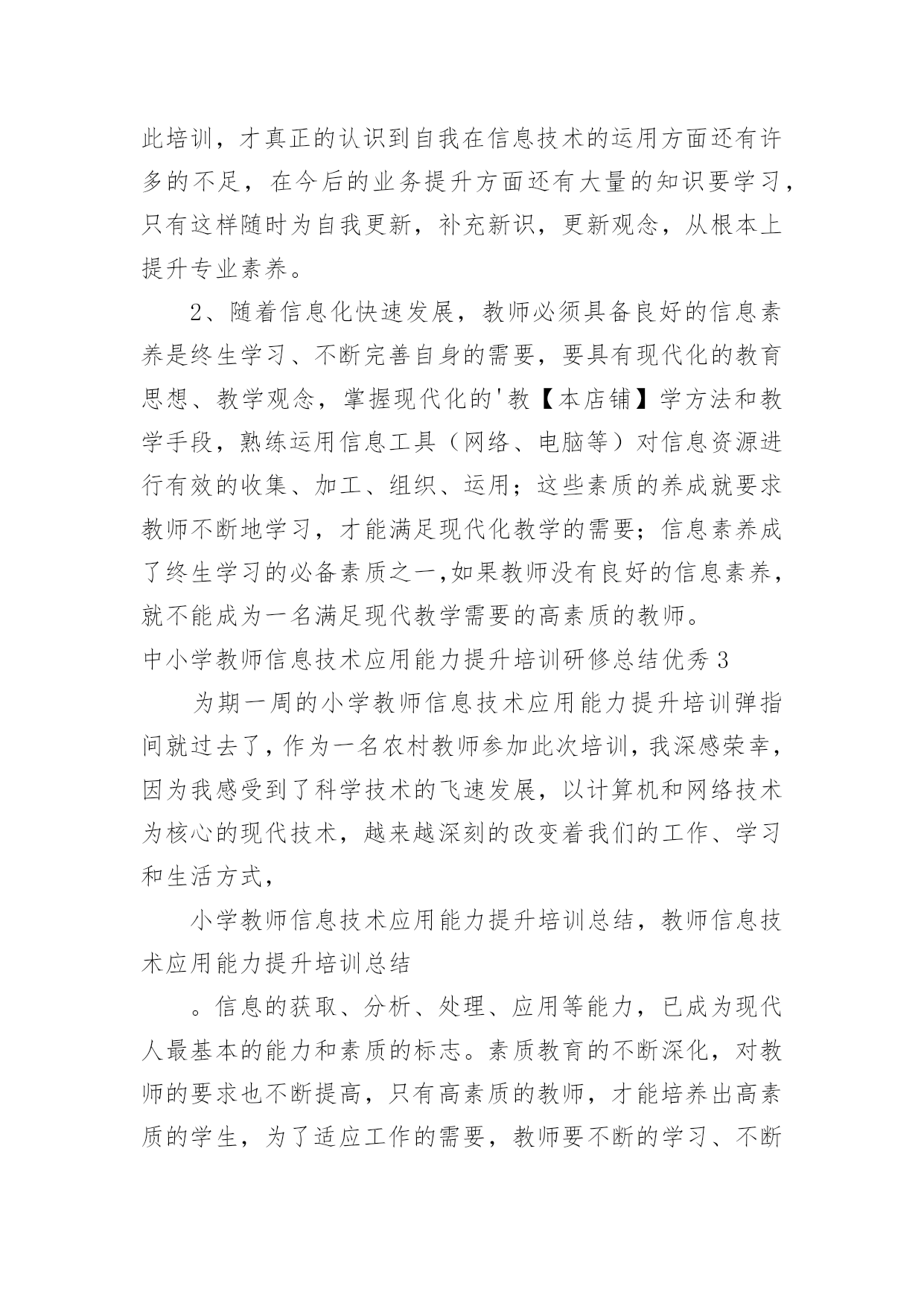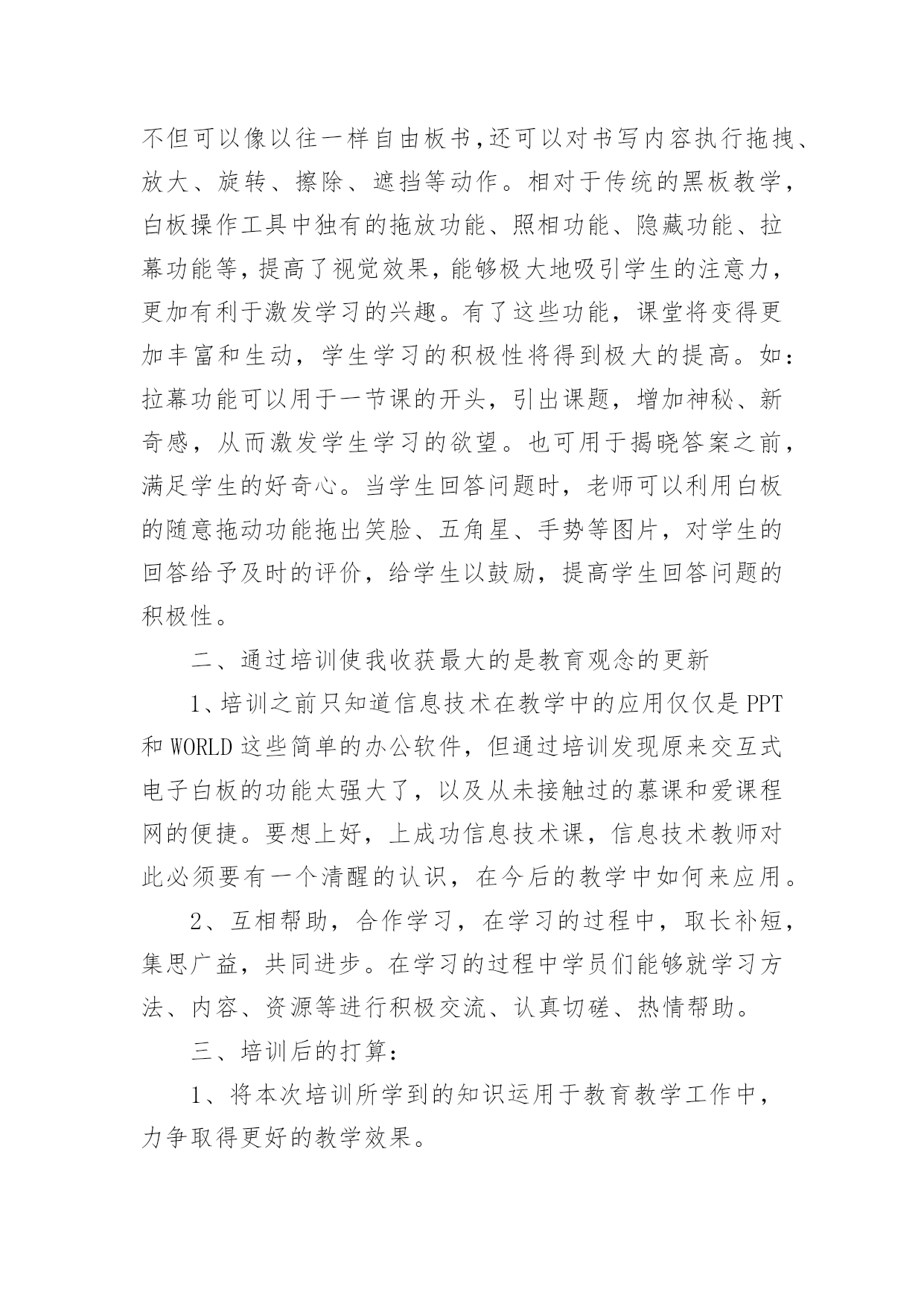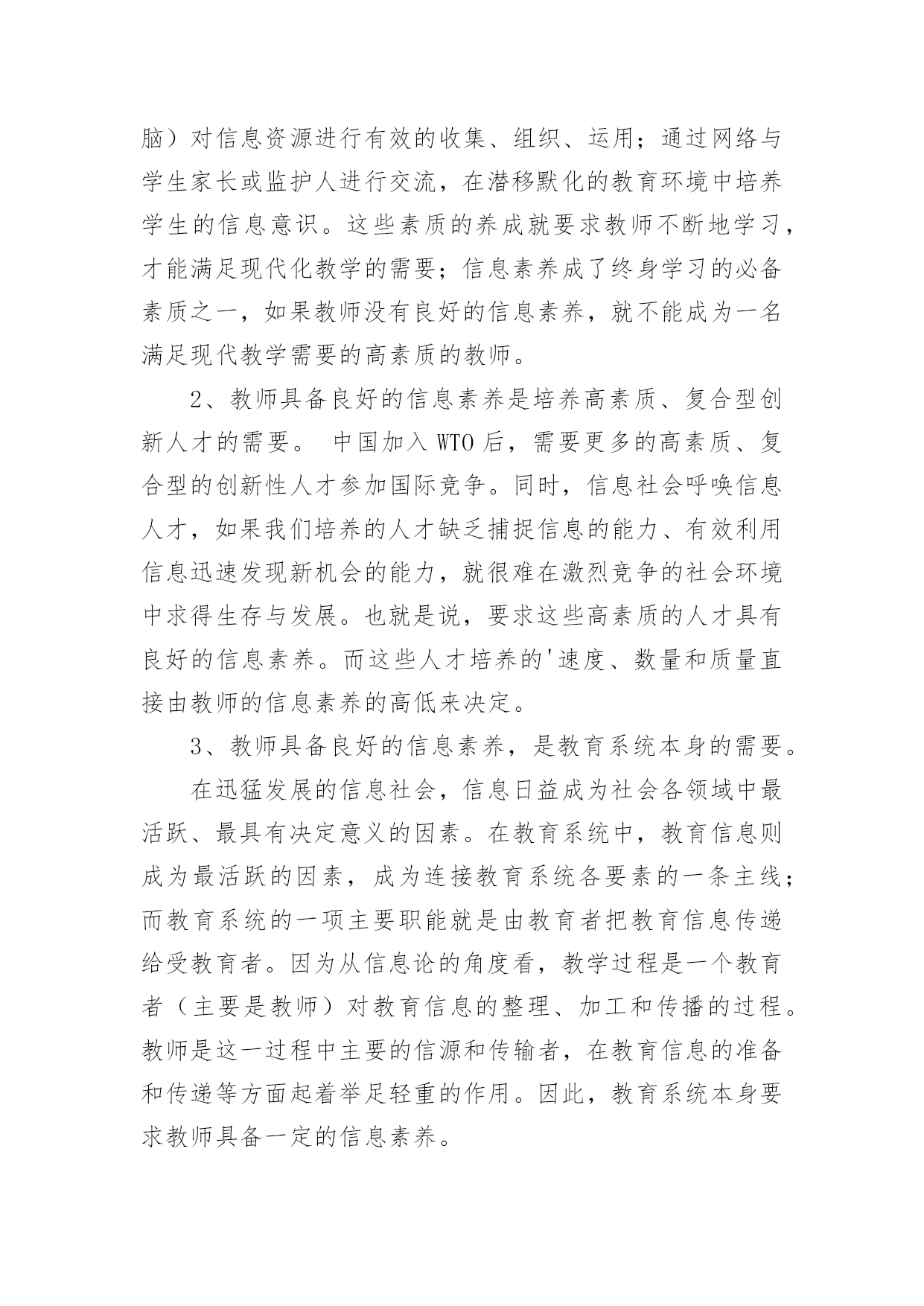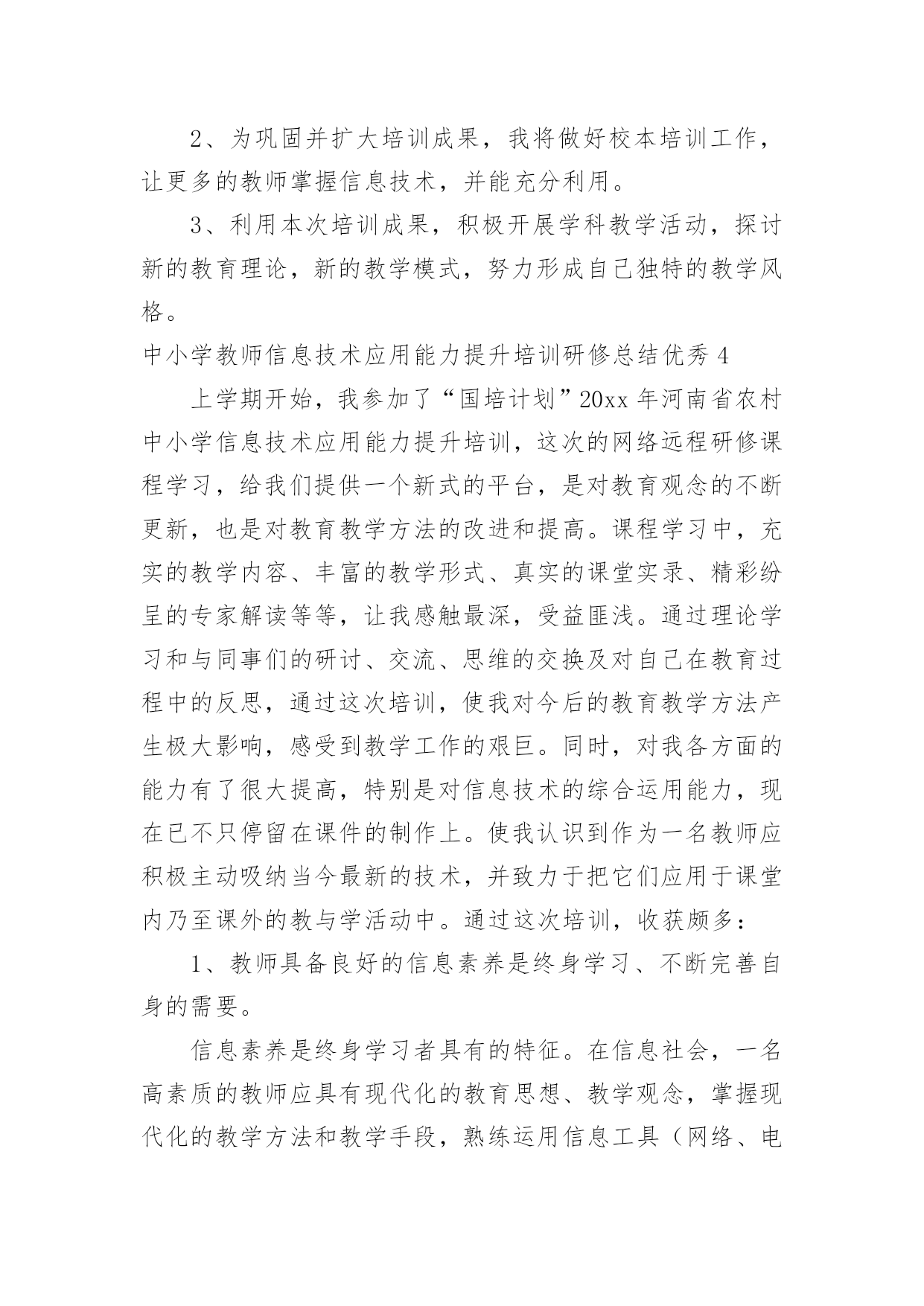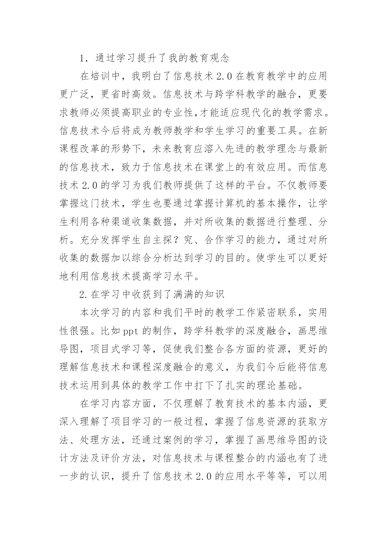 中小学教师信息技术应用能力提升培训研修总结优秀中小学教师信息技术应用能力提升培训研修总结优秀总结就是把一个时段的学习、工作或其完成情况进行一次全面系统的总结,它可以帮助我们总结以往思想,发扬成绩,不如静下心来好好写写总结吧。你所见过的总结应该是什么样的?以下是小编为大家收集的中小学教师信息技术应用能力提升培训研修总结优秀,仅供参考,欢迎大家阅读。中小学教师信息技术应用能力提升培训研修总结优秀1科学技术的飞速发展,使得以计算机和网络技术为核心的现代技术,越来越深刻的改变着我们的工作、学习和生活方式。信息的获取、分析、处理、应用等能力,已成为现代人最基本的能力和素质的标志。素质教育的不断深化,对教师的要求也不断提高,只有高素质的教师,才能培养出高素质的学生,为了适应工作的需要,教师要不断的学习、不断的提高,才能适应当今教育发展的需要。从小培养学生掌握和应用现代信息技术,是信息社会对人才的基本要求,也是增强综合国力的一个重要组成部分,对于现代教师而言,运用现代教学技术进行多媒体教学是现代教育的一大趋势。信息技术教育2.0学习给我又一次带来了与现代技术接触的机会。1.通过学习提升了我的教育观念在培训中,我明白了信息技术2.0在教育教学中的应用更广泛,更省时高效。信息技术与跨学科教学的融合,更要求教师必须提高职业的专业性,才能适应现代化的教学需求。信息技术今后将成为教师教学和学生学习的重要工具。在新课程改革的形势下,未来教育应溶入先进的教学理念与最新的信息技术,致力于信息技术在课堂上的有效应用。而信息技术2.0的学习为我们教师提供了这样的平台。不仅教师要掌握这门技术,学生也要通过掌握计算机的基本操作,让学生利用各种渠道收集数据,并对所收集的数据进行整理、分析。充分发挥学生自主探?究、合作学习的能力,通过对所收集的数据加以综合分析达到学习的目的。使学生可以更好地利用信息技术提高学习水平。2.在学习中收获到了满满的知识本次学习的内容和我们平时的教学工作紧密联系,实用性很强。比如ppt的制作,跨学科教学的深度融合,画思维导图,项目式学习等,促使我们整合各方面的资源,更好的理解信息技术和课程深度融合的意义,为我们今后能将信息技术运用到具体的教学工作中打下了扎实的理论基础。在学习内容方面,不仅理解了教育技术的基本内涵,更深入理解了项目学习的一般过程,掌握了信息资源的获取方法、处理方法,还通过案例的学习,掌握了画思维导图的设计方法及评价方法,对信息技术与课程整合的内涵也有了进一步的认识,提升了信息技术2.0的应用水平等等,可以用“收获颇丰”来概括。在学习方式上,虽然是网络授课,但我们感受最多的是教师精彩的授课和课例演示的新颖。课堂开放式互动,气氛活跃轻松。各学员可以自由的`发表自己的意见。打破了传统课堂的教学规律。对于我们来说,虽然每次只有短短1小时学习,但开阔了眼界增长了知识。这样的学习,能充分调动每位学员的学习积极性,各展所长,始终保持旺盛的学习热情和热烈的学习气氛。如果能有效地将它们应用到我们的日常教学中,必将有力地促进课堂教学效果的提高。3.学习后有了新的打算此次学习使我受益匪浅,真正领会到了新的教育技术理念,也发现了自己身上许许多多欠缺的地方,其感触颇多一言难尽。我一定要借此次学习的东风,将本次所学到的知识运用于日常教育教学工作,扎实工作,努力学习,做一名对学生负责,对学校负责,对社会负责的优秀教师。积极开展学科教学活动,探讨新的教育理论,新的教学模式,努力形成自己独特的教学风格和特色。最后,我想说,在愉快而繁忙的假日里紧张的学习有收获着快乐着!我仍会继续学习各种关于信息技术的知识、持之以恒,不懈的努力优化课堂教学,培养新时代所需要的具有高信息技能的新兴人才。这将是我以后的最终目标!中小学教师信息技术应用能力提升培训研修总结优秀21、可以说,此次信息技术应用能力提升培训使我在观念上有一个更新。在平时我都停流在基本应用上,然而通过此培训,才真正的认识到自我在信息技术的运用方面还有许多的不足,在今后的业务提升方面还有大量的知识要学习,只有这样随时为自我更新,补充新识,更新观念,从根本上提升专业素养。2、随着信息化快速发展,教师必须具备良好的信息素养是终生学习、不断完善自身的需要,要具有现代化的教育思想、教学观念,掌握现代化的'教【本店铺】学方法和教学手段,熟练运用信息工具(网络、电脑等)对信息资源进行有效的收集、加工、组织、运用;这些素质的养成就要求教师不断地学习,才能满足现代化教学的需要;信息素养成了终生学习的必备素质之一,如果教师没有良好的信息素养,就不能成为一名满足现代教学需要的高素质的教师。中小学教师信息技术应用能力提升培训研修总结优秀3为期一周的小学教师信息技术应用能力提升培训弹指间就过去了,作为一名农村教师参加此次培训,我深感