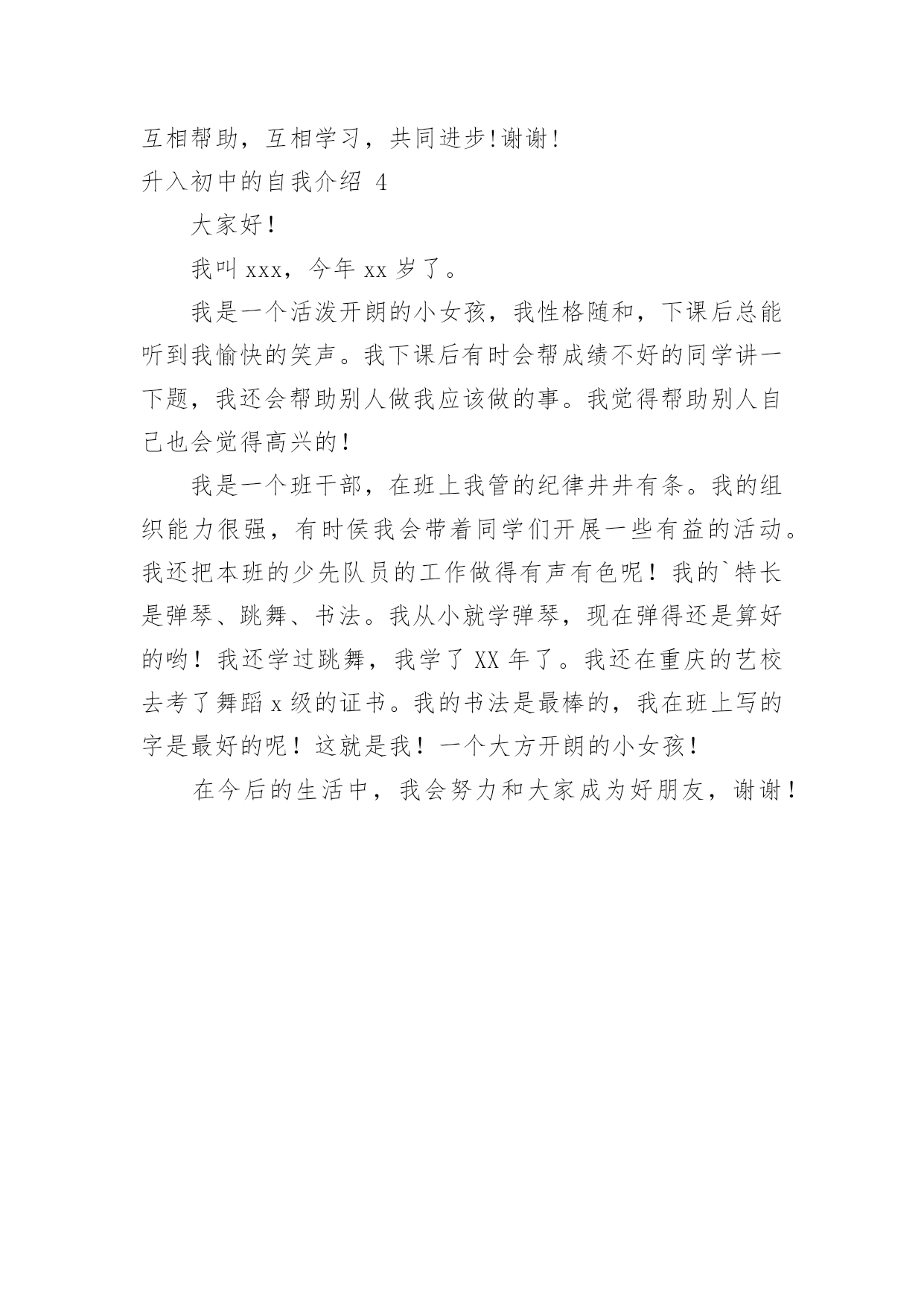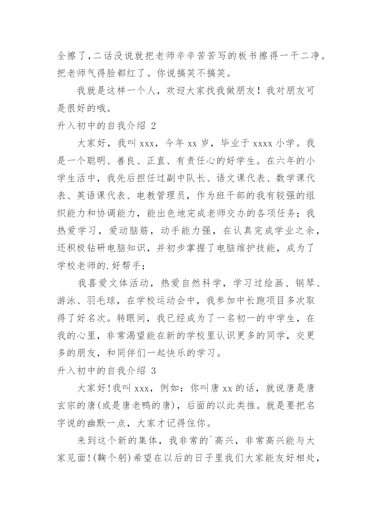 升入初中的自我介绍升入初中的自我介绍当进入一个陌生环境,我们有必要进行适当的自我介绍,自我介绍可以给陌生人留下一个好的印象。现在你是否对自我介绍一筹莫展呢?下面是小编为大家收集的升入初中的自我介绍,欢迎大家借鉴与参考,希望对大家有所帮助。升入初中的自我介绍1大家好,我叫xxx,很高心能够认识大家,我呢,比较倔,我认定的事情绝不会改变,除非你是对的我是错的。清晨,站在镜子面前,看着镜子中熟悉的脸,觉得自己还是小孩子,可惜我已经升入初中了,不再是小孩子了。想起和好朋友的一点一滴,不知不觉眼泪就爬上了脸,是啊!和自己做了六年的好友,到这会,说分开就分开了,肯定有许多的`不舍。但有什么用呢。时间也不是能说停就停的。我还是面对现实吧!我还很健忘,一次,我死活找不到我的鞋,后来经妈妈的提醒才发现我把鞋洗了,搭在了外面。大家说我健忘不健忘。我喜欢帮老师的忙,但是我这个人很马虎,经常帮倒忙。有一次老师叫我帮他把他的板书写完,结果,我听成把板书全擦了,二话没说就把老师辛辛苦苦写的板书擦得一干二净。把老师气得脸都红了。你说搞笑不搞笑。我就是这样一个人,欢迎大家找我做朋友!我对朋友可是很好的哦。升入初中的自我介绍2大家好,我叫xxx,今年xx岁,毕业于xxxx小学。我是一个聪明、善良、正直、有责任心的好学生。在六年的小学生活中,我先后担任过副中队长、语文课代表、数学课代表、英语课代表、电教管理员,作为班干部的我有较强的组织能力和协调能力,能出色地完成老师交办的各项任务;我热爱学习,爱动脑筋,动手能力强,在认真完成学业之余,还积极钻研电脑知识,并初步掌握了电脑维护技能,成为了学校老师的.好帮手;我喜爱文体活动,热爱自然科学,学习过绘画、钢琴、游泳、羽毛球,在学校运动会中,我参加中长跑项目多次取得了好名次。转眼间,我已经成为了一名初一的中学生,在我的心里,非常渴望能在新的学校里认识更多的同学,交更多的朋友,和同伴们一起快乐的学习。升入初中的自我介绍3大家好!我叫xxx,例如:你叫唐xx的话,就说唐是唐玄宗的唐(或是唐老鸭的唐),后面的以此类推。就是要把名字说的幽默一点,大家才记得住你。来到这个新的集体,我非常的`高兴,非常高兴能与大家见面!(鞠个躬)希望在以后的日子里我们大家能友好相处,互相帮助,互相学习,共同进步!谢谢!升入初中的自我介绍4大家好!我叫xxx,今年xx岁了。我是一个活泼开朗的小女孩,我性格随和,下课后总能听到我愉快的笑声。我下课后有时会帮成绩不好的同学讲一下题,我还会帮助别人做我应该做的事。我觉得帮助别人自己也会觉得高兴的!我是一个班干部,在班上我管的纪律井井有条。我的组织能力很强,有时侯我会带着同学们开展一些有益的活动。我还把本班的少先队员的工作做得有声有色呢!我的`特长是弹琴、跳舞、书法。我从小就学弹琴,现在弹得还是算好的哟!我还学过跳舞,我学了XX年了。我还在重庆的艺校去考了舞蹈x级的证书。我的书法是最棒的,我在班上写的字是最好的呢!这就是我!一个大方开朗的小女孩!在今后的生活中,我会努力和大家成为好朋友,谢谢!