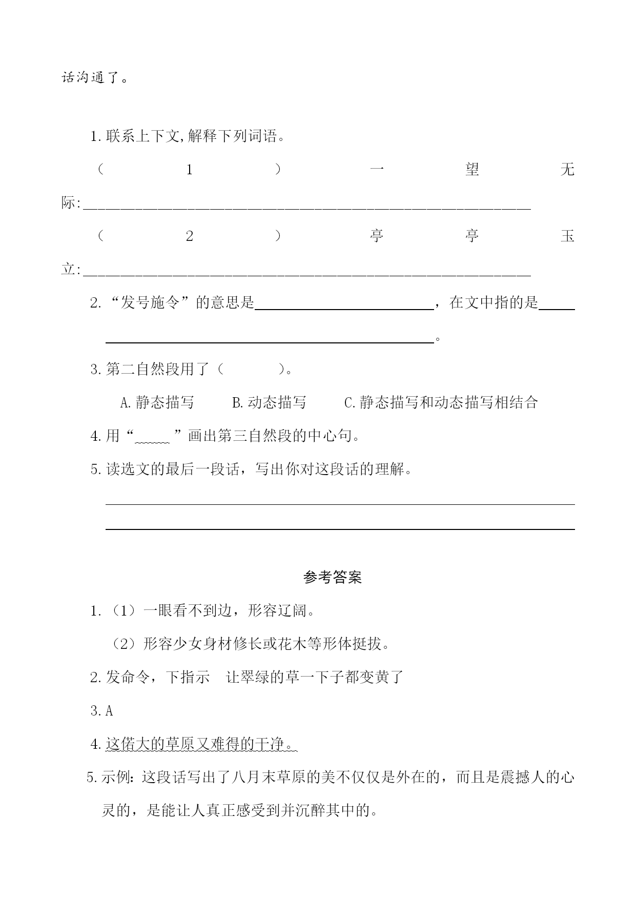 类文阅读-1草原草原八月末(节选)梁衡朋友们总说,草原上最好的季节是七八月,一望无际的碧草如毡如毯,上面盛开着数不清的五彩缤纷的花,如繁星在天,如落英在水,风过时草浪轻翻,花光闪烁,那景色是何等地迷人。但是不巧,我总赶不上这个季节,今年上草原时,又是八月之末了。在城里办完事,主人说:“怕这时坝上已经转冷,没有多少看头了。”我想总不能枉来一次,还是驱车上了草原。从围场县出发,翻过山,穿过茫茫林海,过一界河,便从河北进入内蒙古境内。车子在缓缓地滑行,除了车轮与草的摩擦声,便什么也听不到了。我们像闯入了另一个世