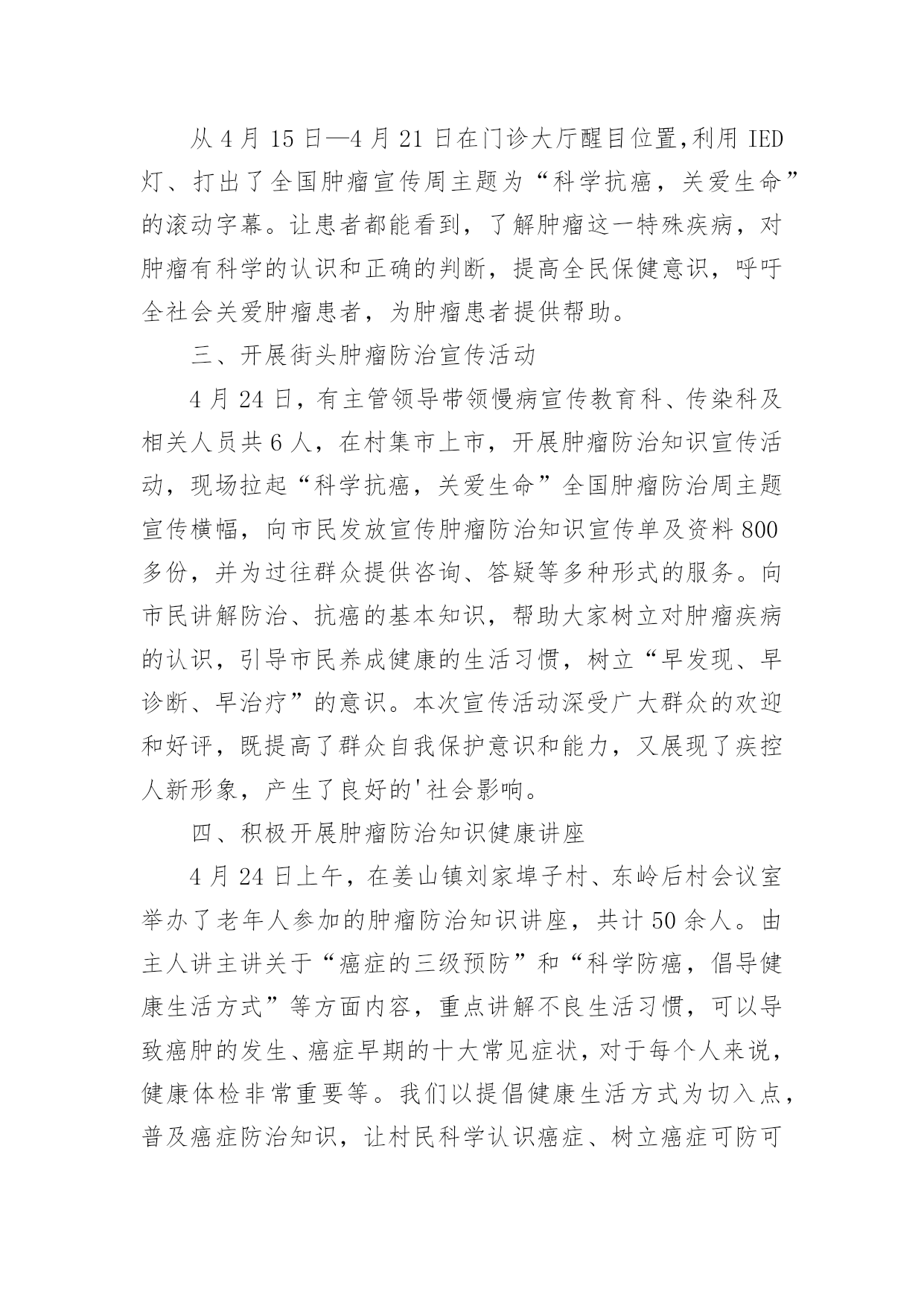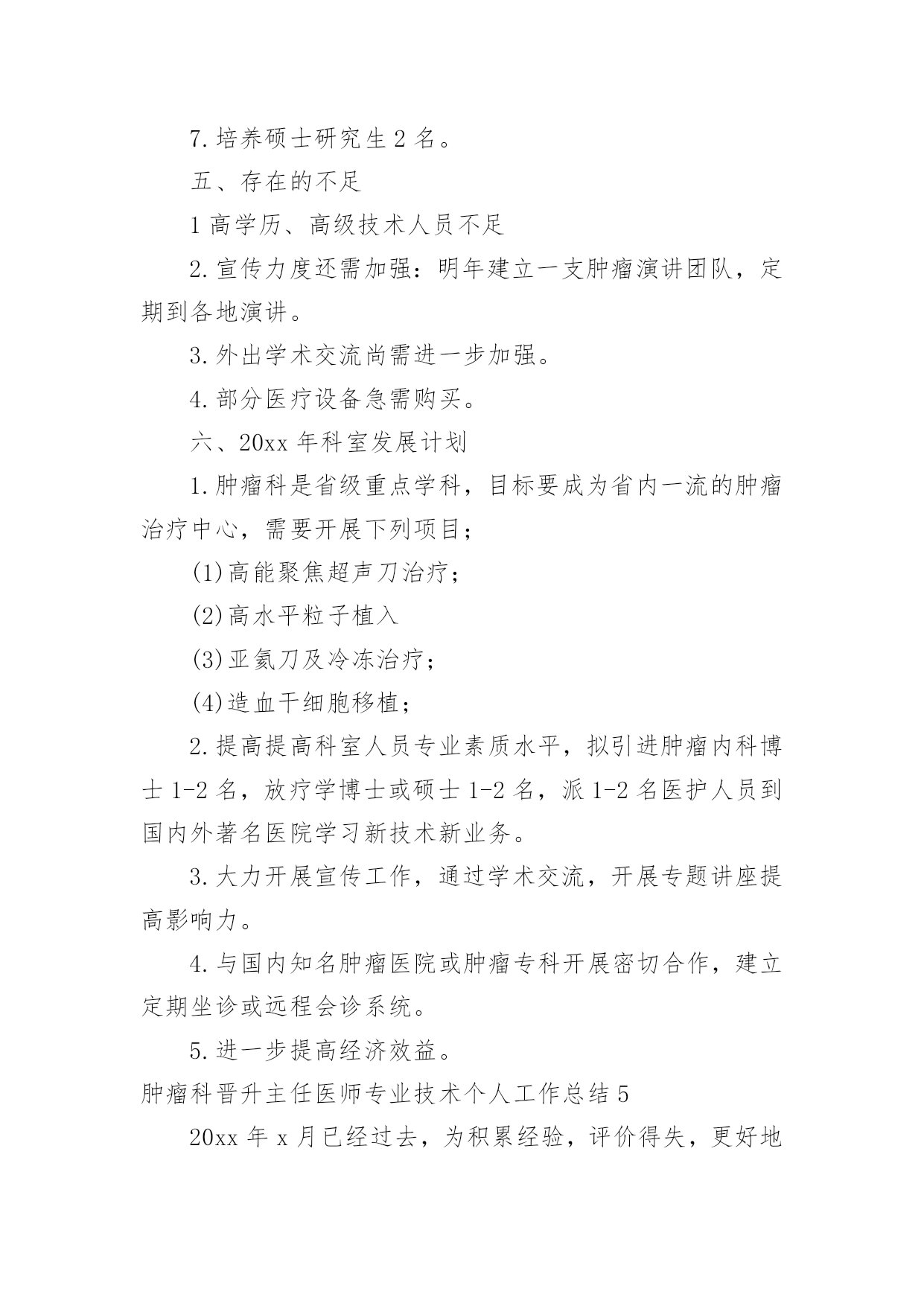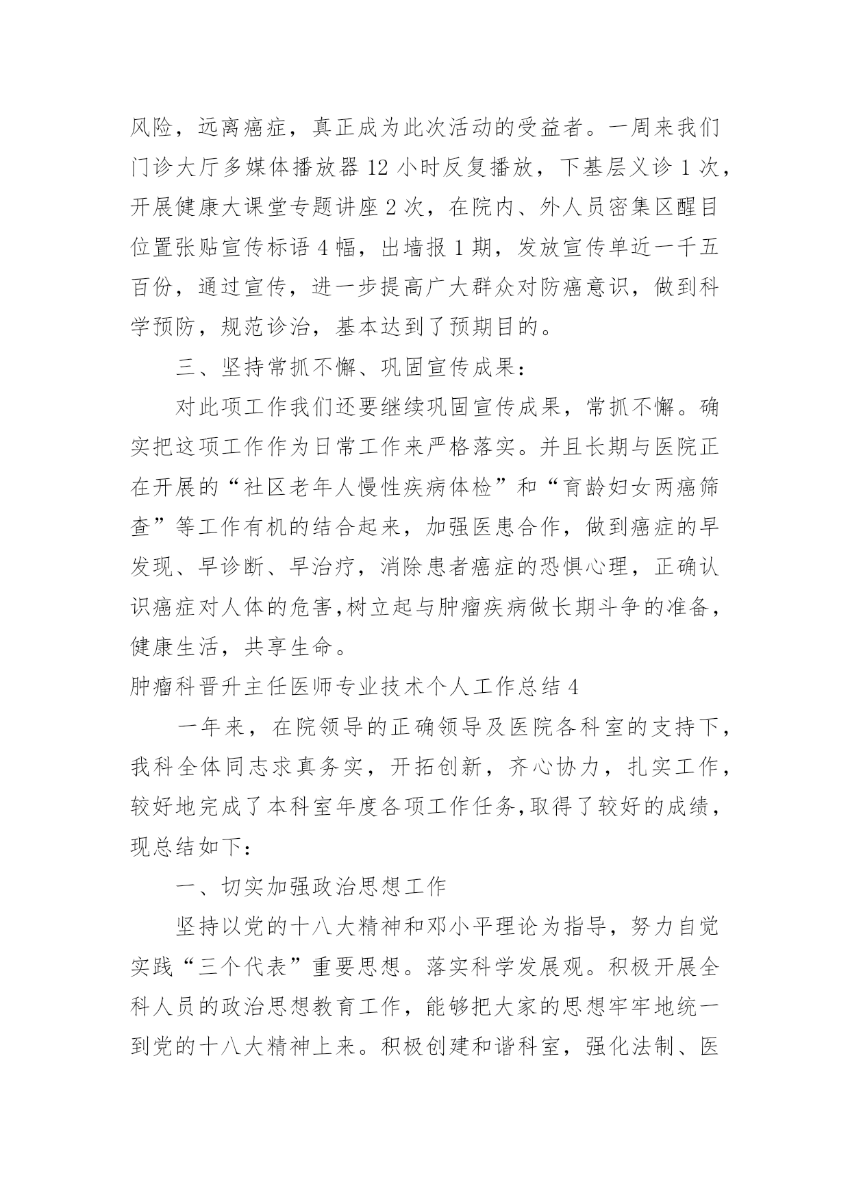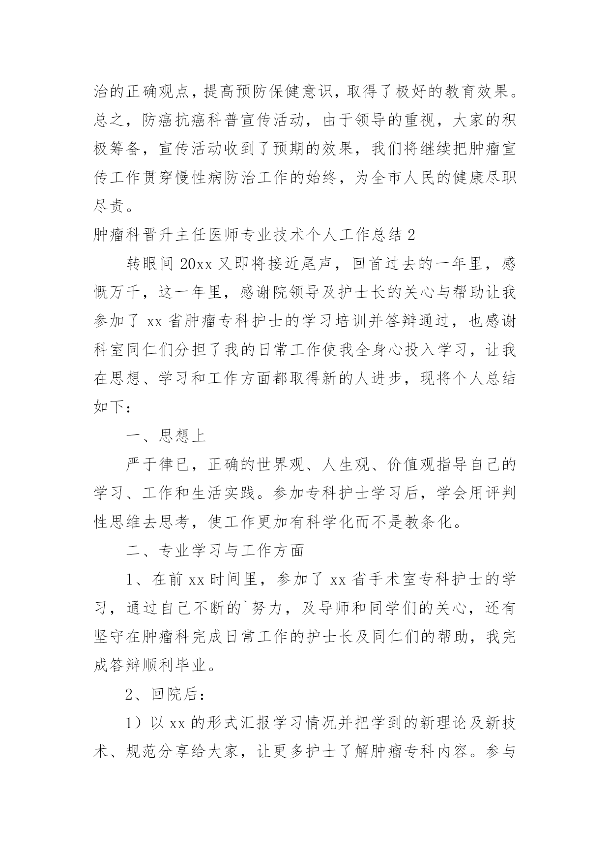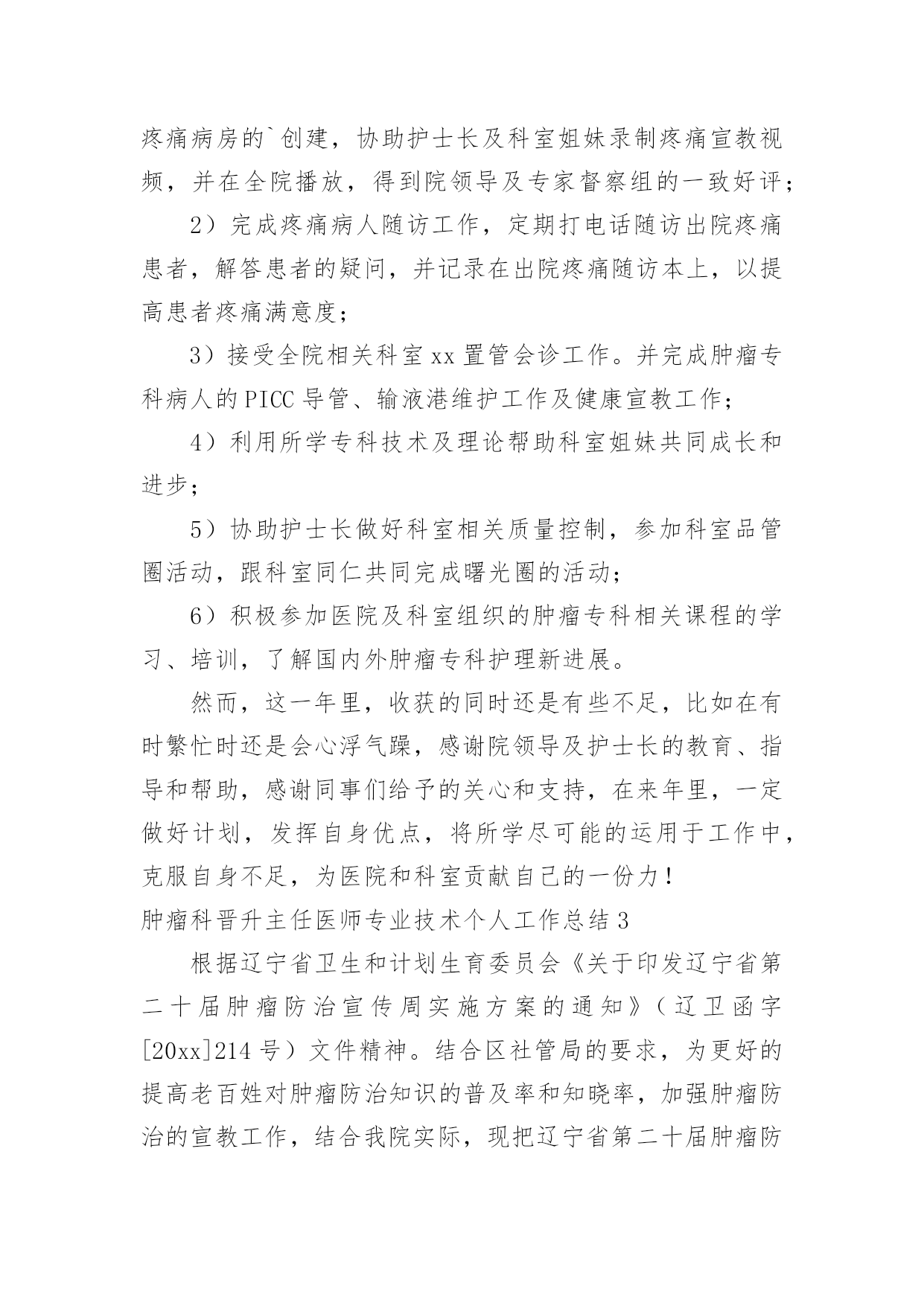 肿瘤科晋升主任医师专业技术个人工作总结肿瘤科晋升主任医师专业技术个人工作总结总结是对某一特定时间段内的学习和工作生活等表现情况加以回顾和分析的一种书面材料,它可以有效锻炼我们的语言组织能力,因此我们要做好归纳,写好总结。但是总结有什么要求呢?以下是小编整理的肿瘤科晋升主任医师专业技术个人工作总结,希望能够帮助到大家。肿瘤科晋升主任医师专业技术个人工作总结1今年4月15-21日是第十八届全国肿瘤防治宣传周,姜山中心卫生院利用这一契机,开展了以“科学抗癌、关爱生命”,“饮食与癌症”为主题的肿瘤防治知识宣传活动,现将活动情况总结如下:一、领导重视,积极做好宣传准备工作在接到市卫生局关于开展“第十八届全国肿瘤防治宣传周”活动的通知文件,安排部署肿瘤防治知识宣传活动。制定了20xx年肿瘤防治宣传周宣传活动方案和策划书,编写了肿瘤防治知识宣传讲座教材、编印肿瘤防治知识宣传单1000份,制定宣传板三块。安排有内科主治医师任日柱下乡讲座、宣传肿瘤防治知识。由于领导重视,准备充分,使宣传工作得以顺利进行。二、打出全国肿瘤宣传主题的滚动字幕从4月15日—4月21日在门诊大厅醒目位置,利用IED灯、打出了全国肿瘤宣传周主题为“科学抗癌,关爱生命”的滚动字幕。让患者都能看到,了解肿瘤这一特殊疾病,对肿瘤有科学的认识和正确的判断,提高全民保健意识,呼吁全社会关爱肿瘤患者,为肿瘤患者提供帮助。三、开展街头肿瘤防治宣传活动4月24日,有主管领导带领慢病宣传教育科、传染科及相关人员共6人,在村集市上市,开展肿瘤防治知识宣传活动,现场拉起“科学抗癌,关爱生命”全国肿瘤防治周主题宣传横幅,向市民发放宣传肿瘤防治知识宣传单及资料800多份,并为过往群众提供咨询、答疑等多种形式的服务。向市民讲解防治、抗癌的基本知识,帮助大家树立对肿瘤疾病的认识,引导市民养成健康的生活习惯,树立“早发现、早诊断、早治疗”的意识。本次宣传活动深受广大群众的欢迎和好评,既提高了群众自我保护意识和能力,又展现了疾控人新形象,产生了良好的'社会影响。四、积极开展肿瘤防治知识健康讲座4月24日上午,在姜山镇刘家埠子村、东岭后村会议室举办了老年人参加的肿瘤防治知识讲座,共计50余人。由主人讲主讲关于“癌症的三级预防”和“科学防癌,倡导健康生活方式”等方面内容,重点讲解不良生活习惯,可以导致癌肿的发生、癌症早期的十大常见症状,对于每个人来说,健康体检非常重要等。我们以提倡健康生活方式为切入点,普及癌症防治知识,让村民科学认识癌症、树立癌症可防可治的正确观点,提高预防保健意识,取得了极好的教育效果。总之,防癌抗癌科普宣传活动,由于领导的重视,大家的积极筹备,宣传活动收到了预期的效果,我们将继续把肿瘤宣传工作贯穿慢性病防治工作的始终,为全市人民的健康尽职尽责。肿瘤科晋升主任医师专业技术个人工作总结2转眼间20xx又即将接近尾声,回首过去的一年里,感慨万千,这一年里,感谢院领导及护士长的关心与帮助让我参加了xx省肿瘤专科护士的学习培训并答辩通过,也感谢科室同仁们分担了我的日常工作使我全身心投入学习,让我在思想、学习和工作方面都取得新的人进步,现将个人总结如下:一、思想上严于律已,正确的世界观、人生观、价值观指导自己的学习、工作和生活实践。参加专科护士学习后,学会用评判性思维去思考,使工作更加有科学化而不是教条化。二、专业学习与工作方面1、在前xx时间里,参加了xx省手术室专科护士的学习,通过自己不断的`努力,及导师和同学们的关心,还有坚守在肿瘤科完成日常工作的护士长及同仁们的帮助,我完成答辩顺利毕业。2、回院后:1)以xx的形式汇报学习情况并把学到的新理论及新技术、规范分享给大家,让更多护士了解肿瘤专科内容。参与疼痛病房的`创建,协助护士长及科室姐妹录制疼痛宣教视频,并在全院播放,得到院领导及专家督察组的一致好评;2)完成疼痛病人随访工作,定期打电话随访出院疼痛患者,解答患者的疑问,并记录在出院疼痛随访本上,以提高患者疼痛满意度;3)接受全院相关科室xx置管会诊工作。并完成肿瘤专科病人的PICC导管、输液港维护工作及健康宣教工作;4)利用所学专科技术及理论帮助科室姐妹共同成长和进步;5)协助护士长做好科室相关质量控制,参加科室品管圈活动,跟科室同仁共同完成曙光圈的活动;6)积极参加医院及科室组织的肿瘤专科相关课程的学习、培训,了解国内外肿瘤专科护理新进展。然而,这一年里,收获的同时还是有些不足,比如在有时繁忙时还是会心浮气躁,感谢院领导及护士长的教育、指导和帮助,感谢同事们给予的关心和支持,在来年里,一定做好计划,发挥自身优点,将所学尽可能的运用于工作中,克服自身不足,为医院和科室贡献自己的一份力!肿瘤科晋升主任医师专业技术个人工作总结3根据辽宁省卫生和计划生育委员会《关于印发辽宁省第二十届肿瘤防治