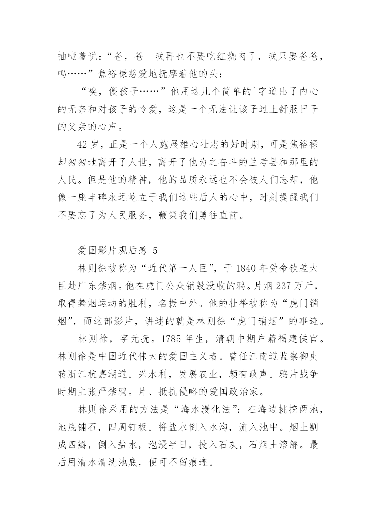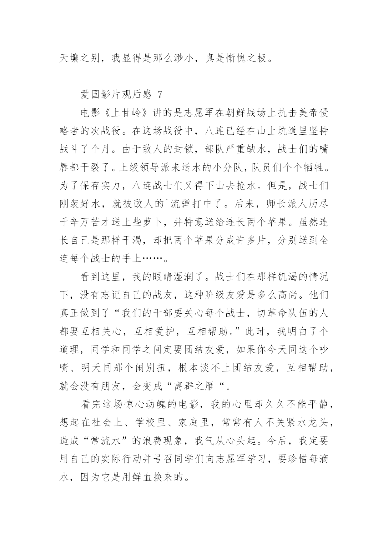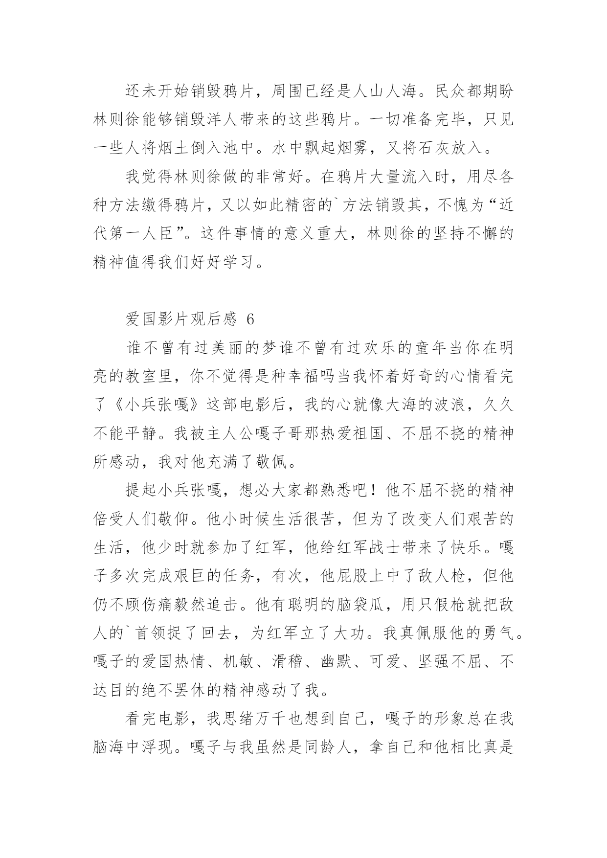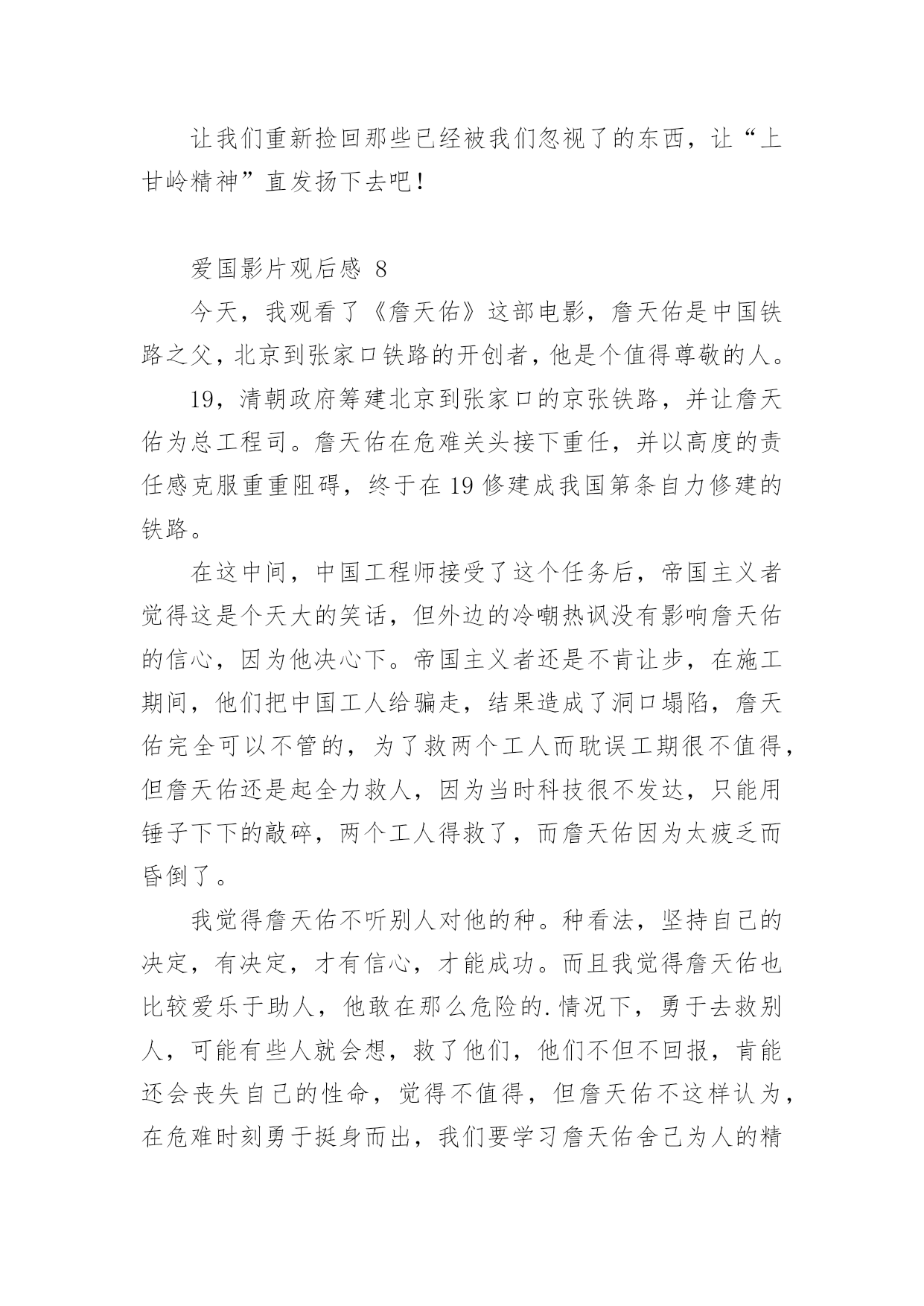 爱国影片观后感爱国影片观后感(精选12篇)当认真看完一部作品后,相信大家增长不少见闻吧,为此需要好好认真地写观后感。为了让您不再为写观后感头疼,下面是小编整理的爱国影片观后感(精选12篇),仅供参考,大家一起来看看吧。爱国影片观后感1当我看完《小兵张嘎》这部爱国主义电影时,我被主人公嘎了哥那热爱祖国、不屈不挠的精神所感动。一提起小兵张嘎,想必大家都很熟悉吧!他不屈不挠的精神倍受人们敬仰。嘎子小时生活很苦,但是为了改变人们艰苦的生活,他少年时就参加了红军,他给红军战士带来了快乐。嘎子多次完成艰巨的任务,有一次,他屁股上中了敌人一枪,但他仍不顾伤痛毅然追击。他聪明的脑袋瓜用一只假枪就把敌人首领捉了回去,为红军立了大功。嘎子的爱国热情、幽默、滑稽、可爱、坚强不屈,不达到目的绝对不罢休的精神感动了我。看完电影,我思绪万千和嘎子对比,我显得是那么渺小。嘎子为完成艰巨的任务而奋不顾身,即使失败也会坚持不懈地去完成而我失败就放弃。记得那次学校开展一次“科技小发明”的活动,我当时就迫不及待地向老师报了名。正当我满怀信心地开始制作我自己设计的“动力小船”时,却发现了一个个让我绞尽脑汁也想不出来的问题。如接上电线了电池却不通电。等我解决了电池的问题后却发现螺旋桨转不了了,当我解决螺旋桨的问题却发现……这一个个问题把我搞得头晕眼花,头上金星乱飞,我一气之下把“动力小船”摔了个稀巴烂。结果认真制作,能持之以恒的`同学获奖了。望着他们胜利的神情我后悔莫及。是啊,有句古话说得好“天下无难事,只要肯攀登。”为何说无难事呢?因为做了,“难”事则转为“易”事不做则反之。联系我们小学生一定要从一点一滴做起。我们只有踏踏实实地走下去,不懂的东西一定要挖根刨底地搞清楚,才能够为我国的将来出一份力量。片中嘎子上县城找一位亲戚时,却发现那位亲戚帮鬼子拍照,脸气得由绿到红由红到紫。嘎子刚正不阿而我却因胆小冤枉他人。记得那是我上四年级时。我刚到家门口,却发现一个人在开我家的门锁。我仔细一看,原来他把我家的锁弄坏了,怎么也打不开了。他见我回来了,便立即恶狠狠地说:“你要敢把这件事说出去,我便揍死你!”我吓得连忙点点头。等我妈回来时却撒了谎说是楼上小妹妹弄的,为此我还经常为此事感到不安呢。同学们,我们是二十一世纪的主人,未来的中国属于我们,我们要发奋学习,像嘎子哥一样毫无保留地把一切贡献给我们的祖国。爱国影片观后感210月30日,我观看了电影《地道战》,它主要是讲:1942年到1944年那几年,日本侵略军在冀中平原上“大扫荡”实施了三大策略:“杀光、抢光、烧光”。冀中人发由于军力不足,不能对抗敌人,就创造了新的斗争方式----地道战。创建地道战以后,敌人就往里面攻击,想方设法地破坏。但是聪明的'冀中人民又想到了很多妙法来防备,敌人没有得逞,他们既怕又恨,但又对我们没办法。在地道里作战时,民兵队长高传宝利用人群来传播消息,使队长的意思能传播给人群。人们有了地道战,敌人的“扫荡”粉碎了,冀中人民取得了胜利。观看这部电影的同时,我一直在想,为什么古代的中国人民如此聪明,而现在的中国人却如此地脆弱无能,就拿诺贝乐奖这个事例来说吧,在外国已经有很多人得了诺贝乐奖,但我们中国却只有几个人获得了诺贝乐奖,真是天壤之别啊!这是什么原因呢?我们中国人并不比别人笨,为什么会这样?告诉你吧,因为我们中国人不懂得合作,只懂得为自己争权谋利。我们回想一下《地道战》吧,如果他们不合作,能修建成地道吗?如果他们不合作,能想出防毒方法吗?所以我呼吁大家不要再争取权谋利了,你倒不如把争取谋利的时间来为国家作奉献,这样也许对你会更好。同时,我也希望我们小学生好好学习,不要玩世不恭,好好学习,不要辜负大家对你的期望,长大为国家做奉献。以史为鉴,珍爱和平!爱国影片观后感3“人要活得精彩,死要死得有尊严。”这是电影《少女穆然》中16岁少女张穆然说的一句话。她说完这句话后便停止了呼吸,平静地走了……这时同学们已泣不成声,眼泪化作一汪湖水,淹没了同学们激动的心。我也哭了,为主人公的坚强而哭,为主人公短暂而辉煌的一生而哭。影片质朴感人,没有影坛巨星加盟,没有高投资,没有大创作,但纯朴自然。影片取材于现实生活的真人真事:穆然从小成绩不太好,被人嘲笑,又远离妈妈,生活很艰苦,但她像一只勇敢倔强的荆棘鸟,活泼、乐观,不幸小小年纪就得了癌症,但她仍然顽强地和病魔作斗争,决不放弃。影片犹如催泪剂,使同学们泪眼模糊,潸然泪下;影片犹如兴奋剂,使同学们心跳加快,心潮澎湃;影片犹如营养液,使同学们感受坚强,精神焕发……我止住眼泪,赞叹道:“好倔强的穆然啊!”当她病入膏肓,疼痛无比,护士想给她打止疼针,她却说:“我在体验痛苦,体验痛苦就是体验活着。”好勇敢的穆然,一个乐观的女孩,一个爱美的女孩,由于化疗,头发都掉光了,但她十分坚强,没流一