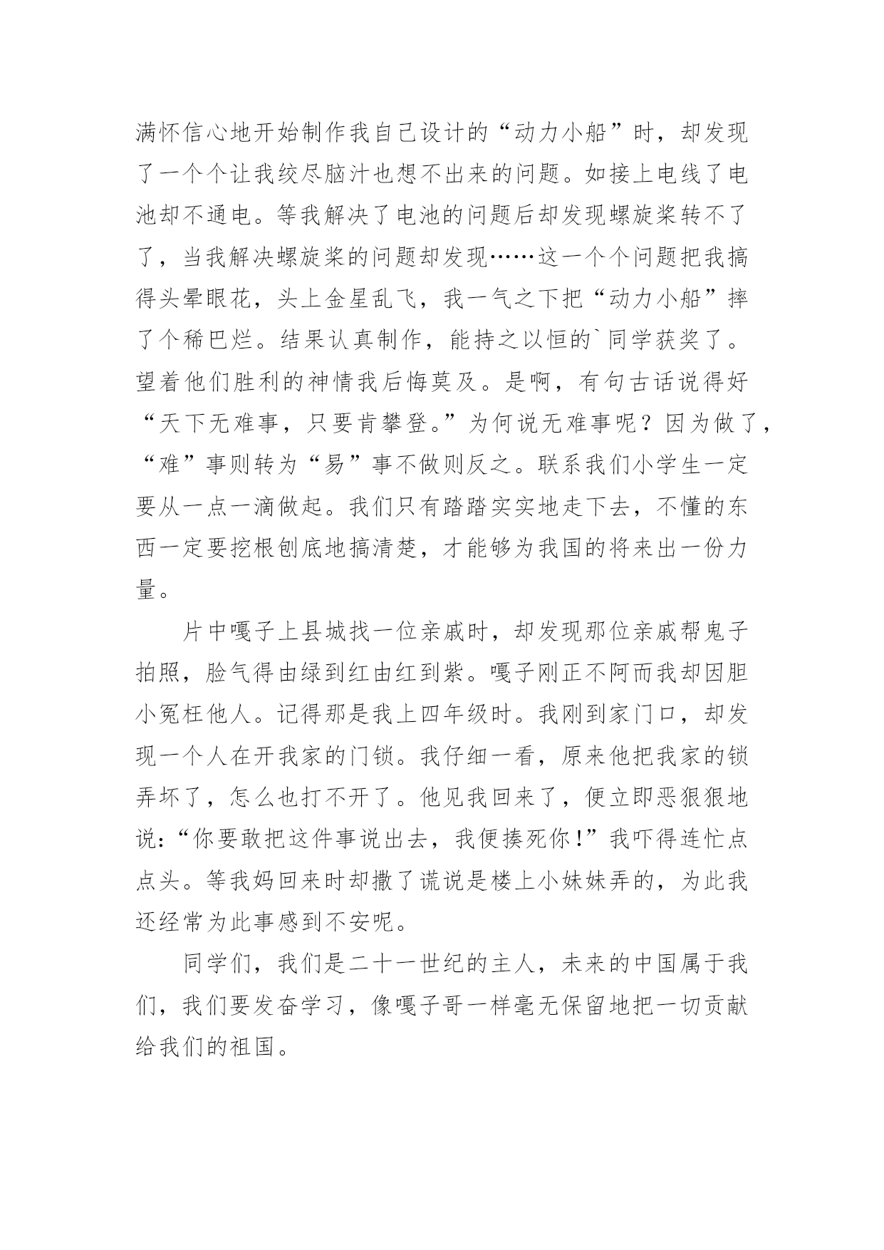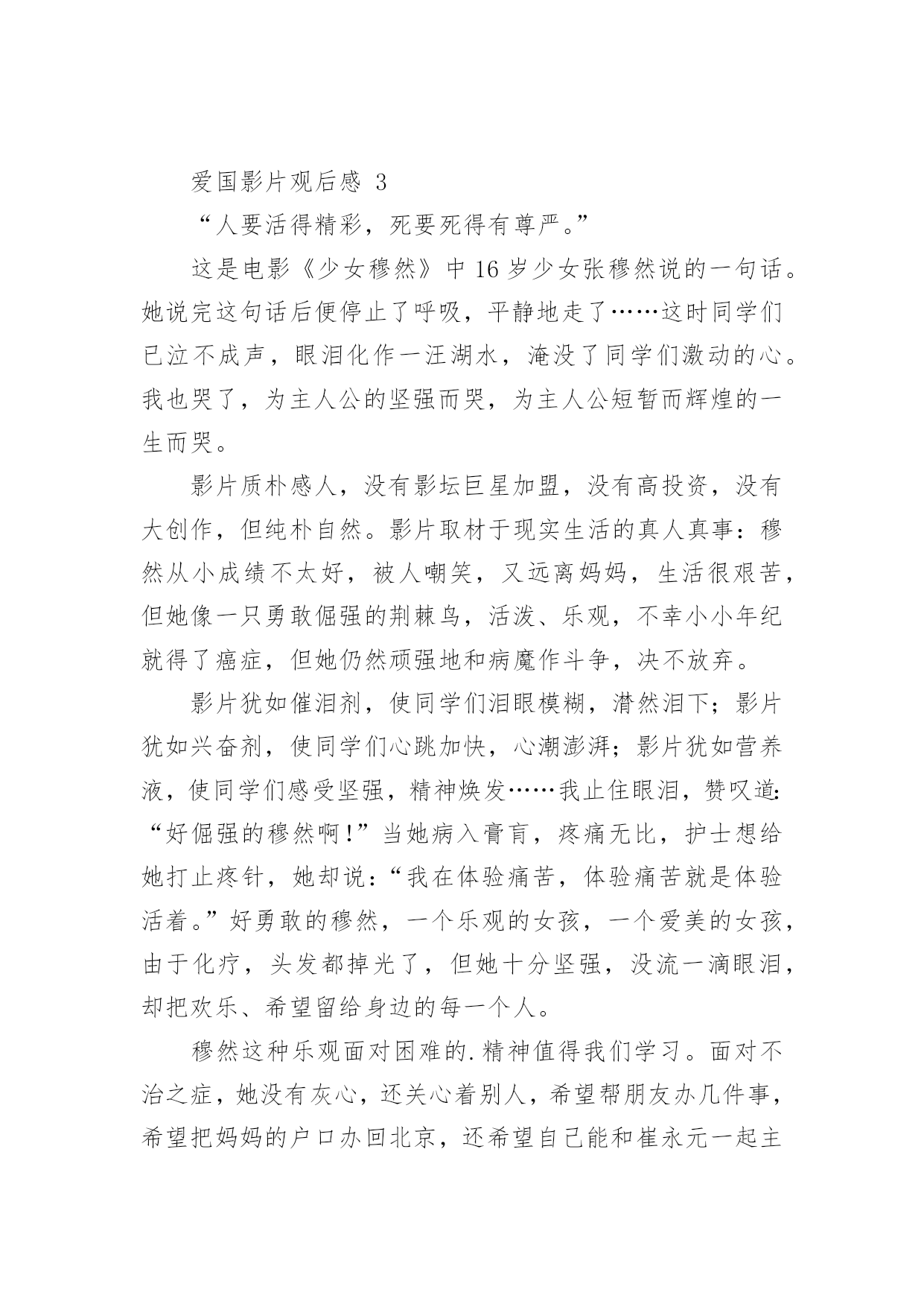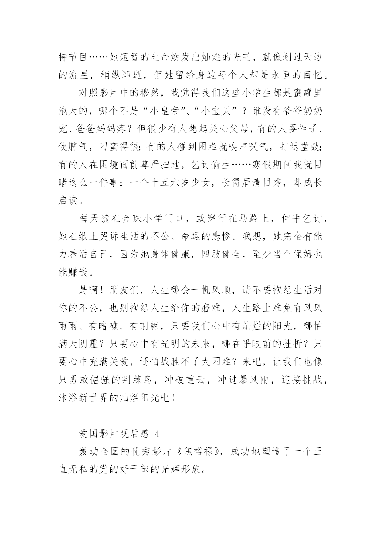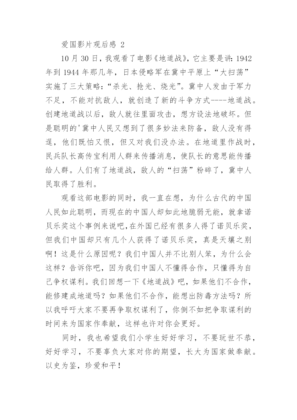 爱国影片观后感爱国影片观后感(精选12篇)当认真看完一部作品后,相信大家增长不少见闻吧,为此需要好好认真地写观后感。为了让您不再为写观后感头疼,下面是小编整理的爱国影片观后感(精选12篇),仅供参考,大家一起来看看吧。爱国影片观后感1当我看完《小兵张嘎》这部爱国主义电影时,我被主人公嘎了哥那热爱祖国、不屈不挠的精神所感动。一提起小兵张嘎,想必大家都很熟悉吧!他不屈不挠的精神倍受人们敬仰。嘎子小时生活很苦,但是为了改变人们艰苦的生活,他少年时就参加了红军,他给红军战士带来了快乐。嘎子多次完成艰巨的任务,有一次,他屁股上中了敌人一枪,但他仍不顾伤痛毅然追击。他聪明的脑袋瓜用一只假枪就把敌人首领捉了回去,为红军立了大功。嘎子的爱国热情、幽默、滑稽、可爱、坚强不屈,不达到目的绝对不罢休的精神感动了我。看完电影,我思绪万千和嘎子对比,我显得是那么渺小。嘎子为完成艰巨的任务而奋不顾身,即使失败也会坚持不懈地去完成而我失败就放弃。记得那次学校开展一次“科技小发明”的活动,我当时就迫不及待地向老师报了名。正当我满怀信心地开始制作我自己设计的“动力小船”时,却发现了一个个让我绞尽脑汁也想不出来的问题。如接上电线了电池却不通电。等我解决了电池的问题后却发现螺旋桨转不了了,当我解决螺旋桨的问题却发现……这一个个问题把我搞得头晕眼花,头上金星乱飞,我一气之下把“动力小船”摔了个稀巴烂。结果认真制作,能持之以恒的`同学获奖了。望着他们胜利的神情我后悔莫及。是啊,有句古话说得好“天下无难事,只要肯攀登。”为何说无难事呢?因为做了,“难”事则转为“易”事不做则反之。联系我们小学生一定要从一点一滴做起。我们只有踏踏实实地走下去,不懂的东西一定要挖根刨底地搞清楚,才能够为我国的将来出一份力量。片中嘎子上县城找一位亲戚时,却发现那位亲戚帮鬼子拍照,脸气得由绿到红由红到紫。嘎子刚正不阿而我却因胆小冤枉他人。记得那是我上四年级时。我刚到家门口,却发现一个人在开我家的门锁。我仔细一看,原来他把我家的锁弄坏了,怎么也打不开了。他见我回来了,便立即恶狠狠地说:“你要敢把这件事说出去,我便揍死你!”我吓得连忙点点头。等我妈回来时却撒了谎说是楼上小妹妹弄的,为此我还经常为此事感到不安呢。同学们,我们是二十一世纪的主人,未来的中国属于我们,我们要发奋学习,像嘎子哥一样毫无保留地把一切贡献给我们的祖国。爱国影片观后感210月30日,我观看了电影《地道战》,它主要是讲:1942年到1944年那几年,日本侵略军在冀中平原上“大扫荡”实施了三大策略:“杀光、抢光、烧光”。冀中人发由于军力不足,不能对抗敌人,就创造了新的斗争方式----地道战。创建地道战以后,敌人就往里面攻击,想方设法地破坏。但是聪明的'冀中人民又想到了很多妙法来防备,敌人没有得逞,他们既怕又恨,但又对我们没办法。在地道里作战时,民兵队长高传宝利用人群来传播消息,使队长的意思能传播给人群。人们有了地道战,敌人的“扫荡”粉碎了,冀中人民取得了胜利。观看这部电影的同时,我一直在想,为什么古代的中国人民如此聪明,而现在的中国人却如此地脆弱无能,就拿诺贝乐奖这个事例来说吧,在外国已经有很多人得了诺贝乐奖,但我们中国却只有几个人获得了诺贝乐奖,真是天壤之别啊!这是什么原因呢?我们中国人并不比别人笨,为什么会这样?告诉你吧,因为我们中国人不懂得合作,只懂得为自己争权谋利。我们回想一下《地道战》吧,如果他们不合作,能修建成地道吗?如果他们不合作,能想出防毒方法吗?所以我呼吁大家不要再争取权谋利了,你倒不如把争取谋利的时间来为国家作奉献,这样也许对你会更好。同时,我也希望我们小学生好好学习,不要玩世不恭,好好学习,不要辜负大家对你的期望,长大为国家做奉献。以史为鉴,珍爱和平!爱国影片观后感3“人要活得精彩,死要死得有尊严。”这是电影《少女穆然》中16岁少女张穆然说的一句话。她说完这句话后便停止了呼吸,平静地走了……这时同学们已泣不成声,眼泪化作一汪湖水,淹没了同学们激动的心。我也哭了,为主人公的坚强而哭,为主人公短暂而辉煌的一生而哭。影片质朴感人,没有影坛巨星加盟,没有高投资,没有大创作,但纯朴自然。影片取材于现实生活的真人真事:穆然从小成绩不太好,被人嘲笑,又远离妈妈,生活很艰苦,但她像一只勇敢倔强的荆棘鸟,活泼、乐观,不幸小小年纪就得了癌症,但她仍然顽强地和病魔作斗争,决不放弃。影片犹如催泪剂,使同学们泪眼模糊,潸然泪下;影片犹如兴奋剂,使同学们心跳加快,心潮澎湃;影片犹如营养液,使同学们感受坚强,精神焕发……我止住眼泪,赞叹道:“好倔强的穆然啊!”当她病入膏肓,疼痛无比,护士想给她打止疼针,她却说:“我在体验痛苦,体验痛苦就是体验活着。”好勇敢的穆然,一个乐观的女孩,一个爱美的女孩,由于化疗,头发都掉光了,但她十分坚强,没流一