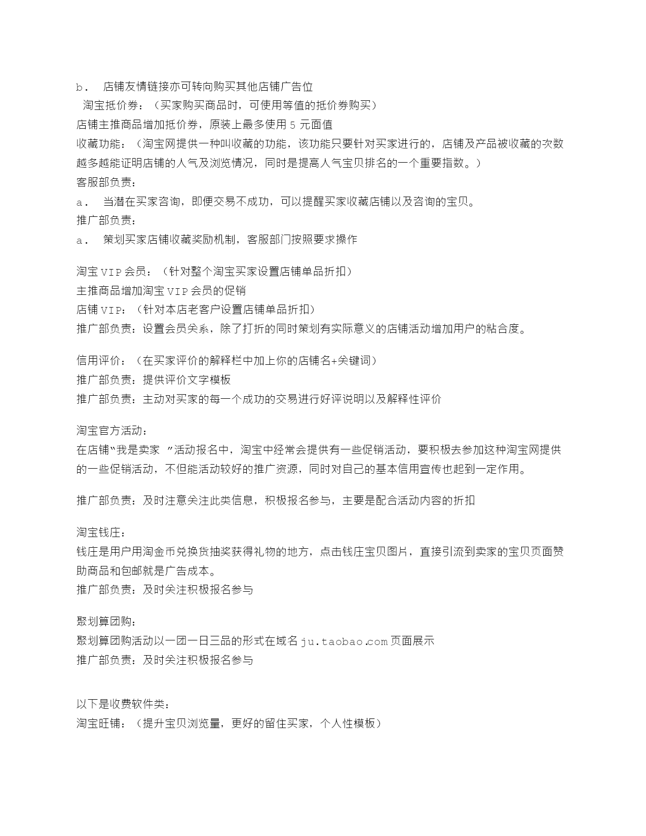 淘宝商城运营日常工作内容规划指导淘宝的几个项目类别:免费资源、收费软件、收费营销类免费资源包括下面这些项目淘宝搜索引擎优化:侧重于标题关键词的运用、宝贝描述页文字的详细度,增加宝贝排名。(这个是常规基础,需要的是人力成本)负责新上架商品根据淘宝网内部排名规则进行SEO关键词提取.负责根据淘宝网内部排名规则制定关键词排列规则负责参照关键词以及排名规则进行标题功能性,宝贝描述避免触犯淘宝规则淘宝社区、淘江湖:活跃发帖、回帖,帮助买家答疑(侧重买家)通过发帖ID引流到店铺报名参加社区促销活动争取社区首页免费广告位(这三点需要积极配合需要人力成本银币赚取成本)客服部负责负责在淘宝社区用主ID发帖,带动店铺人气。运营推广部负责通过社区获取的银币抢购社区免费广告位,每天12:00到次日9:00开始预定,9:00以后淘宝网工作人员会作审核,不符合要求的广告删除并退回银币,符合要求的将在审核后12:00发布,有效期1天,可以推荐店铺或单件商品。淘宝帮派:1、加入促销帮派,争取免费帮派推广资源2、建立自己的帮派,涵盖店铺所有促销活动详情的说明页主要推广部负责加入淘宝促销帮【官方】,促销频道(官方)等帮派。负责及时关注帮派最新活动,提交报名方案,并参与报名负责官方客情关系梳理,增加活动选中率。友情链接:增加和其他高质量店铺的互通链接,通过其他店铺的反链接进入店铺友情链接店铺的添加,涉及多类目店铺(设置店铺参与淘宝客增大友情链接的可能性)店铺友情链接亦可转向购买其他店铺广告位淘宝抵价券:(买家购买商品时,可使用等值的抵价券购买)店铺主推商品增加抵价券,原装上最多使用5元面值收藏功能:(淘宝网提供一种叫收藏的功能,该功能只要针对买家进行的,店铺及产品被收藏的次数越多越能证明店铺的人气及浏览情况,同时是提高人气宝贝排名的一个重要指数。)客服部负责:当潜在买家咨询,即便交易不成功,可以提醒买家收藏店铺以及咨询的宝贝。推广部负责:策划买家店铺收藏奖励机制,客服部门按照要求操作淘宝VIP会员:(针对整个淘宝买家设置店铺单品折扣)主推商品增加淘宝VIP会员的促销店铺VIP:(针对本店老客户设置店铺单品折扣)推广部负责:设置会员关系,除了打折的同时策划有实际意义的店铺活动增加用户的粘合度。信用评价:(在买家评价的解释栏中加上你的店铺名+关键词)推广部负责:提供评价文字模板推广部负责:主动对买家的每一个成功的交易进行好评说明以及解释性评价淘宝官方活动:在店铺“我是卖家”活动报名中,淘宝中经常会提供有一些促销活动,要积极去参加这种淘宝网提供的一些促销活动,不但能活动较好的推广资源,同时对自己的基本信用宣传也起到一定作用。推广部负责:及时注意关注此类信息,积极报名参与,主要是配合活动内容的折扣淘宝钱庄:钱庄是用户用淘金币兑换货抽奖获得礼物的地方,点击钱庄宝贝图片,直接引流到卖家的宝贝页面赞助商品和包邮就是广告成本。推广部负责:及时关注积极报名参与聚划算团购:聚划算团购活动以一团一日三品的形式在域名ju.taobao.com页面展示推广部负责:及时关注积极报名参与以下是收费软件类:淘宝旺铺:(提升宝贝浏览量,更好的留住买家,个人性模板)满就送:a.满就送积分;满就送礼物;满就减现金;满就免邮功能:提升店铺销售业绩,提高店铺购买转化率,提升销售笔数,增加商品曝光力度,节约人力成本。搭配套餐:(将几种商品组合在一起设置成套餐来销售,通过促销套餐可以让买家一次性购买更多的商品。提升店铺销售业绩,提高店铺购买转化率)需要商品管理专员了解产品的合理搭配,设置优惠套餐,提高店铺购买转化率,同时增加商品曝光量,增加在淘宝搜搜首页”服务“筛选展示机会。限时打折:(系统帮助卖家设置限量的打折活动,买家方便迅速寻找打折商品,功能超低折扣吸引流量,限时限量刺激购买行动力)增加在淘宝搜搜首页”服务“筛选展示机会。可以考虑周末定期某个时间限制3小时,拿出一款商品特价销售,产品由商品部提供,编辑丰富内容,曹启和负责限时打折投放操作会员关系管理:(高效管理会员信息设置会员级别,会员广告营销)网店版行情参谋:(查询热卖宝贝行情买家热门搜索关键字,查询自己的宝贝排在第几页,比较同类宝贝的价格和销量,了解被人为什么卖得好。)以下是收费营销类:直通车:(淘宝直通车是淘宝网为淘宝卖家量身定制的推广工具,是通过关键词竞价按照点击付费,进行商品精准推广的服务)直通车活动的参加:目前淘宝频道页最下面的”热卖单品“均为直通车活动钻石展位:(钻石展位是专为有更高推广需求的卖家量身定制的产品。精选了淘宝最优质的展示位置,通过竞价排序,按照展现计费。)