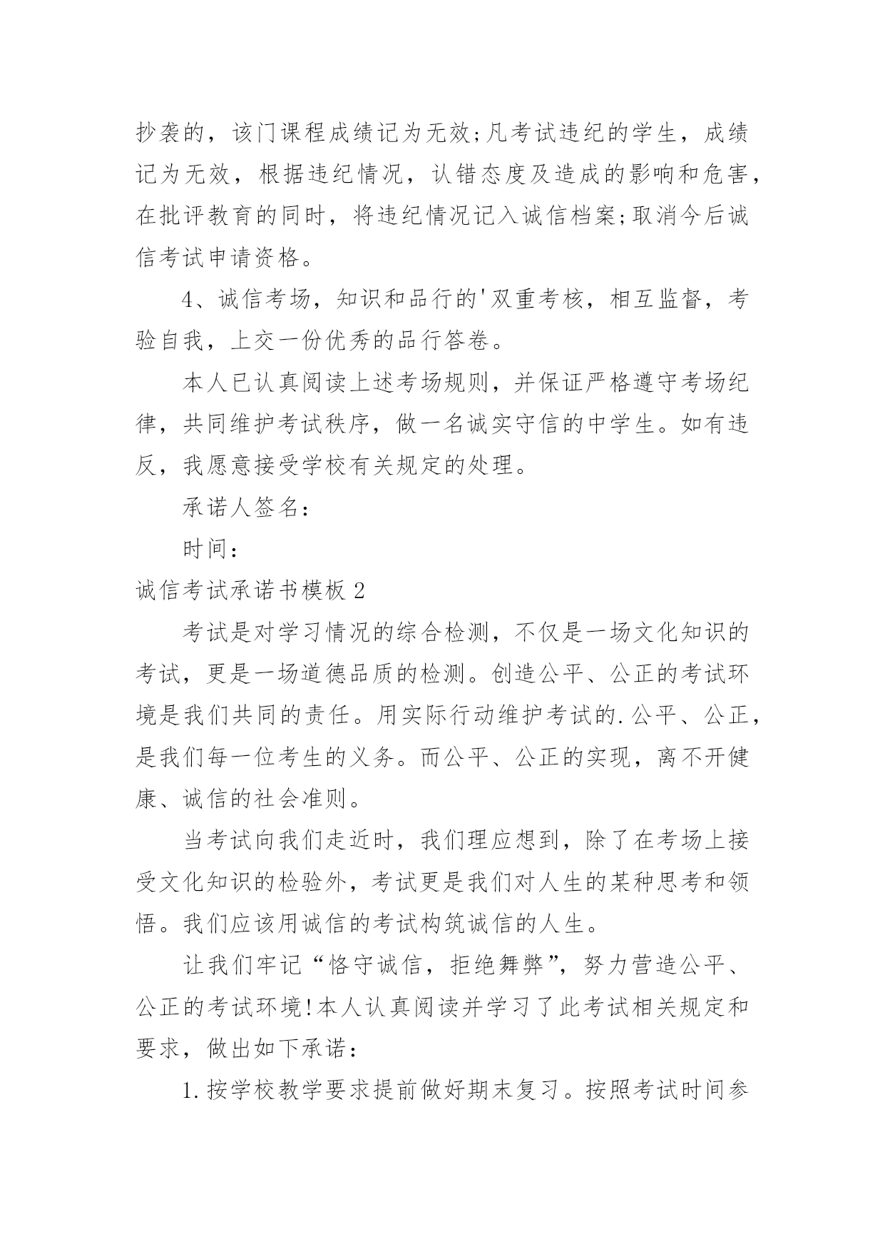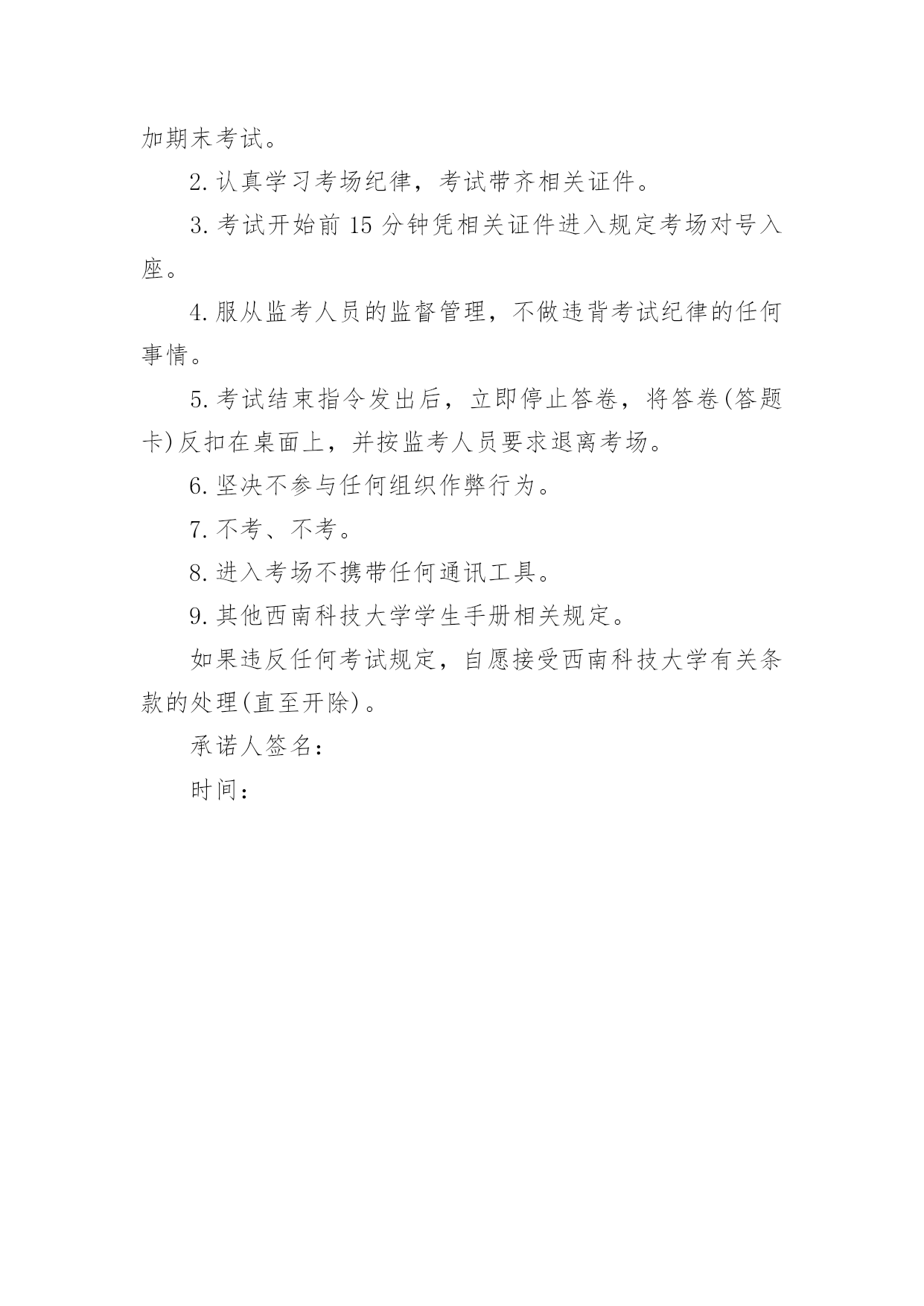 诚信考试承诺书诚信考试承诺书模板在充满活力,日益开放的今天,承诺书在我们的视野里出现的频率越来越高,承诺书是签署人内心真实意愿的表示,忌搞形式、走过场,忌出于无奈。承诺书的注意事项有许多,你确定会写吗?以下是小编为大家收集的诚信考试承诺书模板,欢迎大家借鉴与参考,希望对大家有所帮助。诚信考试承诺书模板1本人自愿参加学校组织的诚信考试,愿意在考试中自学遵守各项考试规定,现郑重承诺:一、严格遵守考试的规定和守则,保证按规定的程序和要求参加考试,如有违反,自愿按学校有关违规违纪处理办法接受惩戒处理。二、坚决服从巡考教师管理,自觉遵守考试纪律。1、按时进入考场,不迟到或中途离常2、考试学生必须按座位号就坐,考试中不得交谈,左顾右盼,互借文具(包括计算尺,计算器等)。试题字迹不清,可等待询问巡检教师,但不得要求解释题意。当考试时间已到时,立即停止答卷,将考卷反扣在桌面上,禁止喧哗。由监考教师将考卷收完后,离开座位。3、严禁考试违纪,作弊。凡提供,传递,抄袭与考试课程内容有关的信息资料的,或抄袭他人答卷或故意给他人抄袭的,该门课程成绩记为无效;凡考试违纪的学生,成绩记为无效,根据违纪情况,认错态度及造成的影响和危害,在批评教育的同时,将违纪情况记入诚信档案;取消今后诚信考试申请资格。4、诚信考场,知识和品行的'双重考核,相互监督,考验自我,上交一份优秀的品行答卷。本人已认真阅读上述考场规则,并保证严格遵守考场纪律,共同维护考试秩序,做一名诚实守信的中学生。如有违反,我愿意接受学校有关规定的处理。承诺人签名:时间:诚信考试承诺书模板2考试是对学习情况的综合检测,不仅是一场文化知识的考试,更是一场道德品质的检测。创造公平、公正的考试环境是我们共同的责任。用实际行动维护考试的.公平、公正,是我们每一位考生的义务。而公平、公正的实现,离不开健康、诚信的社会准则。当考试向我们走近时,我们理应想到,除了在考场上接受文化知识的检验外,考试更是我们对人生的某种思考和领悟。我们应该用诚信的考试构筑诚信的人生。让我们牢记“恪守诚信,拒绝舞弊”,努力营造公平、公正的考试环境!本人认真阅读并学习了此考试相关规定和要求,做出如下承诺:1.按学校教学要求提前做好期末复习。按照考试时间参加期末考试。2.认真学习考场纪律,考试带齐相关证件。3.考试开始前15分钟凭相关证件进入规定考场对号入座。4.服从监考人员的监督管理,不做违背考试纪律的任何事情。5.考试结束指令发出后,立即停止答卷,将答卷(答题卡)反扣在桌面上,并按监考人员要求退离考场。6.坚决不参与任何组织作弊行为。7.不考、不考。8.进入考场不携带任何通讯工具。9.其他西南科技大学学生手册相关规定。如果违反任何考试规定,自愿接受西南科技大学有关条款的处理(直至开除)。承诺人签名:时间: