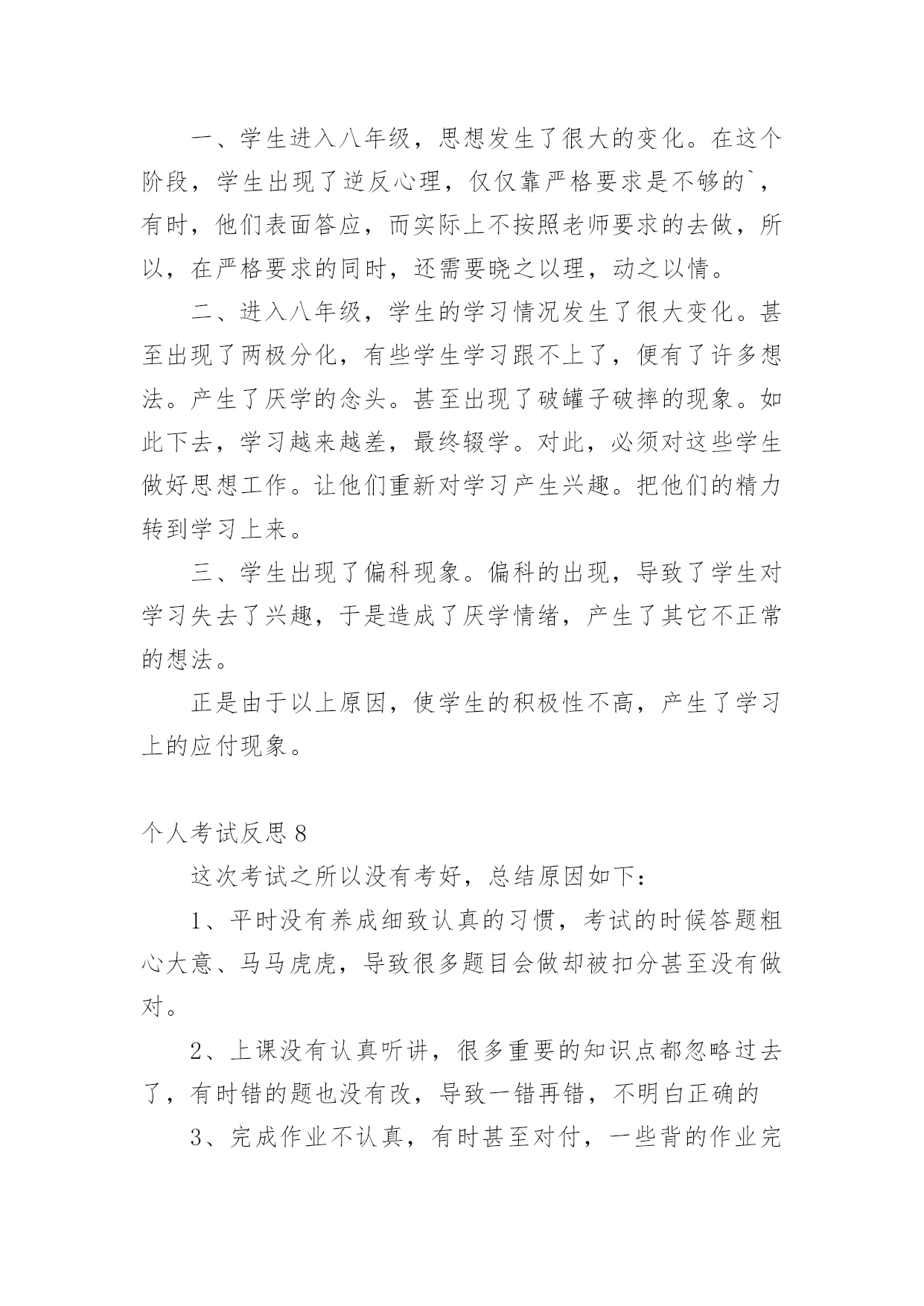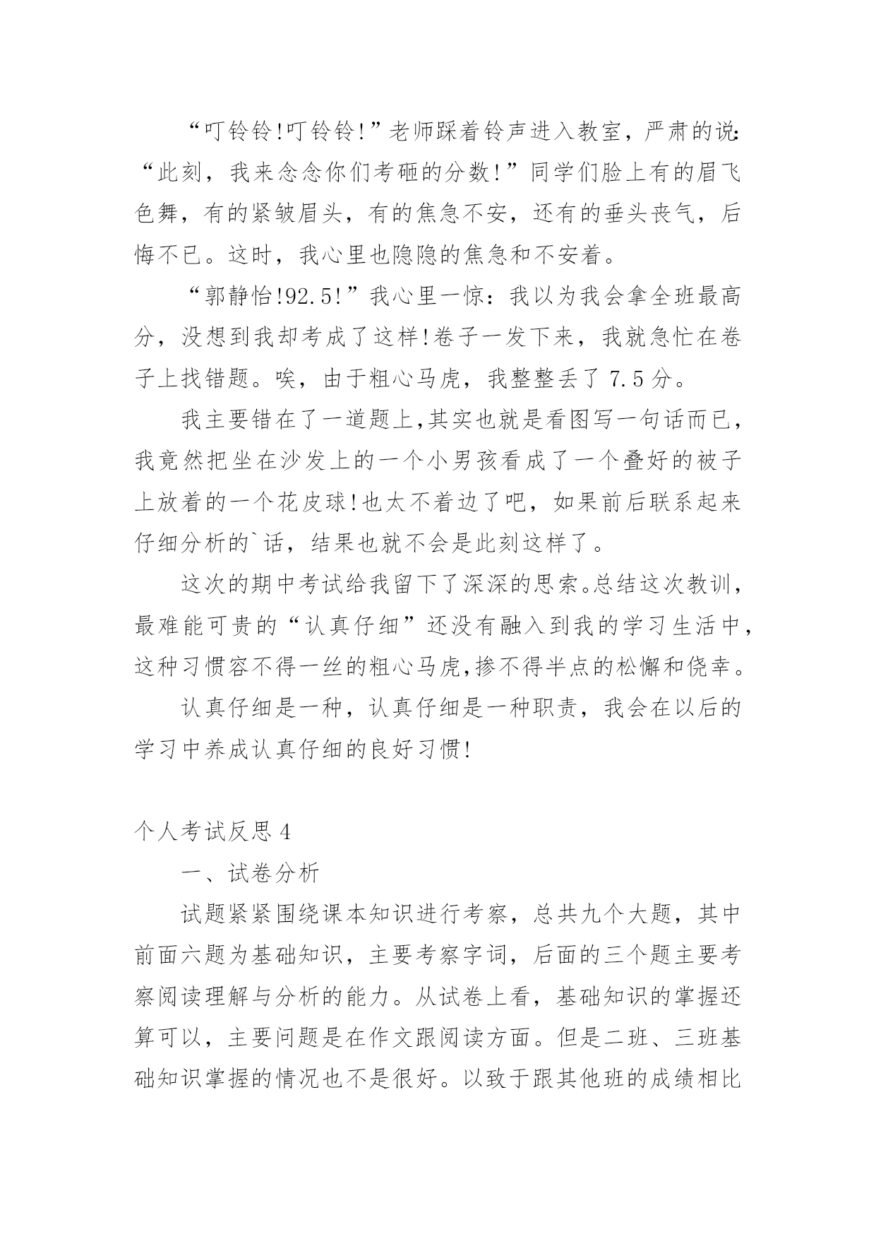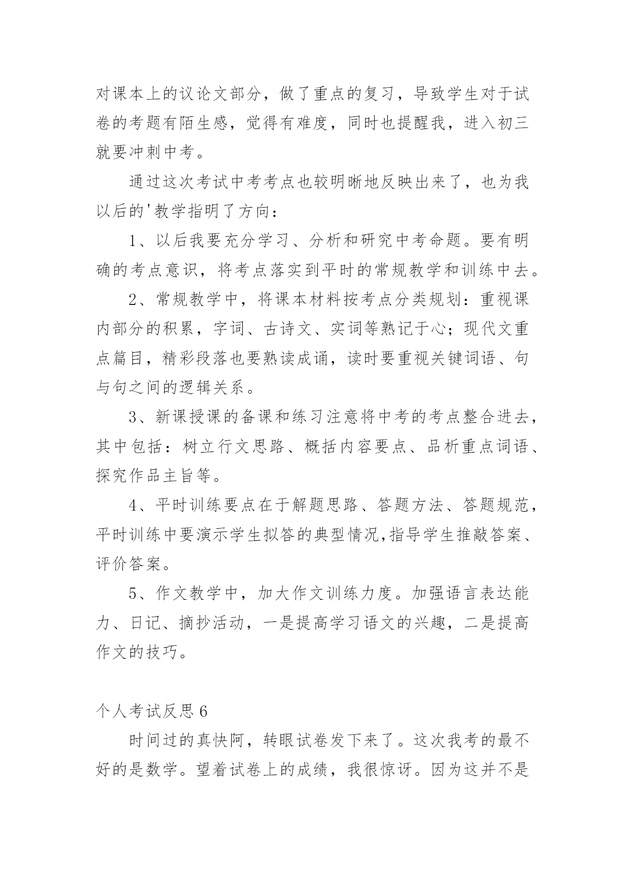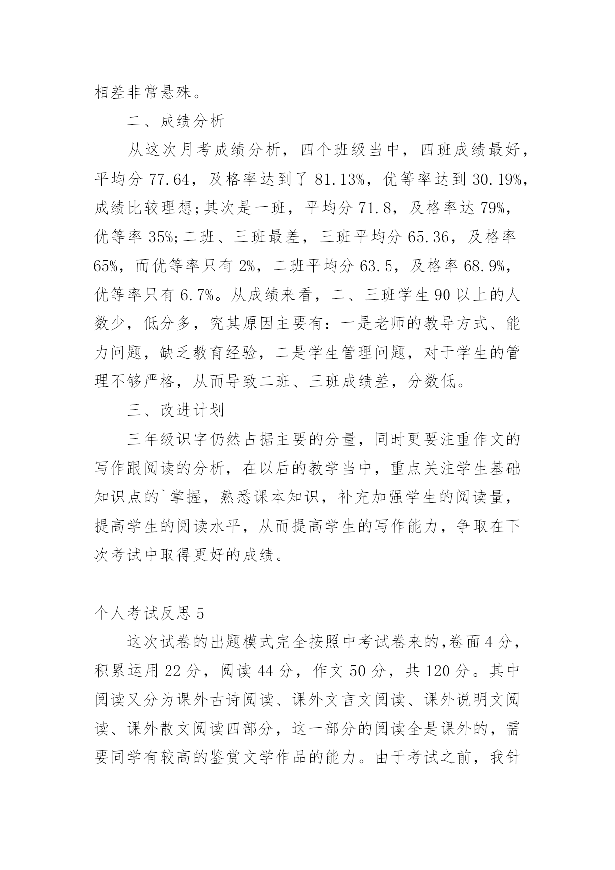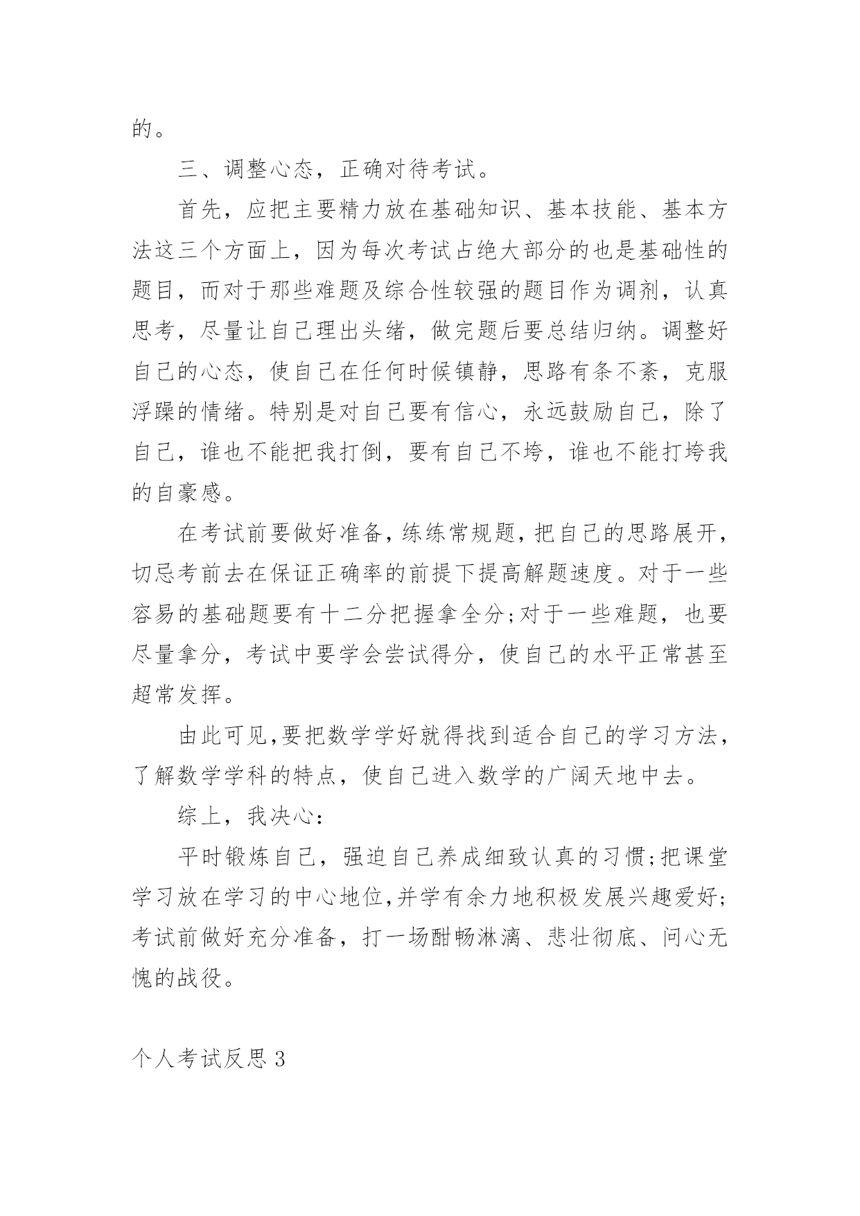 个人考试反思【精】个人考试反思在学习、工作、生活中,教学是我们的任务之一,反思意为自我反省。那么什么样的反思才是好的呢?以下是小编精心整理的个人考试反思,仅供参考,大家一起来看看吧。个人考试反思1从这次月考我总结出许多学习道理和学习方法,当我们考试差时,如果只会一味地去找理由的话,或把错的责任推到别人身上的话,那么便会永远掩盖着错误,一直错下去。如果该每天完成的学习任务没有完成,喜欢集中复习,临考突击,每天该学、该记的欠账的话,便会更难取得好成绩。要做到必须每天的知识积累,每天复习,而且要做到专心致志学习才行。知识是靠日积月累的,人不可能在极短的`时间内,把大量的学习内容灌输入到大脑里去。“饥一顿饱一顿”的,“三天打鱼两天晒网”这样只会事半功倍的。因此,我们一定要做到定时定量学习。学习靠积累,学习靠努力;机会仅有一次,不能放过任何一次考试!个人考试反思2此次试题,重视基础知识,基本技能的考查,不设偏题难题,从成绩来看,学生的总体水平有进步,但从学生的试卷中可以看出来学生还存在很多不足,基础知识掌握的不够好,平时学习不够扎实,对自身要求不够严格,还有相当部分同学阅读理解能力差,知识的扩展和积累不够、1、基础知识:基础知识部分方面仍有失分现象。本试卷中的基础知识几乎都是课本上的,老师强调的,但是还有学生失分较多,说明基础知识的落实不够。2、阅读理解题方面:课内阅读学生失分较少,但课外阅读学生失分率较高,虽然平时也做了相应的阅读理解题,但觉得由于学生的重视程度不够,由来已久的理解水平差异,导致了试卷上失分较多。3、课外知识的积累方面:语文学习受到其他学科挤压,生态环境恶劣,举步维艰。4、作文方面:记叙文的写作平时训练的不少,学生能做到叙事清楚、语言流畅,但缺少细致的描写,写作技巧不够,文章不能感人。改进:1、将基础知识教学和课外知识积累落到实处。2、增加学生阅读训练。课堂教学引导学生主动理解课文内容,做题时重视阅读题,并且要进行阅读题做法的指导,循序渐进,投入时间和精力。3、写作方面充分利用阅读课让学生多读书,积累素材,学习写作技巧。这次考试之所以没有考好,总结原因如下:1、平时没有养成细致认真的习惯,考试的时候答题粗心大意、马马虎虎,导致很多题目会做却被扣分甚至没有做对。2、准备不充分。毛主席说,不打无准备之仗。言外之意,无准备之仗很难打赢,我却没有按照这句至理名言行事,导致这次考试吃了亏。3、没有解决好兴趣与课程学习的矛盾。自己有很多兴趣,作为一个人,一个完整的人,一个明白的人,当然不应该同机器一样,让自己的兴趣被平白无故抹煞,那样不仅悲惨而且无知,但是,如果因为自己的兴趣严重耽搁了学习就不好了,不仅不好,有时候真的是得不偿失。失败了怎么办?认真反思是首先的:第一,这次失败的原因是什么?要认真思考,挖掘根本的原因;第二,你接下来要干什么?确定自己的目标,不要因为失败不甘心接着走,而是要正确地衡量自己。看看想要什么,自己的优势在什么地方,弱势是什么;第三,确定目标。明确自己想要的`,制定计划,按部就班的走。失败不可怕,可怕的是一蹶不振以及盲目的追求。数学是必考科目之一,故从初一开始就要认真地学习数学。那么,怎样才能学好数学呢?现介绍几种方法以供参考:一、课内重视听讲,课后及时复习。新知识的接受,数学能力的培养主要在课堂上进行,所以要特点重视课内的学习效率,寻求正确的学习方法。上课时要紧跟老师的思路,积极展开思维预测下面的步骤,比较自己的解题思路与教师所讲有哪些不同。特别要抓住基础知识和基本技能的学习,课后要及时复习不留疑点。首先要在做各种习题之前将老师所讲的知识点回忆一遍,正确掌握各类公式的推理过程,庆尽量回忆而不采用不清楚立即翻书之举。认真独立完成作业,勤于思考,从某种意义上讲,应不造成不懂即问的学习作风,对于有些题目由于自己的思路不清,一时难以解出,应让自己冷静下来认真分析题目,尽量自己解决。在每个阶段的学习中要进行整理和归纳总结,把知识的点、线、面结合起来交织成知识网络,纳入自己的知识体系。二、适当多做题,养成良好的解题习惯。要想学好数学,多做题目是难免的,熟悉掌握各种题型的解题思路。刚开始要从基础题入手,以课本上的习题为准,反复练习打好基础,再找一些课外的习题,以帮助开拓思路,提高自己的分析、解决能力,掌握一般的解题规律。对于一些易错题,可备有错题集,写出自己的解题思路和正确的解题过程两者一起比较找出自己的错误所在,以便及时更正。在平时要养成良好的解题习惯。让自己的精力高度集中,使大脑兴奋,思维敏捷,能够进入最佳状态,在考试中能运用自如。实践证明:越到关键时候,你所表现的解题习惯与平时练习无异。如果平时解题时随便、粗心、大意等,往往在大考中充分暴露,故在平时养成良好的解题习惯是非常重要的。三、调整心态,正确对待考试。首