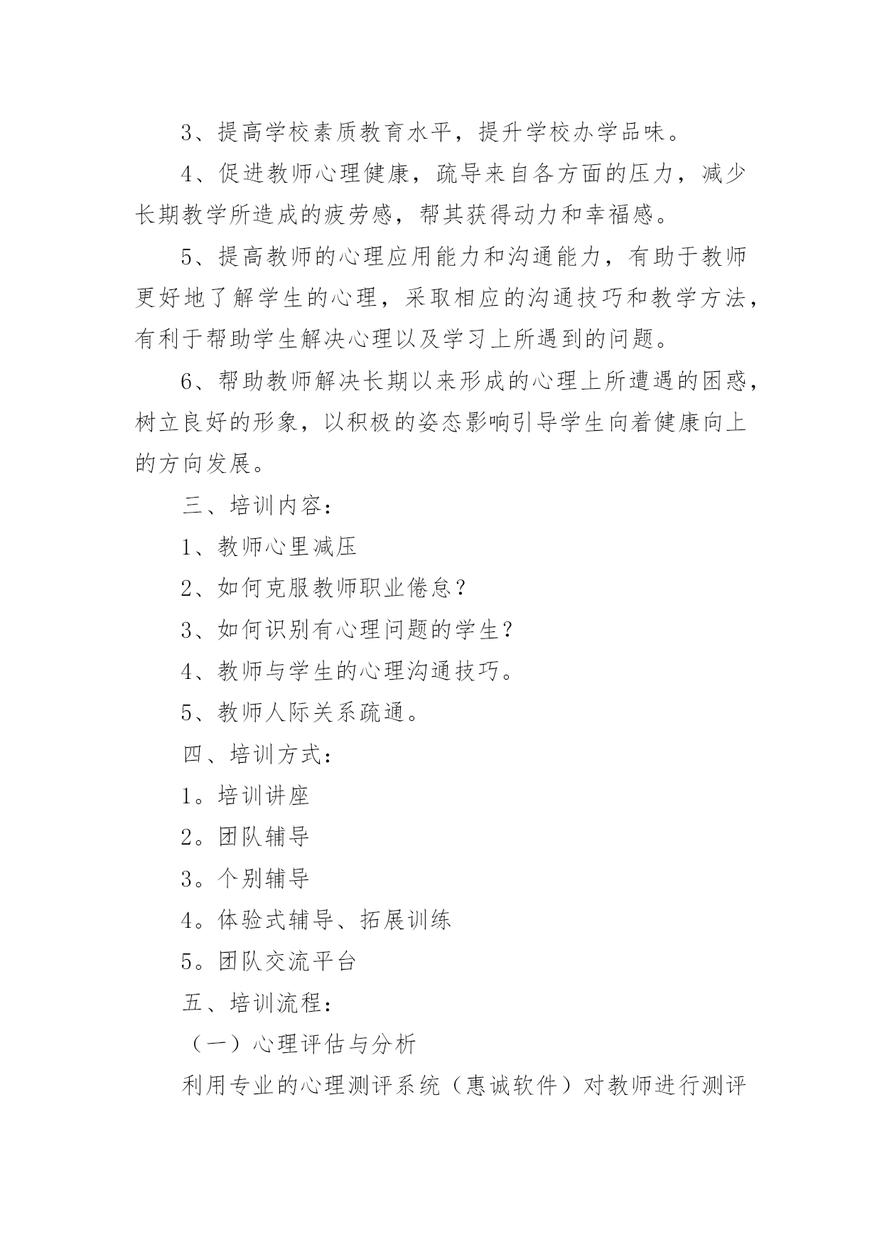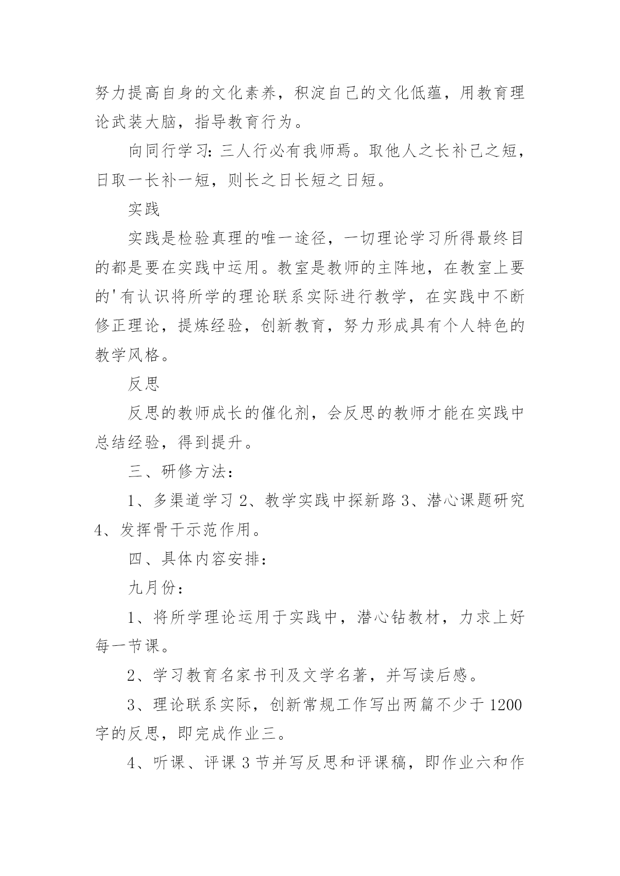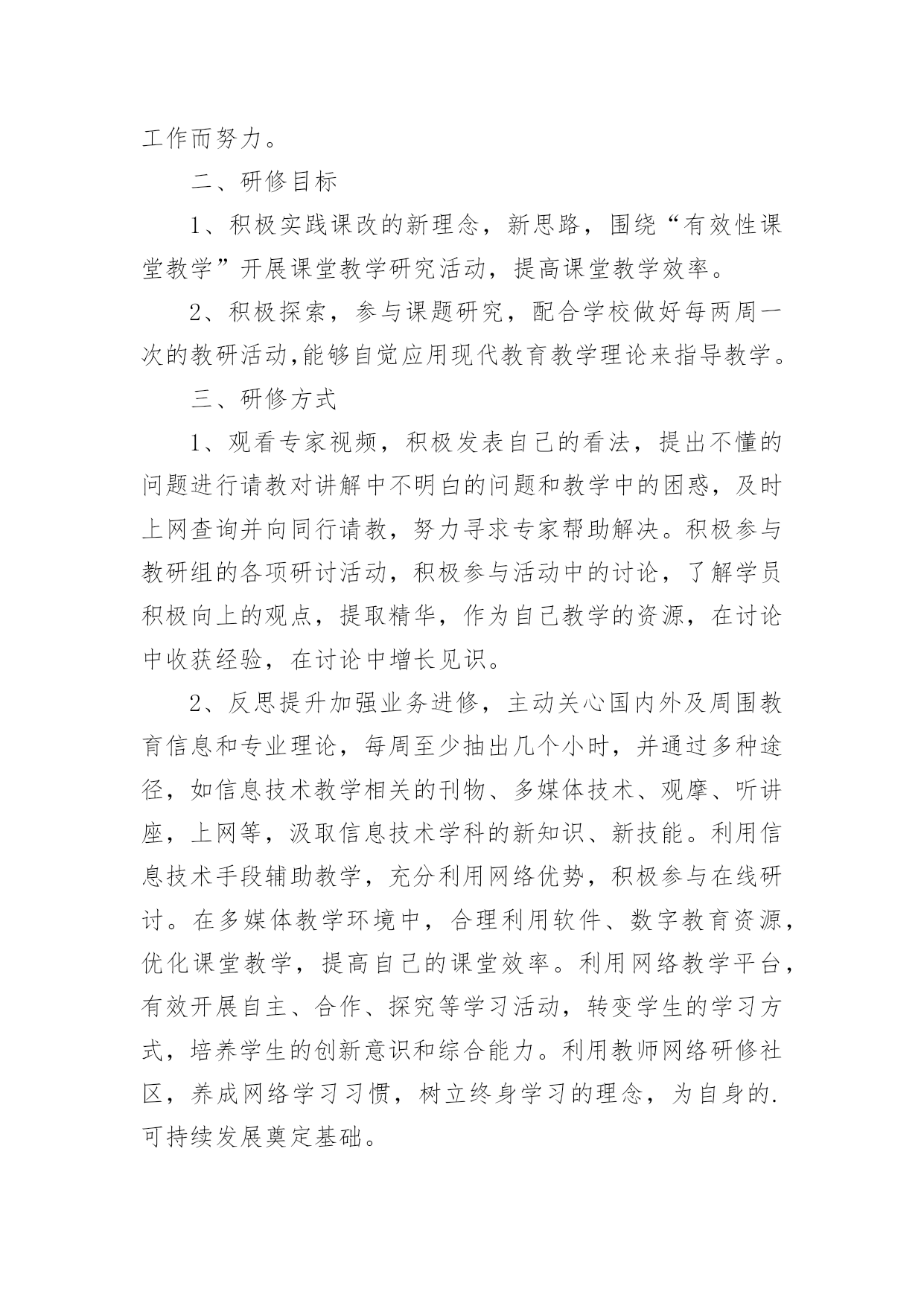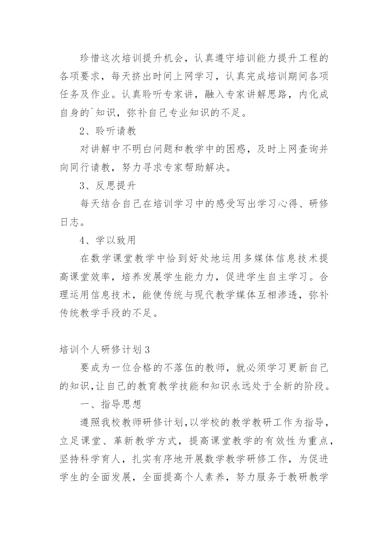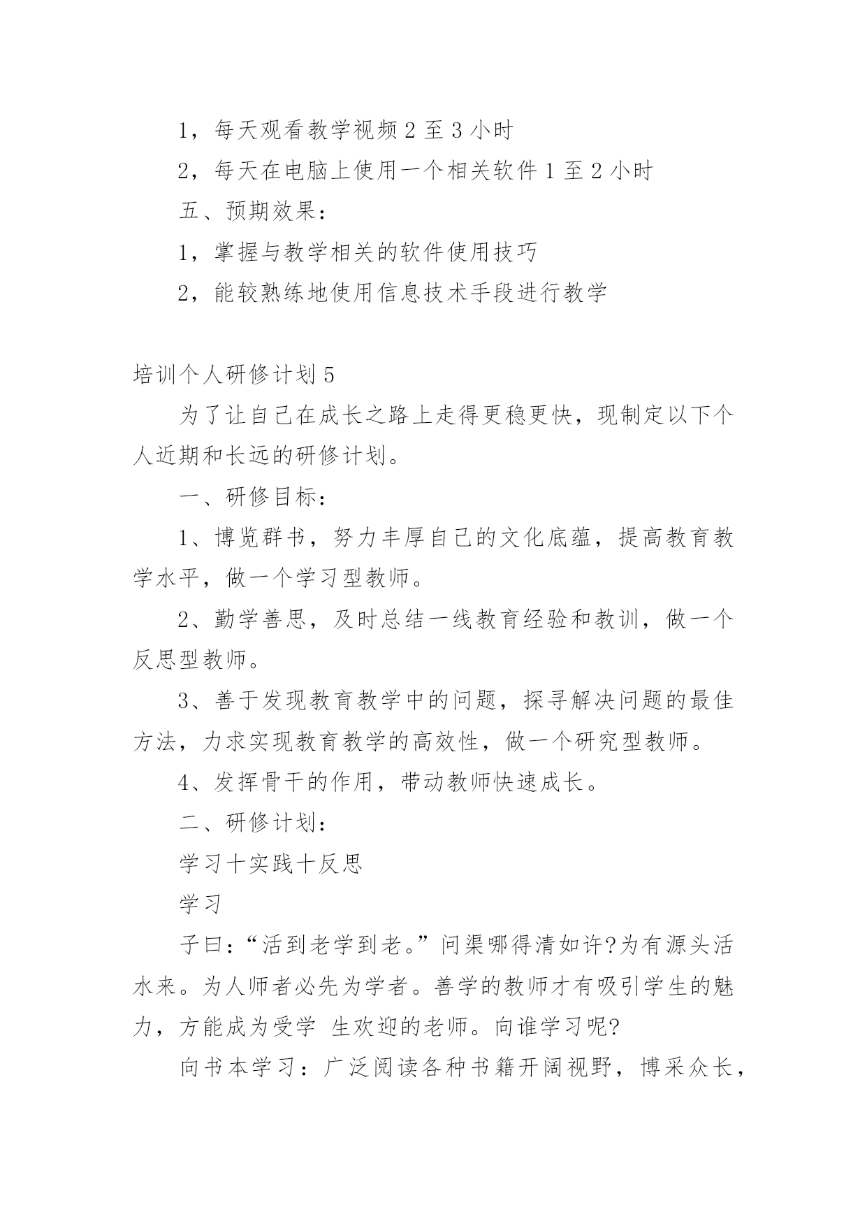 培训个人研修计划培训个人研修计划15篇【实用】时间过得可真快,从来都不等人,又迎来了一个全新的起点,现在就让我们好好地规划一下吧。计划怎么写才能发挥它最大的作用呢?下面是小编整理的培训个人研修计划,欢迎大家分享。培训个人研修计划1一、培训背景:培养高素质的教师与提高现有教师的综合素质,是我国教育发展的希望所在。一位高素质的教师应该具备良好的思想政治素质和心理素质,较高的专业水平与能力,并善于建立和谐的师生关系。在青少年的成长中教师的重要性怎么强调都不过分。这不仅是因为教师承担着教书育人的责任,更是因为教师在青少年心目中的形象与师生关系的好坏,对于青少年的自我概念的`形成、生活目标的确定、身心健康的状况都具有深远影响。毫无疑问,如果教师本身的素质不高,就无法承担培养高素质学生的重任。如果教师自己心理不健康,学生的心理健康就没有保持。二、培训目的和意义:1、促进校内师生的身心健康,构建和谐校园。2、有利于了解全校师生心理健康状况,防患于未来,构建安全校园。3、提高学校素质教育水平,提升学校办学品味。4、促进教师心理健康,疏导来自各方面的压力,减少长期教学所造成的疲劳感,帮其获得动力和幸福感。5、提高教师的心理应用能力和沟通能力,有助于教师更好地了解学生的心理,采取相应的沟通技巧和教学方法,有利于帮助学生解决心理以及学习上所遇到的问题。6、帮助教师解决长期以来形成的心理上所遭遇的困惑,树立良好的形象,以积极的姿态影响引导学生向着健康向上的方向发展。三、培训内容:1、教师心里减压2、如何克服教师职业倦怠?3、如何识别有心理问题的学生?4、教师与学生的心理沟通技巧。5、教师人际关系疏通。四、培训方式:1。培训讲座2。团队辅导3。个别辅导4。体验式辅导、拓展训练5。团队交流平台五、培训流程:(一)心理评估与分析利用专业的心理测评系统(惠诚软件)对教师进行测评分析,撰写分析报告,结合访谈等形式进行培训辅导需求分析,根据结果提交初步辅导建议书。(二)培训联系(三)培训实施根据设计好的培训方案,和流程,进行培训,执行科学的培训流程,包括培训时间进度控制、培训现场控制等为教师提供高质量的培训。(四)培训后跟踪首先进行培训后评估、提供培训评估报告,并提交讲师建议。制定跟踪计划,促进成果转换。培训个人研修计划2一、指导思想通过专家教授的讲解引领,不断更新自己的教育观念,促使自己向专业化方向发展。二、研修目标1。通过培训,能够在多媒体教学环境中,合理利用软件,数学教育资源,优化课堂教学,提高自己的课堂效率。2。提高自己对信息技术在数学教学中应用的能力和操作能力。3。结合信息技术应用能力,针对数学教学不断反思和总结,提高自身的专业化发展能力。三、研修方式和内容1、积极学习珍惜这次培训提升机会,认真遵守培训能力提升工程的各项要求,每天挤出时间上网学习,认真完成培训期间各项任务及作业。认真聆听专家讲,融入专家讲解思路,内化成自身的`知识,弥补自己专业知识的不足。2、聆听请教对讲解中不明白问题和教学中的困惑,及时上网查询并向同行请教,努力寻求专家帮助解决。3、反思提升每天结合自己在培训学习中的感受写出学习心得、研修日志。4、学以致用在数学课堂教学中恰到好处地运用多媒体信息技术提高课堂效率,培养发展学生能力力,促进学生自主学习。合理运用信息技术,能使传统与现代教学媒体互相渗透,弥补传统教学手段的不足。培训个人研修计划3要成为一位合格的不落伍的教师,就必须学习更新自己的知识,让自己的教育教学技能和知识永远处于全新的阶段。一、指导思想遵照我校教师研修计划,以学校的教学教研工作为指导,立足课堂、革新教学方式,提高课堂教学的有效性为重点,坚持科学育人,扎实有序地开展数学教学研修工作,为促进学生的全面发展,全面提高个人素养,努力服务于教研教学工作而努力。二、研修目标1、积极实践课改的新理念,新思路,围绕“有效性课堂教学”开展课堂教学研究活动,提高课堂教学效率。2、积极探索,参与课题研究,配合学校做好每两周一次的教研活动,能够自觉应用现代教育教学理论来指导教学。三、研修方式1、观看专家视频,积极发表自己的看法,提出不懂的问题进行请教对讲解中不明白的问题和教学中的困惑,及时上网查询并向同行请教,努力寻求专家帮助解决。积极参与教研组的各项研讨活动,积极参与活动中的讨论,了解学员积极向上的观点,提取精华,作为自己教学的资源,在讨论中收获经验,在讨论中增长见识。2、反思提升加强业务进修,主动关心国内外及周围教育信息和专业理论,每周至少抽出几个小时,并通过多种途径,如信息技术教学相关的刊物、多媒体技术、观摩、听讲座,上网等,汲取信息技术学科的新知识、新技能。利用信息技术手段辅助教学,充分利用网络优势,积极参与在线研讨。在多媒体教学环境中,合理利用软件、数字教育资源,优化课堂教学,