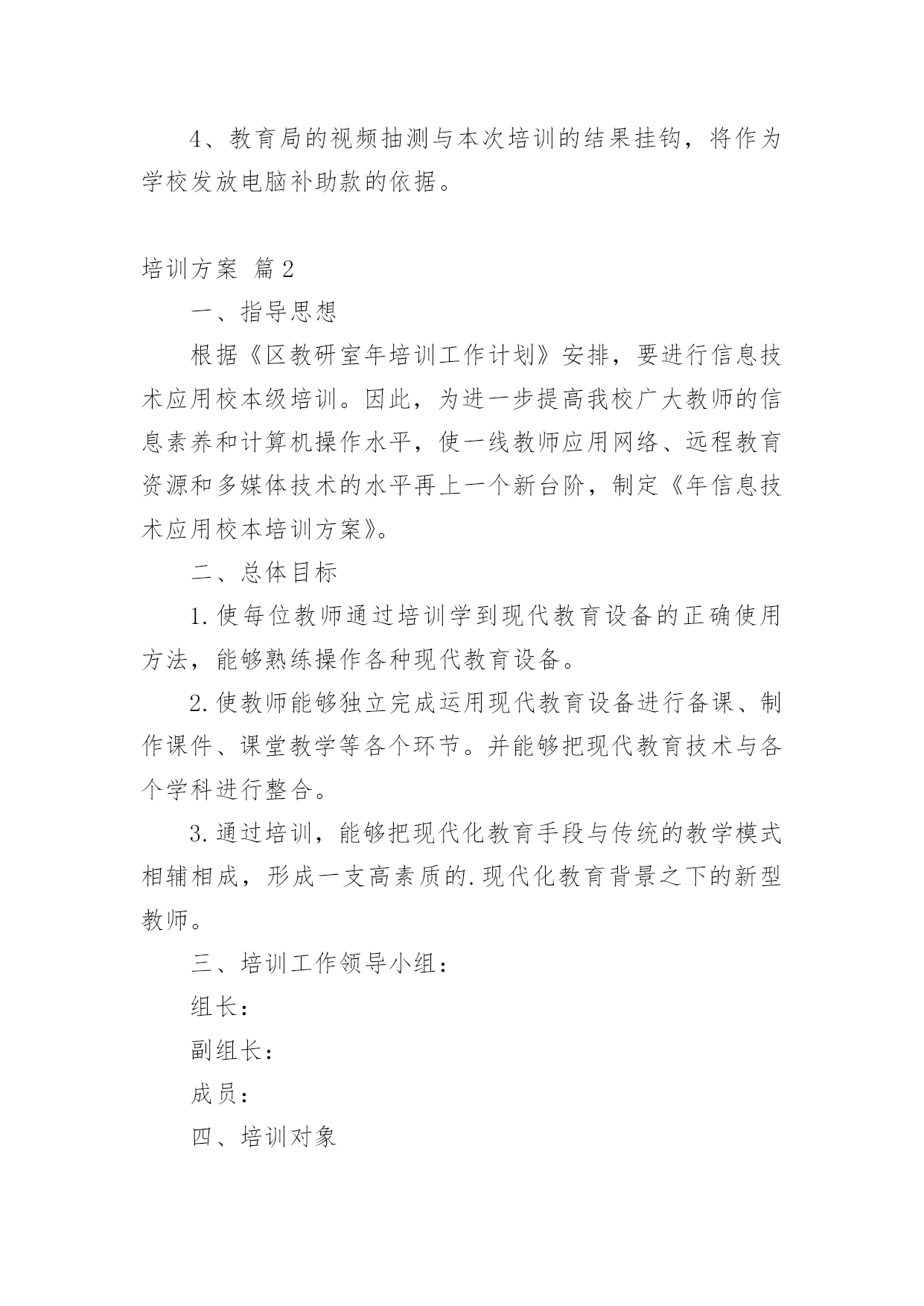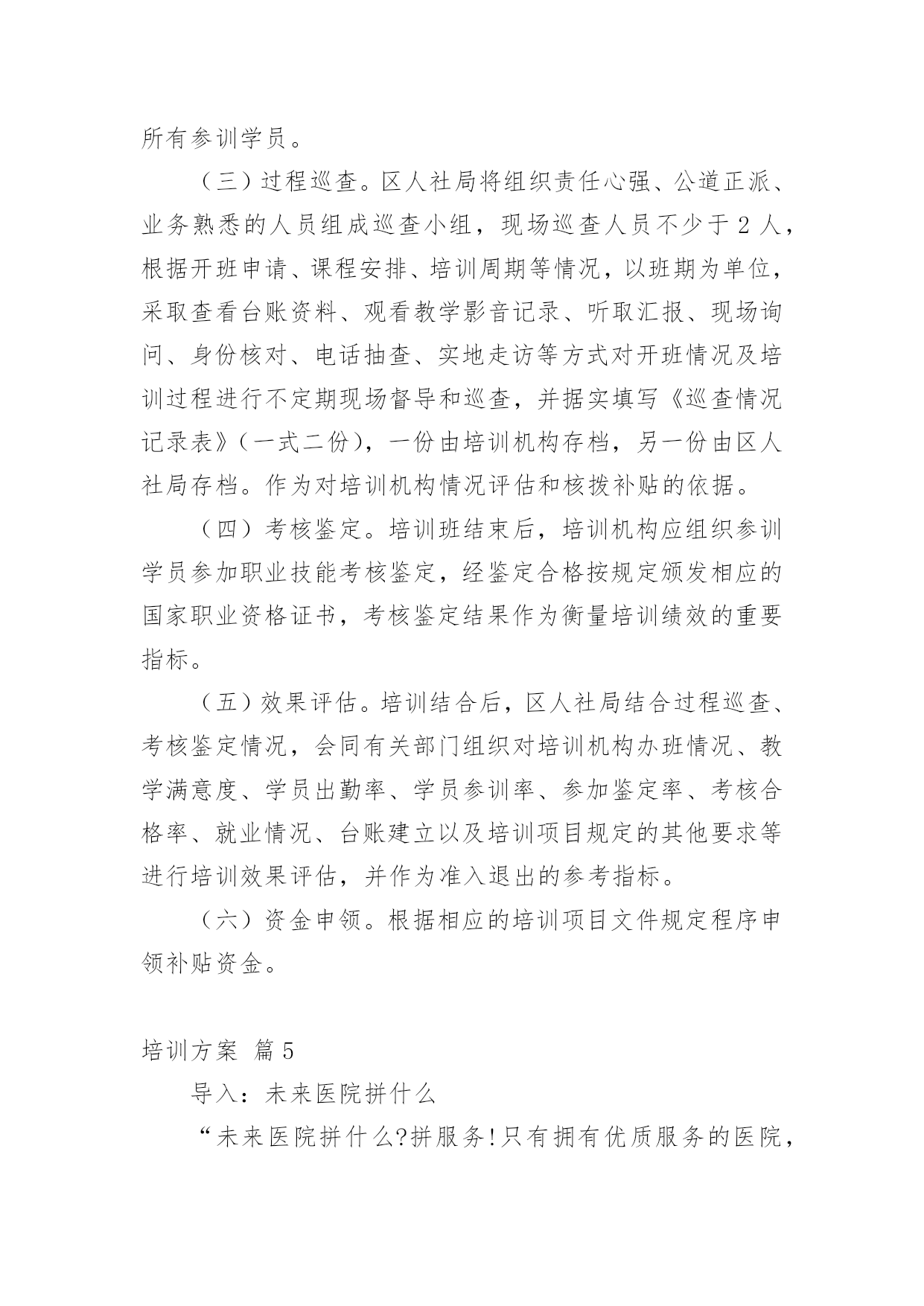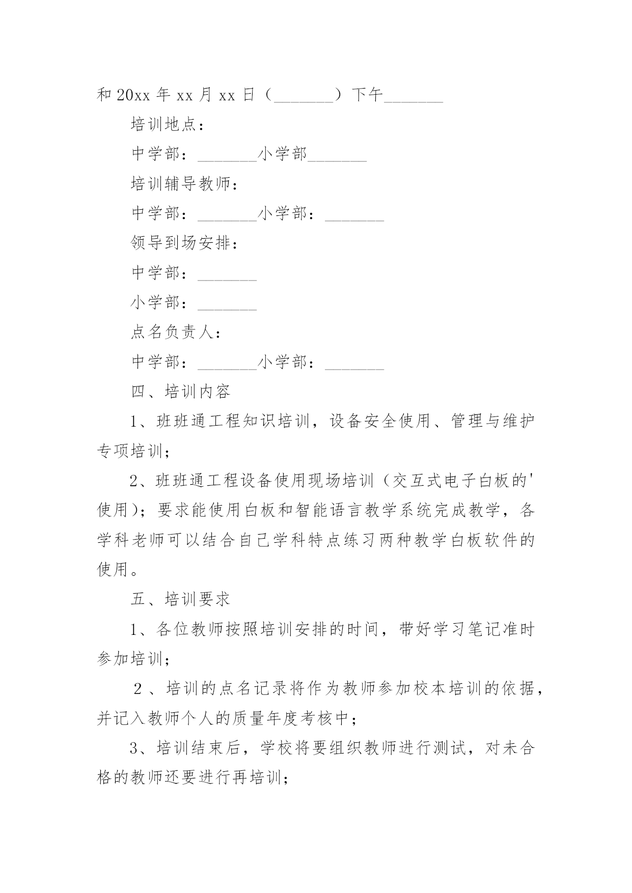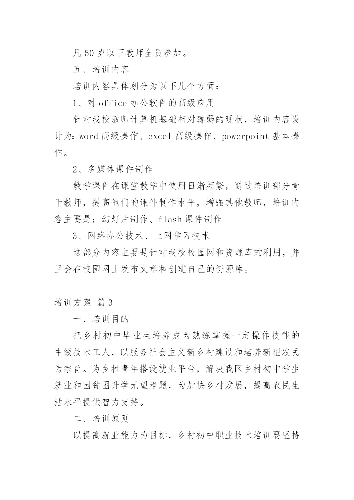 培训方案培训方案(范例6篇)为了确定工作或事情顺利开展,常常要根据具体情况预先制定方案,方案是为某一行动所制定的具体行动实施办法细则、步骤和安排等。方案要怎么制定呢?以下是小编精心整理的培训方案7篇,希望对大家有所帮助。培训方案篇1一、指导思想为提高课堂教学效率,构建优质资源共享的网络多媒体教学环境,使多媒体信息技术教学在我校形成常态化,整体提高我校教师利用“班班通”设备及资源的教学应用能力,大面积提高教育教学质量,特制定本培训方案。二、培训目标为学校“班班通”设备责任人提供设备的安全使用、管理与维护方面专项培训;为学校的全体教师提供不同层面的技术、理论和应用培训,使其了解“班班通”工程在教育改革和发展中的地位和作用,掌握电子白板功能在学科教学方面的应用,并能够利用“班班通”工程所提供的软硬件资源为学校教学服务。三、培训安排培训对象:学校各学科教师培训时间:20xx年xx月xx日(_______)下午_______和20xx年xx月xx日(_______)下午_______培训地点:中学部:_______小学部_______培训辅导教师:中学部:_______小学部:_______领导到场安排:中学部:_______小学部:_______点名负责人:中学部:_______小学部:_______四、培训内容1、班班通工程知识培训,设备安全使用、管理与维护专项培训;2、班班通工程设备使用现场培训(交互式电子白板的'使用);要求能使用白板和智能语言教学系统完成教学,各学科老师可以结合自己学科特点练习两种教学白板软件的使用。五、培训要求1、各位教师按照培训安排的时间,带好学习笔记准时参加培训;2、培训的点名记录将作为教师参加校本培训的依据,并记入教师个人的质量年度考核中;3、培训结束后,学校将要组织教师进行测试,对未合格的教师还要进行再培训;4、教育局的视频抽测与本次培训的结果挂钩,将作为学校发放电脑补助款的依据。培训方案篇2一、指导思想根据《区教研室年培训工作计划》安排,要进行信息技术应用校本级培训。因此,为进一步提高我校广大教师的信息素养和计算机操作水平,使一线教师应用网络、远程教育资源和多媒体技术的水平再上一个新台阶,制定《年信息技术应用校本培训方案》。二、总体目标1.使每位教师通过培训学到现代教育设备的正确使用方法,能够熟练操作各种现代教育设备。2.使教师能够独立完成运用现代教育设备进行备课、制作课件、课堂教学等各个环节。并能够把现代教育技术与各个学科进行整合。3.通过培训,能够把现代化教育手段与传统的教学模式相辅相成,形成一支高素质的.现代化教育背景之下的新型教师。三、培训工作领导小组:组长:副组长:成员:四、培训对象凡50岁以下教师全员参加。五、培训内容培训内容具体划分为以下几个方面:1、对office办公软件的高级应用针对我校教师计算机基础相对薄弱的现状,培训内容设计为:word高级操作、excel高级操作、powerpoint基本操作。2、多媒体课件制作教学课件在课堂教学中使用日渐频繁,通过培训部分骨干教师,提高他们的课件制作水平,增强其他教师,培训内容主要是:幻灯片制作、flash课件制作3、网络办公技术、上网学习技术这部分内容主要是针对我校校园网和资源库的利用,并且会在校园网上发布文章和创建自己的资源库。培训方案篇3一、培训目的把乡村初中毕业生培养成为熟练掌握一定操作技能的中级技术工人,以服务社会主义新乡村建设和培养新型农民为宗旨。为乡村青年搭设就业平台,解决我区乡村初中学生就业和因贫困升学无望难题,为加快乡村发展,提高农民生活水平提供智力支持。二、培训原则以提高就业能力为目标,乡村初中职业技术培训要坚持以市场需求为导向。坚持培训与技能鉴定相结合、培训与就业相结合,改革课程设置和教学方法,增强培训的针对性和实效性,切实提高培训效率。培养出一批在生产、管理、服务领域技艺精湛的实用型人才,以达到富区裕民的目的三、培训方式(一)培训对象市区三所乡(镇)乡村初中应往届毕业生(年龄16~20周岁)(二)培训科目1第一年:学生在镇上初中学生职业技术培训站学习基础课程(语文、数学、英语、计算机、音乐、美术、体育、文明礼仪、书法、法制)2第二、三年:由高等职业技术学院负责组织学生到市商贸高级技术学校学习专业课(现代汽车技术系、应用设计系、电子信息技术系、机械制造系、餐旅管理系共五种类别任其选择)边学边实习。毕业后。并负责在市辖区内安排就业。(三)培训形式1第一年:学生在镇上初中学生职业技术培训站学习期间采取走读和寄宿相结合的方式。2第二、三年:学生在市商贸高级技术学校寄宿学习、实习。(四)培训时间1镇上初中学生职业技术培训站培训时间为年月~年月。2市商贸高级技术学校培训时间为年月~年月。(五)培训地点1第一年在市区镇上初中学生