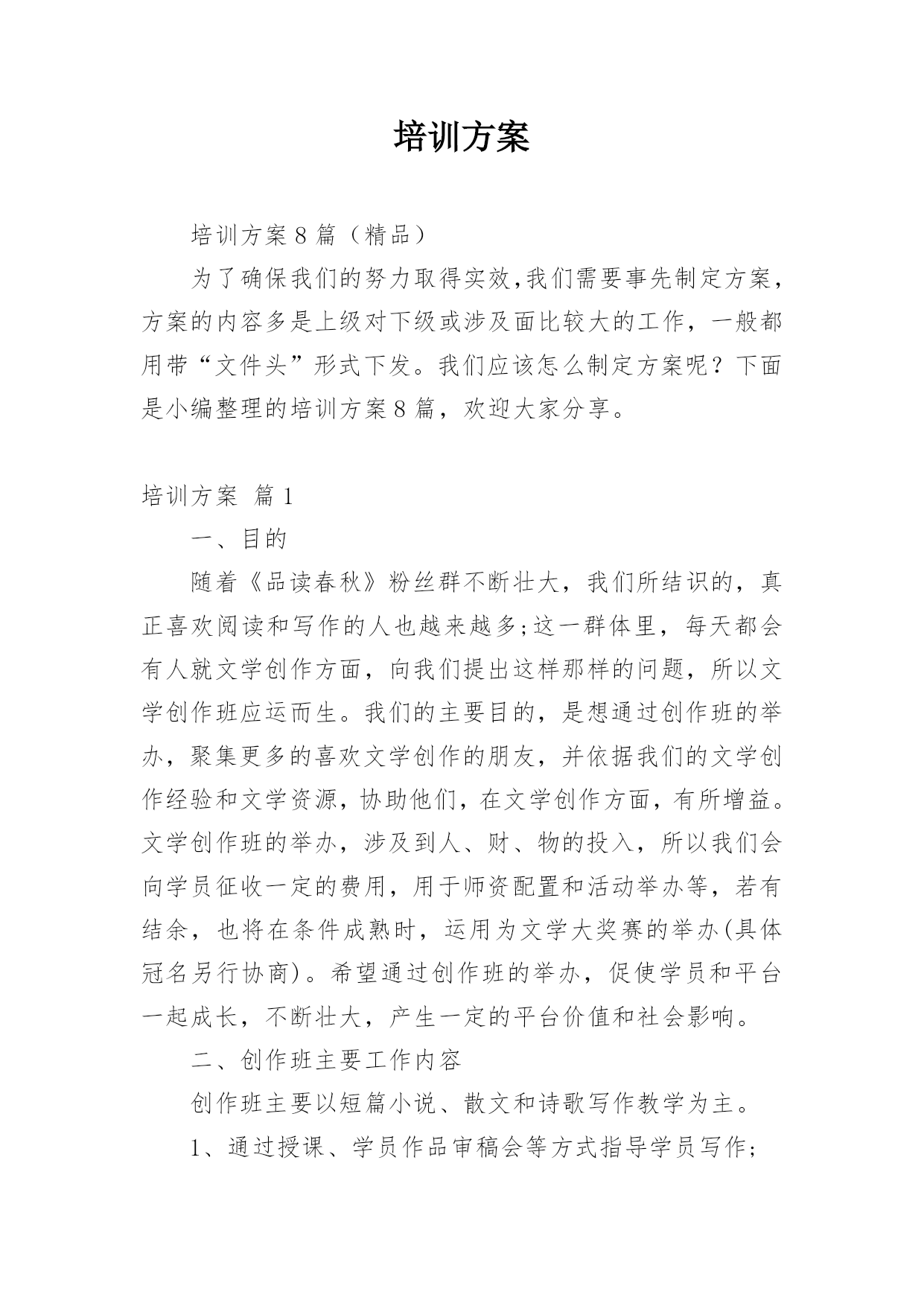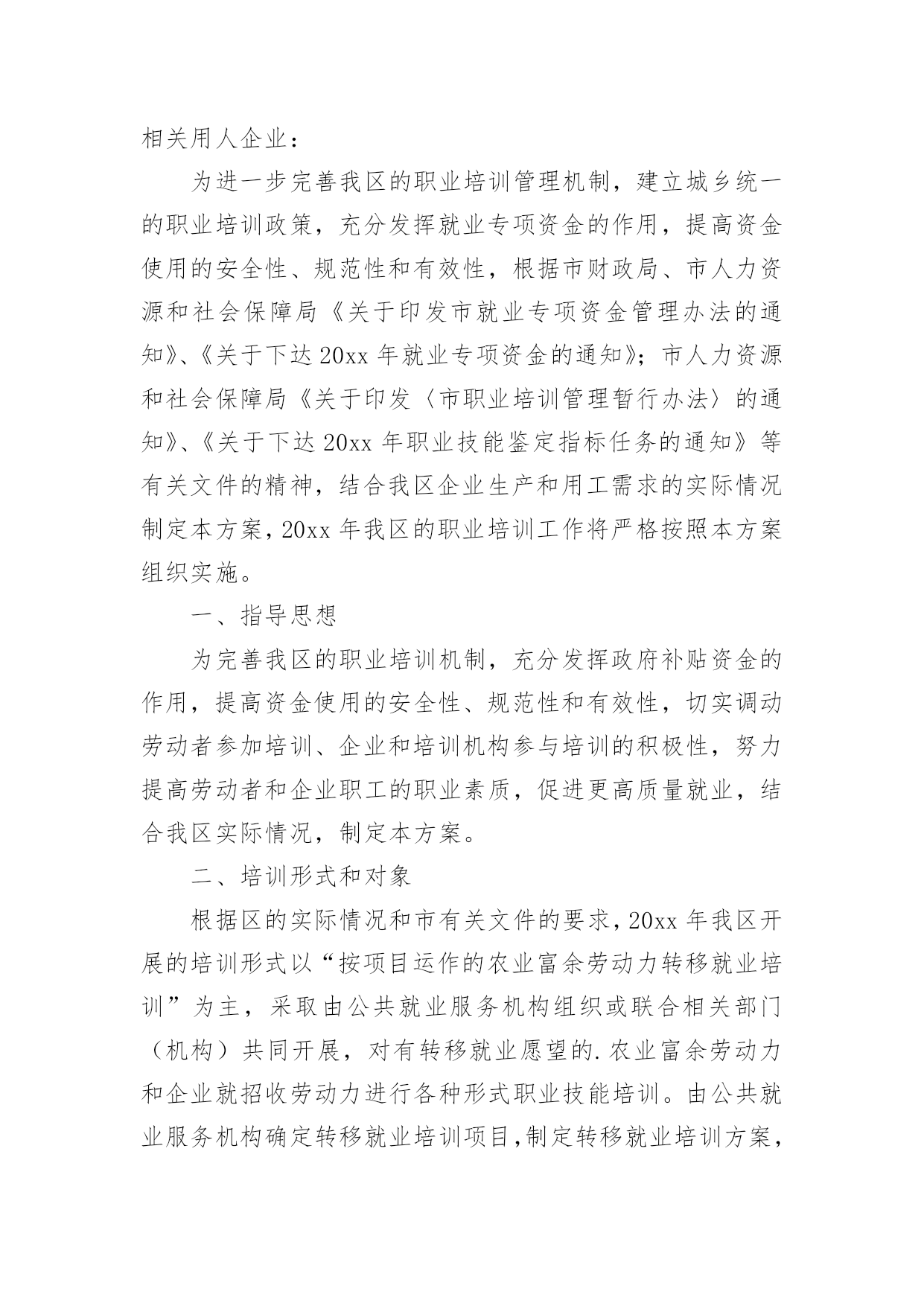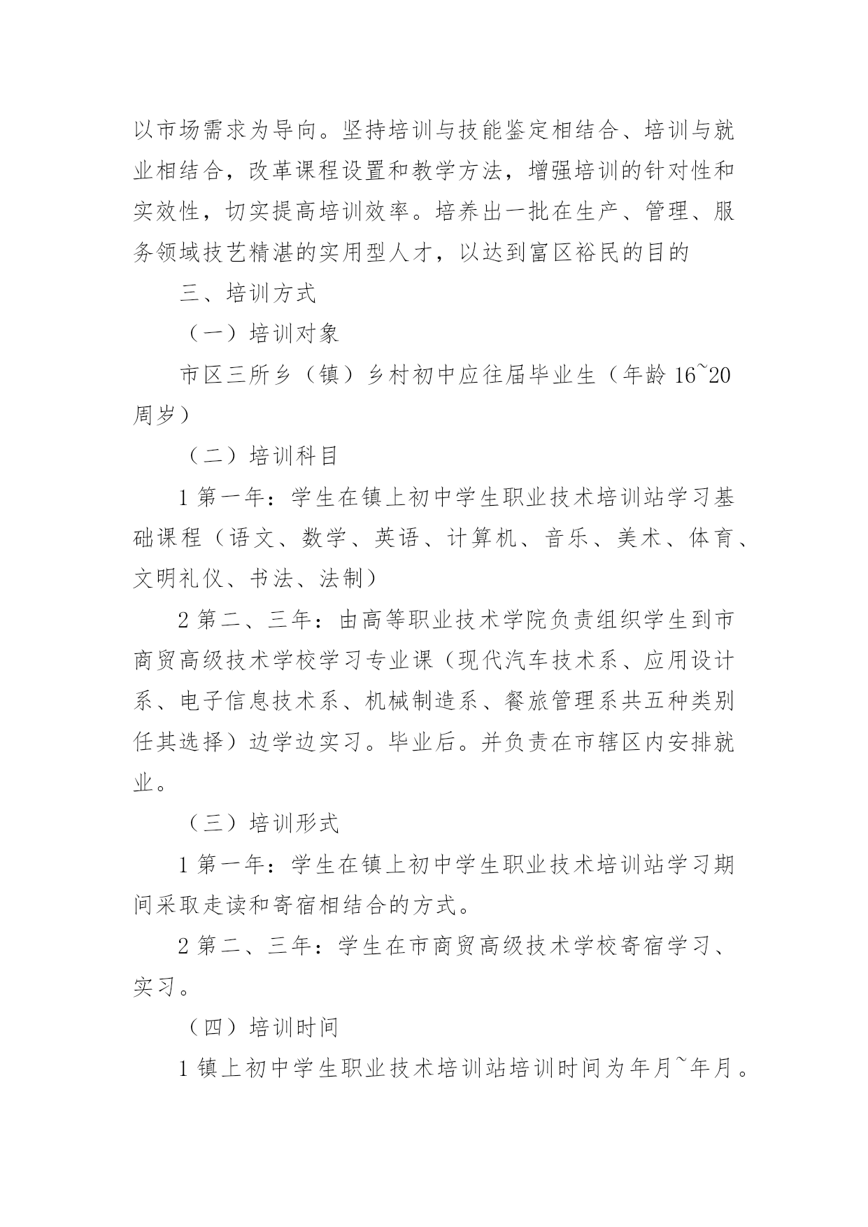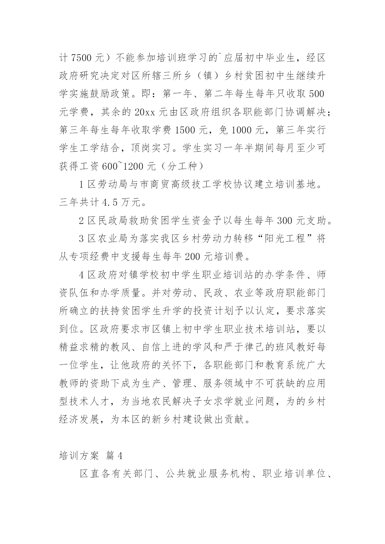 培训方案培训方案(范例6篇)为了确定工作或事情顺利开展,常常要根据具体情况预先制定方案,方案是为某一行动所制定的具体行动实施办法细则、步骤和安排等。方案要怎么制定呢?以下是小编精心整理的培训方案7篇,希望对大家有所帮助。培训方案篇1一、指导思想为提高课堂教学效率,构建优质资源共享的网络多媒体教学环境,使多媒体信息技术教学在我校形成常态化,整体提高我校教师利用“班班通”设备及资源的教学应用能力,大面积提高教育教学质量,特制定本培训方案。二、培训目标为学校“班班通”设备责任人提供设备的安全使用、管理与维护方面专项培训;为学校的全体教师提供不同层面的技术、理论和应用培训,使其了解“班班通”工程在教育改革和发展中的地位和作用,掌握电子白板功能在学科教学方面的应用,并能够利用“班班通”工程所提供的软硬件资源为学校教学服务。三、培训安排培训对象:学校各学科教师培训时间:20xx年xx月xx日(_______)下午_______和20xx年xx月xx日(_______)下午_______培训地点:中学部:_______小学部_______培训辅导教师:中学部:_______小学部:_______领导到场安排:中学部:_______小学部:_______点名负责人:中学部:_______小学部:_______四、培训内容1、班班通工程知识培训,设备安全使用、管理与维护专项培训;2、班班通工程设备使用现场培训(交互式电子白板的'使用);要求能使用白板和智能语言教学系统完成教学,各学科老师可以结合自己学科特点练习两种教学白板软件的使用。五、培训要求1、各位教师按照培训安排的时间,带好学习笔记准时参加培训;2、培训的点名记录将作为教师参加校本培训的依据,并记入教师个人的质量年度考核中;3、培训结束后,学校将要组织教师进行测试,对未合格的教师还要进行再培训;4、教育局的视频抽测与本次培训的结果挂钩,将作为学校发放电脑补助款的依据。培训方案篇2一、指导思想根据《区教研室年培训工作计划》安排,要进行信息技术应用校本级培训。因此,为进一步提高我校广大教师的信息素养和计算机操作水平,使一线教师应用网络、远程教育资源和多媒体技术的水平再上一个新台阶,制定《年信息技术应用校本培训方案》。二、总体目标1.使每位教师通过培训学到现代教育设备的正确使用方法,能够熟练操作各种现代教育设备。2.使教师能够独立完成运用现代教育设备进行备课、制作课件、课堂教学等各个环节。并能够把现代教育技术与各个学科进行整合。3.通过培训,能够把现代化教育手段与传统的教学模式相辅相成,形成一支高素质的.现代化教育背景之下的新型教师。三、培训工作领导小组:组长:副组长:成员:四、培训对象凡50岁以下教师全员参加。五、培训内容培训内容具体划分为以下几个方面:1、对office办公软件的高级应用针对我校教师计算机基础相对薄弱的现状,培训内容设计为:word高级操作、excel高级操作、powerpoint基本操作。2、多媒体课件制作教学课件在课堂教学中使用日渐频繁,通过培训部分骨干教师,提高他们的课件制作水平,增强其他教师,培训内容主要是:幻灯片制作、flash课件制作3、网络办公技术、上网学习技术这部分内容主要是针对我校校园网和资源库的利用,并且会在校园网上发布文章和创建自己的资源库。培训方案篇3一、培训目的把乡村初中毕业生培养成为熟练掌握一定操作技能的中级技术工人,以服务社会主义新乡村建设和培养新型农民为宗旨。为乡村青年搭设就业平台,解决我区乡村初中学生就业和因贫困升学无望难题,为加快乡村发展,提高农民生活水平提供智力支持。二、培训原则以提高就业能力为目标,乡村初中职业技术培训要坚持以市场需求为导向。坚持培训与技能鉴定相结合、培训与就业相结合,改革课程设置和教学方法,增强培训的针对性和实效性,切实提高培训效率。培养出一批在生产、管理、服务领域技艺精湛的实用型人才,以达到富区裕民的目的三、培训方式(一)培训对象市区三所乡(镇)乡村初中应往届毕业生(年龄16~20周岁)(二)培训科目1第一年:学生在镇上初中学生职业技术培训站学习基础课程(语文、数学、英语、计算机、音乐、美术、体育、文明礼仪、书法、法制)2第二、三年:由高等职业技术学院负责组织学生到市商贸高级技术学校学习专业课(现代汽车技术系、应用设计系、电子信息技术系、机械制造系、餐旅管理系共五种类别任其选择)边学边实习。毕业后。并负责在市辖区内安排就业。(三)培训形式1第一年:学生在镇上初中学生职业技术培训站学习期间采取走读和寄宿相结合的方式。2第二、三年:学生在市商贸高级技术学校寄宿学习、实习。(四)培训时间1镇上初中学生职业技术培训站培训时间为年月~年月。2市商贸高级技术学校培训时间为年月~年月。(五)培训地点1第一年在市区镇上初中学生