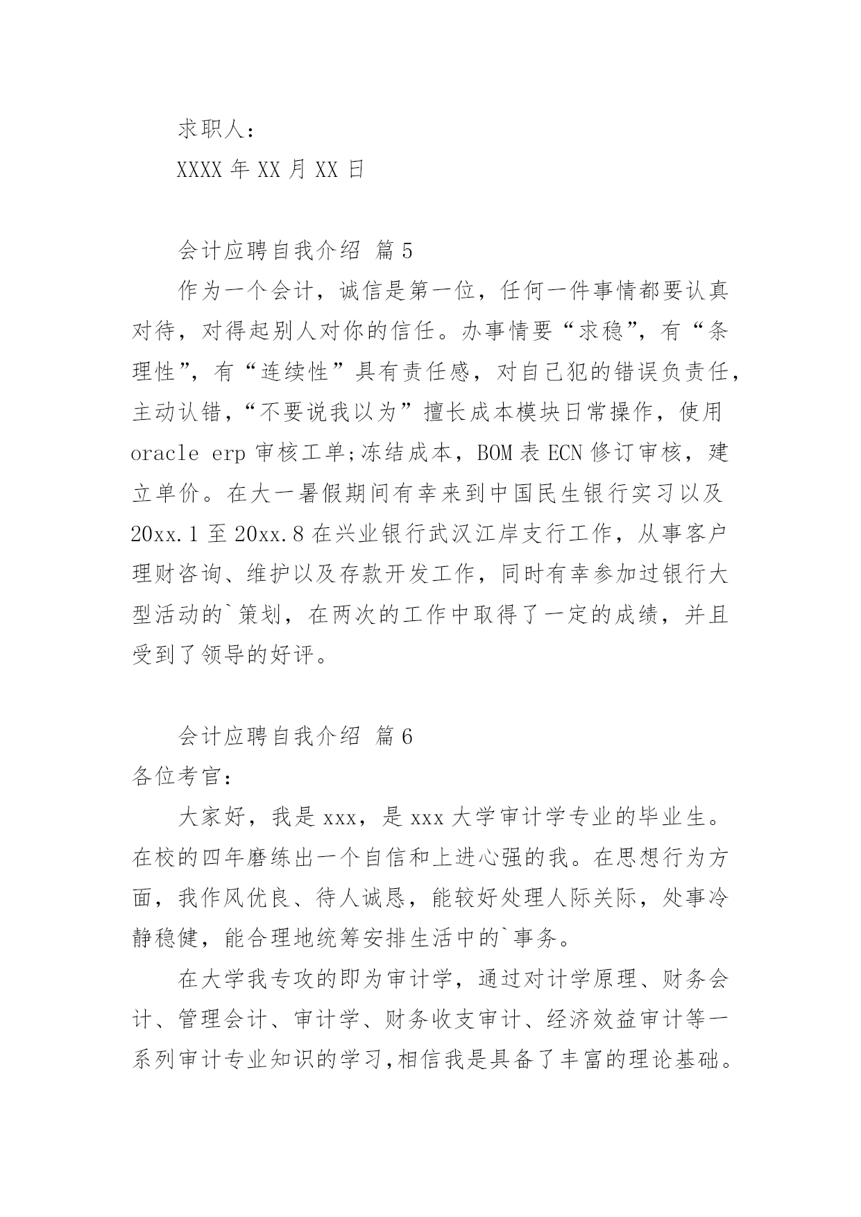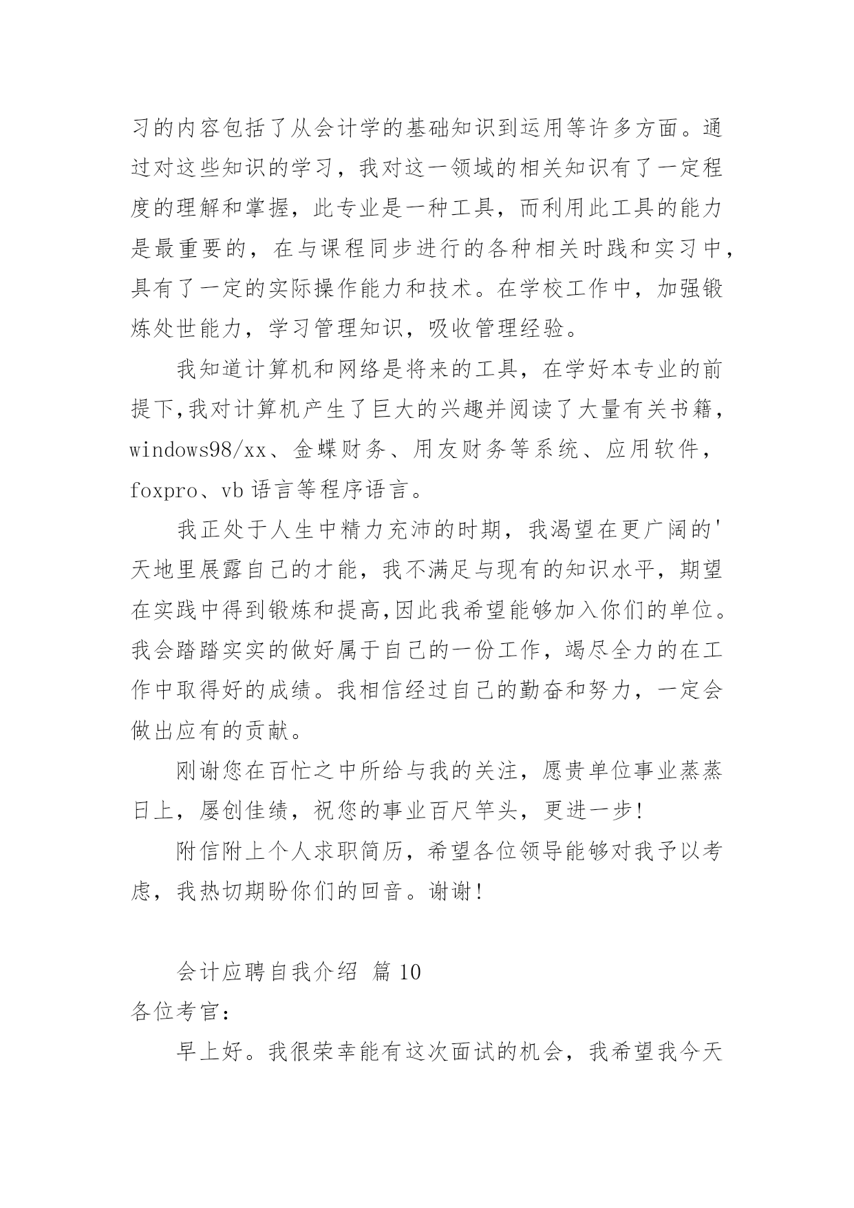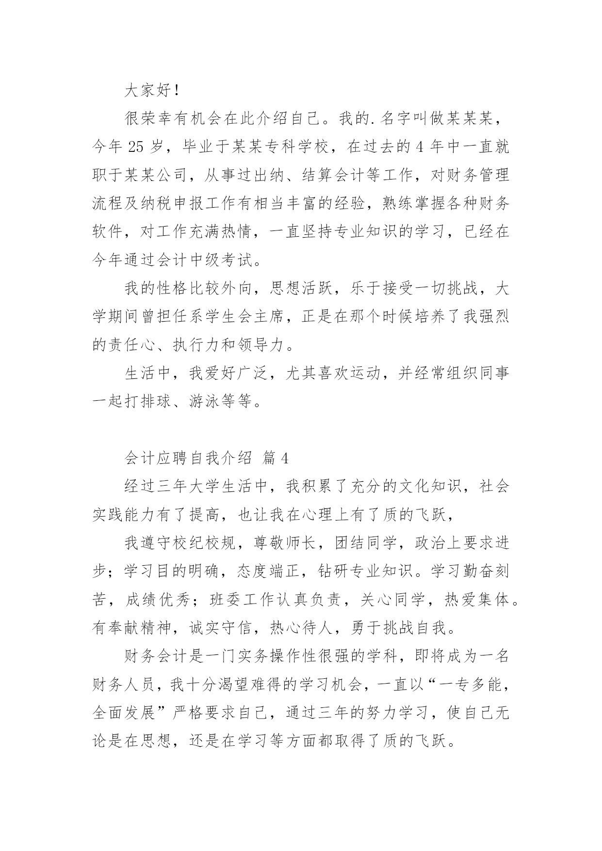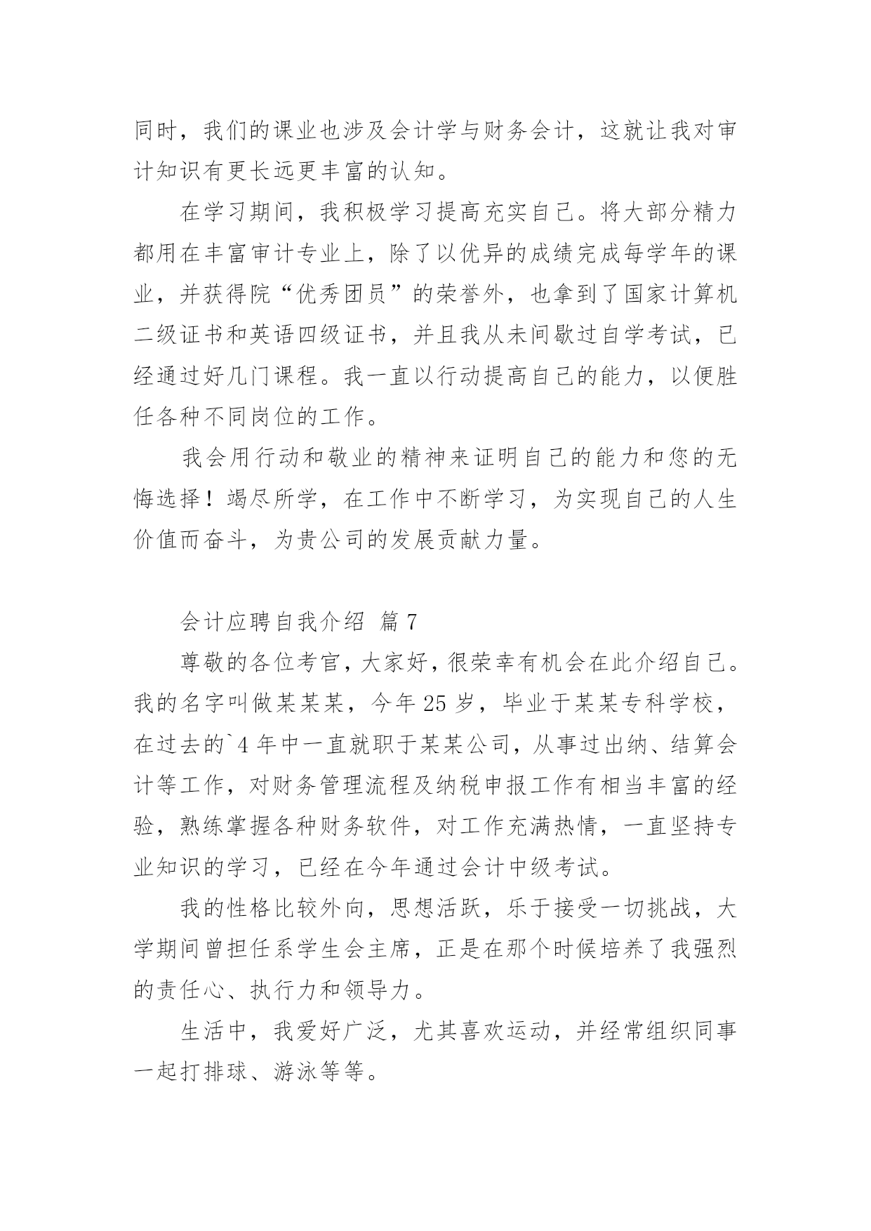 会计应聘自我介绍会计应聘自我介绍12篇当来到一个陌生环境中,我们难以避免地要作出自我介绍,用自我介绍往往可以向他人介绍自己。现在你是否对自我介绍一筹莫展呢?以下是小编收集整理的会计应聘自我介绍,欢迎阅读与收藏。会计应聘自我介绍篇1尊敬的各位考官:您们好!我的'英文名叫,今年27岁,毕业于__学校,在过去的5年中一直就职于__公司,从事过出纳、结算会计等工作,对财务管理流程及纳税申报工作有相当丰富的经验,熟练掌握各种财务软件,对工作充满热情,一直坚持专业知识的学习,并打算在今年内一次通过会计中级考试。我性格外向,思想活跃,乐于接受一切挑战,大学期间曾担任系学生会主席,正是在那个时候培养了我强烈的责任心、执行力和领导力。生活中,我爱好广泛,尤其喜欢历史,对历代名人传记如数家珍,我也爱好运动,并经常组织同事切磋技艺,最擅长羽毛球运动。会计应聘自我介绍篇2各位考官:大家好,很荣幸能有机会向各位进行自我介绍,我怀着一颗赤诚的心和对事业的执著追求,真诚地向您推荐自己。我叫赖健维,今年21岁,毕业于东莞理工学院。在学校期间,我主修的是财务会计专业,熟练掌握地了中级财务会计,高级财务会计,税务会计,成本会计等专业会计知识。根据所学的知识,参加了学校的实习培训,并在实践中,加深了对会计的认识,提高了账务处理的实际操作能力。除主修的专业外,还辅修了电脑,英语等实用科目,且取得了相关证书,能熟练地操作各种会计电脑软件。另外,在学校中也参加过一些社团活动,比如会计协会,滑轮协会等等,在其中加强了和同学们的团队协作。个性上,我富有团队精神,正直和努力是我做人的原则;沉着和冷静是我遇事的态度;爱好广泛使我非常充实,尤其是篮球,跑步等体育运动,使我增强了意志,段炼了身体;众多的朋友使我倍感富有!我很强的'事业心和责任感使我能够面对任何困难和挑战!作为一名即将毕业的学生,我的经验不足或许让您犹豫不决,但请您相信我的干劲与努力将弥补这暂时的不足,也许我不是最好的,但我绝对是最努力的!会计应聘自我介绍篇3尊敬的各位考官:大家好!很荣幸有机会在此介绍自己。我的.名字叫做某某某,今年25岁,毕业于某某专科学校,在过去的4年中一直就职于某某公司,从事过出纳、结算会计等工作,对财务管理流程及纳税申报工作有相当丰富的经验,熟练掌握各种财务软件,对工作充满热情,一直坚持专业知识的学习,已经在今年通过会计中级考试。我的性格比较外向,思想活跃,乐于接受一切挑战,大学期间曾担任系学生会主席,正是在那个时候培养了我强烈的责任心、执行力和领导力。生活中,我爱好广泛,尤其喜欢运动,并经常组织同事一起打排球、游泳等等。会计应聘自我介绍篇4经过三年大学生活中,我积累了充分的文化知识,社会实践能力有了提高,也让我在心理上有了质的飞跃,我遵守校纪校规,尊敬师长,团结同学,政治上要求进步;学习目的明确,态度端正,钻研专业知识。学习勤奋刻苦,成绩优秀;班委工作认真负责,关心同学,热爱集体。有奉献精神,诚实守信,热心待人,勇于挑战自我。财务会计是一门实务操作性很强的学科,即将成为一名财务人员,我十分渴望难得的学习机会,一直以“一专多能,全面发展”严格要求自己,通过三年的努力学习,使自己无论是在思想,还是在学习等方面都取得了质的飞跃。在政治思想方面:本人积极要求进步,拥护党的路线、方针、政策,遵纪守法,廉洁自律,具有良好的社会公共道德和职业道德;有较强的集体荣誉感及团队协作精神,能尊敬师长、团结同学、助人为乐,平时注重加强有关财经方针、政策和财务会计法规、制度,提高了自己的政策水平能力。在业务知识和能力方面:热爱本专业并投入了极大的热情,通过扎实学习《基础会计学》、《成本会计》、《财务会计》、《管理会计》等各门课程,我系统地掌握了本专业所必需的基本理论、基本知识、技能和方法,在此基础上,结合专业特点及工作实际,通过专业课程的学习,我现已具有较强的财务处理能力与计算机软件开发能力。我深知未来是计算机网络时代,因此,我自学了多种计算机软件应用与操作,如word、excel等办公软件,autocad、photoshop等图形设计软件,internetexplorer、outlookexpress等上网工具,并能运用frontpage制作网页、运用foxpro进行数据库开发。在计算机硬件方面,我熟悉其组成原理,能够熟练地进行计算机的组装,独立排除计算机的各种故障。在现代社会主义市场经济的浪潮下,作为跨世纪的大学生,为了更好地适应社会的需要,我在掌握好学校课程的`前提下,充分利用课余时间,阅读了大量的课外读物,拓宽了自己的知识面。在这将挥手告别学校的时候,我将以饱满的热情、坚定的信心、更好地将所学知识运用到工作中。此致敬礼!求职人:XXXX年XX月XX日会计应聘自我介绍篇5作为一个会计,诚信是第一位,任何一