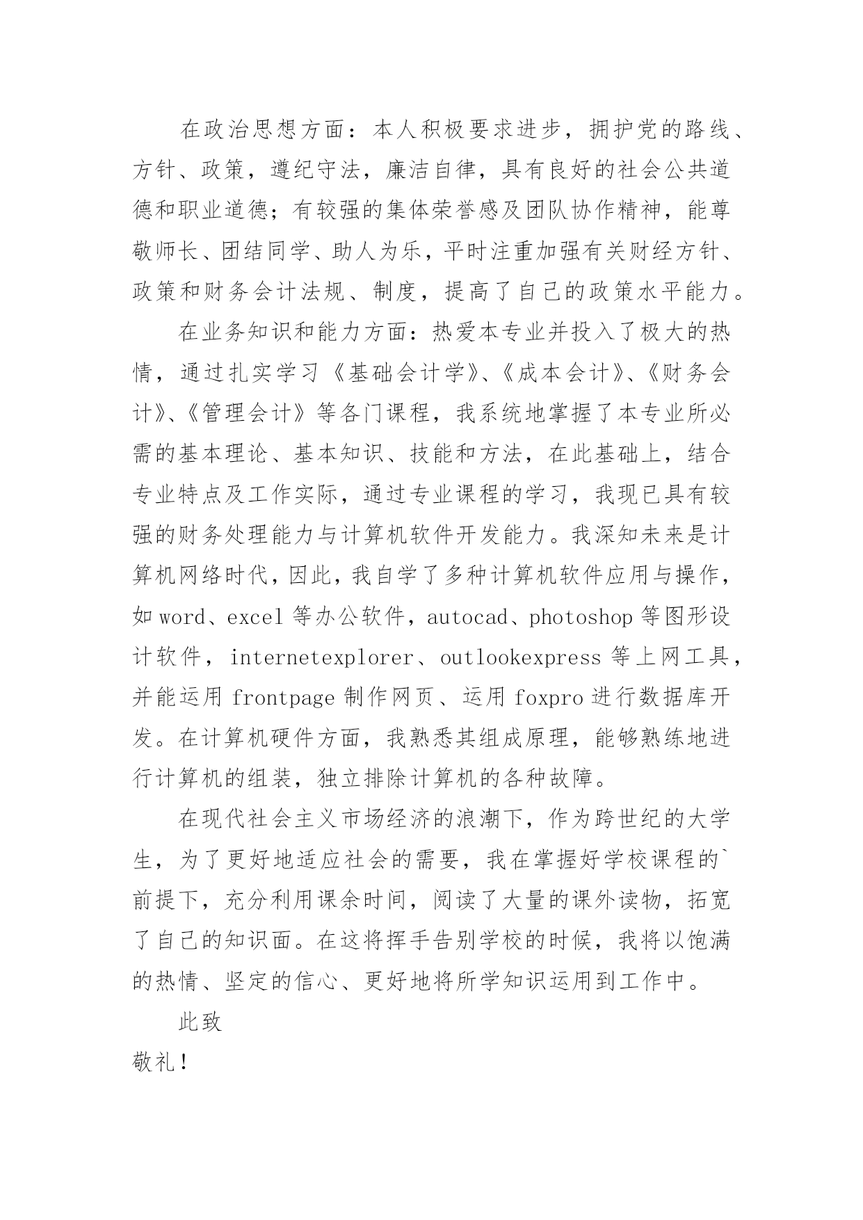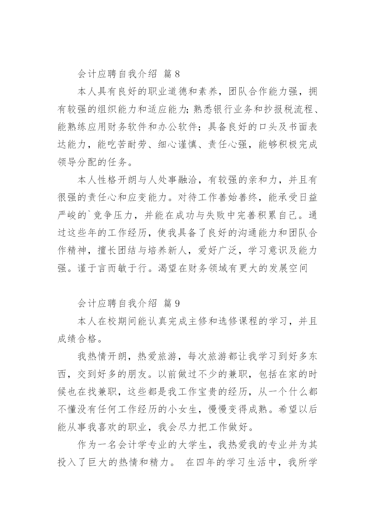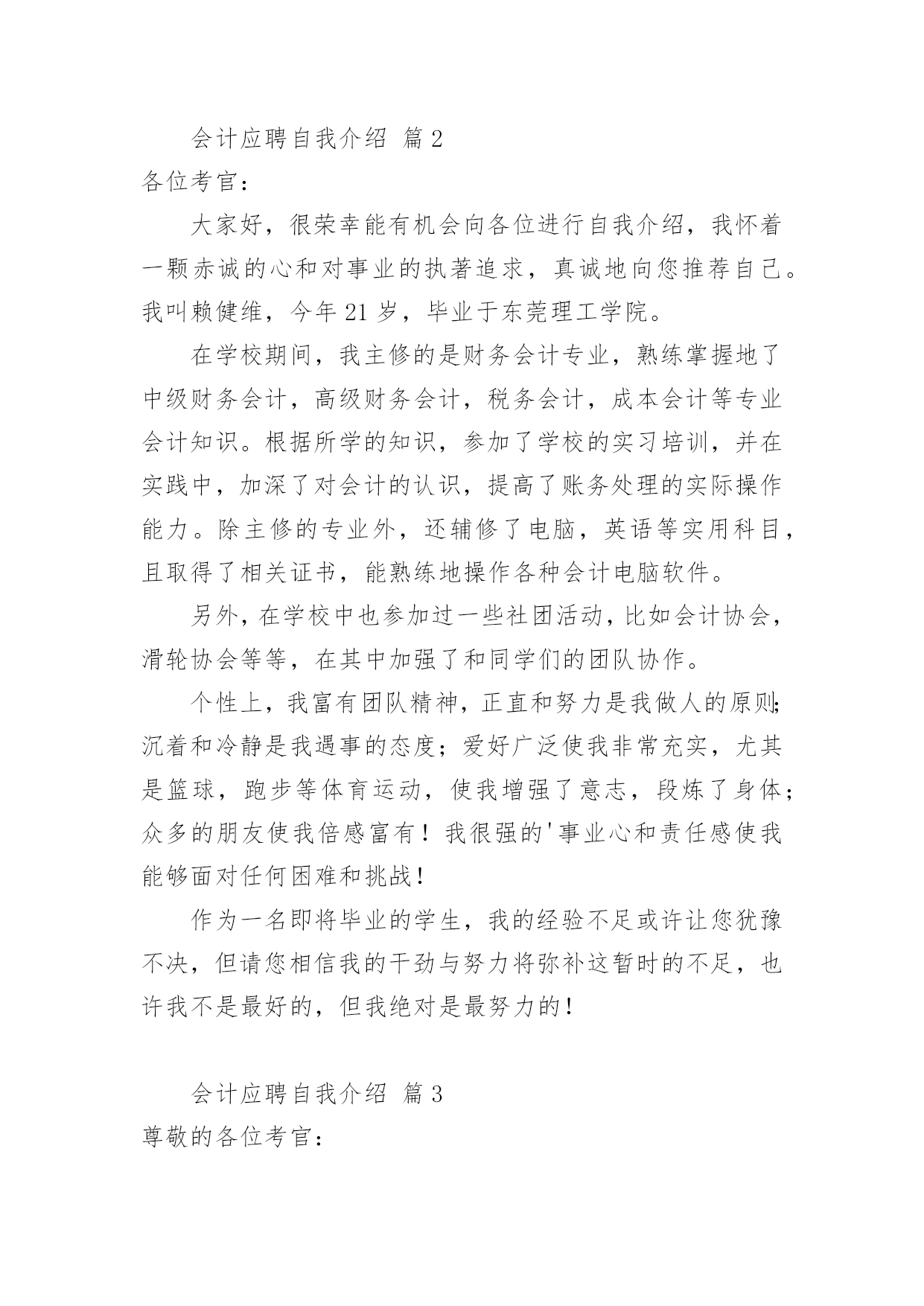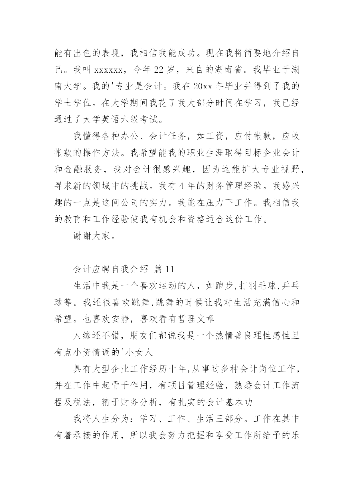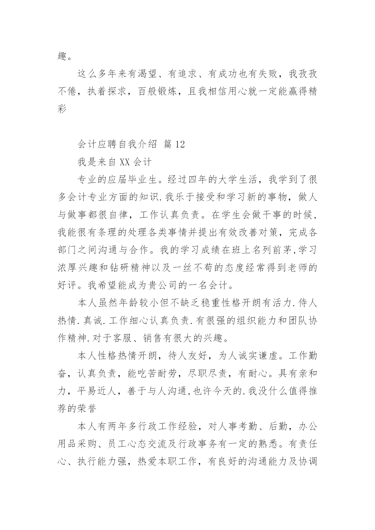 会计应聘自我介绍会计应聘自我介绍12篇当来到一个陌生环境中,我们难以避免地要作出自我介绍,用自我介绍往往可以向他人介绍自己。现在你是否对自我介绍一筹莫展呢?以下是小编收集整理的会计应聘自我介绍,欢迎阅读与收藏。会计应聘自我介绍篇1尊敬的各位考官:您们好!我的'英文名叫,今年27岁,毕业于__学校,在过去的5年中一直就职于__公司,从事过出纳、结算会计等工作,对财务管理流程及纳税申报工作有相当丰富的经验,熟练掌握各种财务软件,对工作充满热情,一直坚持专业知识的学习,并打算在今年内一次通过会计中级考试。我性格外向,思想活跃,乐于接受一切挑战,大学期间曾担任系学生会主席,正是在那个时候培养了我强烈的责任心、执行力和领导力。生活中,我爱好广泛,尤其喜欢历史,对历代名人传记如数家珍,我也爱好运动,并经常组织同事切磋技艺,最擅长羽毛球运动。会计应聘自我介绍篇2各位考官:大家好,很荣幸能有机会向各位进行自我介绍,我怀着一颗赤诚的心和对事业的执著追求,真诚地向您推荐自己。我叫赖健维,今年21岁,毕业于东莞理工学院。在学校期间,我主修的是财务会计专业,熟练掌握地了中级财务会计,高级财务会计,税务会计,成本会计等专业会计知识。根据所学的知识,参加了学校的实习培训,并在实践中,加深了对会计的认识,提高了账务处理的实际操作能力。除主修的专业外,还辅修了电脑,英语等实用科目,且取得了相关证书,能熟练地操作各种会计电脑软件。另外,在学校中也参加过一些社团活动,比如会计协会,滑轮协会等等,在其中加强了和同学们的团队协作。个性上,我富有团队精神,正直和努力是我做人的原则;沉着和冷静是我遇事的态度;爱好广泛使我非常充实,尤其是篮球,跑步等体育运动,使我增强了意志,段炼了身体;众多的朋友使我倍感富有!我很强的'事业心和责任感使我能够面对任何困难和挑战!作为一名即将毕业的学生,我的经验不足或许让您犹豫不决,但请您相信我的干劲与努力将弥补这暂时的不足,也许我不是最好的,但我绝对是最努力的!会计应聘自我介绍篇3尊敬的各位考官:大家好!很荣幸有机会在此介绍自己。我的.名字叫做某某某,今年25岁,毕业于某某专科学校,在过去的4年中一直就职于某某公司,从事过出纳、结算会计等工作,对财务管理流程及纳税申报工作有相当丰富的经验,熟练掌握各种财务软件,对工作充满热情,一直坚持专业知识的学习,已经在今年通过会计中级考试。我的性格比较外向,思想活跃,乐于接受一切挑战,大学期间曾担任系学生会主席,正是在那个时候培养了我强烈的责任心、执行力和领导力。生活中,我爱好广泛,尤其喜欢运动,并经常组织同事一起打排球、游泳等等。会计应聘自我介绍篇4经过三年大学生活中,我积累了充分的文化知识,社会实践能力有了提高,也让我在心理上有了质的飞跃,我遵守校纪校规,尊敬师长,团结同学,政治上要求进步;学习目的明确,态度端正,钻研专业知识。学习勤奋刻苦,成绩优秀;班委工作认真负责,关心同学,热爱集体。有奉献精神,诚实守信,热心待人,勇于挑战自我。财务会计是一门实务操作性很强的学科,即将成为一名财务人员,我十分渴望难得的学习机会,一直以“一专多能,全面发展”严格要求自己,通过三年的努力学习,使自己无论是在思想,还是在学习等方面都取得了质的飞跃。在政治思想方面:本人积极要求进步,拥护党的路线、方针、政策,遵纪守法,廉洁自律,具有良好的社会公共道德和职业道德;有较强的集体荣誉感及团队协作精神,能尊敬师长、团结同学、助人为乐,平时注重加强有关财经方针、政策和财务会计法规、制度,提高了自己的政策水平能力。在业务知识和能力方面:热爱本专业并投入了极大的热情,通过扎实学习《基础会计学》、《成本会计》、《财务会计》、《管理会计》等各门课程,我系统地掌握了本专业所必需的基本理论、基本知识、技能和方法,在此基础上,结合专业特点及工作实际,通过专业课程的学习,我现已具有较强的财务处理能力与计算机软件开发能力。我深知未来是计算机网络时代,因此,我自学了多种计算机软件应用与操作,如word、excel等办公软件,autocad、photoshop等图形设计软件,internetexplorer、outlookexpress等上网工具,并能运用frontpage制作网页、运用foxpro进行数据库开发。在计算机硬件方面,我熟悉其组成原理,能够熟练地进行计算机的组装,独立排除计算机的各种故障。在现代社会主义市场经济的浪潮下,作为跨世纪的大学生,为了更好地适应社会的需要,我在掌握好学校课程的`前提下,充分利用课余时间,阅读了大量的课外读物,拓宽了自己的知识面。在这将挥手告别学校的时候,我将以饱满的热情、坚定的信心、更好地将所学知识运用到工作中。此致敬礼!求职人:XXXX年XX月XX日会计应聘自我介绍篇5作为一个会计,诚信是第一位,任何一