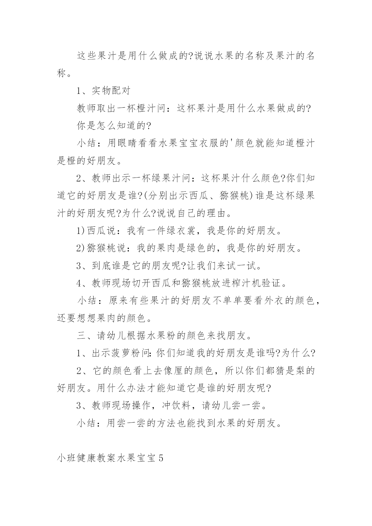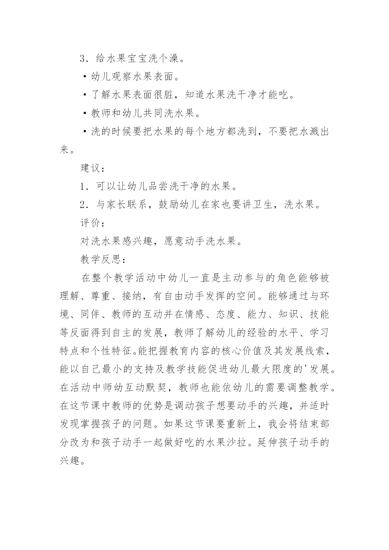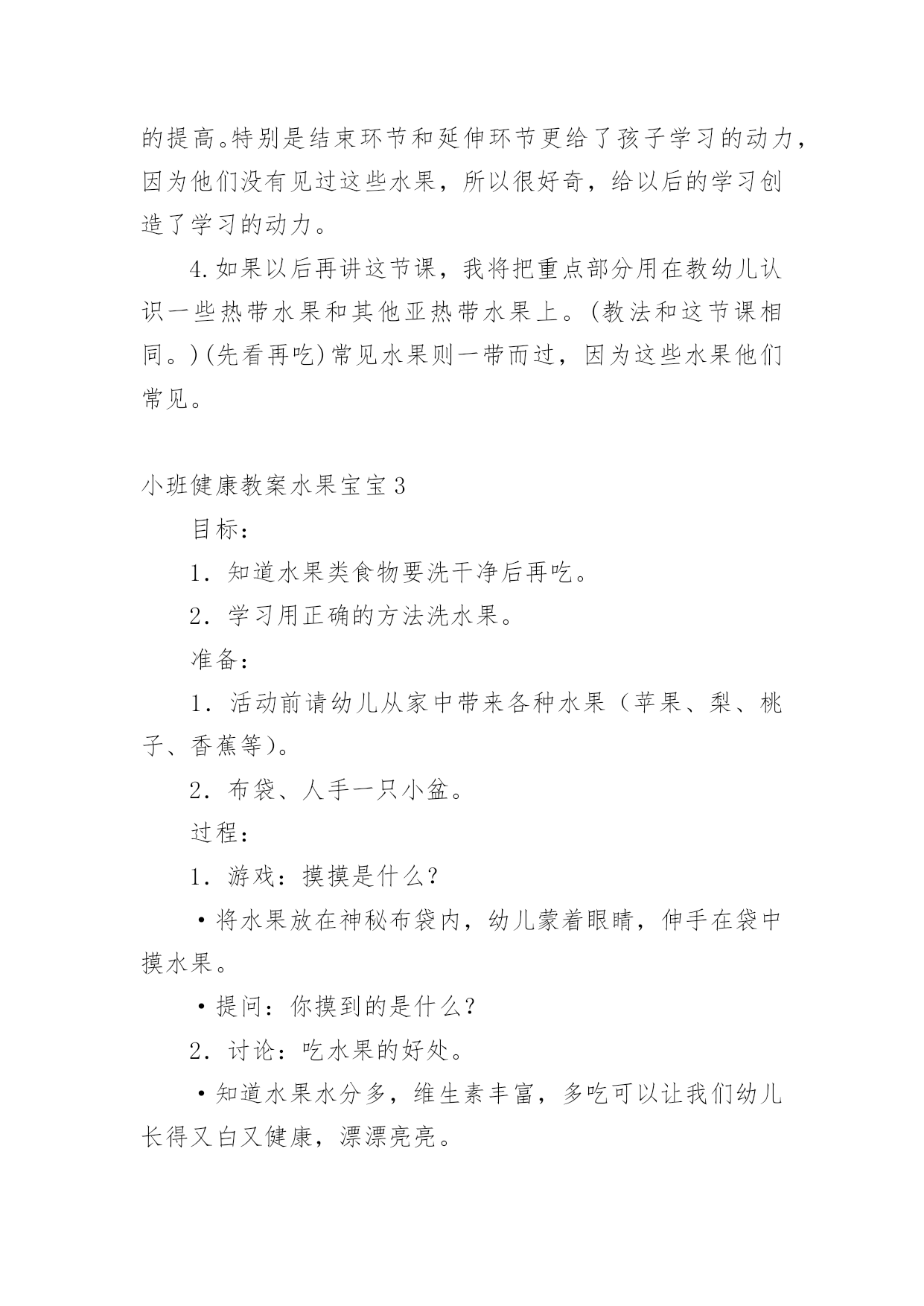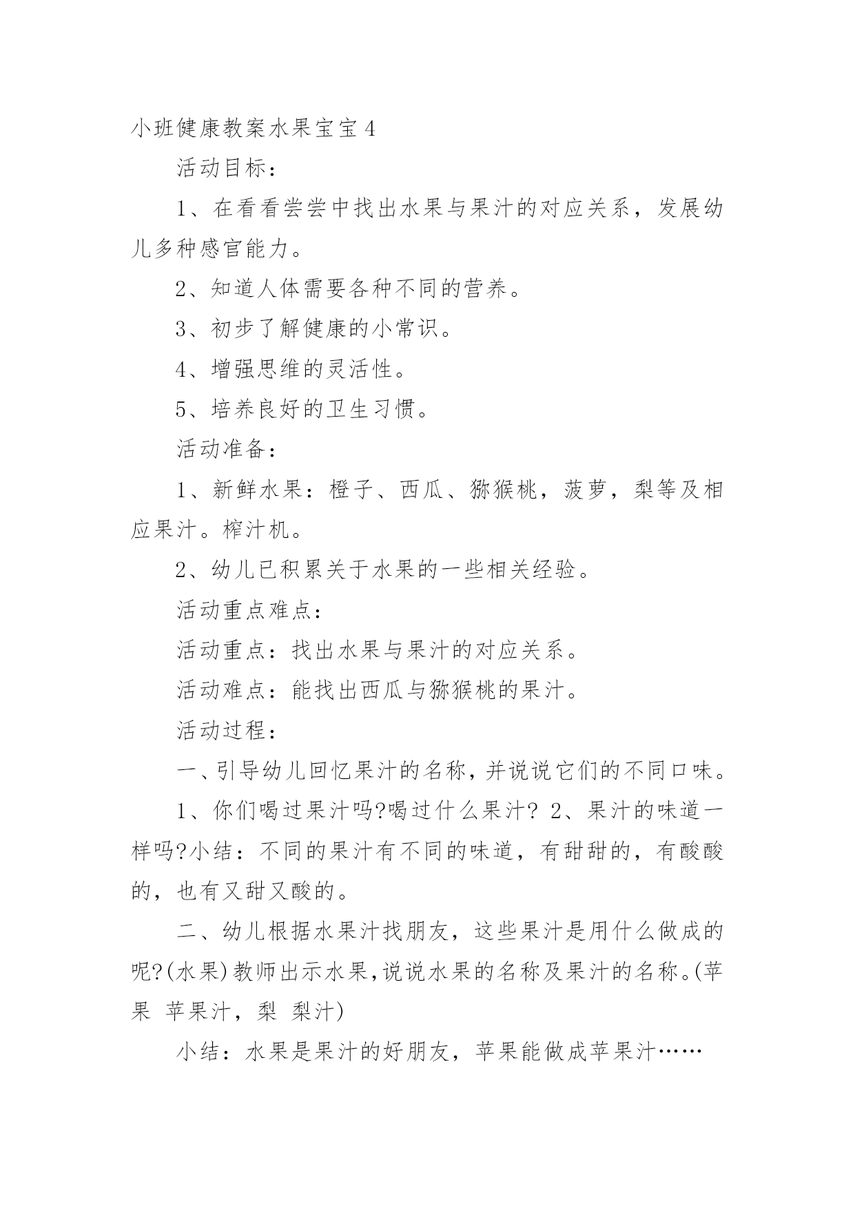 小班健康教案水果宝宝作为一名教师,常常要写一份优秀的教案,教案是教学活动的依据,有着重要的地位。优秀的教案都具备一些什么特点呢?下面是小编为大家收集的小班健康教案水果宝宝,仅供参考,大家一起来看看吧。小班健康教案水果宝宝1【活动目标】1、知道水果类食物要洗干净后再吃。2、养成吃东西前要用肥皂洗手的习惯。【活动准备】各种水果。【活动过程】1、教师将水果放在神秘袋,幼儿蒙眼睛,伸手在袋中摸水果。你摸到的是什么水果?幼儿说出水果的名称和形状。2、了解吃水果的好处,水果水分多,维生素丰富,多吃可以让我们又白又健康,漂亮。3、教师引导幼儿观察这些水果,让幼儿看到它们的.表面是脏的,启发幼儿想想吃水果前应该怎么办?4、教师和幼儿共同给水果宝宝洗个澡,让它们变得干净又漂亮。5、水果宝宝干净了,我们小朋友吃之前要什么呢?启发幼儿洗手。6、引导幼儿想想,还有哪些不干净食物不能吃。如:掉地上的食物,苍蝇叮过的食物等。小班健康教案水果宝宝2活动设计背景九月的一天,一名外地转来的幼儿拿着一个青皮核桃问我:“老师,这是什么呀?好吃吗?”我说:“这是没成熟的核桃,还不能吃,等过段时间,它成熟了才能吃。”他满脸遗憾地走了,我想:何不趁此机会,教孩子们认识一下常见水果,让孩子们“长长见识?”于是就有了本节课的构思。活动目标1.通过本课学习,使幼儿认识一些常见水果。知道他们的外形,颜色,吃法以及味道。2.通过本课学习,使孩子们知道多吃水果的好处,养成多吃水果的习惯。3.知道人体需要各种不同的'营养。4.培养幼儿敏锐的观察能力。5.探索、发现生活中的多样性及特征。教学重点、难点认识常见水果的外形,颜色,以及吃法。同时知道多吃水果有益健康,养成多吃水果的习惯。活动准备常见水果(苹果、香蕉、桔子、梨)实物以及桃子,石榴等水果的图片活动过程一.开始环节:复习手指操(小白上楼梯),导入课题。二.基本环节:逐一出示四种常见水果,引导幼儿认识(从外形,颜色,吃法以及味道上来区分)1.看外形:苹果是圆的,红红的。香蕉是长长的,黄色的。桔子是桔黄色的,圆圆的。梨是淡黄色的,上边小,下边大的椭圆形。2.实际吃:注意引导幼儿,香蕉和桔子要剥开皮后才能吃,苹果和梨要洗干净才能吃。也可以削掉皮吃。3.品尝味道:分给幼儿常见水果,让他们细细品尝后,说出是什么味道?三.结束环节:1.这些是常见水果,我们还见过那些水果?出示图片,引导幼儿说出来,(比如:桃子,石榴,葡萄等)并认识。2.水果里有很多对我们身体有好处的东西,所以我们要多吃水果.四.延伸环节:水果由于产地不同,种类也不同,建议孩子们走进大自然,多认识一些水果。比如:火龙果、荔枝、榴莲等。教学反思1.本课能充分尊重幼儿的兴趣爱好和个性发展,积极调动了幼儿的学习积极性,师幼互动良好,课堂气氛活跃。2.教学环节设计合理,过渡自然。3.通过本节课的学习,幼儿的认知能力得到很大程度上的提高。特别是结束环节和延伸环节更给了孩子学习的动力,因为他们没有见过这些水果,所以很好奇,给以后的学习创造了学习的动力。4.如果以后再讲这节课,我将把重点部分用在教幼儿认识一些热带水果和其他亚热带水果上。(教法和这节课相同。)(先看再吃)常见水果则一带而过,因为这些水果他们常见。小班健康教案水果宝宝3目标:1.知道水果类食物要洗干净后再吃。2.学习用正确的方法洗水果。准备:1.活动前请幼儿从家中带来各种水果(苹果、梨、桃子、香蕉等)。2.布袋、人手一只小盆。过程:1.游戏:摸摸是什么?·将水果放在神秘布袋内,幼儿蒙着眼睛,伸手在袋中摸水果。·提问:你摸到的是什么?2.讨论:吃水果的好处。·知道水果水分多,维生素丰富,多吃可以让我们幼儿长得又白又健康,漂漂亮亮。3.给水果宝宝洗个澡。·幼儿观察水果表面。·了解水果表面很脏,知道水果洗干净才能吃。·教师和幼儿共同洗水果。·洗的时候要把水果的每个地方都洗到,不要把水溅出来。建议:1.可以让幼儿品尝洗干净的水果。2.与家长联系,鼓励幼儿在家也要讲卫生,洗水果。评价:对洗水果感兴趣,愿意动手洗水果。教学反思:在整个教学活动中幼儿一直是主动参与的角色能够被理解、尊重、接纳,有自由动手发挥的空间。能够通过与环境、同伴、教师的互动并在情感、态度、能力、知识、技能等反面得到自主的发展,教师了解幼儿的经验的水平、学习特点和个性特征。能把握教育内容的核心价值及其发展线索,能以自己最小的支持及教学技能促进幼儿最大限度的'发展。在活动中师幼互动默契,教师也能依幼儿的需要调整教学。在这节课中教师的优势是调动孩子想要动手的兴趣,并适时发现掌握孩子的问题。如果这节课要重新上,我会将结束部分改为和孩子动手一起做好吃的水果沙拉。延伸孩子动手的兴趣。小班健康教案水果宝宝4活动目标:1、在看看尝尝中找出水果与果汁的对应关系,发展幼儿多种感官能力。