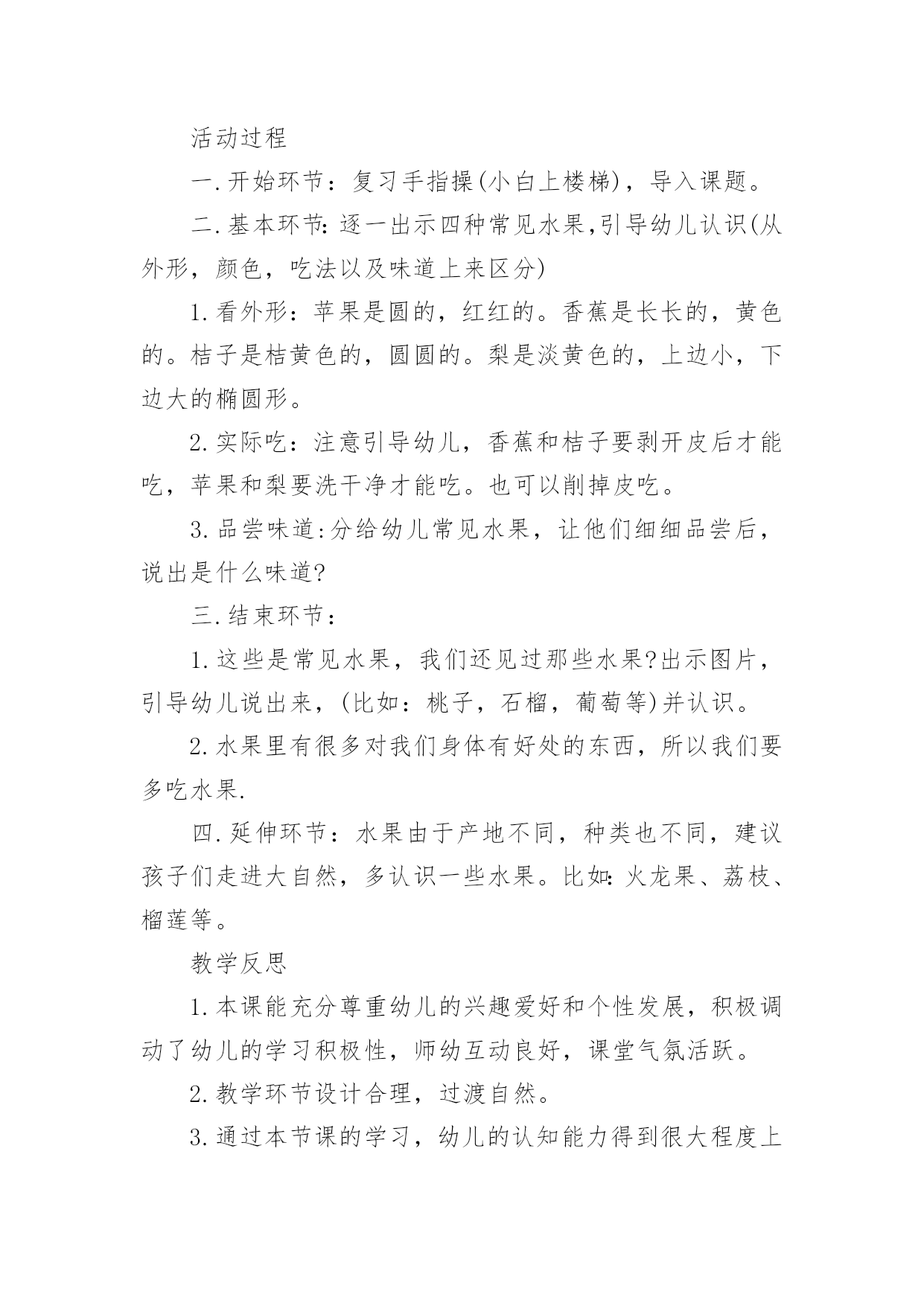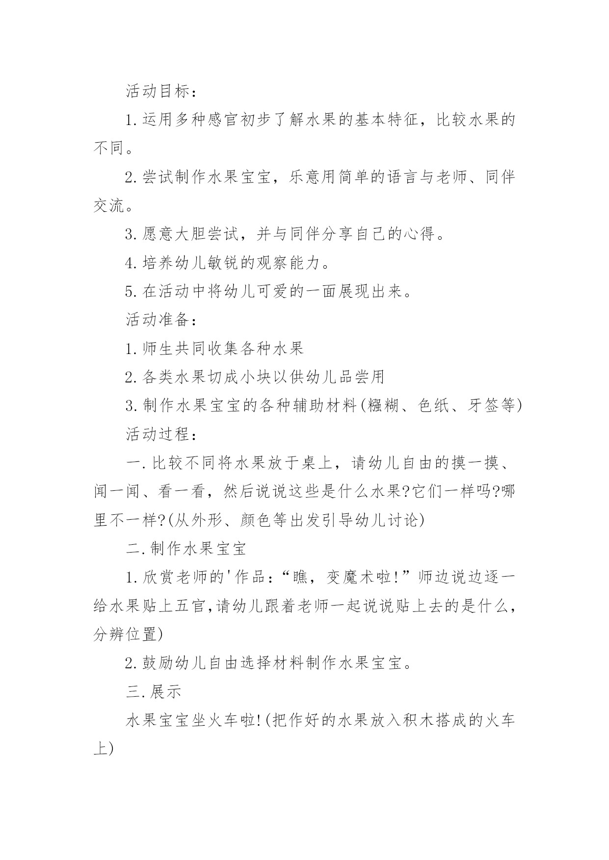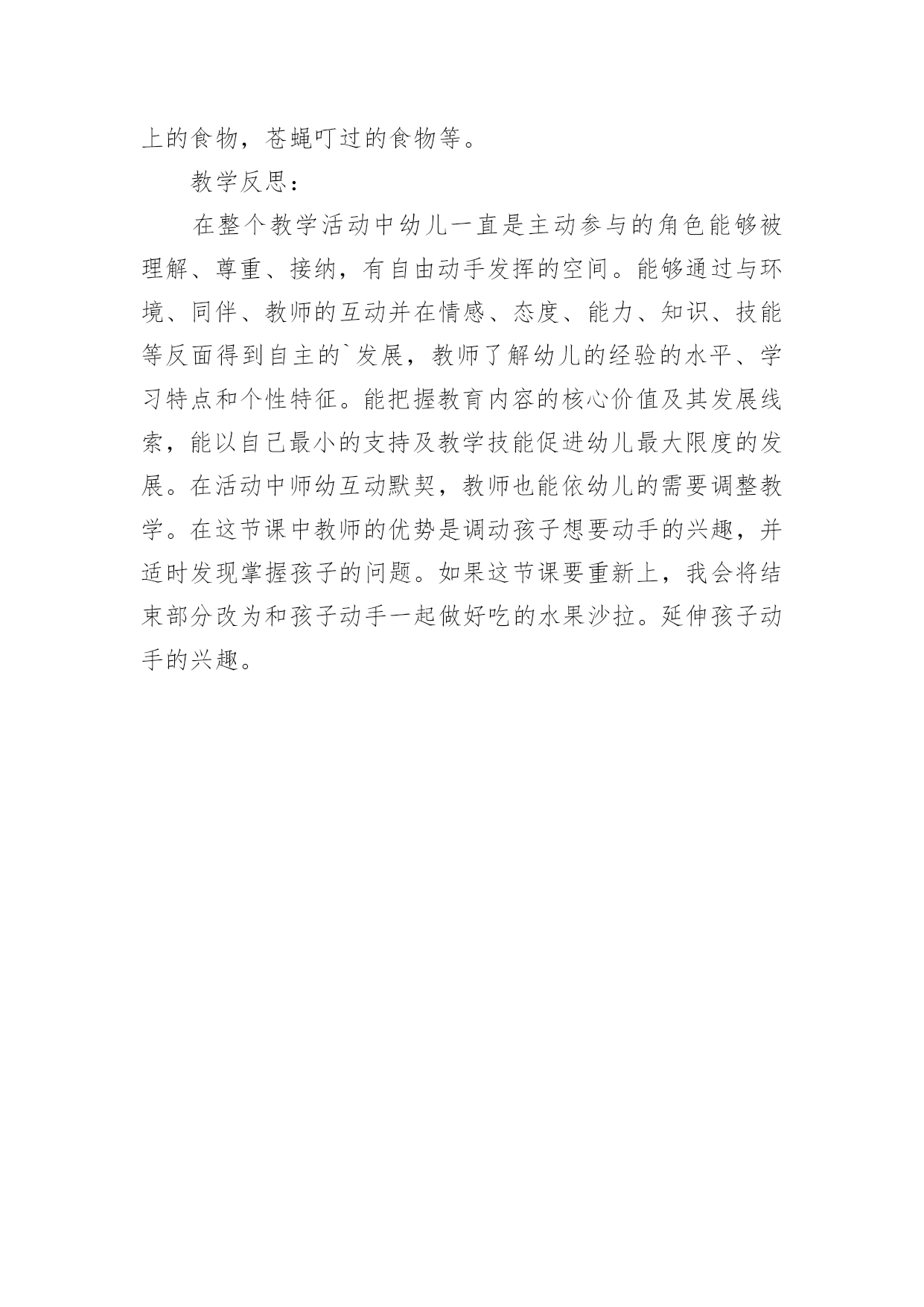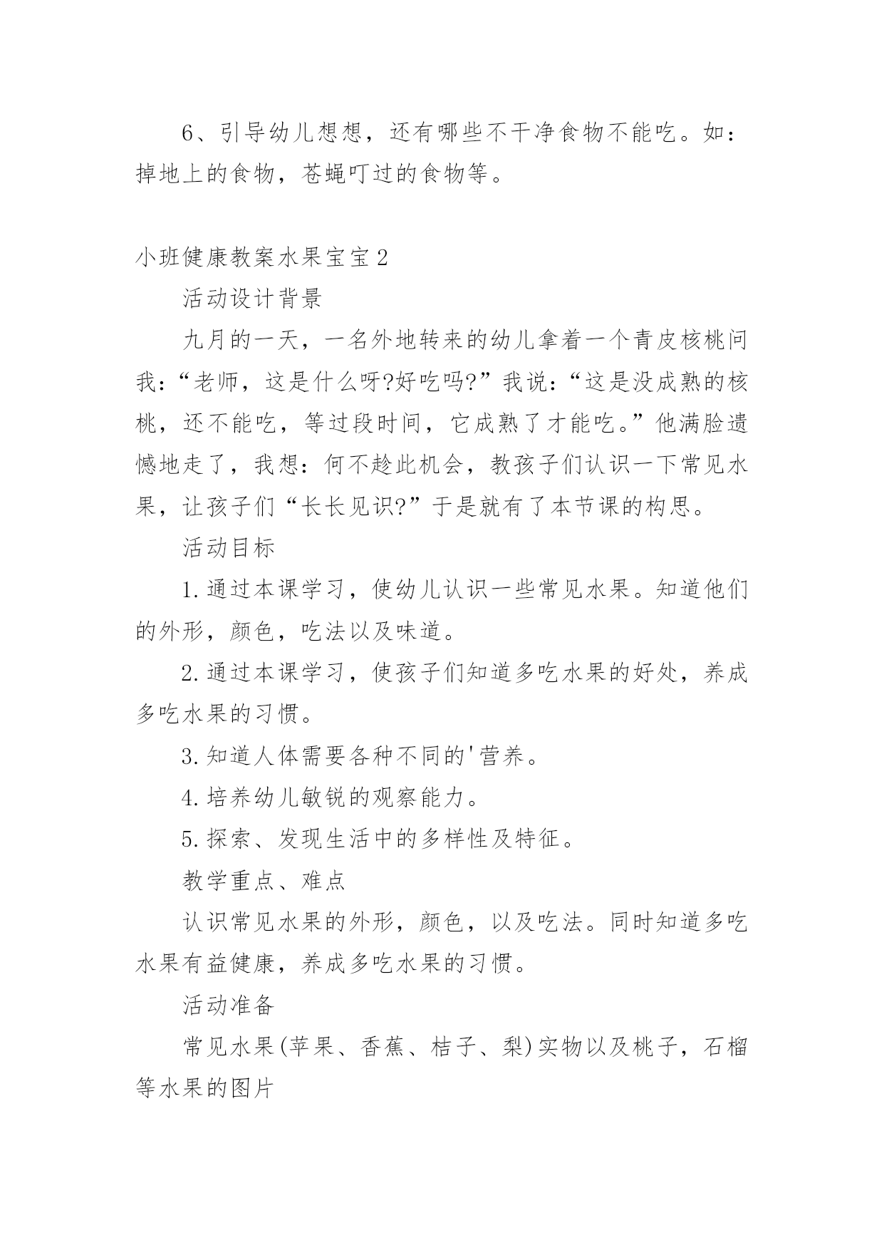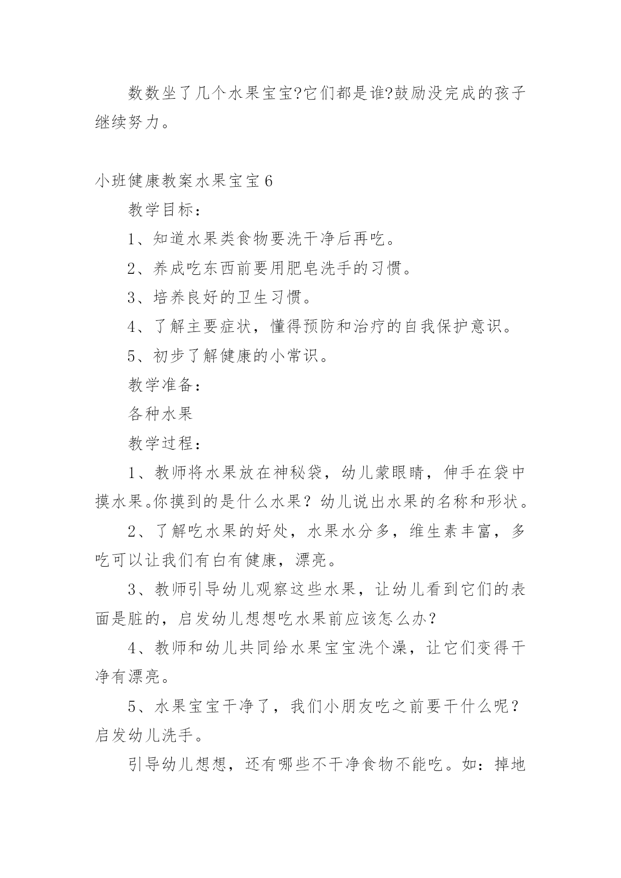 小班健康教案水果宝宝作为一名教师,常常要写一份优秀的教案,教案是教学活动的依据,有着重要的地位。优秀的教案都具备一些什么特点呢?下面是小编为大家收集的小班健康教案水果宝宝,仅供参考,大家一起来看看吧。小班健康教案水果宝宝1【活动目标】1、知道水果类食物要洗干净后再吃。2、养成吃东西前要用肥皂洗手的习惯。【活动准备】各种水果。【活动过程】1、教师将水果放在神秘袋,幼儿蒙眼睛,伸手在袋中摸水果。你摸到的是什么水果?幼儿说出水果的名称和形状。2、了解吃水果的好处,水果水分多,维生素丰富,多吃可以让我们又白又健康,漂亮。3、教师引导幼儿观察这些水果,让幼儿看到它们的.表面是脏的,启发幼儿想想吃水果前应该怎么办?4、教师和幼儿共同给水果宝宝洗个澡,让它们变得干净又漂亮。5、水果宝宝干净了,我们小朋友吃之前要什么呢?启发幼儿洗手。6、引导幼儿想想,还有哪些不干净食物不能吃。如:掉地上的食物,苍蝇叮过的食物等。小班健康教案水果宝宝2活动设计背景九月的一天,一名外地转来的幼儿拿着一个青皮核桃问我:“老师,这是什么呀?好吃吗?”我说:“这是没成熟的核桃,还不能吃,等过段时间,它成熟了才能吃。”他满脸遗憾地走了,我想:何不趁此机会,教孩子们认识一下常见水果,让孩子们“长长见识?”于是就有了本节课的构思。活动目标1.通过本课学习,使幼儿认识一些常见水果。知道他们的外形,颜色,吃法以及味道。2.通过本课学习,使孩子们知道多吃水果的好处,养成多吃水果的习惯。3.知道人体需要各种不同的'营养。4.培养幼儿敏锐的观察能力。5.探索、发现生活中的多样性及特征。教学重点、难点认识常见水果的外形,颜色,以及吃法。同时知道多吃水果有益健康,养成多吃水果的习惯。活动准备常见水果(苹果、香蕉、桔子、梨)实物以及桃子,石榴等水果的图片活动过程一.开始环节:复习手指操(小白上楼梯),导入课题。二.基本环节:逐一出示四种常见水果,引导幼儿认识(从外形,颜色,吃法以及味道上来区分)1.看外形:苹果是圆的,红红的。香蕉是长长的,黄色的。桔子是桔黄色的,圆圆的。梨是淡黄色的,上边小,下边大的椭圆形。2.实际吃:注意引导幼儿,香蕉和桔子要剥开皮后才能吃,苹果和梨要洗干净才能吃。也可以削掉皮吃。3.品尝味道:分给幼儿常见水果,让他们细细品尝后,说出是什么味道?三.结束环节:1.这些是常见水果,我们还见过那些水果?出示图片,引导幼儿说出来,(比如:桃子,石榴,葡萄等)并认识。2.水果里有很多对我们身体有好处的东西,所以我们要多吃水果.四.延伸环节:水果由于产地不同,种类也不同,建议孩子们走进大自然,多认识一些水果。比如:火龙果、荔枝、榴莲等。教学反思1.本课能充分尊重幼儿的兴趣爱好和个性发展,积极调动了幼儿的学习积极性,师幼互动良好,课堂气氛活跃。2.教学环节设计合理,过渡自然。3.通过本节课的学习,幼儿的认知能力得到很大程度上的提高。特别是结束环节和延伸环节更给了孩子学习的动力,因为他们没有见过这些水果,所以很好奇,给以后的学习创造了学习的动力。4.如果以后再讲这节课,我将把重点部分用在教幼儿认识一些热带水果和其他亚热带水果上。(教法和这节课相同。)(先看再吃)常见水果则一带而过,因为这些水果他们常见。小班健康教案水果宝宝3目标:1.知道水果类食物要洗干净后再吃。2.学习用正确的方法洗水果。准备:1.活动前请幼儿从家中带来各种水果(苹果、梨、桃子、香蕉等)。2.布袋、人手一只小盆。过程:1.游戏:摸摸是什么?·将水果放在神秘布袋内,幼儿蒙着眼睛,伸手在袋中摸水果。·提问:你摸到的是什么?2.讨论:吃水果的好处。·知道水果水分多,维生素丰富,多吃可以让我们幼儿长得又白又健康,漂漂亮亮。3.给水果宝宝洗个澡。·幼儿观察水果表面。·了解水果表面很脏,知道水果洗干净才能吃。·教师和幼儿共同洗水果。·洗的时候要把水果的每个地方都洗到,不要把水溅出来。建议:1.可以让幼儿品尝洗干净的水果。2.与家长联系,鼓励幼儿在家也要讲卫生,洗水果。评价:对洗水果感兴趣,愿意动手洗水果。教学反思:在整个教学活动中幼儿一直是主动参与的角色能够被理解、尊重、接纳,有自由动手发挥的空间。能够通过与环境、同伴、教师的互动并在情感、态度、能力、知识、技能等反面得到自主的发展,教师了解幼儿的经验的水平、学习特点和个性特征。能把握教育内容的核心价值及其发展线索,能以自己最小的支持及教学技能促进幼儿最大限度的'发展。在活动中师幼互动默契,教师也能依幼儿的需要调整教学。在这节课中教师的优势是调动孩子想要动手的兴趣,并适时发现掌握孩子的问题。如果这节课要重新上,我会将结束部分改为和孩子动手一起做好吃的水果沙拉。延伸孩子动手的兴趣。小班健康教案水果宝宝4活动目标:1、在看看尝尝中找出水果与果汁的对应关系,发展幼儿多种感官能力。