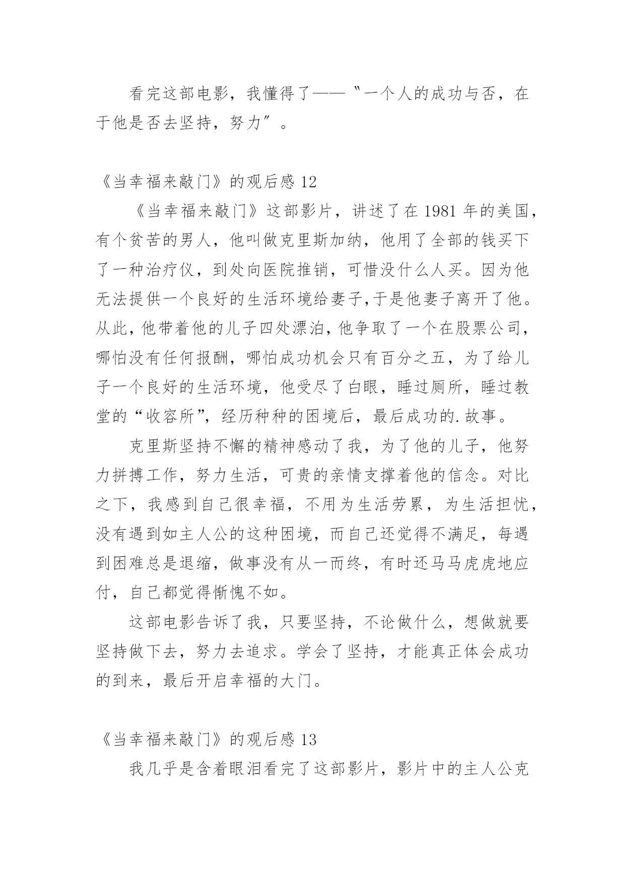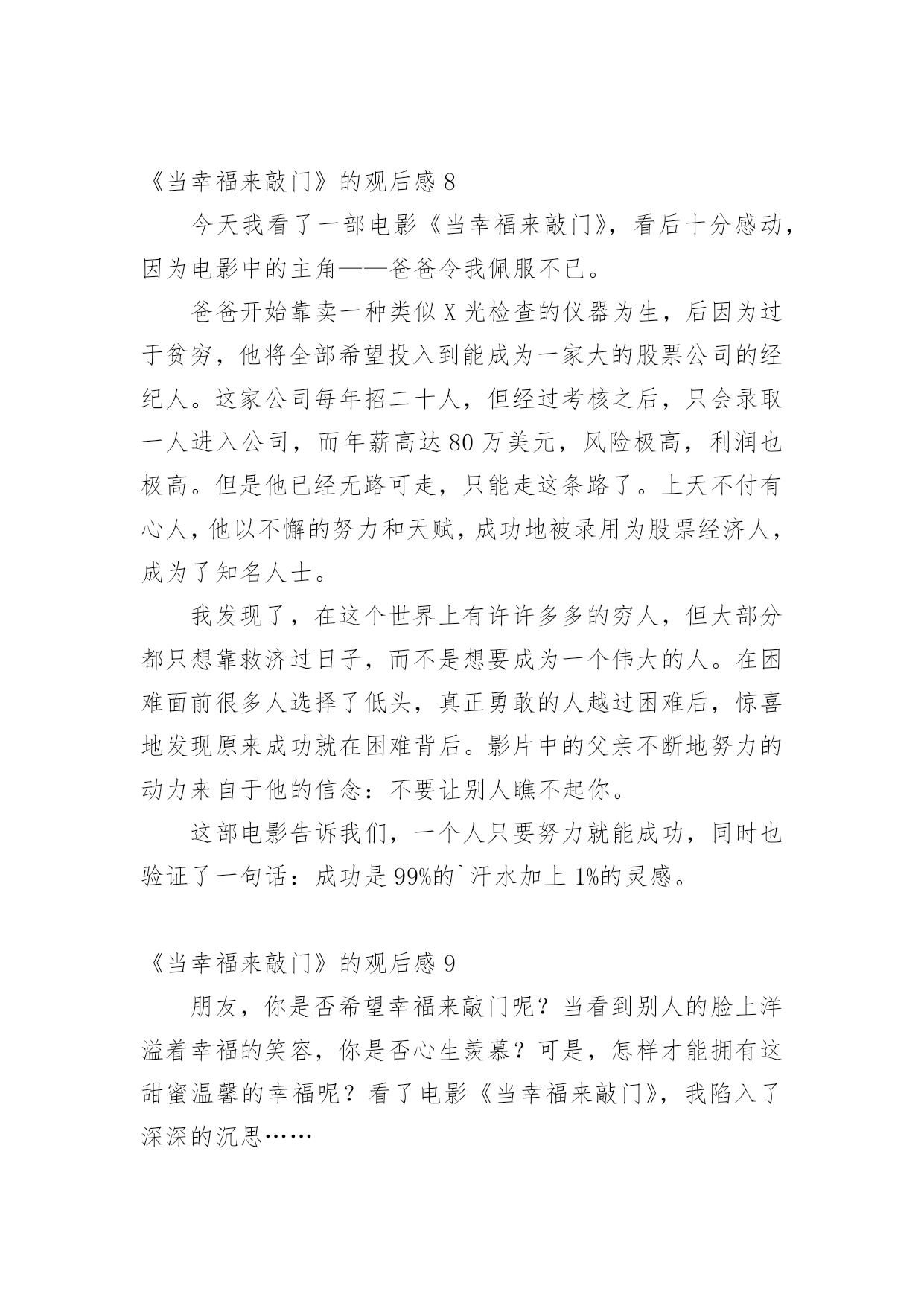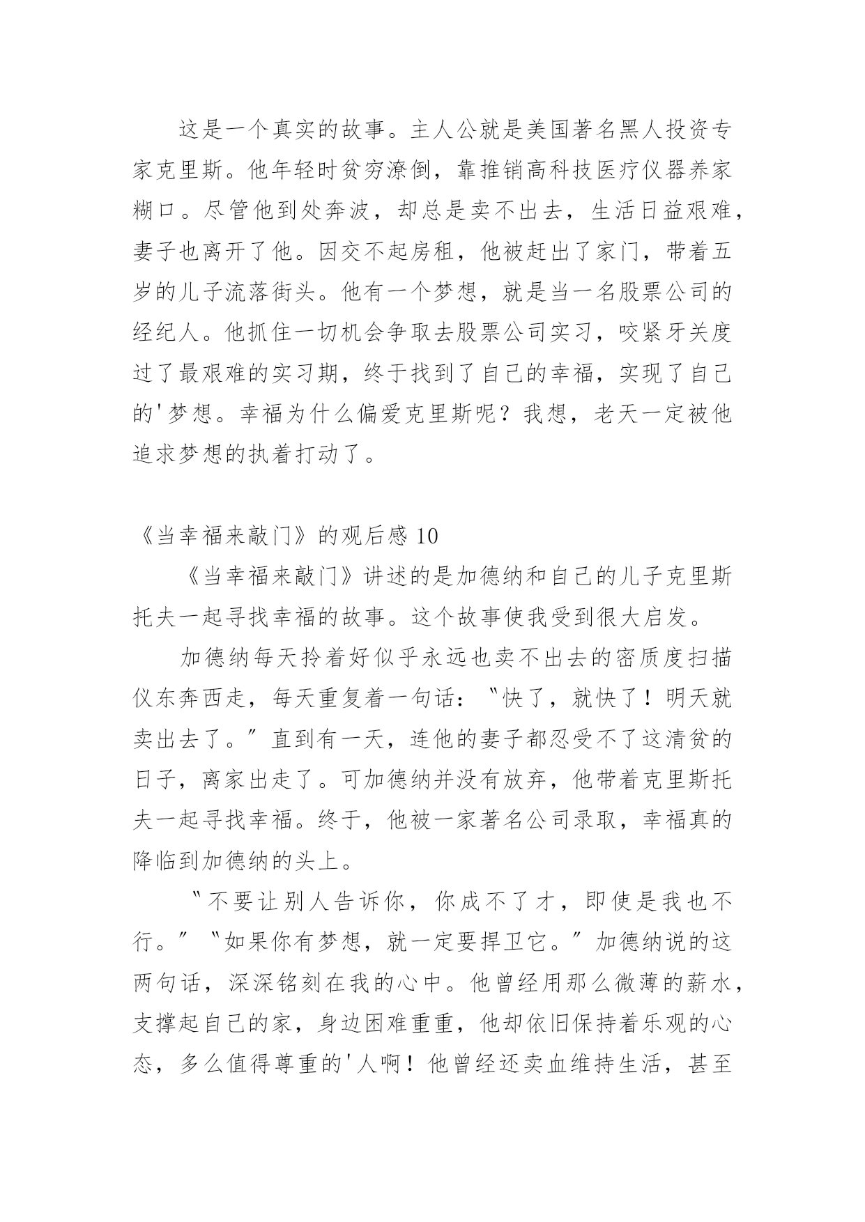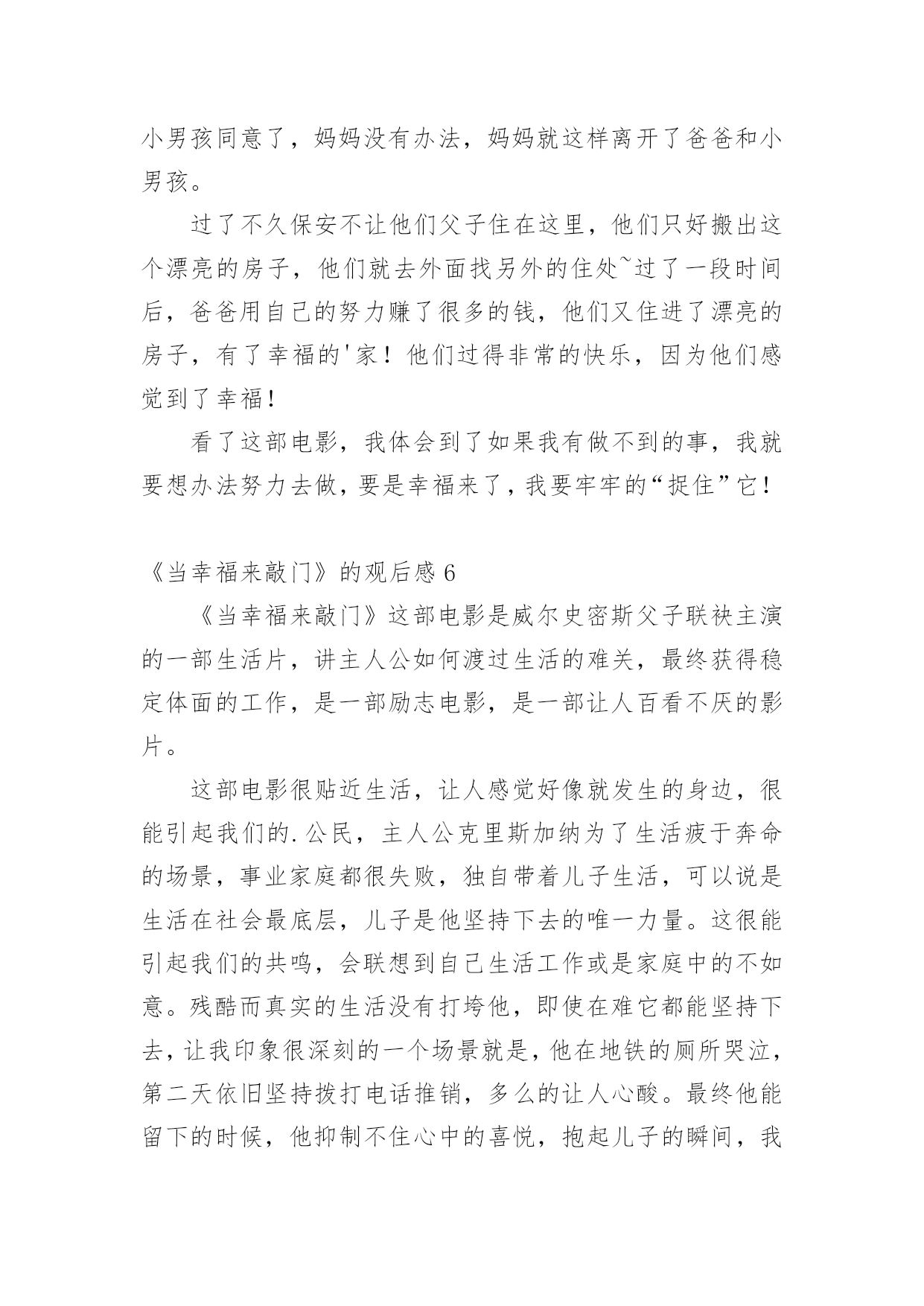 《当幸福来敲门》的观后感当观看完一部作品后,这次观看让你有什么体会呢?这时候十分有必须要写一篇观后感了!那么你真的懂得怎么写观后感吗?以下是小编为大家收集的《当幸福来敲门》的观后感,希望能够帮助到大家。《当幸福来敲门》的观后感1幸福是人人所向往的,但想得到它并非那么容易,在获得幸福的旅途上有这样的一个人;他无论遇见什么样的困难都从没放弃,勇往直前!电影主演讲述的是主人公克里斯。加德纳因事业受阻而离婚,自己一个人带着儿子努力奋斗,在这过程中他们没钱交房租,被迫住厕所,因无法交罚款而被拘留,可加德纳从不放弃,带着儿子走南闯北后,得到金融投资家的实习机会,并凭借自己对数字的'精算与流利的语言成为著名金融投资家并得到幸福的故事!这个影片结束后,我心中如浪涛翻滚久久不能平静,想一想一个人的人生跌入深谷的时候是如何爬上来的?在这过程中又有多困难!我们无法想象,只知道他坚持不懈,勇往直前,敢于面对挫折,不向命运低头,并给予自己五岁的儿子如山高的父爱,为自己的儿子遮风挡雨,从没想过放弃自己的儿子!有福与他一起享受,有难自己扛,不让儿子知道,这是多么使人感动!这使我自愧不如,明明生活在幸福的海洋,却不住抓紧时间努力奋斗,有先进的教育环境却从不满足,观看这部电影以后我要改变自己,向前方跨入第一步台阶!《当幸福来敲门》的观后感2前几天,妈妈给我看了一部电影,叫《当幸福来敲门》,先听我慢慢说吧!在这部电影里,有一个大男人,他就是这部电影的主角,他还有一个儿子和他的一位妻子。但是,他的好景不长,因为他做的扫描高科技机器,价格太贵,一直没有人去买这台机器,他的妻子知道了这件事,就决定带着儿子离开家。但是后来,妻子又不知干什么的,把儿子又给了大男人。于是,儿子的.爸便带着儿子四处奔波,终于在一家经济公司找到了去路,决定去里面面试、考试,努力争当经济公司的经济人!好在“功夫不负有心人”,幸福也来大男人家敲门了!他,通过了考试,成功当选经济人!幸福会陪他和儿子永远!这部电影告诉我们,不管你做任何事,都要抱着一颗不断追求、不断努力、不断坚持的心!在这时候,你一定不能放弃!否则,幸福会离你更远!《当幸福来敲门》的观后感3今天,《幸福来敲门》大结局:幸福掌握在自己手中,就看你是散开还是紧握,幸福来敲门观后感:人间自有真情在。真的像江路在给姐姐说的那样,写出小说拍出电影,看得人淅沥哗啦的。最近眼睛有点痛,确实有看这个电视的原因。哈哈,老了,经不住剧情的感染。人生如斯,不管是坐办公室的金领白领,还是车间流水线上的蓝领灰领,不管是田间地头的大哥大嫂,还是挥斥方遒的领袖人物,不管是电视上露脸的企业家电影家,还是大街角落曲卷的拾荒者流浪汉。每个人都有自己的故事,可能写出来拍出来,也都会让看的人淅沥哗啦的。人人都有故事,昨天经历过的,也许今天明天正在或者即将创造着的。有故事就可以集点滴以成大合,就像倪萍的日子,白云的月子,黑土的伺候月子。普通人也在以不同的`方式记录着自己的曾经,有日记有照片有视频有流水账簿。当然也有在网络上飞飞扬扬的各种“啊,门”。其实更多的自觉不自觉地记录在自己脑海的深处,酸甜苦辣咸,五味俱全。或随时间的飞逝散落在茫茫大河中,或在暮年口述成回忆录,真还有可能成就一代文学巨匠。《幸福来敲门》剧本编的客观,演员演的真诚。朴实的爱、真诚的爱、让人感动良久。《当幸福来敲门》的观后感4昨天晚上,妈妈给我看了一部励志电影,名叫:当幸福来敲门。它描述的是:有一家人,爸爸叫克里斯。加德纳,妈妈叫琳达,五岁的儿子叫克里斯托弗。他们一家很穷,爸爸是个告推销骨质扫描仪为生的.因为他们家实在太穷,所以他们交不起房租,被房东赶了出来。妈妈因为无法忍受这样的贫困生活而去了别的城市。爸爸和儿子以后相依为命。爸爸为了挣更多的钱,就凭着他的聪明和诚恳去获得了一个实习生的名额。因为实习生是没有工资的,所以每次下了班他都带着儿子赶去收容所排队等床位。一次,因为他们实在等不到床位了,就在地铁的卫生间里凑合了一夜。最后,他的爸爸终于获得了一份经纪人的工作,让生活稳定了下来,在那一刻,爸爸留下了幸福的泪水!以后的日子里,克里斯。加德纳为公司争得了许多荣誉,最终变成了百万富翁。我觉得克里斯托弗很听话,虽然每天跟着他爸四处奔波,很累,但是他不会不走,不会让爸爸抱他。我们要向他爸爸一样,只要你有梦想,就努力去实现,只要你有信心,有奋斗,就一定能成功。《当幸福来敲门》的观后感5《当幸福来敲门》这部电影不会让你感觉到害怕,悲伤,好笑,有趣等。这部电影的内容是这样的:从前有一个爸爸,他又一个儿子和一个老婆。他们家很穷,但他们又个漂亮,高大的房子,爸爸每天都要去接送儿子上学放学,然后去卖东西。可是妈妈却特别不喜欢爸爸,日子就这样过着,妈妈一天比一天更不喜欢爸爸,终于有一次妈妈决定要带着儿子离开爸爸,离开这个家,