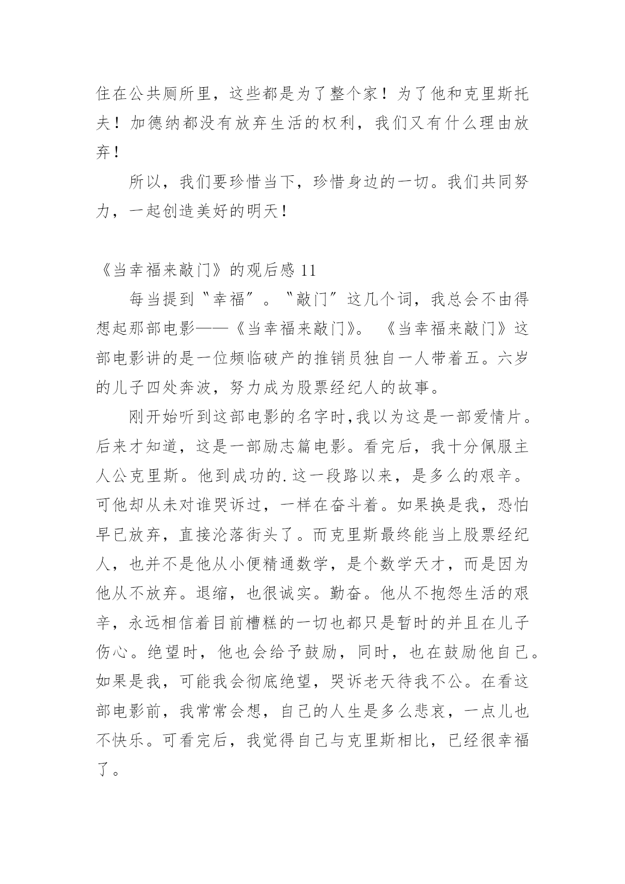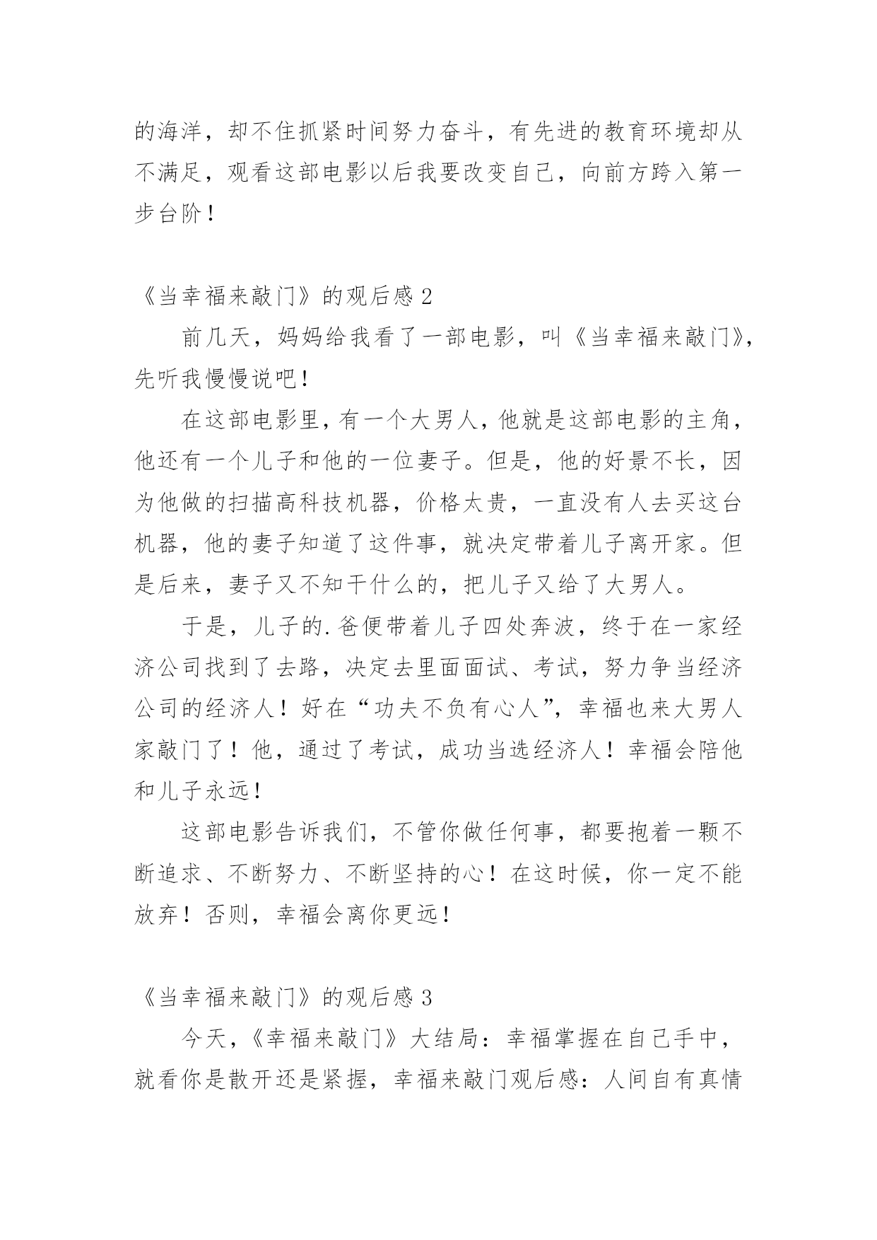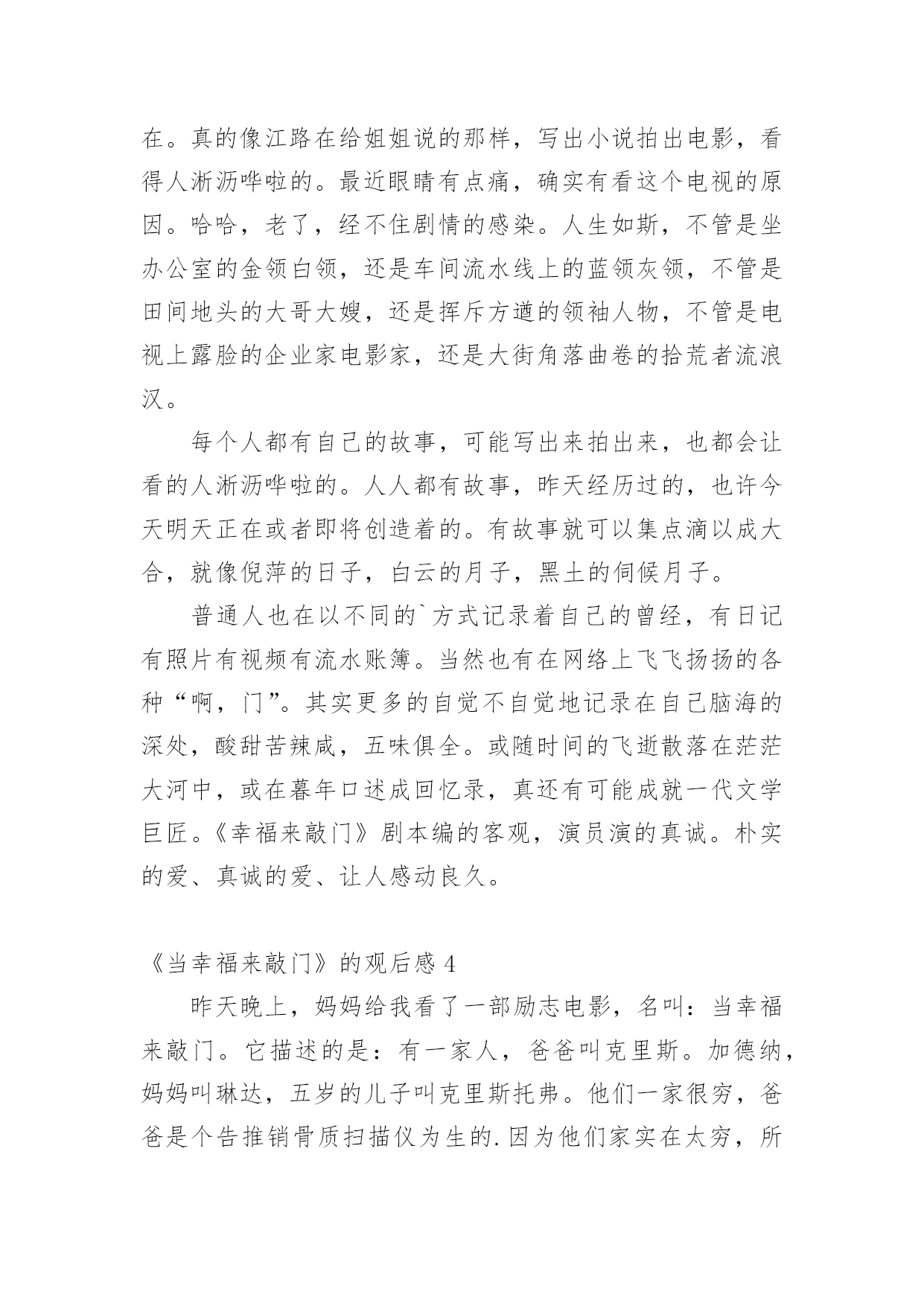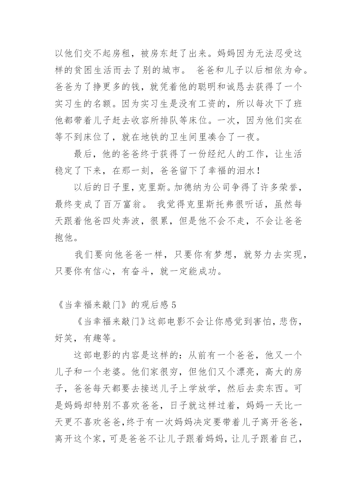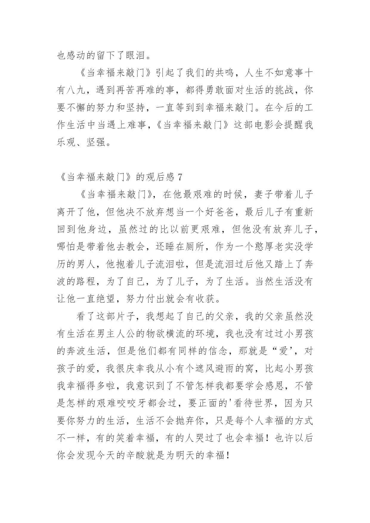 《当幸福来敲门》的观后感当观看完一部作品后,这次观看让你有什么体会呢?这时候十分有必须要写一篇观后感了!那么你真的懂得怎么写观后感吗?以下是小编为大家收集的《当幸福来敲门》的观后感,希望能够帮助到大家。《当幸福来敲门》的观后感1幸福是人人所向往的,但想得到它并非那么容易,在获得幸福的旅途上有这样的一个人;他无论遇见什么样的困难都从没放弃,勇往直前!电影主演讲述的是主人公克里斯。加德纳因事业受阻而离婚,自己一个人带着儿子努力奋斗,在这过程中他们没钱交房租,被迫住厕所,因无法交罚款而被拘留,可加德纳从不放弃,带着儿子走南闯北后,得到金融投资家的实习机会,并凭借自己对数字的'精算与流利的语言成为著名金融投资家并得到幸福的故事!这个影片结束后,我心中如浪涛翻滚久久不能平静,想一想一个人的人生跌入深谷的时候是如何爬上来的?在这过程中又有多困难!我们无法想象,只知道他坚持不懈,勇往直前,敢于面对挫折,不向命运低头,并给予自己五岁的儿子如山高的父爱,为自己的儿子遮风挡雨,从没想过放弃自己的儿子!有福与他一起享受,有难自己扛,不让儿子知道,这是多么使人感动!这使我自愧不如,明明生活在幸福的海洋,却不住抓紧时间努力奋斗,有先进的教育环境却从不满足,观看这部电影以后我要改变自己,向前方跨入第一步台阶!《当幸福来敲门》的观后感2前几天,妈妈给我看了一部电影,叫《当幸福来敲门》,先听我慢慢说吧!在这部电影里,有一个大男人,他就是这部电影的主角,他还有一个儿子和他的一位妻子。但是,他的好景不长,因为他做的扫描高科技机器,价格太贵,一直没有人去买这台机器,他的妻子知道了这件事,就决定带着儿子离开家。但是后来,妻子又不知干什么的,把儿子又给了大男人。于是,儿子的.爸便带着儿子四处奔波,终于在一家经济公司找到了去路,决定去里面面试、考试,努力争当经济公司的经济人!好在“功夫不负有心人”,幸福也来大男人家敲门了!他,通过了考试,成功当选经济人!幸福会陪他和儿子永远!这部电影告诉我们,不管你做任何事,都要抱着一颗不断追求、不断努力、不断坚持的心!在这时候,你一定不能放弃!否则,幸福会离你更远!《当幸福来敲门》的观后感3今天,《幸福来敲门》大结局:幸福掌握在自己手中,就看你是散开还是紧握,幸福来敲门观后感:人间自有真情在。真的像江路在给姐姐说的那样,写出小说拍出电影,看得人淅沥哗啦的。最近眼睛有点痛,确实有看这个电视的原因。哈哈,老了,经不住剧情的感染。人生如斯,不管是坐办公室的金领白领,还是车间流水线上的蓝领灰领,不管是田间地头的大哥大嫂,还是挥斥方遒的领袖人物,不管是电视上露脸的企业家电影家,还是大街角落曲卷的拾荒者流浪汉。每个人都有自己的故事,可能写出来拍出来,也都会让看的人淅沥哗啦的。人人都有故事,昨天经历过的,也许今天明天正在或者即将创造着的。有故事就可以集点滴以成大合,就像倪萍的日子,白云的月子,黑土的伺候月子。普通人也在以不同的`方式记录着自己的曾经,有日记有照片有视频有流水账簿。当然也有在网络上飞飞扬扬的各种“啊,门”。其实更多的自觉不自觉地记录在自己脑海的深处,酸甜苦辣咸,五味俱全。或随时间的飞逝散落在茫茫大河中,或在暮年口述成回忆录,真还有可能成就一代文学巨匠。《幸福来敲门》剧本编的客观,演员演的真诚。朴实的爱、真诚的爱、让人感动良久。《当幸福来敲门》的观后感4昨天晚上,妈妈给我看了一部励志电影,名叫:当幸福来敲门。它描述的是:有一家人,爸爸叫克里斯。加德纳,妈妈叫琳达,五岁的儿子叫克里斯托弗。他们一家很穷,爸爸是个告推销骨质扫描仪为生的.因为他们家实在太穷,所以他们交不起房租,被房东赶了出来。妈妈因为无法忍受这样的贫困生活而去了别的城市。爸爸和儿子以后相依为命。爸爸为了挣更多的钱,就凭着他的聪明和诚恳去获得了一个实习生的名额。因为实习生是没有工资的,所以每次下了班他都带着儿子赶去收容所排队等床位。一次,因为他们实在等不到床位了,就在地铁的卫生间里凑合了一夜。最后,他的爸爸终于获得了一份经纪人的工作,让生活稳定了下来,在那一刻,爸爸留下了幸福的泪水!以后的日子里,克里斯。加德纳为公司争得了许多荣誉,最终变成了百万富翁。我觉得克里斯托弗很听话,虽然每天跟着他爸四处奔波,很累,但是他不会不走,不会让爸爸抱他。我们要向他爸爸一样,只要你有梦想,就努力去实现,只要你有信心,有奋斗,就一定能成功。《当幸福来敲门》的观后感5《当幸福来敲门》这部电影不会让你感觉到害怕,悲伤,好笑,有趣等。这部电影的内容是这样的:从前有一个爸爸,他又一个儿子和一个老婆。他们家很穷,但他们又个漂亮,高大的房子,爸爸每天都要去接送儿子上学放学,然后去卖东西。可是妈妈却特别不喜欢爸爸,日子就这样过着,妈妈一天比一天更不喜欢爸爸,终于有一次妈妈决定要带着儿子离开爸爸,离开这个家,