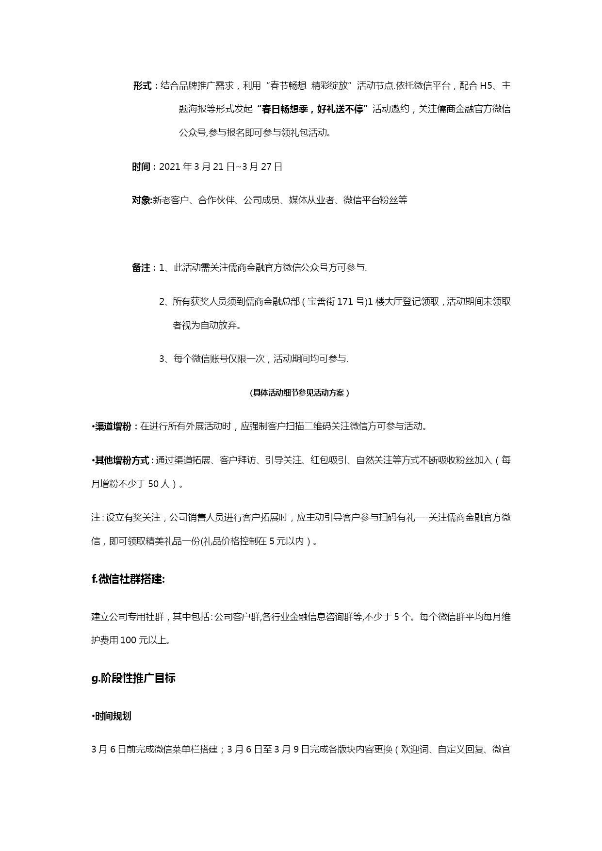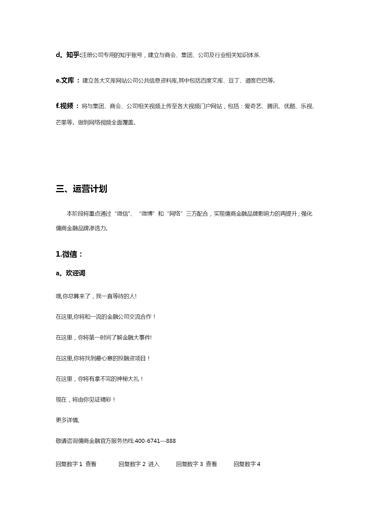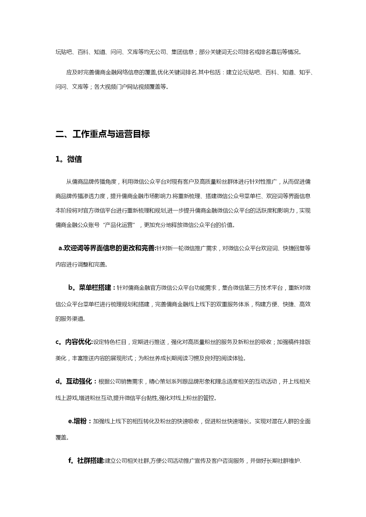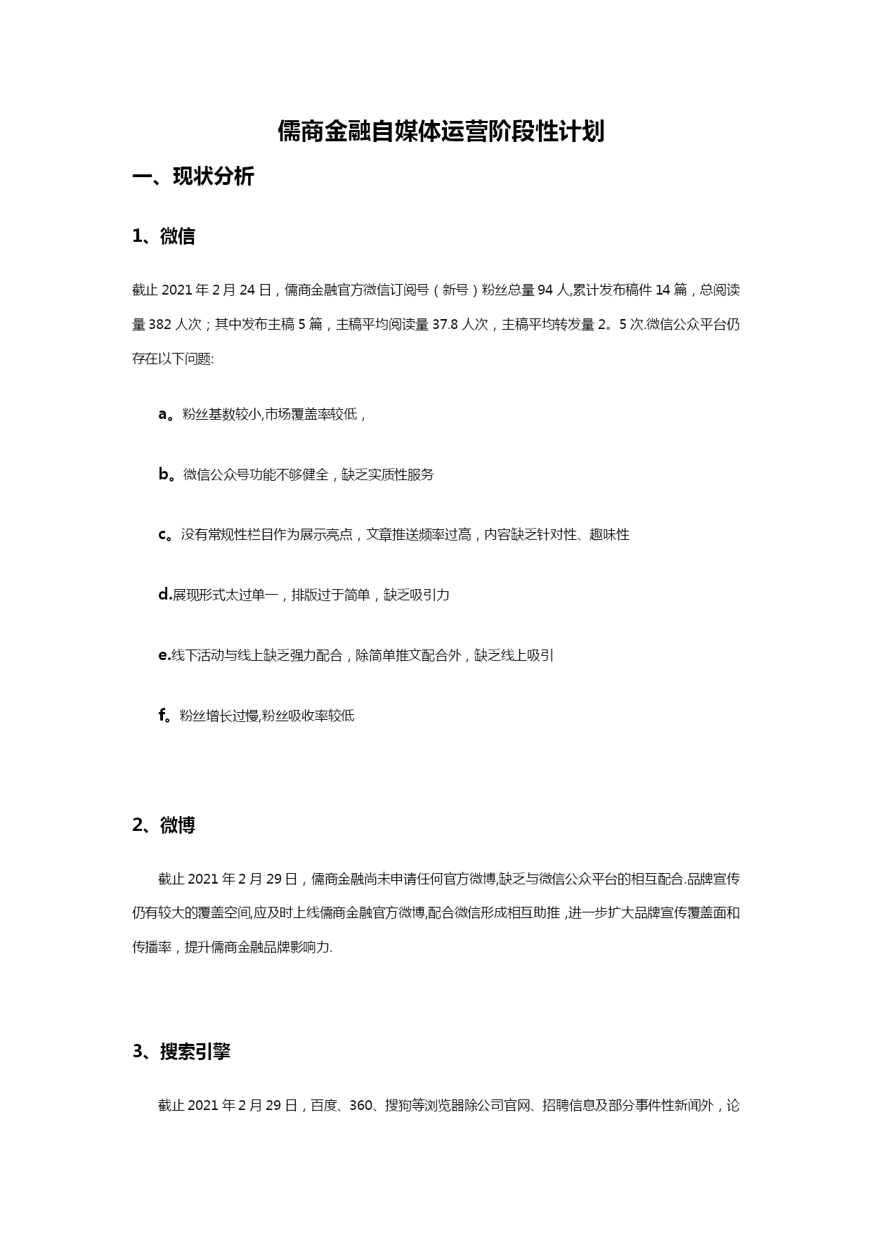 自媒体阶段性运营计划清单(可以直接使用,可编辑优秀版资料,欢迎下载)儒商金融自媒体运营阶段性计划现状分析1、微信截止2021年2月24日,儒商金融官方微信订阅号(新号)粉丝总量94人,累计发布稿件14篇,总阅读量382人次;其中发布主稿5篇,主稿平均阅读量37.8人次,主稿平均转发量2。5次.微信公众平台仍存在以下问题:a。粉丝基数较小,市场覆盖率较低,b。微信公众号功能不够健全,缺乏实质性服务c。没有常规性栏目作为展示亮点,文章推送频率过高,内容缺乏针对性、趣味性d.展现形式太过单一,排版过于简单,缺乏吸引力e.线下活动与线上缺乏强力配合,除简单推文配合外,缺乏线上吸引f。粉丝增长过慢,粉丝吸收率较低2、微博截止2021年2月29日,儒商金融尚未申请任何官方微博,缺乏与微信公众平台的相互配合.品牌宣传仍有较大的覆盖空间,应及时上线儒商金融官方微博,配合微信形成相互助推,进一步扩大品牌宣传覆盖面和传播率,提升儒商金融品牌影响力.3、搜索引擎截止2021年2月29日,百度、360、搜狗等浏览器除公司官网、招聘信息及部分事件性新闻外,论坛贴吧、百科、知道、问问、文库等均无公司、集团信息;部分关键词无公司排名或排名靠后等情况。应及时完善儒商金融网络信息的覆盖,优化关键词排名.其中包括:建立论坛贴吧、百科、知道、知乎、问问、文库等;各大视频门户网站视频覆盖等。工作重点与运营目标1。微信从儒商品牌传播角度,利用微信公众平台对现有客户及高质量粉丝群体进行针对性推广,从而促进儒商品牌传播渗透力度,提升儒商金融市场影响力.将重新梳理、搭建微信公众号菜单栏、欢迎词等界面信息本阶段将对官方微信平台进行重新梳理和规划,进一步提升儒商金融微信公众平台的活跃度和影响力,实现儒商金融公众账号“产品化运营”,更加充分地释放微信公众平台的价值。a.欢迎词等界面信息的更改和完善:针对新一轮微信推广需求,对微信公众平台欢迎词、快捷回复等内容进行调整和完善。b。菜单栏搭建:针对儒商金融官方微信公众平台功能需求,集合微信第三方技术平台,重新对微信公众平台菜单栏进行梳理规划和搭建,完善儒商金融线上线下的双重服务体系,构建方便、快捷、高效的服务渠道。c。内容优化:设定特色栏目,定期进行推送,强化对高质量粉丝的服务及新粉丝的吸收;加强稿件排版美化,丰富推送内容的展现形式;为粉丝养成长期阅读习惯及良好的阅读体验。d。互动强化:根据公司销售需求,精心策划系列跟品牌形象和理念适度相关的互动活动,并上线相关线上游戏,增进粉丝互动,提升微信平台黏性,强化对线上粉丝的管控。e.增粉:加强线上线下的相互转化及粉丝的快速吸收,促进粉丝快速增长。实现对潜在人群的全面覆盖。f。社群搭建:建立公司相关社群,方便公司活动推广宣传及客户咨询服务,并做好长期社群维护.微博及时上线儒商金融官方微博,与微信公众平台形成相互助推,进一步扩大儒商金融品牌宣传覆盖率,提升品牌影响力。官方微博申请注册并完成认证完成各版块搭建及信息完善c.内容规划及推送:针对公司宣传需求,集合官方微信平台推广内容,完成官方微博推送内容规划并进行持续推送。d。增粉:通过与微信的相互配合,实现微博粉丝快速增长.搜索引擎建立儒商金融健全的网络信息资料,完善各大门户网站全面覆盖。a.贴吧/论坛:注册各大门户网站公司专用账号,建立公司或集团百度贴吧,并加入金融行业相关贴吧不少于5个;注册各大论坛公司专用账号不少于10家,并加入各大论坛金融、财经、汽车、房产相关社区,并跟踪发帖。b。百科:建立商会、集团、公司在各大门户网站百科资料并完成审核。c.知道/问问:建立全面的知识问题库,包括与行业、集团、商会及公司相关信息.d。知乎:注册公司专用的知乎账号,建立与商会、集团、公司及行业相关知识体系.e.文库:建立各大文库网站公司公共信息资料库,其中包括百度文库、豆丁、道客巴巴等。f.视频:将与集团、商会、公司相关视频上传至各大视频门户网站,包括:爱奇艺、腾讯、优酷、乐视、芒果等。做到网络视频全面覆盖。三、运营计划本阶段将重点通过“微信"、“微博”和“网络”三方配合,实现儒商金融品牌影响力的再提升;强化儒商金融品牌渗透力。微信:a。欢迎词嘿,你总算来了,我一直等待的人!在这里,你将和一流的金融公司交流合作!在这里,你将第一时间了解金融大事件!在这里,你将找到最心意的投融资项目!在这里,你将有拿不完的神秘大礼!现在,将由你见证精彩!更多详情,敬请咨询儒商金融官方服务热线:400-6741—888回复数字1查看回复数字2进入回复数字3查看回复数字4b.菜单栏搭建:商会信息微官网·主菜单栏规划:资质荣誉集团信息一级页面规
