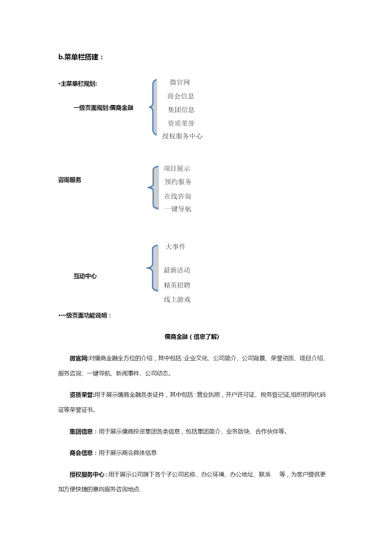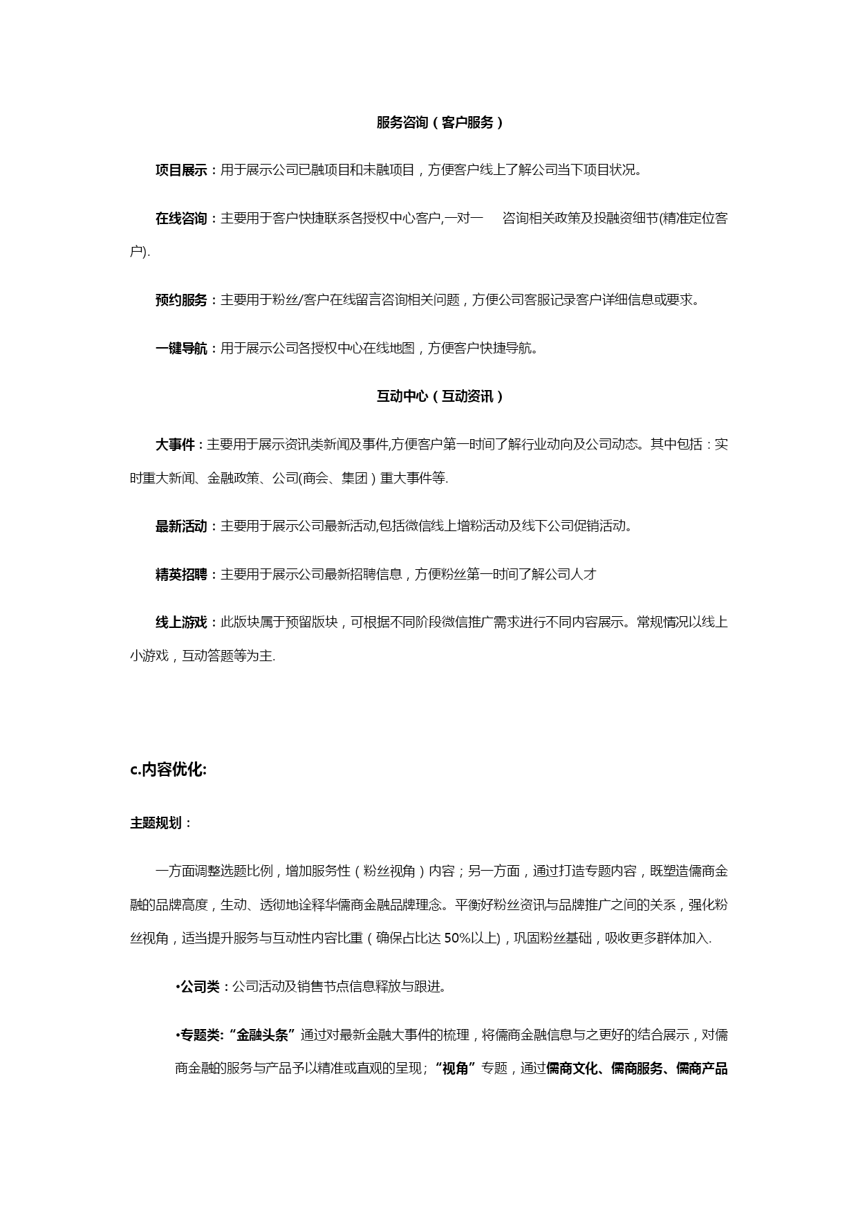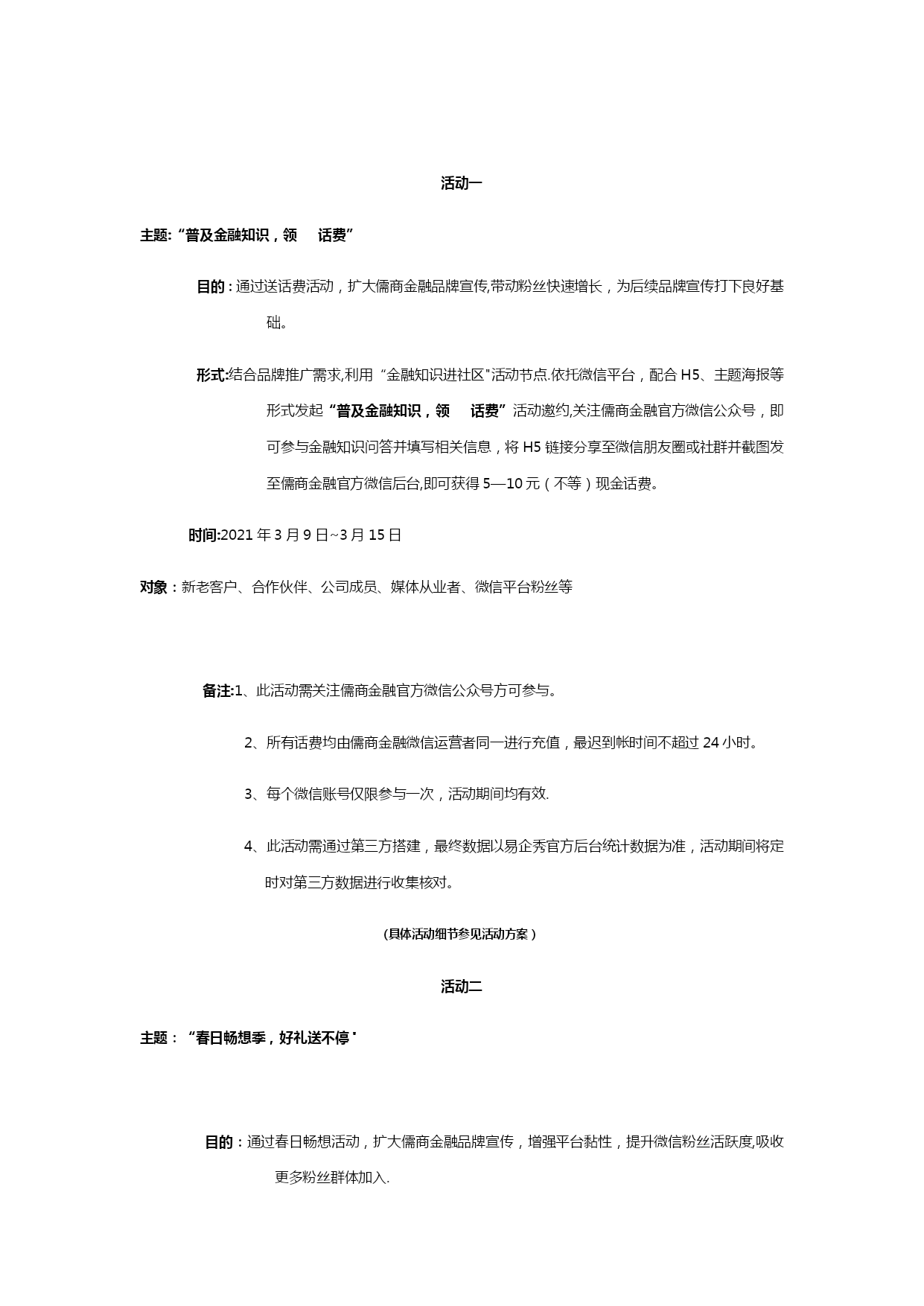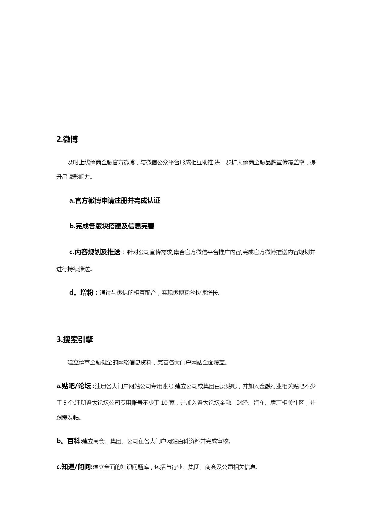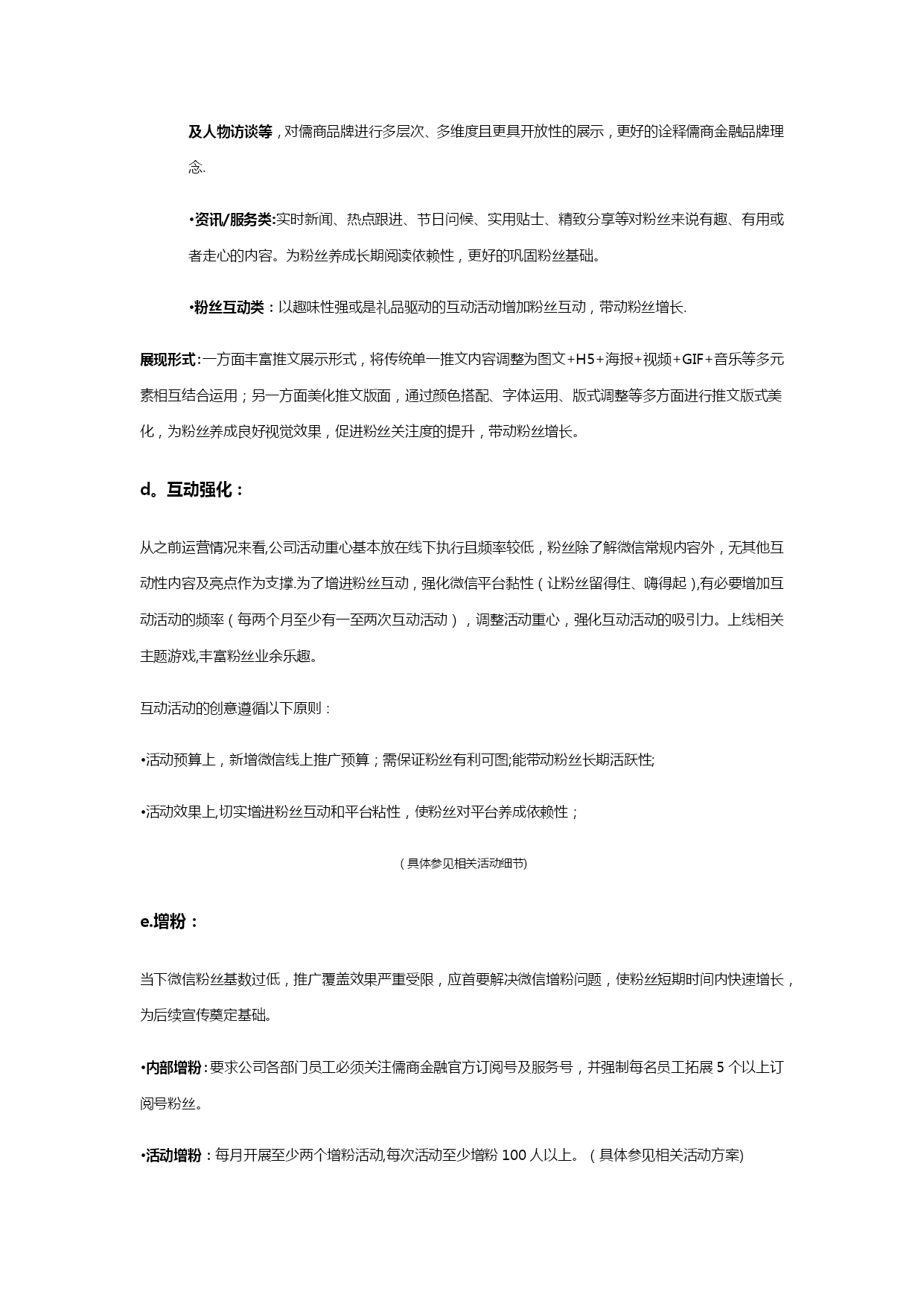 自媒体阶段性运营计划清单(可以直接使用,可编辑优秀版资料,欢迎下载)儒商金融自媒体运营阶段性计划现状分析1、微信截止2021年2月24日,儒商金融官方微信订阅号(新号)粉丝总量94人,累计发布稿件14篇,总阅读量382人次;其中发布主稿5篇,主稿平均阅读量37.8人次,主稿平均转发量2。5次.微信公众平台仍存在以下问题:a。粉丝基数较小,市场覆盖率较低,b。微信公众号功能不够健全,缺乏实质性服务c。没有常规性栏目作为展示亮点,文章推送频率过高,内容缺乏针对性、趣味性d.展现形式太过单一,排版过于简单,缺乏吸引力e.线下活动与线上缺乏强力配合,除简单推文配合外,缺乏线上吸引f。粉丝增长过慢,粉丝吸收率较低2、微博截止2021年2月29日,儒商金融尚未申请任何官方微博,缺乏与微信公众平台的相互配合.品牌宣传仍有较大的覆盖空间,应及时上线儒商金融官方微博,配合微信形成相互助推,进一步扩大品牌宣传覆盖面和传播率,提升儒商金融品牌影响力.3、搜索引擎截止2021年2月29日,百度、360、搜狗等浏览器除公司官网、招聘信息及部分事件性新闻外,论坛贴吧、百科、知道、问问、文库等均无公司、集团信息;部分关键词无公司排名或排名靠后等情况。应及时完善儒商金融网络信息的覆盖,优化关键词排名.其中包括:建立论坛贴吧、百科、知道、知乎、问问、文库等;各大视频门户网站视频覆盖等。工作重点与运营目标1。微信从儒商品牌传播角度,利用微信公众平台对现有客户及高质量粉丝群体进行针对性推广,从而促进儒商品牌传播渗透力度,提升儒商金融市场影响力.将重新梳理、搭建微信公众号菜单栏、欢迎词等界面信息本阶段将对官方微信平台进行重新梳理和规划,进一步提升儒商金融微信公众平台的活跃度和影响力,实现儒商金融公众账号“产品化运营”,更加充分地释放微信公众平台的价值。a.欢迎词等界面信息的更改和完善:针对新一轮微信推广需求,对微信公众平台欢迎词、快捷回复等内容进行调整和完善。b。菜单栏搭建:针对儒商金融官方微信公众平台功能需求,集合微信第三方技术平台,重新对微信公众平台菜单栏进行梳理规划和搭建,完善儒商金融线上线下的双重服务体系,构建方便、快捷、高效的服务渠道。c。内容优化:设定特色栏目,定期进行推送,强化对高质量粉丝的服务及新粉丝的吸收;加强稿件排版美化,丰富推送内容的展现形式;为粉丝养成长期阅读习惯及良好的阅读体验。d。互动强化:根据公司销售需求,精心策划系列跟品牌形象和理念适度相关的互动活动,并上线相关线上游戏,增进粉丝互动,提升微信平台黏性,强化对线上粉丝的管控。e.增粉:加强线上线下的相互转化及粉丝的快速吸收,促进粉丝快速增长。实现对潜在人群的全面覆盖。f。社群搭建:建立公司相关社群,方便公司活动推广宣传及客户咨询服务,并做好长期社群维护.微博及时上线儒商金融官方微博,与微信公众平台形成相互助推,进一步扩大儒商金融品牌宣传覆盖率,提升品牌影响力。官方微博申请注册并完成认证完成各版块搭建及信息完善c.内容规划及推送:针对公司宣传需求,集合官方微信平台推广内容,完成官方微博推送内容规划并进行持续推送。d。增粉:通过与微信的相互配合,实现微博粉丝快速增长.搜索引擎建立儒商金融健全的网络信息资料,完善各大门户网站全面覆盖。a.贴吧/论坛:注册各大门户网站公司专用账号,建立公司或集团百度贴吧,并加入金融行业相关贴吧不少于5个;注册各大论坛公司专用账号不少于10家,并加入各大论坛金融、财经、汽车、房产相关社区,并跟踪发帖。b。百科:建立商会、集团、公司在各大门户网站百科资料并完成审核。c.知道/问问:建立全面的知识问题库,包括与行业、集团、商会及公司相关信息.d。知乎:注册公司专用的知乎账号,建立与商会、集团、公司及行业相关知识体系.e.文库:建立各大文库网站公司公共信息资料库,其中包括百度文库、豆丁、道客巴巴等。f.视频:将与集团、商会、公司相关视频上传至各大视频门户网站,包括:爱奇艺、腾讯、优酷、乐视、芒果等。做到网络视频全面覆盖。三、运营计划本阶段将重点通过“微信"、“微博”和“网络”三方配合,实现儒商金融品牌影响力的再提升;强化儒商金融品牌渗透力。微信:a。欢迎词嘿,你总算来了,我一直等待的人!在这里,你将和一流的金融公司交流合作!在这里,你将第一时间了解金融大事件!在这里,你将找到最心意的投融资项目!在这里,你将有拿不完的神秘大礼!现在,将由你见证精彩!更多详情,敬请咨询儒商金融官方服务热线:400-6741—888回复数字1查看回复数字2进入回复数字3查看回复数字4b.菜单栏搭建:商会信息微官网·主菜单栏规划:资质荣誉集团信息一级页面规