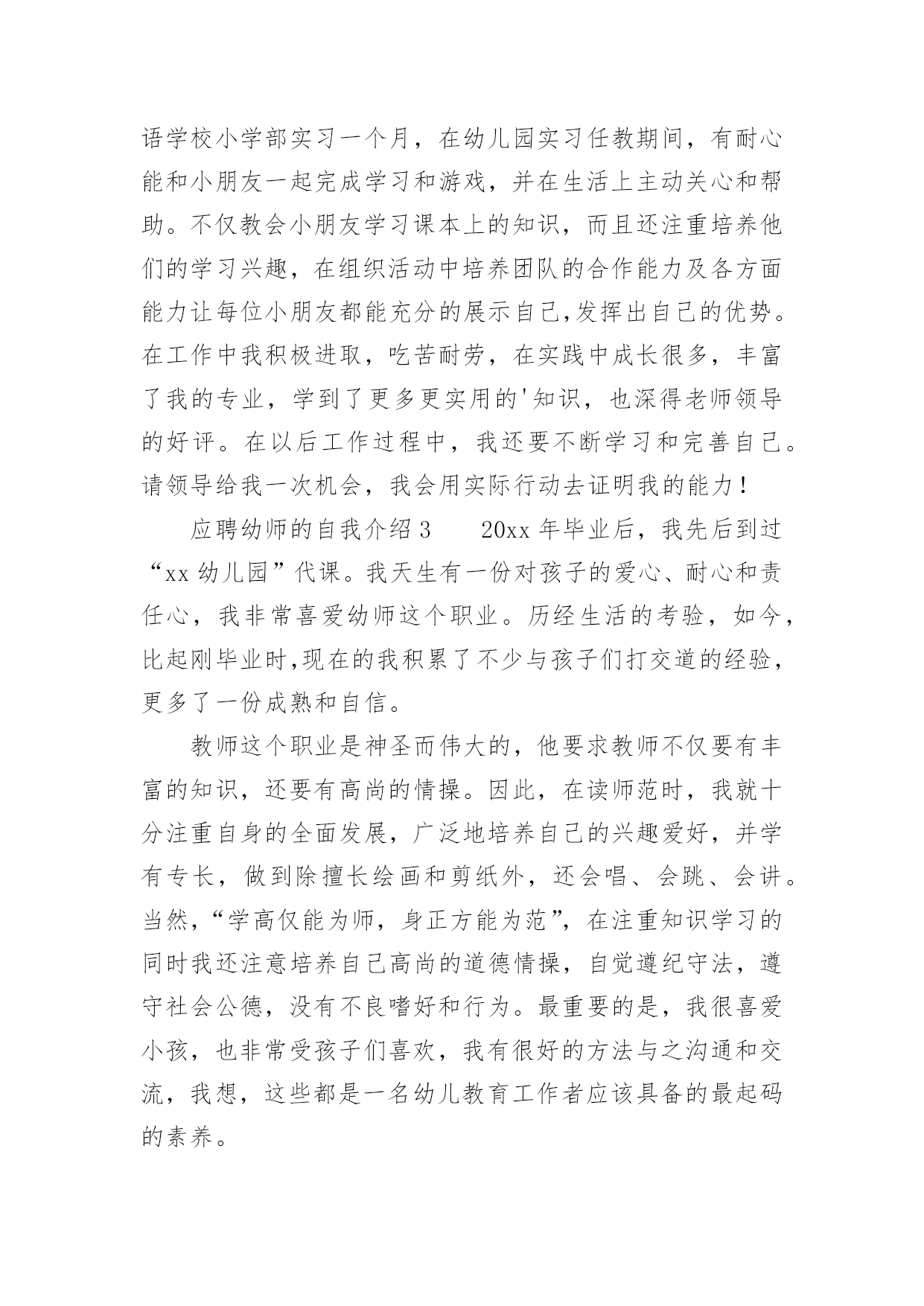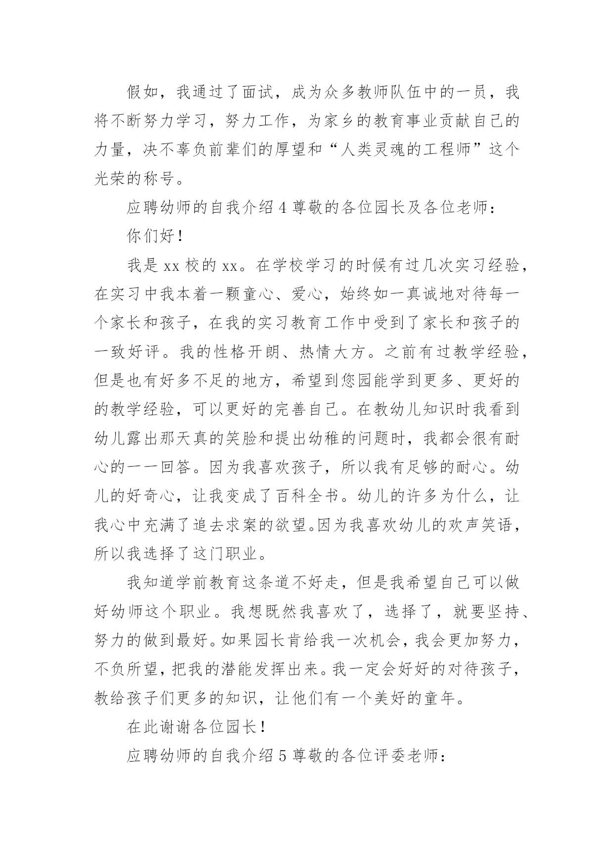 应聘幼师的自我介绍应聘幼师的自我介绍当换了一个新环境后,时常需要用到自我介绍,自我介绍是结识新朋友的重要手段。千万不能认为自我介绍随便应付就可以,下面是小编精心整理的应聘幼师的自我介绍,希望对大家有所帮助。应聘幼师的自我介绍1我叫xxx,来自美丽的海南少。性格开朗,形象可爱有一张娃娃脸,天生有一颗坦然,善良的心,在校专业技能良好,思想积极向上,通过几年来的学习,对幼教工作有了更大的信心,我热爱孩子,我的性格和年龄是我从事行业的优势,我想要找一份幼师的工作,毕竟这几年我一直学习学前教育专业,还是希望能成为一名优秀的幼儿教师,虽然我是应届毕业生,不过在之前我也去幼儿园实习过,工作过,就是想多增加个人的经验,总结怎样更好的使幼儿快乐的学习,怎样保护好幼儿等。希望给予幼儿的是最好的教育。希望您能给我一次机会,你将会看到一个更优秀的我。谢谢!应聘幼师的自我介绍2你们好,我叫李依依,我毕业于XX师范学院幼师专业,今年21岁,有爱心和责任心,对于不同阶段的幼儿,能针对小朋友因材施教。我先后在山东省南充市西华师范大学附属幼儿园、山东省名山县幼儿园和成都市盐道街外国语学校美乐国际幼稚园这三所幼儿园分别实习过一到两个月,后又在盐道街外国语学校小学部实习一个月,在幼儿园实习任教期间,有耐心能和小朋友一起完成学习和游戏,并在生活上主动关心和帮助。不仅教会小朋友学习课本上的知识,而且还注重培养他们的学习兴趣,在组织活动中培养团队的合作能力及各方面能力让每位小朋友都能充分的展示自己,发挥出自己的优势。在工作中我积极进取,吃苦耐劳,在实践中成长很多,丰富了我的专业,学到了更多更实用的'知识,也深得老师领导的好评。在以后工作过程中,我还要不断学习和完善自己。请领导给我一次机会,我会用实际行动去证明我的能力!应聘幼师的自我介绍320xx年毕业后,我先后到过“xx幼儿园”代课。我天生有一份对孩子的爱心、耐心和责任心,我非常喜爱幼师这个职业。历经生活的考验,如今,比起刚毕业时,现在的我积累了不少与孩子们打交道的经验,更多了一份成熟和自信。教师这个职业是神圣而伟大的,他要求教师不仅要有丰富的知识,还要有高尚的情操。因此,在读师范时,我就十分注重自身的全面发展,广泛地培养自己的兴趣爱好,并学有专长,做到除擅长绘画和剪纸外,还会唱、会跳、会讲。当然,“学高仅能为师,身正方能为范”,在注重知识学习的同时我还注意培养自己高尚的道德情操,自觉遵纪守法,遵守社会公德,没有不良嗜好和行为。最重要的是,我很喜爱小孩,也非常受孩子们喜欢,我有很好的方法与之沟通和交流,我想,这些都是一名幼儿教育工作者应该具备的最起码的素养。假如,我通过了面试,成为众多教师队伍中的一员,我将不断努力学习,努力工作,为家乡的教育事业贡献自己的力量,决不辜负前辈们的厚望和“人类灵魂的工程师”这个光荣的称号。应聘幼师的自我介绍4尊敬的各位园长及各位老师:你们好!我是xx校的xx。在学校学习的时候有过几次实习经验,在实习中我本着一颗童心、爱心,始终如一真诚地对待每一个家长和孩子,在我的实习教育工作中受到了家长和孩子的一致好评。我的性格开朗、热情大方。之前有过教学经验,但是也有好多不足的地方,希望到您园能学到更多、更好的的教学经验,可以更好的完善自己。在教幼儿知识时我看到幼儿露出那天真的笑脸和提出幼稚的问题时,我都会很有耐心的一一回答。因为我喜欢孩子,所以我有足够的耐心。幼儿的好奇心,让我变成了百科全书。幼儿的许多为什么,让我心中充满了追去求案的欲望。因为我喜欢幼儿的欢声笑语,所以我选择了这门职业。我知道学前教育这条道不好走,但是我希望自己可以做好幼师这个职业。我想既然我喜欢了,选择了,就要坚持、努力的做到最好。如果园长肯给我一次机会,我会更加努力,不负所望,把我的潜能发挥出来。我一定会好好的对待孩子,教给孩子们更多的知识,让他们有一个美好的童年。在此谢谢各位园长!应聘幼师的自我介绍5尊敬的各位评委老师:上午好!今天很荣幸能来到这里参加面试,同时也非常感谢贵院给予我这次面试的机会!我叫,就读于湖南师大医学院,是高护专业的学习教育者!在学校几年的学习期间,表现良好,成绩优异,充分掌握了护理专业的各项基础理论知识,并且一次性的通过了全国英语四级和公共营养师三级的考试,同时能熟练的运用计算机的各项基本操作技能!在三年的学习期间让我清晰的认识到护理学是一门应用学科,有很强的实践性,结合了自然科学与社会科学的理论体系,形成了护理的基础理论和操作技能!我很崇拜南丁格尔,她“燃烧自己,照亮别人”的精神和用爱心、细心、耐心、责任心照顾每一位病人的工作态度,让我毅然的选择了护理这一门行业,同时也成为我从事护理事业的学习目标和对待工作的态度,在我心中深深扎下了对这一岗位的执着与无限热爱!我愿尽微薄的力量协助医生帮助患者及其家属减