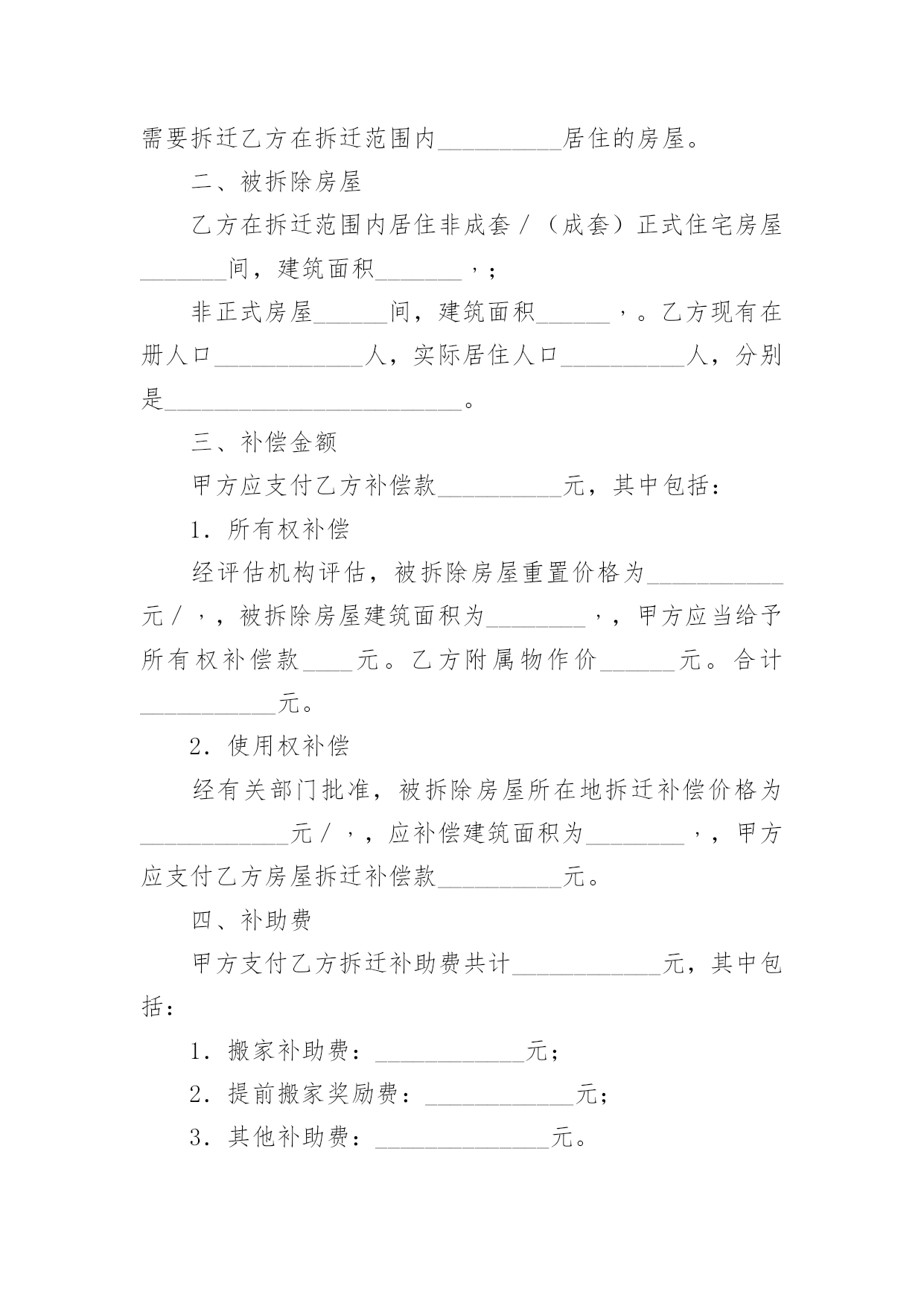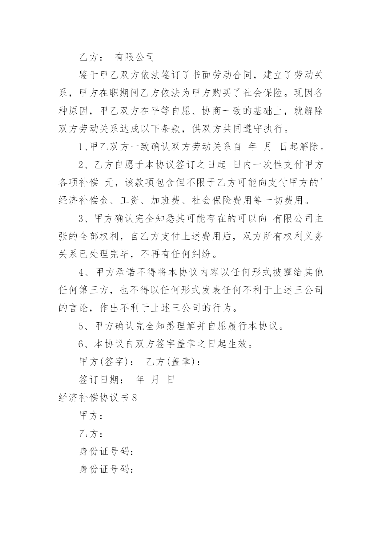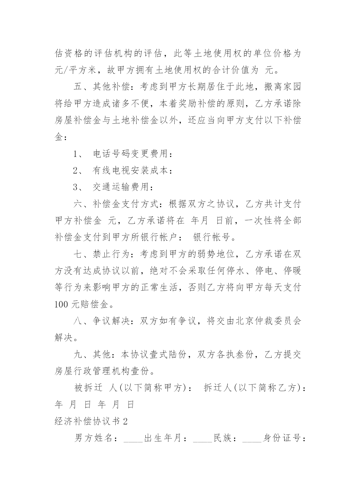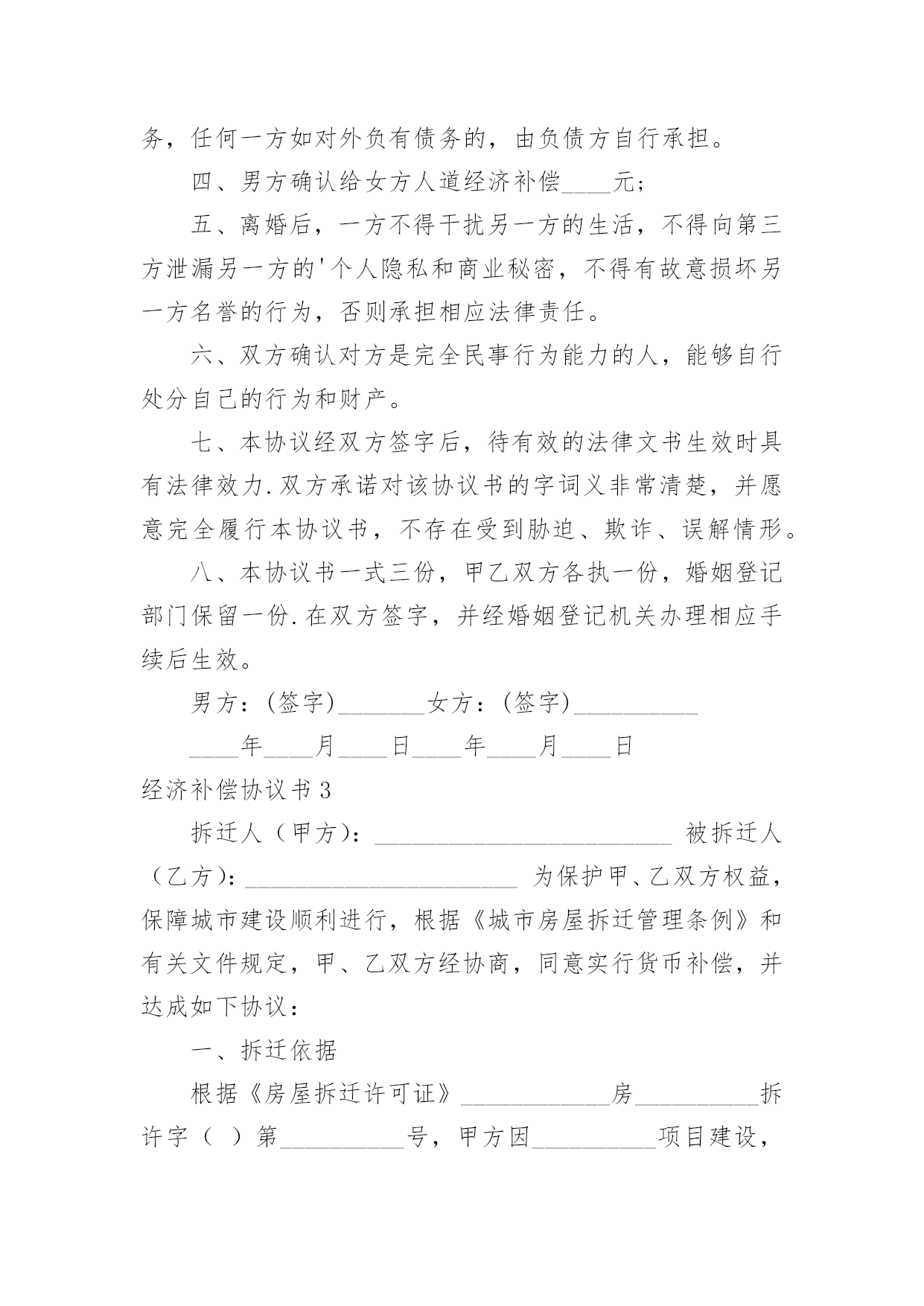 经济补偿协议书经济补偿协议书13篇现如今,协议与我们的生活息息相关,签订签订协议是最有效的法律依据之一。想写协议却不知道该请教谁?下面是小编收集整理的经济补偿协议书,欢迎阅读,希望大家能够喜欢。经济补偿协议书1被拆迁人(以下简称甲方):拆迁人(以下简称乙方):根据《民法通则》、《合同法》和《土地管理法》的有关规定,双方本着平等自愿的原则,就拆迁补偿一事达成如下协议:一、被拆迁人情况:甲方目前家庭成员共有名,其分别为(男)、(女)二、拆迁人情况:乙方根据我国有关法律已经取得拆迁人资格证,乙方承诺将依法与甲方就拆迁补偿情况达成协议。三、房屋补偿:甲方目前所有房屋的建筑面积为平方米,其中包括套内建筑面积平方米、公摊建筑面积平方米;经过双方共同委托具备房地产评估资格的评估机构的评估,此等房屋所有权的`单位价格为元/平方米,故甲方拥有房屋所有权的合计价值为元。四、土地补偿:甲方目前房屋所占土地共有平方米,其中甲方享有专有土地使用权的有平方米,甲方与其他人共有土地使用权的有平方米;经过双方共同委托具备房地产评估资格的评估机构的评估,此等土地使用权的单位价格为元/平方米,故甲方拥有土地使用权的合计价值为元。五、其他补偿:考虑到甲方长期居住于此地,搬离家园将给甲方造成诸多不便,本着奖励补偿的原则,乙方承诺除房屋补偿金与土地补偿金以外,还应当向甲方支付以下补偿金:1、电话号码变更费用:2、有线电视安装成本:3、交通运输费用:六、补偿金支付方式:根据双方之协议,乙方共计支付甲方补偿金元,乙方承诺将在年月日前,一次性将全部补偿金支付到甲方所银行帐户:银行帐号。七、禁止行为:考虑到甲方的弱势地位,乙方承诺在双方没有达成协议以前,绝对不会采取任何停水、停电、停暖等行为来影响甲方的正常生活,否则乙方将向甲方每天支付100元赔偿金。八、争议解决:双方如有争议,将交由北京仲裁委员会解决。九、其他:本协议壹式陆份,双方各执叁份,乙方提交房屋行政管理机构壹份。被拆迁人(以下简称甲方):拆迁人(以下简称乙方):年月日年月日经济补偿协议书2男方姓名:____出生年月:____民族:____身份证号:________住址:________女方姓名:____出生年月:____民族:____身份证号:________住址:________双方于____年____月____日在____区民政局办理了结婚登记手续。(结婚证号码:________),并生有一名婚生子,________年________月________日出生)现因双方性格不合无法共同生活,夫妻感情已完全破裂,无和好的可能,就自愿离婚一事达成如下协议:一、双方自愿解除夫妻关系。二、婚生女(子)____由____方直接抚养,抚养期间,____方承担婚生子的抚养费(包括医疗费、教育费、保险费)。____方每个月可以探望婚生子____次,但应提前通知抚养孩子一方,____方有协助的义务;探望权的行使以不影响学业为准。任何一方对婚生女身心健康有损害行为的,将视为放弃抚养、教育的权利和义务,另一方有权要求变更直接抚养权或中止、取消探望权;三、财产分割(1)双方认可婚后分开居住期间各自收入归各自所有的约定;双方认可婚后个人随身物品归个人所有。个人随身物品中包含衣物、首饰、个人用品、手机、化妆品等个人物品。(2)女方自离婚证领取之日起,取得下列夫妻之间共同财产的所有权:彩电一台、冰箱一台、洗衣机一台。(3)双方确认在婚姻关系存续期间没有发生任何共同债务,任何一方如对外负有债务的,由负债方自行承担。四、男方确认给女方人道经济补偿____元;五、离婚后,一方不得干扰另一方的生活,不得向第三方泄漏另一方的'个人隐私和商业秘密,不得有故意损坏另一方名誉的行为,否则承担相应法律责任。六、双方确认对方是完全民事行为能力的人,能够自行处分自己的行为和财产。七、本协议经双方签字后,待有效的法律文书生效时具有法律效力.双方承诺对该协议书的字词义非常清楚,并愿意完全履行本协议书,不存在受到胁迫、欺诈、误解情形。八、本协议书一式三份,甲乙双方各执一份,婚姻登记部门保留一份.在双方签字,并经婚姻登记机关办理相应手续后生效。男方:(签字)_______女方:(签字)______________年____月____日____年____月____日经济补偿协议书3拆迁人(甲方):________________________被拆迁人(乙方):______________________为保护甲、乙双方权益,保障城市建设顺利进行,根据《城市房屋拆迁管理条例》和有关文件规定,甲、乙双方经协商,同意实行货币补偿,并达成如下协议:一、拆迁依据根据《房屋拆迁许可证》____________房__________拆许字()第__________号,甲方因____