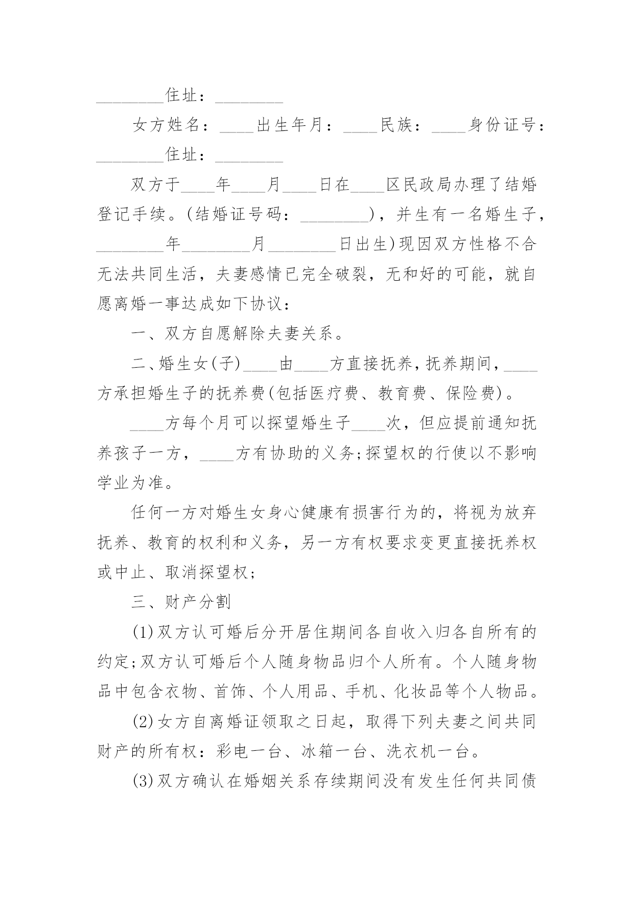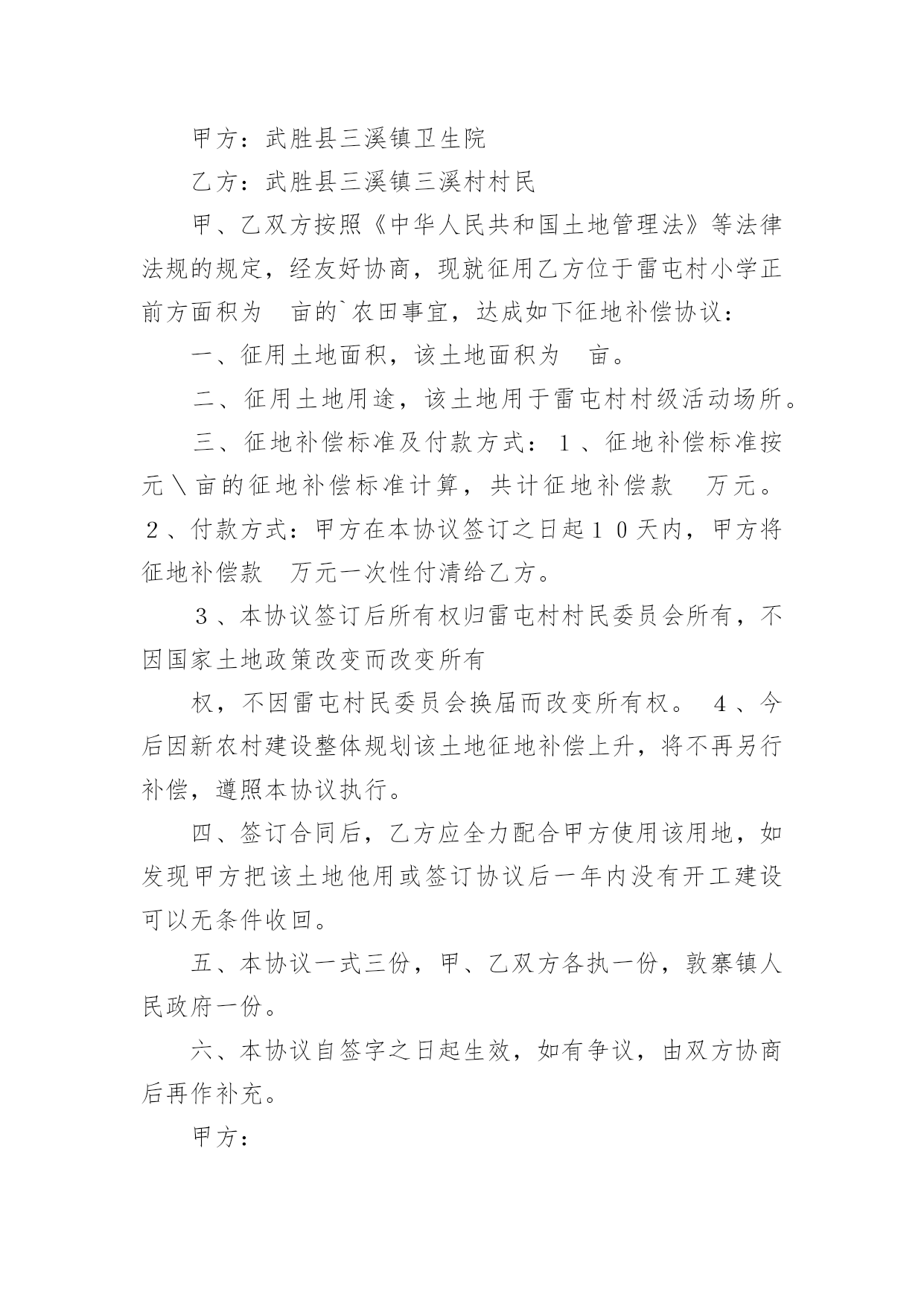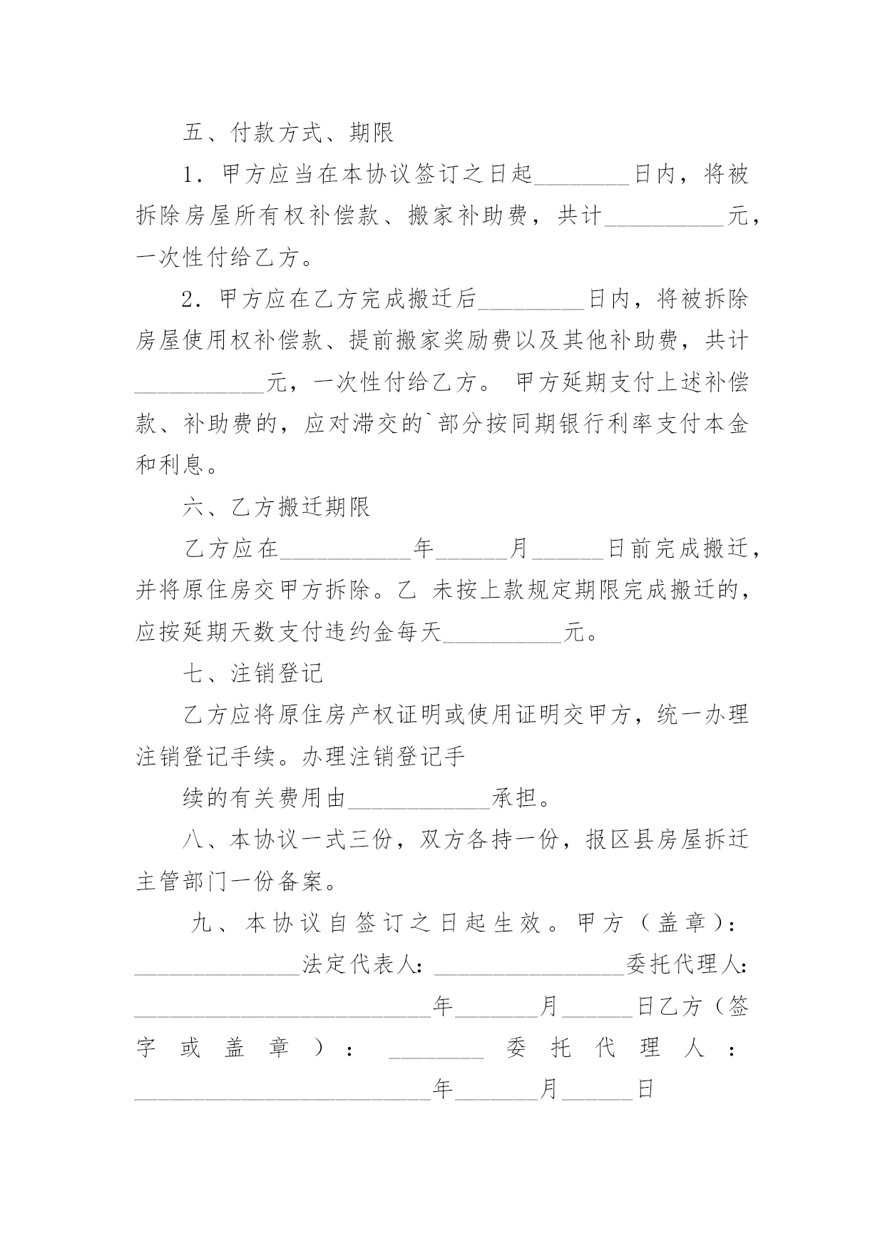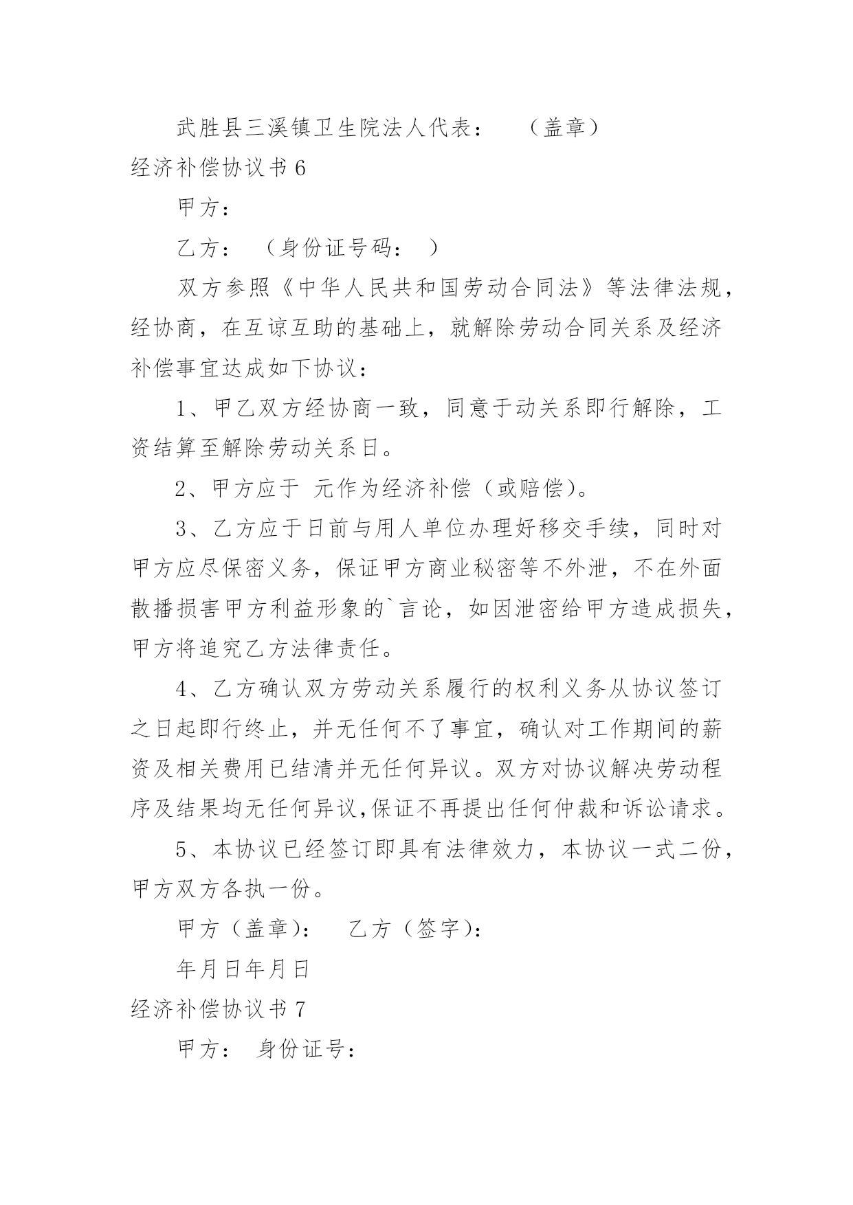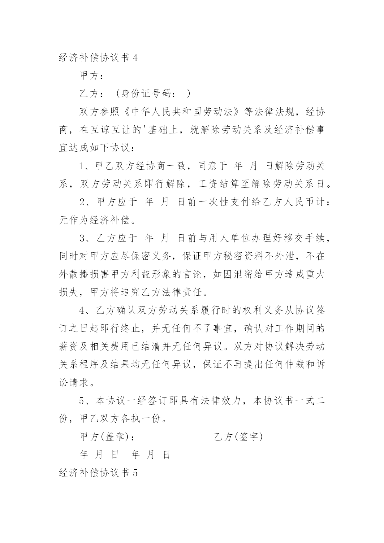 经济补偿协议书经济补偿协议书13篇现如今,协议与我们的生活息息相关,签订签订协议是最有效的法律依据之一。想写协议却不知道该请教谁?下面是小编收集整理的经济补偿协议书,欢迎阅读,希望大家能够喜欢。经济补偿协议书1被拆迁人(以下简称甲方):拆迁人(以下简称乙方):根据《民法通则》、《合同法》和《土地管理法》的有关规定,双方本着平等自愿的原则,就拆迁补偿一事达成如下协议:一、被拆迁人情况:甲方目前家庭成员共有名,其分别为(男)、(女)二、拆迁人情况:乙方根据我国有关法律已经取得拆迁人资格证,乙方承诺将依法与甲方就拆迁补偿情况达成协议。三、房屋补偿:甲方目前所有房屋的建筑面积为平方米,其中包括套内建筑面积平方米、公摊建筑面积平方米;经过双方共同委托具备房地产评估资格的评估机构的评估,此等房屋所有权的`单位价格为元/平方米,故甲方拥有房屋所有权的合计价值为元。四、土地补偿:甲方目前房屋所占土地共有平方米,其中甲方享有专有土地使用权的有平方米,甲方与其他人共有土地使用权的有平方米;经过双方共同委托具备房地产评估资格的评估机构的评估,此等土地使用权的单位价格为元/平方米,故甲方拥有土地使用权的合计价值为元。五、其他补偿:考虑到甲方长期居住于此地,搬离家园将给甲方造成诸多不便,本着奖励补偿的原则,乙方承诺除房屋补偿金与土地补偿金以外,还应当向甲方支付以下补偿金:1、电话号码变更费用:2、有线电视安装成本:3、交通运输费用:六、补偿金支付方式:根据双方之协议,乙方共计支付甲方补偿金元,乙方承诺将在年月日前,一次性将全部补偿金支付到甲方所银行帐户:银行帐号。七、禁止行为:考虑到甲方的弱势地位,乙方承诺在双方没有达成协议以前,绝对不会采取任何停水、停电、停暖等行为来影响甲方的正常生活,否则乙方将向甲方每天支付100元赔偿金。八、争议解决:双方如有争议,将交由北京仲裁委员会解决。九、其他:本协议壹式陆份,双方各执叁份,乙方提交房屋行政管理机构壹份。被拆迁人(以下简称甲方):拆迁人(以下简称乙方):年月日年月日经济补偿协议书2男方姓名:____出生年月:____民族:____身份证号:________住址:________女方姓名:____出生年月:____民族:____身份证号:________住址:________双方于____年____月____日在____区民政局办理了结婚登记手续。(结婚证号码:________),并生有一名婚生子,________年________月________日出生)现因双方性格不合无法共同生活,夫妻感情已完全破裂,无和好的可能,就自愿离婚一事达成如下协议:一、双方自愿解除夫妻关系。二、婚生女(子)____由____方直接抚养,抚养期间,____方承担婚生子的抚养费(包括医疗费、教育费、保险费)。____方每个月可以探望婚生子____次,但应提前通知抚养孩子一方,____方有协助的义务;探望权的行使以不影响学业为准。任何一方对婚生女身心健康有损害行为的,将视为放弃抚养、教育的权利和义务,另一方有权要求变更直接抚养权或中止、取消探望权;三、财产分割(1)双方认可婚后分开居住期间各自收入归各自所有的约定;双方认可婚后个人随身物品归个人所有。个人随身物品中包含衣物、首饰、个人用品、手机、化妆品等个人物品。(2)女方自离婚证领取之日起,取得下列夫妻之间共同财产的所有权:彩电一台、冰箱一台、洗衣机一台。(3)双方确认在婚姻关系存续期间没有发生任何共同债务,任何一方如对外负有债务的,由负债方自行承担。四、男方确认给女方人道经济补偿____元;五、离婚后,一方不得干扰另一方的生活,不得向第三方泄漏另一方的'个人隐私和商业秘密,不得有故意损坏另一方名誉的行为,否则承担相应法律责任。六、双方确认对方是完全民事行为能力的人,能够自行处分自己的行为和财产。七、本协议经双方签字后,待有效的法律文书生效时具有法律效力.双方承诺对该协议书的字词义非常清楚,并愿意完全履行本协议书,不存在受到胁迫、欺诈、误解情形。八、本协议书一式三份,甲乙双方各执一份,婚姻登记部门保留一份.在双方签字,并经婚姻登记机关办理相应手续后生效。男方:(签字)_______女方:(签字)______________年____月____日____年____月____日经济补偿协议书3拆迁人(甲方):________________________被拆迁人(乙方):______________________为保护甲、乙双方权益,保障城市建设顺利进行,根据《城市房屋拆迁管理条例》和有关文件规定,甲、乙双方经协商,同意实行货币补偿,并达成如下协议:一、拆迁依据根据《房屋拆迁许可证》____________房__________拆许字()第__________号,甲方因____