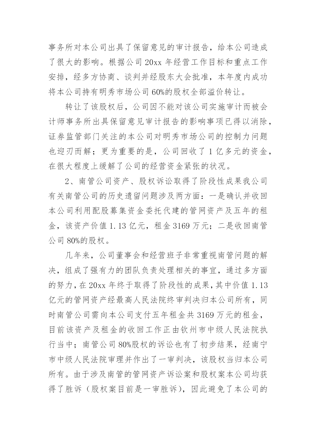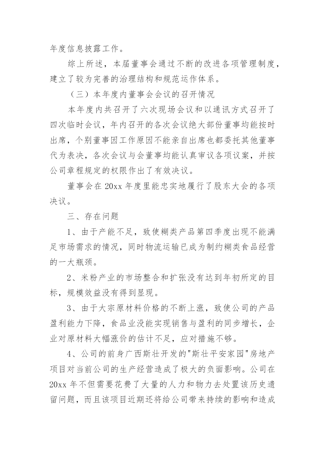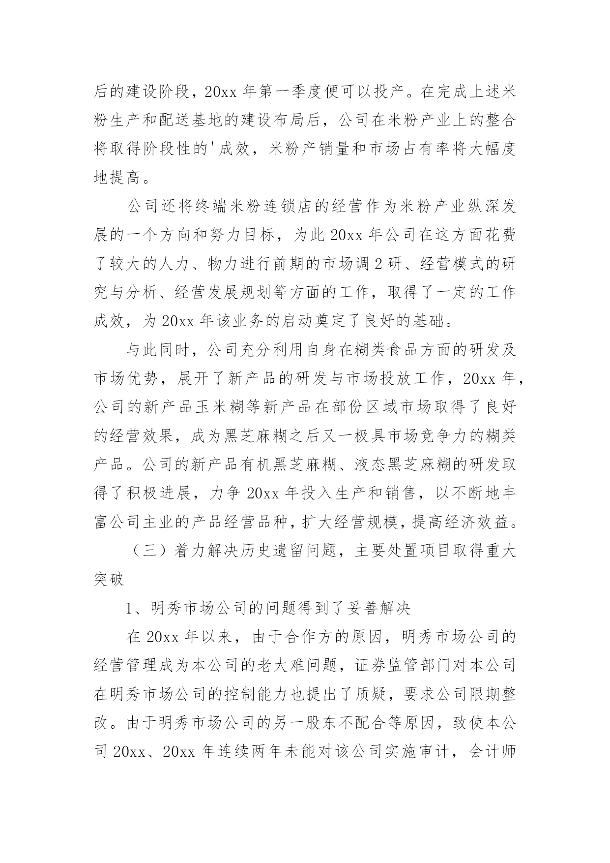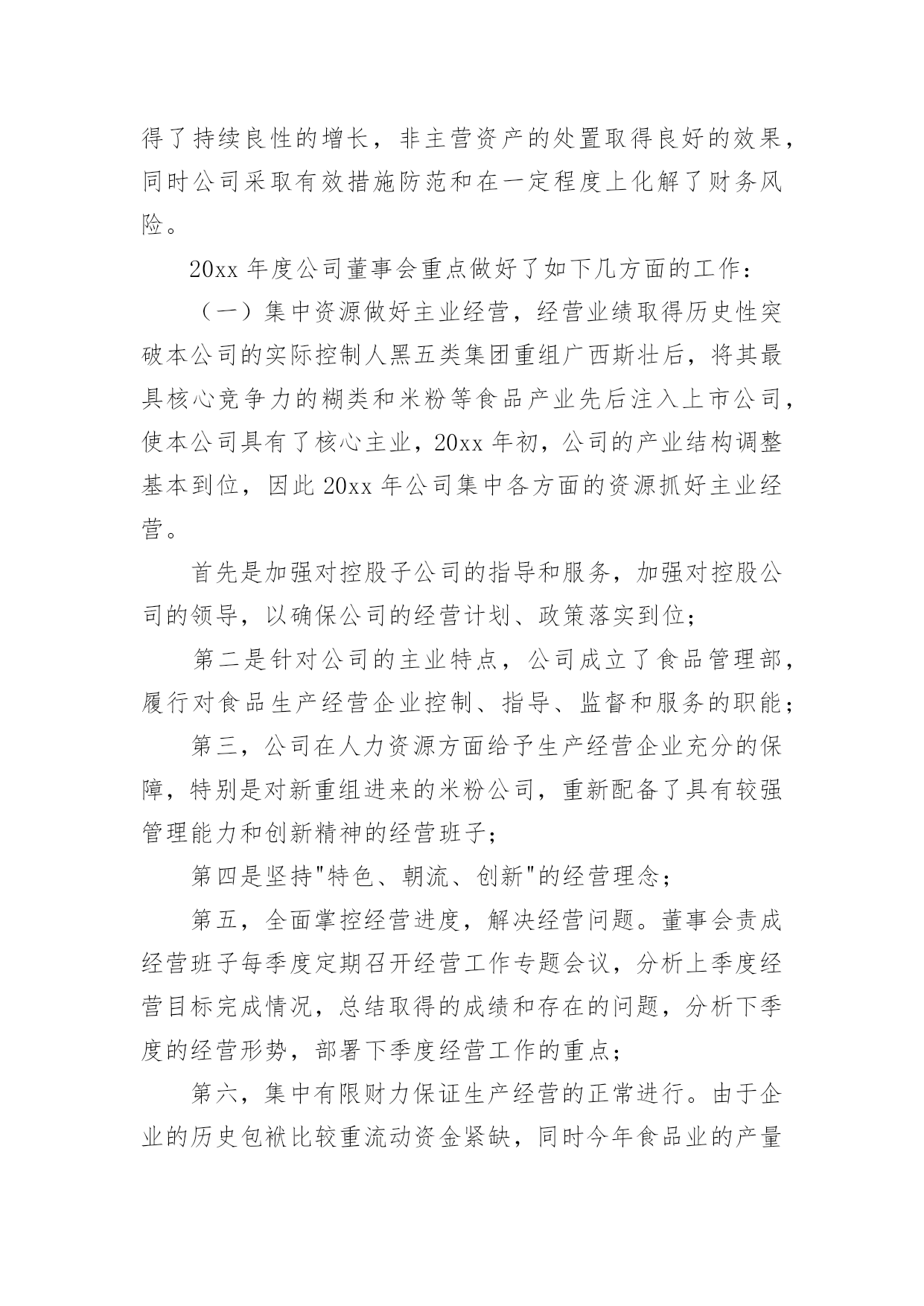 董事会工作报告优秀董事会工作报告优秀在学习、工作生活中,需要使用报告的情况越来越多,报告根据用途的不同也有着不同的类型。你知道怎样写报告才能写的好吗?以下是小编为大家整理的董事会工作报告优秀,希望对大家有所帮助。一年来,公司董事会认真履行《公司法》和《公司章程》等法律、法规赋予的职责,严格执行股东大会决议;全体董事在20xx年里,认真负责、勤勉尽职,为公司董事会的科学决策和规范运作做了大量的工作。一、20xx年的主要工作及取得的成绩20xx年是我公司发展历史上具有重要意义的一年,在这一年当中,公司治理不断规范,管理改革进一步深化,产业整合效果明显,核心主营业务经营取得持续增长,主要的历史遗留问题得以顺利解决,公司的基本面发生了根本性的转变,一举扭转了连续两年亏损的局面,为公司的加速发展、做强做大奠定了良好的基础。公司20xx年度实现营业收入29585.64元,比上年同期增长54.18%,实现营业利润2338.29万元,比上年同期增长451.91%,实现净利润567.62万元,比上年同期增长946.23%。与上年度相比,公司的整体经营取得了较大的成绩,主要原因在于公司以食品业为主的主营业务经营业绩取得了持续良性的增长,非主营资产的处置取得良好的效果,同时公司采取有效措施防范和在一定程度上化解了财务风险。20xx年度公司董事会重点做好了如下几方面的工作:(一)集中资源做好主业经营,经营业绩取得历史性突破本公司的实际控制人黑五类集团重组广西斯壮后,将其最具核心竞争力的糊类和米粉等食品产业先后注入上市公司,使本公司具有了核心主业,20xx年初,公司的产业结构调整基本到位,因此20xx年公司集中各方面的资源抓好主业经营。首先是加强对控股子公司的指导和服务,加强对控股公司的领导,以确保公司的经营计划、政策落实到位;第二是针对公司的主业特点,公司成立了食品管理部,履行对食品生产经营企业控制、指导、监督和服务的职能;第三,公司在人力资源方面给予生产经营企业充分的保障,特别是对新重组进来的米粉公司,重新配备了具有较强管理能力和创新精神的经营班子;第四是坚持"特色、朝流、创新"的经营理念;第五,全面掌控经营进度,解决经营问题。董事会责成经营班子每季度定期召开经营工作专题会议,分析上季度经营目标完成情况,总结取得的成绩和存在的问题,分析下季度的经营形势,部署下季度经营工作的重点;第六,集中有限财力保证生产经营的正常进行。由于企业的历史包袱比较重流动资金紧缺,同时今年食品业的产量创下历史新高,加上今年大米、黑芝麻等大宗原料的价格大幅上涨,因此整个企业对经营资金的需求量激增,资金缺口很大,但是为了保证公司生产经营的正常进行,公司不断压缩非经营性的资金开支,集中有限的财力保证经营资金的正常需求。第七,设法为经营做好服务。公司提出以经营为中心、努力服务经营、一切服从市场的经营指导思想,要求公司各岗位各员工都要为经营工作做好各方面的服务;第八,实现营销管理下沉,着力开发二、三级城市市场。由于采取了以上措施,因此公司的主业食品业经营全年取得了比较好的水平,全年度出现产销两旺,且糊类食品第四季度出现供不应求的良好局面。(二)培育新的经济增长点,新产业增长形势喜人米粉产业是公司20xx年乃至今后一段时期内着力发展的一个新的主营产业,目标是将其培育成公司新的经营和利润增长点。米粉在我国南方地区是一种大众化的消费食品,存在着巨大的市场容量,仅公司所在的广西市场年消费量就达10亿元以上,未来公司如能充分利用自身的资源、技术、品牌等各方面的优势重新整合这个产业,提高市场的占有率,那么对该产业的投资将会给公司带来丰厚的回报。为此,公司在20xx年初就完成了xx米粉有限责任公司的收购,并随后在广西区内的宾阳、横县、百色等地建立了生产基地,在桂林、柳州、贺州、梧州、贵港、容县等地展开了生产基地的筹建工作,云南省昆明南方米粉有限公司米粉生产线也进入了最后的建设阶段,20xx年第一季度便可以投产。在完成上述米粉生产和配送基地的建设布局后,公司在米粉产业上的整合将取得阶段性的'成效,米粉产销量和市场占有率将大幅度地提高。公司还将终端米粉连锁店的经营作为米粉产业纵深发展的一个方向和努力目标,为此20xx年公司在这方面花费了较大的人力、物力进行前期的市场调2研、经营模式的研究与分析、经营发展规划等方面的工作,取得了一定的工作成效,为20xx年该业务的启动奠定了良好的基础。与此同时,公司充分利用自身在糊类食品方面的研发及市场优势,展开了新产品的研发与市场投放工作,20xx年,公司的新产品玉米糊等新产品在部份区域市场取得了良好的经营效果,成为黑芝麻糊之后又一极具市场竞争力的糊类产品。公司的新产品有机黑芝麻糊、液态黑芝麻糊的研发取得了积极进展,力争20xx年投入生产和销售,以不断地丰富公司