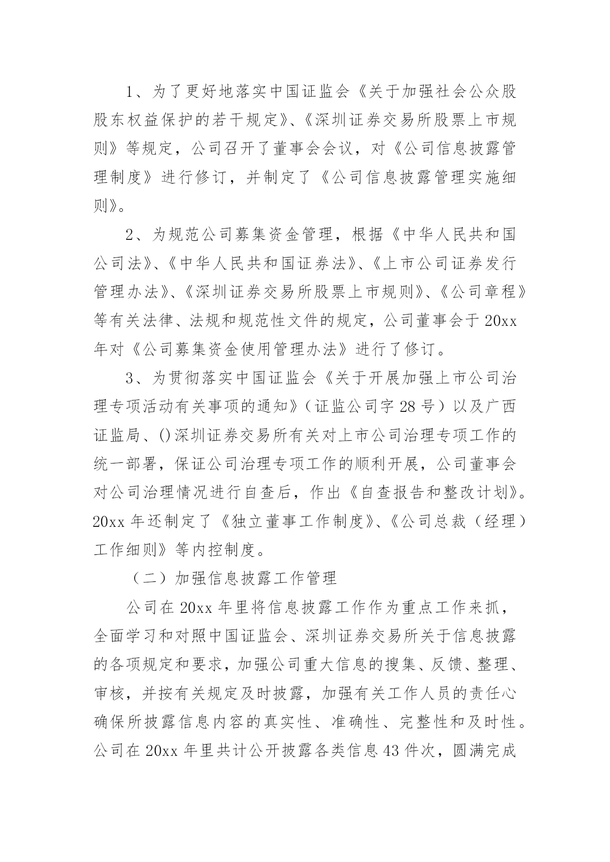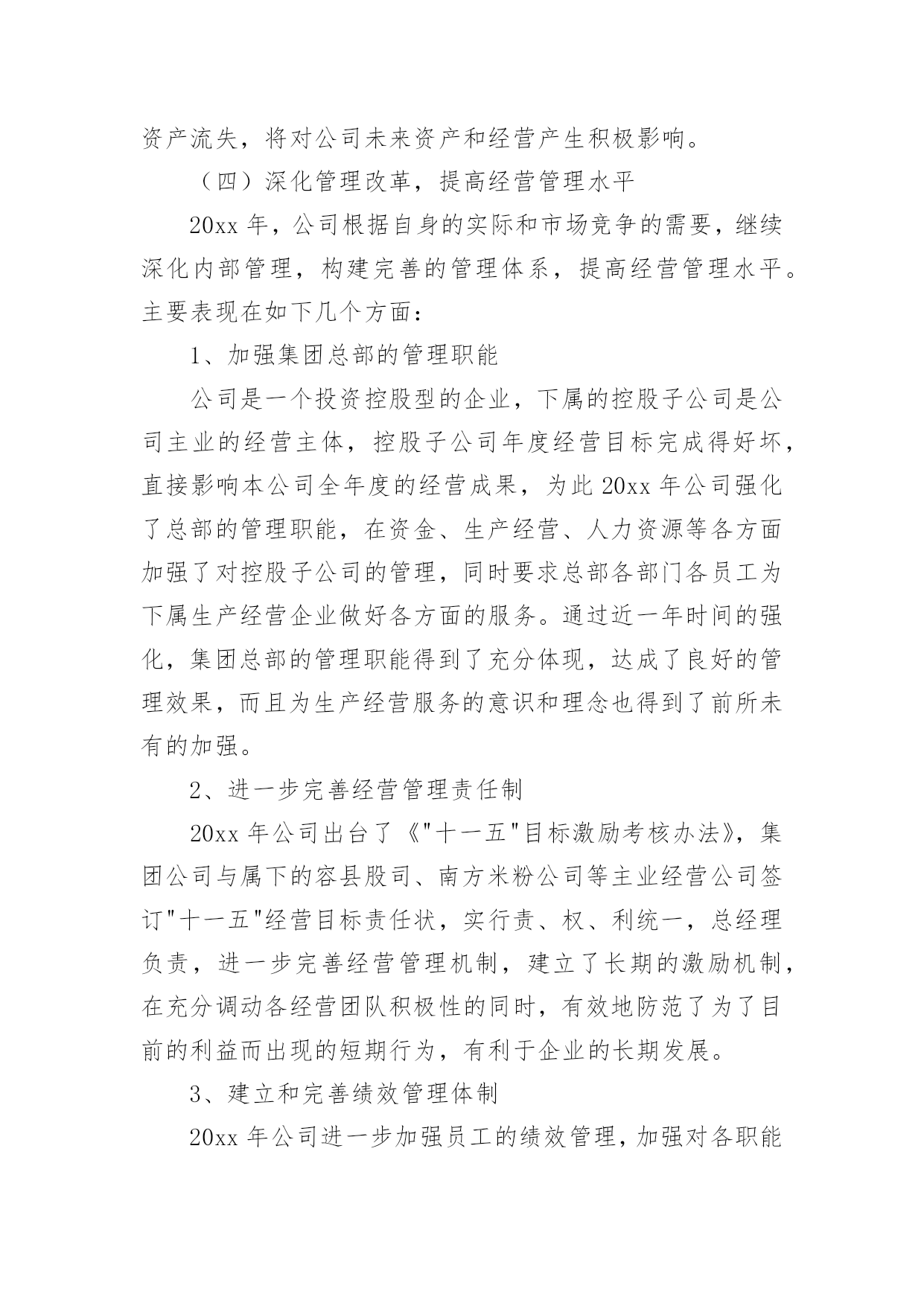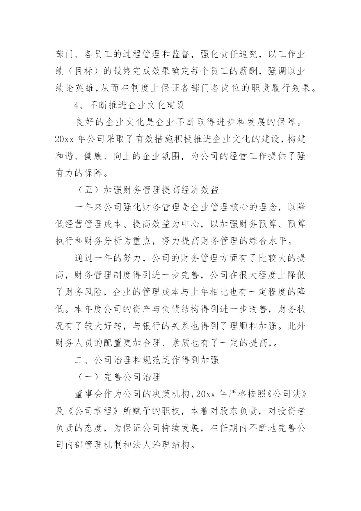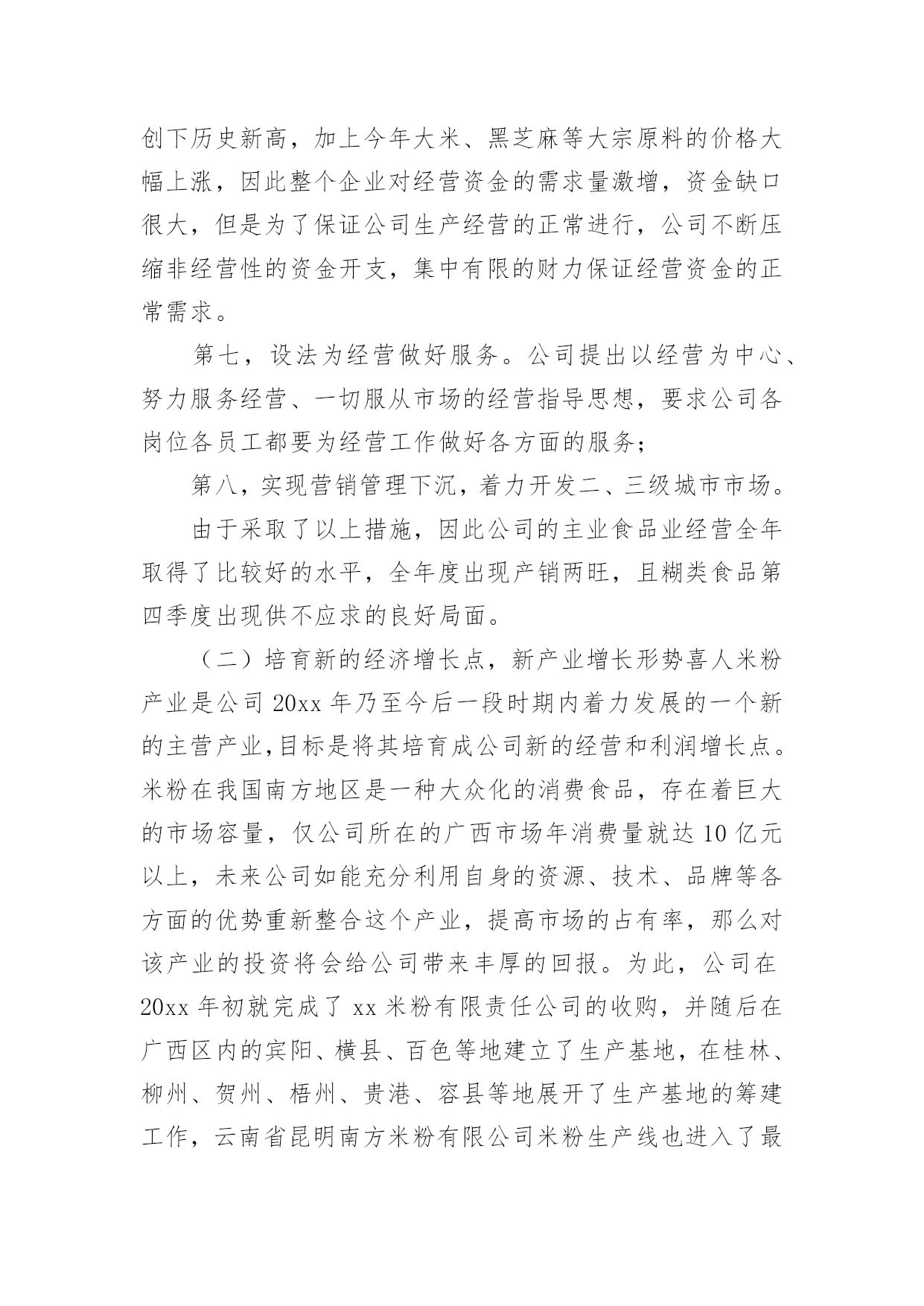 董事会工作报告优秀董事会工作报告优秀在学习、工作生活中,需要使用报告的情况越来越多,报告根据用途的不同也有着不同的类型。你知道怎样写报告才能写的好吗?以下是小编为大家整理的董事会工作报告优秀,希望对大家有所帮助。一年来,公司董事会认真履行《公司法》和《公司章程》等法律、法规赋予的职责,严格执行股东大会决议;全体董事在20xx年里,认真负责、勤勉尽职,为公司董事会的科学决策和规范运作做了大量的工作。一、20xx年的主要工作及取得的成绩20xx年是我公司发展历史上具有重要意义的一年,在这一年当中,公司治理不断规范,管理改革进一步深化,产业整合效果明显,核心主营业务经营取得持续增长,主要的历史遗留问题得以顺利解决,公司的基本面发生了根本性的转变,一举扭转了连续两年亏损的局面,为公司的加速发展、做强做大奠定了良好的基础。公司20xx年度实现营业收入29585.64元,比上年同期增长54.18%,实现营业利润2338.29万元,比上年同期增长451.91%,实现净利润567.62万元,比上年同期增长946.23%。与上年度相比,公司的整体经营取得了较大的成绩,主要原因在于公司以食品业为主的主营业务经营业绩取得了持续良性的增长,非主营资产的处置取得良好的效果,同时公司采取有效措施防范和在一定程度上化解了财务风险。20xx年度公司董事会重点做好了如下几方面的工作:(一)集中资源做好主业经营,经营业绩取得历史性突破本公司的实际控制人黑五类集团重组广西斯壮后,将其最具核心竞争力的糊类和米粉等食品产业先后注入上市公司,使本公司具有了核心主业,20xx年初,公司的产业结构调整基本到位,因此20xx年公司集中各方面的资源抓好主业经营。首先是加强对控股子公司的指导和服务,加强对控股公司的领导,以确保公司的经营计划、政策落实到位;第二是针对公司的主业特点,公司成立了食品管理部,履行对食品生产经营企业控制、指导、监督和服务的职能;第三,公司在人力资源方面给予生产经营企业充分的保障,特别是对新重组进来的米粉公司,重新配备了具有较强管理能力和创新精神的经营班子;第四是坚持"特色、朝流、创新"的经营理念;第五,全面掌控经营进度,解决经营问题。董事会责成经营班子每季度定期召开经营工作专题会议,分析上季度经营目标完成情况,总结取得的成绩和存在的问题,分析下季度的经营形势,部署下季度经营工作的重点;第六,集中有限财力保证生产经营的正常进行。由于企业的历史包袱比较重流动资金紧缺,同时今年食品业的产量创下历史新高,加上今年大米、黑芝麻等大宗原料的价格大幅上涨,因此整个企业对经营资金的需求量激增,资金缺口很大,但是为了保证公司生产经营的正常进行,公司不断压缩非经营性的资金开支,集中有限的财力保证经营资金的正常需求。第七,设法为经营做好服务。公司提出以经营为中心、努力服务经营、一切服从市场的经营指导思想,要求公司各岗位各员工都要为经营工作做好各方面的服务;第八,实现营销管理下沉,着力开发二、三级城市市场。由于采取了以上措施,因此公司的主业食品业经营全年取得了比较好的水平,全年度出现产销两旺,且糊类食品第四季度出现供不应求的良好局面。(二)培育新的经济增长点,新产业增长形势喜人米粉产业是公司20xx年乃至今后一段时期内着力发展的一个新的主营产业,目标是将其培育成公司新的经营和利润增长点。米粉在我国南方地区是一种大众化的消费食品,存在着巨大的市场容量,仅公司所在的广西市场年消费量就达10亿元以上,未来公司如能充分利用自身的资源、技术、品牌等各方面的优势重新整合这个产业,提高市场的占有率,那么对该产业的投资将会给公司带来丰厚的回报。为此,公司在20xx年初就完成了xx米粉有限责任公司的收购,并随后在广西区内的宾阳、横县、百色等地建立了生产基地,在桂林、柳州、贺州、梧州、贵港、容县等地展开了生产基地的筹建工作,云南省昆明南方米粉有限公司米粉生产线也进入了最后的建设阶段,20xx年第一季度便可以投产。在完成上述米粉生产和配送基地的建设布局后,公司在米粉产业上的整合将取得阶段性的'成效,米粉产销量和市场占有率将大幅度地提高。公司还将终端米粉连锁店的经营作为米粉产业纵深发展的一个方向和努力目标,为此20xx年公司在这方面花费了较大的人力、物力进行前期的市场调2研、经营模式的研究与分析、经营发展规划等方面的工作,取得了一定的工作成效,为20xx年该业务的启动奠定了良好的基础。与此同时,公司充分利用自身在糊类食品方面的研发及市场优势,展开了新产品的研发与市场投放工作,20xx年,公司的新产品玉米糊等新产品在部份区域市场取得了良好的经营效果,成为黑芝麻糊之后又一极具市场竞争力的糊类产品。公司的新产品有机黑芝麻糊、液态黑芝麻糊的研发取得了积极进展,力争20xx年投入生产和销售,以不断地丰富公司