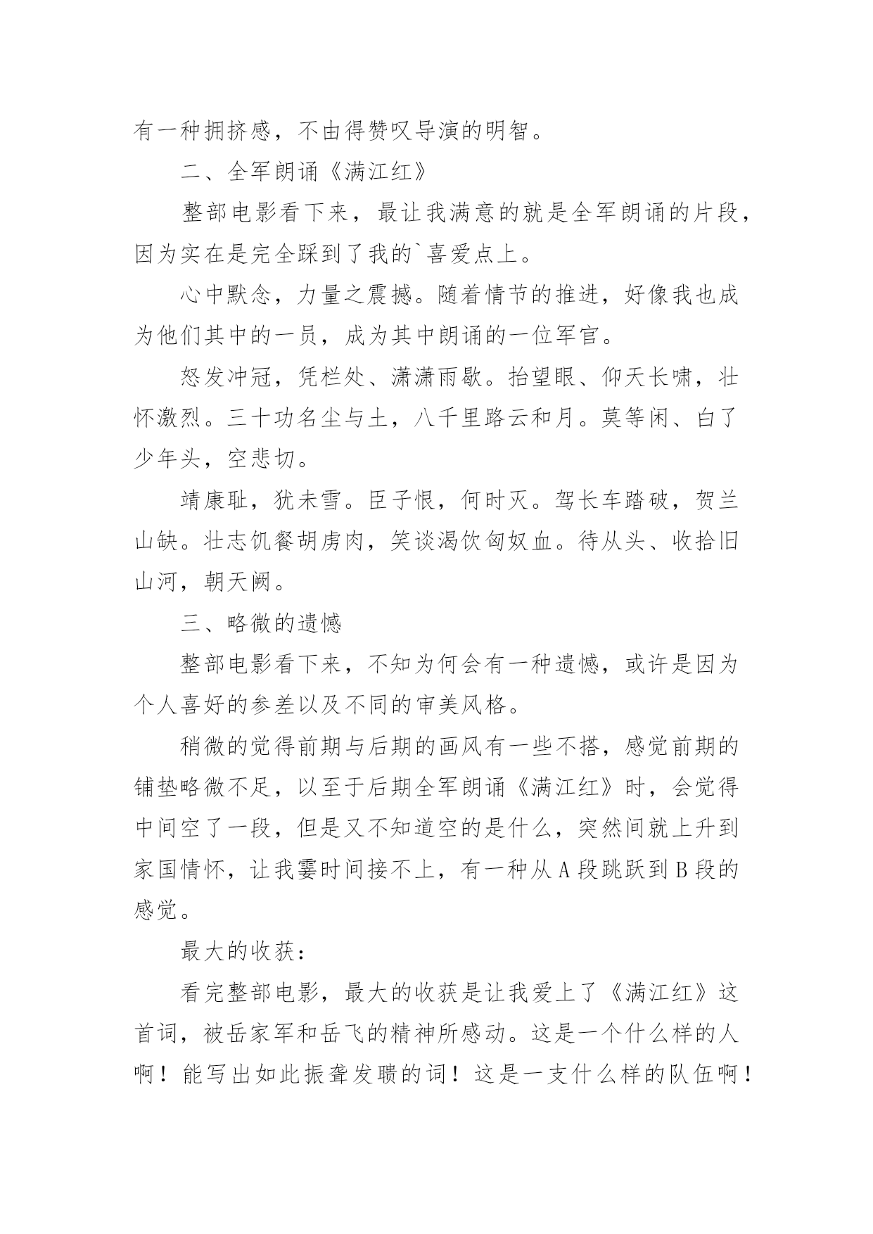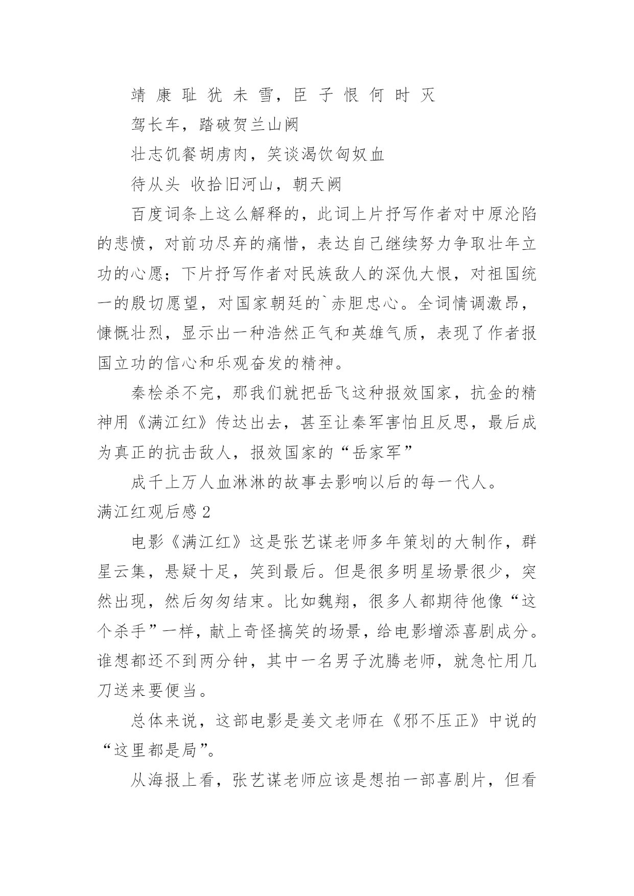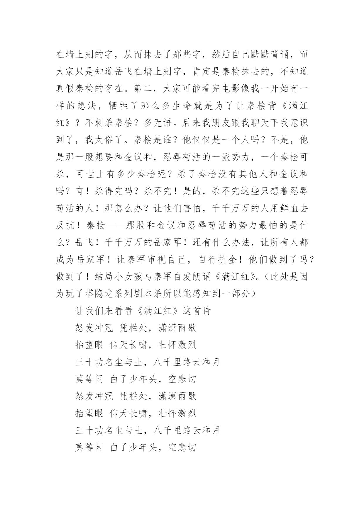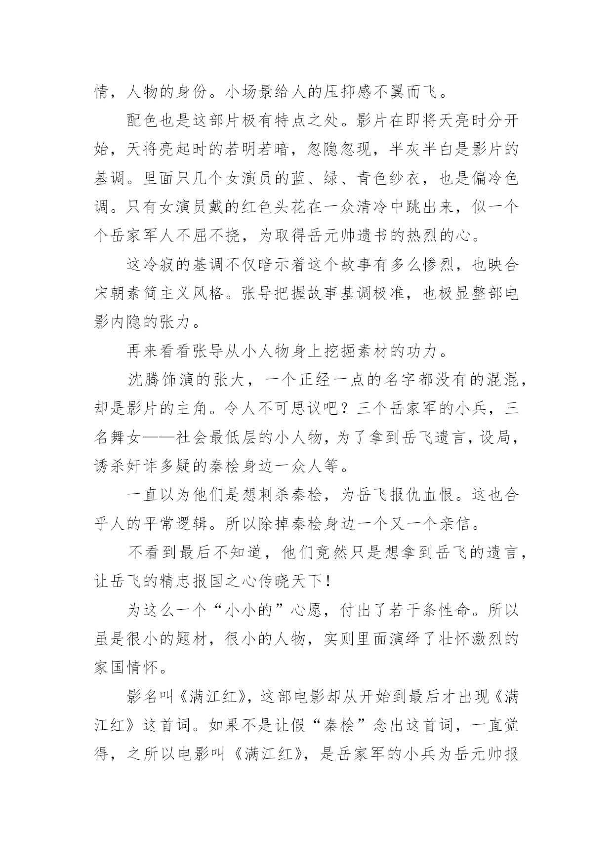 满江红观后感满江红观后感看完一部影视作品以后,一定对生活有了新的感悟和看法吧,这时候十分有必须要写一篇观后感了!在写观后感之前,可以先参考范文,以下是小编为大家收集的满江红观后感,仅供参考,希望能够帮助到大家。满江红观后感1我也不是想说这部电影有多好,甚至我也是一开始看完觉得好无语的电影,直到后来跟好友聊了一下这个电影,才发现自己是‘俗人’。甚至后来刷某乎评论,大家对这个电影骂声一片,所以我写下了这篇文章,表达一下我的想法,以及让喜欢这部电影的小伙伴找到一些共鸣。到电影院的时候电影已经开始20分钟,错过了很多故事,我从电影简介里了解到了背景故事,南宋绍兴年间,岳飞死后四年,秦桧与金人会谈,会谈前夜,金国使者死在宰相驻地,密信也不翼而飞,张大与孙均被卷入阴谋之中,随着调查,何立、武义淳、瑶琴也卷入其中。我先表达我现在的观点:张大等人的局,不是刺杀秦桧,而是像孙均所说的,他们其实做这些事是为了让秦桧背诵岳飞当时在死之前留下的《满江红》(电影故事设定就是这样,别杠)。第一,电影交代了为什么《满江红》没有留下来的原因,是因为假秦桧去了某个地方(忘了)然后见到了岳飞在墙上刻的字,从而抹去了那些字,然后自己默默背诵,而大家只是知道岳飞在墙上刻字,肯定是秦桧抹去的,不知道真假秦桧的存在。第二,大家可能看完电影像我一开始有一样的想法,牺牲了那么多生命就是为了让秦桧背《满江红》?不刺杀秦桧?多无语。后来我朋友跟我聊天下我意识到了,我太俗了。秦桧是谁?他仅仅是一个人吗?不是,他是那一股想要和金议和,忍辱苟活的一派势力,一个秦桧可杀,可世上有多少秦桧呢?杀了秦桧没有其他人和金议和吗?有!杀得完吗?杀不完!是的,杀不完这些只想着忍辱苟活的人!那怎么办?让他们害怕,千千万万的人用鲜血去反抗!秦桧——那股和金议和忍辱苟活的势力最怕的是什么?岳飞!千千万万的岳家军!还有什么办法,让所有人都成为岳家军!让秦军审视自己,自行抗金!他们做到了吗?做到了!结局小女孩与秦军自发朗诵《满江红》。(此处是因为玩了塔隐龙系列剧本杀所以能感知到一部分)让我们来看看《满江红》这首诗怒发冲冠凭栏处,潇潇雨歇抬望眼仰天长啸,壮怀激烈三十功名尘与土,八千里路云和月莫等闲白了少年头,空悲切怒发冲冠凭栏处,潇潇雨歇抬望眼仰天长啸,壮怀激烈三十功名尘与土,八千里路云和月莫等闲白了少年头,空悲切靖康耻犹未雪,臣子恨何时灭驾长车,踏破贺兰山阙壮志饥餐胡虏肉,笑谈渴饮匈奴血待从头收拾旧河山,朝天阙百度词条上这么解释的,此词上片抒写作者对中原沦陷的悲愤,对前功尽弃的痛惜,表达自己继续努力争取壮年立功的心愿;下片抒写作者对民族敌人的深仇大恨,对祖国统一的殷切愿望,对国家朝廷的`赤胆忠心。全词情调激昂,慷慨壮烈,显示出一种浩然正气和英雄气质,表现了作者报国立功的信心和乐观奋发的精神。秦桧杀不完,那我们就把岳飞这种报效国家,抗金的精神用《满江红》传达出去,甚至让秦军害怕且反思,最后成为真正的抗击敌人,报效国家的“岳家军”成千上万人血淋淋的故事去影响以后的每一代人。满江红观后感2电影《满江红》这是张艺谋老师多年策划的大制作,群星云集,悬疑十足,笑到最后。但是很多明星场景很少,突然出现,然后匆匆结束。比如魏翔,很多人都期待他像“这个杀手”一样,献上奇怪搞笑的场景,给电影增添喜剧成分。谁想都还不到两分钟,其中一名男子沈腾老师,就急忙用几刀送来要便当。总体来说,这部电影是姜文老师在《邪不压正》中说的“这里都是局”。从海报上看,张艺谋老师应该是想拍一部喜剧片,但看完之后才知道,这是一部情节紧凑、情节紧凑的“喜剧片”。整部电影都是从黄金使者被杀开始的,中途以寻找通向敌人的叛逆之信为主线。雷佳音老师秦桧派亲信寻找书信线索,不断拉拢众多人物,终于引出岳飞将军最后的遗言——《满江红》。这个结局本来是想和电影的名字呼应的,但是这个呼应感觉有点僵硬。因为全剧除了最后一个,剩下的地方这个遗嘱都提到了《满江红》。“太紧了”,电影里情节连贯,一个局连着一个局。你可能没看到最后,但你不会注意到有这么多电台吧。联系了很多人,不一定记得,但一定会记得古城胡同。大师可能是想通过这个场景,表现出电影的紧张气氛,但一反复出现这个场景,就有点头晕。幸运的是,只看了一次,就看了很多次的人,都会觉得头晕恶心。首先潘龙斌老师调动了各方势力,这个局说明了现场的人物关系。各方势力都有自己的九九。人物之间的`关系紧张,没有绝对的忠诚。张译老师一直是大老板雷佳音老师最忠实的部下,但最后觉得自己一个人可以有“密信”,当然最后也没有好结果,贪婪和刚直是死亡的最终原因;同样是表里如一,易烊千玺老师在最后的时候,杀了沈腾老师,最后又反过来,提出了满江红这个主题。《凑》整部电影长达159分钟,其中重复的胡同场景应该占了很大一部分吧,但剧情发展的过程就像是一场情节