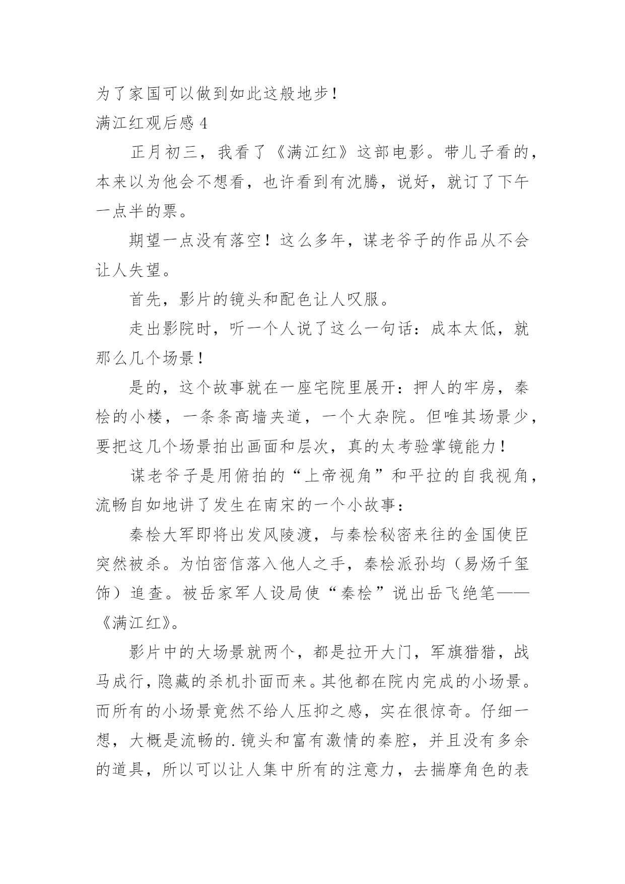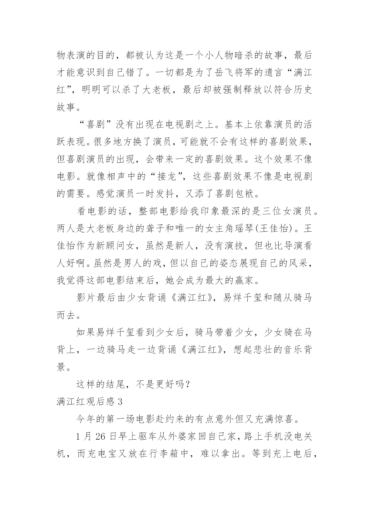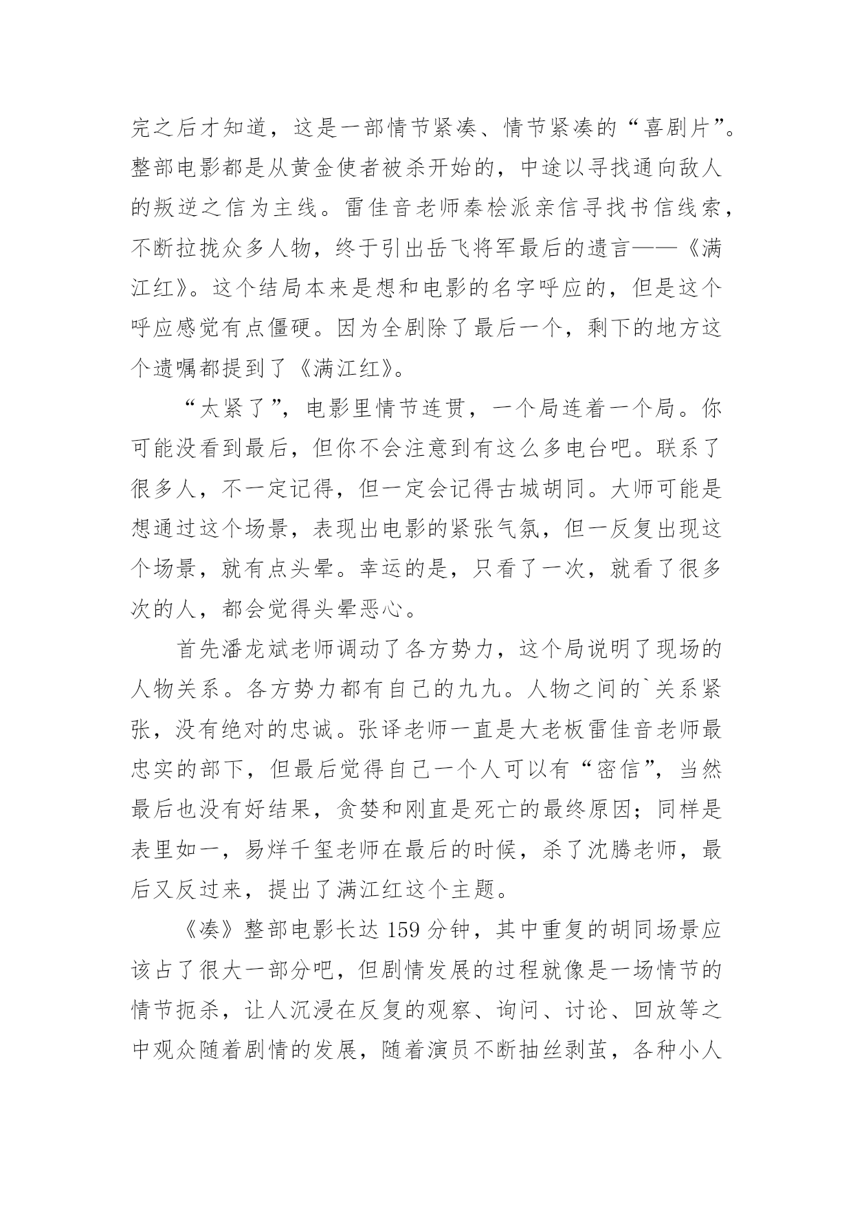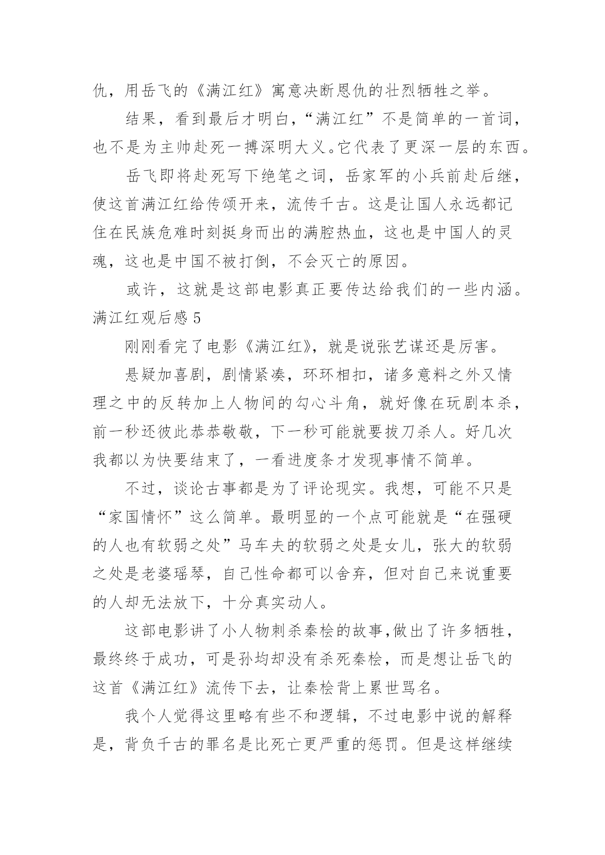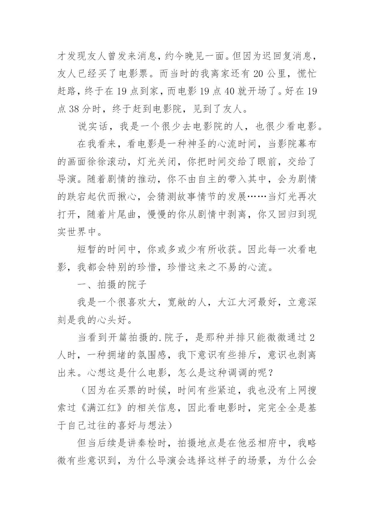 满江红观后感满江红观后感看完一部影视作品以后,一定对生活有了新的感悟和看法吧,这时候十分有必须要写一篇观后感了!在写观后感之前,可以先参考范文,以下是小编为大家收集的满江红观后感,仅供参考,希望能够帮助到大家。满江红观后感1我也不是想说这部电影有多好,甚至我也是一开始看完觉得好无语的电影,直到后来跟好友聊了一下这个电影,才发现自己是‘俗人’。甚至后来刷某乎评论,大家对这个电影骂声一片,所以我写下了这篇文章,表达一下我的想法,以及让喜欢这部电影的小伙伴找到一些共鸣。到电影院的时候电影已经开始20分钟,错过了很多故事,我从电影简介里了解到了背景故事,南宋绍兴年间,岳飞死后四年,秦桧与金人会谈,会谈前夜,金国使者死在宰相驻地,密信也不翼而飞,张大与孙均被卷入阴谋之中,随着调查,何立、武义淳、瑶琴也卷入其中。我先表达我现在的观点:张大等人的局,不是刺杀秦桧,而是像孙均所说的,他们其实做这些事是为了让秦桧背诵岳飞当时在死之前留下的《满江红》(电影故事设定就是这样,别杠)。第一,电影交代了为什么《满江红》没有留下来的原因,是因为假秦桧去了某个地方(忘了)然后见到了岳飞在墙上刻的字,从而抹去了那些字,然后自己默默背诵,而大家只是知道岳飞在墙上刻字,肯定是秦桧抹去的,不知道真假秦桧的存在。第二,大家可能看完电影像我一开始有一样的想法,牺牲了那么多生命就是为了让秦桧背《满江红》?不刺杀秦桧?多无语。后来我朋友跟我聊天下我意识到了,我太俗了。秦桧是谁?他仅仅是一个人吗?不是,他是那一股想要和金议和,忍辱苟活的一派势力,一个秦桧可杀,可世上有多少秦桧呢?杀了秦桧没有其他人和金议和吗?有!杀得完吗?杀不完!是的,杀不完这些只想着忍辱苟活的人!那怎么办?让他们害怕,千千万万的人用鲜血去反抗!秦桧——那股和金议和忍辱苟活的势力最怕的是什么?岳飞!千千万万的岳家军!还有什么办法,让所有人都成为岳家军!让秦军审视自己,自行抗金!他们做到了吗?做到了!结局小女孩与秦军自发朗诵《满江红》。(此处是因为玩了塔隐龙系列剧本杀所以能感知到一部分)让我们来看看《满江红》这首诗怒发冲冠凭栏处,潇潇雨歇抬望眼仰天长啸,壮怀激烈三十功名尘与土,八千里路云和月莫等闲白了少年头,空悲切怒发冲冠凭栏处,潇潇雨歇抬望眼仰天长啸,壮怀激烈三十功名尘与土,八千里路云和月莫等闲白了少年头,空悲切靖康耻犹未雪,臣子恨何时灭驾长车,踏破贺兰山阙壮志饥餐胡虏肉,笑谈渴饮匈奴血待从头收拾旧河山,朝天阙百度词条上这么解释的,此词上片抒写作者对中原沦陷的悲愤,对前功尽弃的痛惜,表达自己继续努力争取壮年立功的心愿;下片抒写作者对民族敌人的深仇大恨,对祖国统一的殷切愿望,对国家朝廷的`赤胆忠心。全词情调激昂,慷慨壮烈,显示出一种浩然正气和英雄气质,表现了作者报国立功的信心和乐观奋发的精神。秦桧杀不完,那我们就把岳飞这种报效国家,抗金的精神用《满江红》传达出去,甚至让秦军害怕且反思,最后成为真正的抗击敌人,报效国家的“岳家军”成千上万人血淋淋的故事去影响以后的每一代人。满江红观后感2电影《满江红》这是张艺谋老师多年策划的大制作,群星云集,悬疑十足,笑到最后。但是很多明星场景很少,突然出现,然后匆匆结束。比如魏翔,很多人都期待他像“这个杀手”一样,献上奇怪搞笑的场景,给电影增添喜剧成分。谁想都还不到两分钟,其中一名男子沈腾老师,就急忙用几刀送来要便当。总体来说,这部电影是姜文老师在《邪不压正》中说的“这里都是局”。从海报上看,张艺谋老师应该是想拍一部喜剧片,但看完之后才知道,这是一部情节紧凑、情节紧凑的“喜剧片”。整部电影都是从黄金使者被杀开始的,中途以寻找通向敌人的叛逆之信为主线。雷佳音老师秦桧派亲信寻找书信线索,不断拉拢众多人物,终于引出岳飞将军最后的遗言——《满江红》。这个结局本来是想和电影的名字呼应的,但是这个呼应感觉有点僵硬。因为全剧除了最后一个,剩下的地方这个遗嘱都提到了《满江红》。“太紧了”,电影里情节连贯,一个局连着一个局。你可能没看到最后,但你不会注意到有这么多电台吧。联系了很多人,不一定记得,但一定会记得古城胡同。大师可能是想通过这个场景,表现出电影的紧张气氛,但一反复出现这个场景,就有点头晕。幸运的是,只看了一次,就看了很多次的人,都会觉得头晕恶心。首先潘龙斌老师调动了各方势力,这个局说明了现场的人物关系。各方势力都有自己的九九。人物之间的`关系紧张,没有绝对的忠诚。张译老师一直是大老板雷佳音老师最忠实的部下,但最后觉得自己一个人可以有“密信”,当然最后也没有好结果,贪婪和刚直是死亡的最终原因;同样是表里如一,易烊千玺老师在最后的时候,杀了沈腾老师,最后又反过来,提出了满江红这个主题。《凑》整部电影长达159分钟,其中重复的胡同场景应该占了很大一部分吧,但剧情发展的过程就像是一场情节