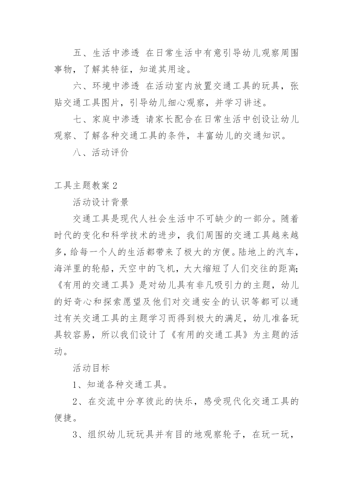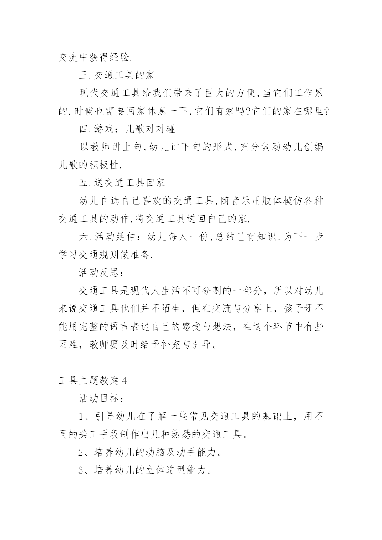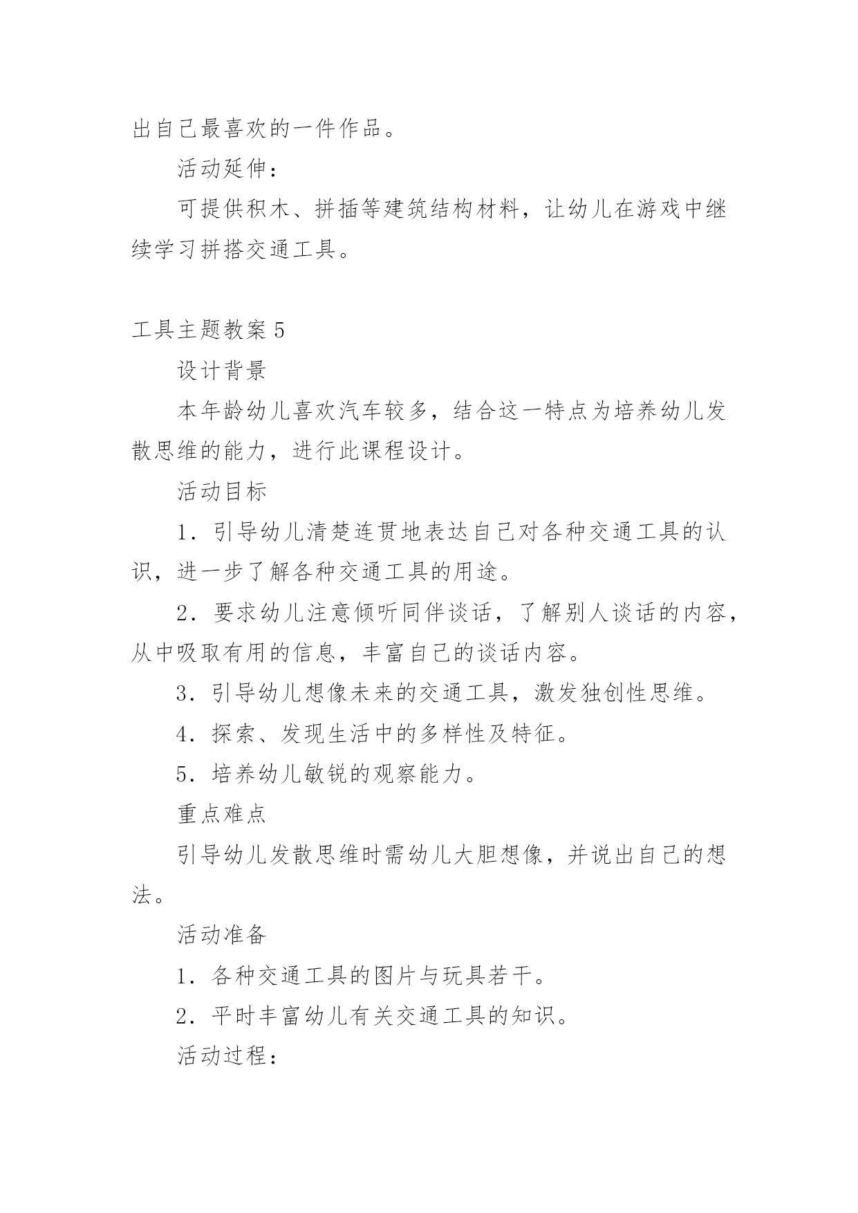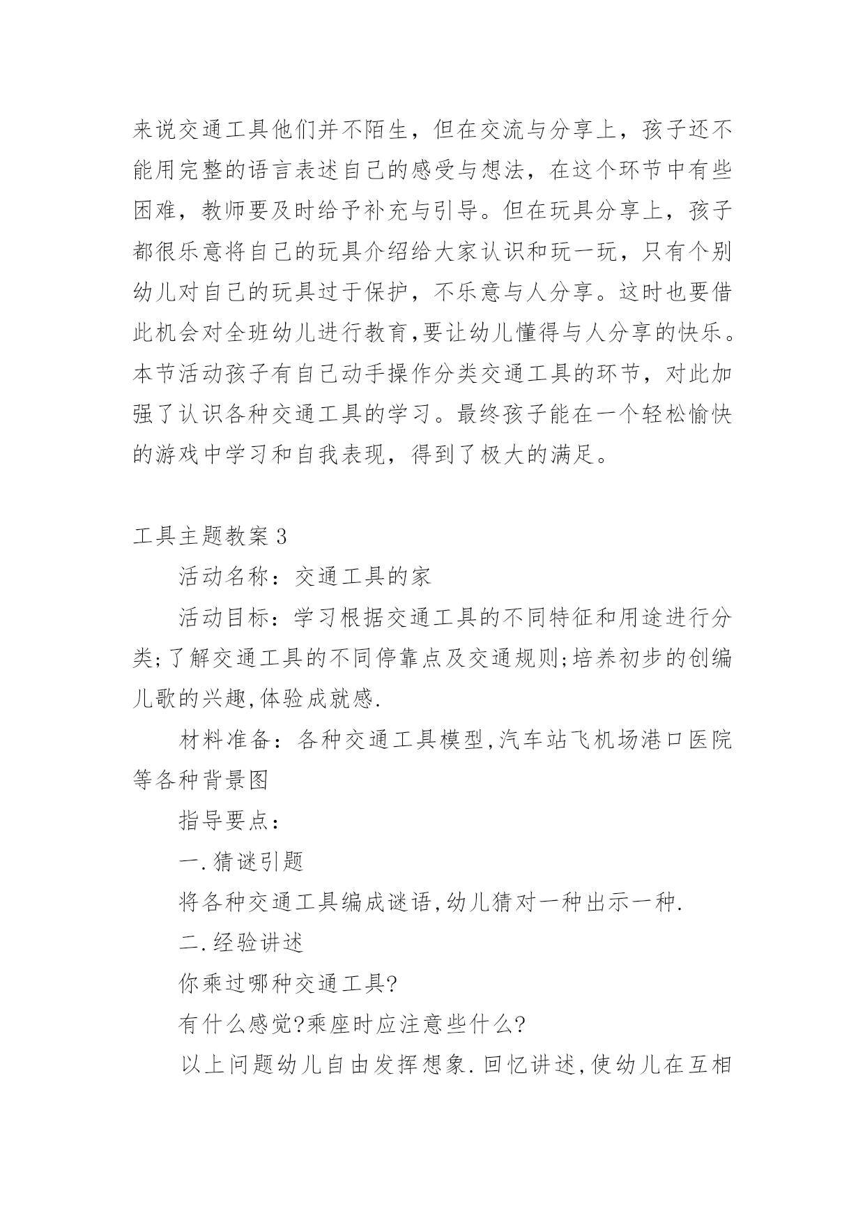 工具主题教案作为一名老师,常常要写一份优秀的教案,编写教案有利于我们弄通教材内容,进而选择科学、恰当的教学方法。写教案需要注意哪些格式呢?下面是小编为大家整理的工具主题教案,仅供参考,欢迎大家阅读。工具主题教案1一、活动目标1.引导幼儿清楚连贯地表达自己对各种交通工具的认识,进一步了解各种交通工具的用途。2.要求幼儿注意倾听同伴谈话,了解别人谈话的内容,从中吸取有用的信息,丰富自己的谈话内容。3.引导幼儿想像未来的交通工具,激发独创性思维。二、活动准备1.各种交通工具的图片与玩具若干。2.平时丰富幼儿有关交通工具的知识。三、活动过程(一)创设情景,引出话题。1.教师神秘地拿出玩具大卡车,提问:这是什么?它有什么用途?2.出示小轿车,提问:这是什么?它有什么用途?3.请幼儿根据自己的经验讲讲认识的交通工具,教师按幼儿讲述内容出示图片。(二)引导幼儿围绕话题分成若干组自由交谈交通工具的用途。要求幼儿商量谈话次序,轮流谈话,不抢着讲,也不能光听别人讲,自己不发表意见。教师轮流巡视指导幼儿的谈话,用插话的`方法将幼儿谈话内容集中在“什么工具有什么用”的话题上。(三)帮交通工具分类。引导幼儿将交通工具分类,进一步加深对交通工具的认识。出示交通工具图片,黑板上划分成三类(运货、载人、特殊用途)请幼儿操作,要求先说出其名称,再将卡片贴在对应用途的分类区。(四)谈话未来的交通工具。1.引导幼儿拓展谈话内容,想像未来的各种交通工具。2.小结:表扬幼儿的创造性想像,鼓励幼儿好好学习,长大后设计更特殊、更有用的交通工具。四、各领域渗透科学:引导幼儿通过观察、比较各种交通工具的主要特征及不同用途,了解它们与人们生活的关系。艺术:学习有关内容的歌舞,如:《小小交通警》(集体舞)、《大吊车》(音乐游戏),丰富幼儿对交通工具的认识以及交通知识。美术:启发幼儿发挥创造力,设计出最新型、最特别的交通工具。五、生活中渗透在日常生活中有意引导幼儿观察周围事物,了解其特征,知道其用途。六、环境中渗透在活动室内放置交通工具的玩具,张贴交通工具图片,引导幼儿细心观察,并学习讲述。七、家庭中渗透请家长配合在日常生活中创设让幼儿观察、了解各种交通工具的条件,丰富幼儿的交通知识。八、活动评价工具主题教案2活动设计背景交通工具是现代人社会生活中不可缺少的一部分。随着时代的变化和科学技术的进步,我们周围的交通工具越来越多,给每一个人的生活都带来了极大的方便。陆地上的汽车,海洋里的轮船,天空中的飞机,大大缩短了人们交往的距离;《有用的交通工具》是对幼儿具有非凡吸引力的主题,幼儿的好奇心和探索愿望及他们对交通安全的认识等都可以通过有关交通工具的主题学习而得到极大的满足,幼儿准备玩具较容易,所以我们设计了《有用的交通工具》为主题的活动。活动目标1、知道各种交通工具。2、在交流中分享彼此的快乐,感受现代化交通工具的便捷。3、组织幼儿玩玩具并有目的地观察轮子,在玩一玩,看一看,说一说中了解轮子的特点及用处。4、通过儿歌动画等形式,让幼儿了解交通规则。5、让幼儿知道过马路要遵守交通规则,增加幼儿自我保护意识。6、遵守交通规则,在游戏中分享快乐。教学重点、难点教学重点:知道各种交通工具,能大胆与人交流自己乘过的.交通工具,以及乘坐的经验。教学难点:让幼儿了解交通规则。活动准备教学准备:公路、海洋、天空的背景图;各种交通工具的图片;幼儿带来的各种交通工具的玩具、标志等。活动过程(一)、引发兴趣。教师引导幼儿讲讲今天是怎样来幼儿园的。(二)、交流讨论。1、请幼儿想想今天早晨,你们是怎样来幼儿园的?(坐车来的小朋友很快就到了学校)2、你们都见过哪些交通工具呢?它什么样子?3、你乘过哪些交通工具,什么时候,和谁一起坐的,去了什么地方,乘坐的感觉怎麽样?乘坐不同的交通工具时感受有什么不同。交通工具给我们的生活带来了哪些方便。(三)、认一认。1、出示交通工具图片,教师和幼儿一起说说都认识哪些交通工具。教师引导幼儿说出各种交通工具的大概结构与功能。2、请幼儿在《幼儿用书》上圈出自己乘坐过的交通工具。3、讨论不同的交通工具应在哪里行驶,讨论后请幼儿操作,找个别幼儿将老师准备好的交通工具图片粘贴到准备好的公路、海洋、天空背景图上,其他幼儿完成《幼儿用书》连一连。(四)、玩具分享。1、请幼儿介绍自己带来的是什么交通工具玩具,在哪里行驶,怎样玩,大家共同欣赏。2、大家一起玩带来的交通工具玩具,感受分享的乐趣。3、交流:游戏结束后请幼儿说一说,自己玩到了什么玩具?叫什么玩具?叫什么名字?有什么功能?怎样玩的?是哪个小朋友的?你怎样得到的?玩过之后是怎样说的,怎样做的?4、安全教育:交通工具给我们的生活带来了许多便利,但也请小朋友们注意安全,在马路上行走时要怎样?过马路时要怎样?上车下车时要怎样?在车上乘坐时要怎样
