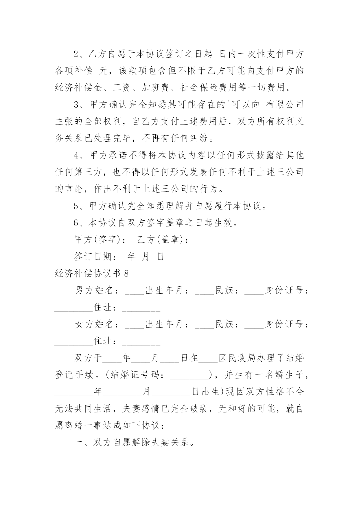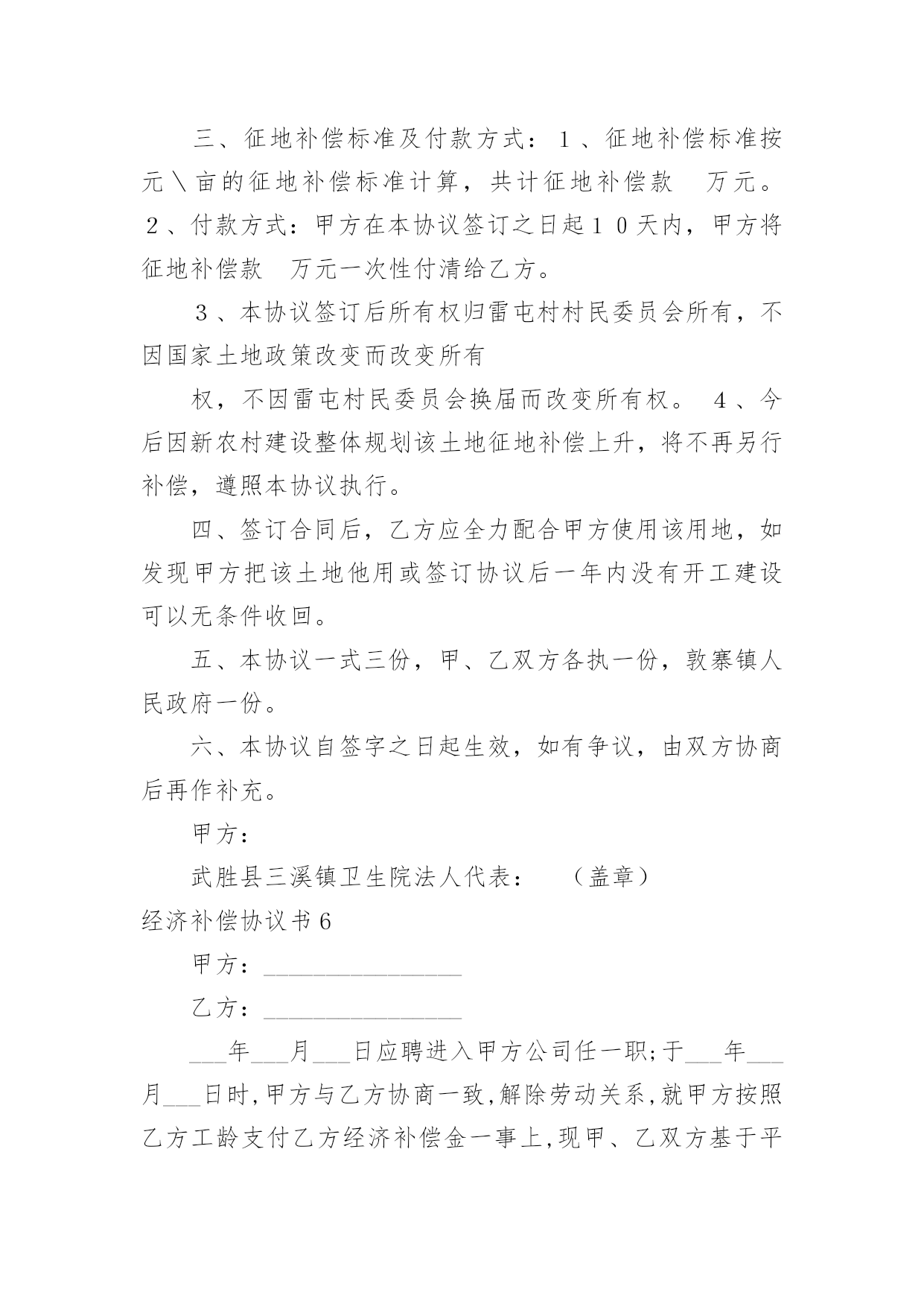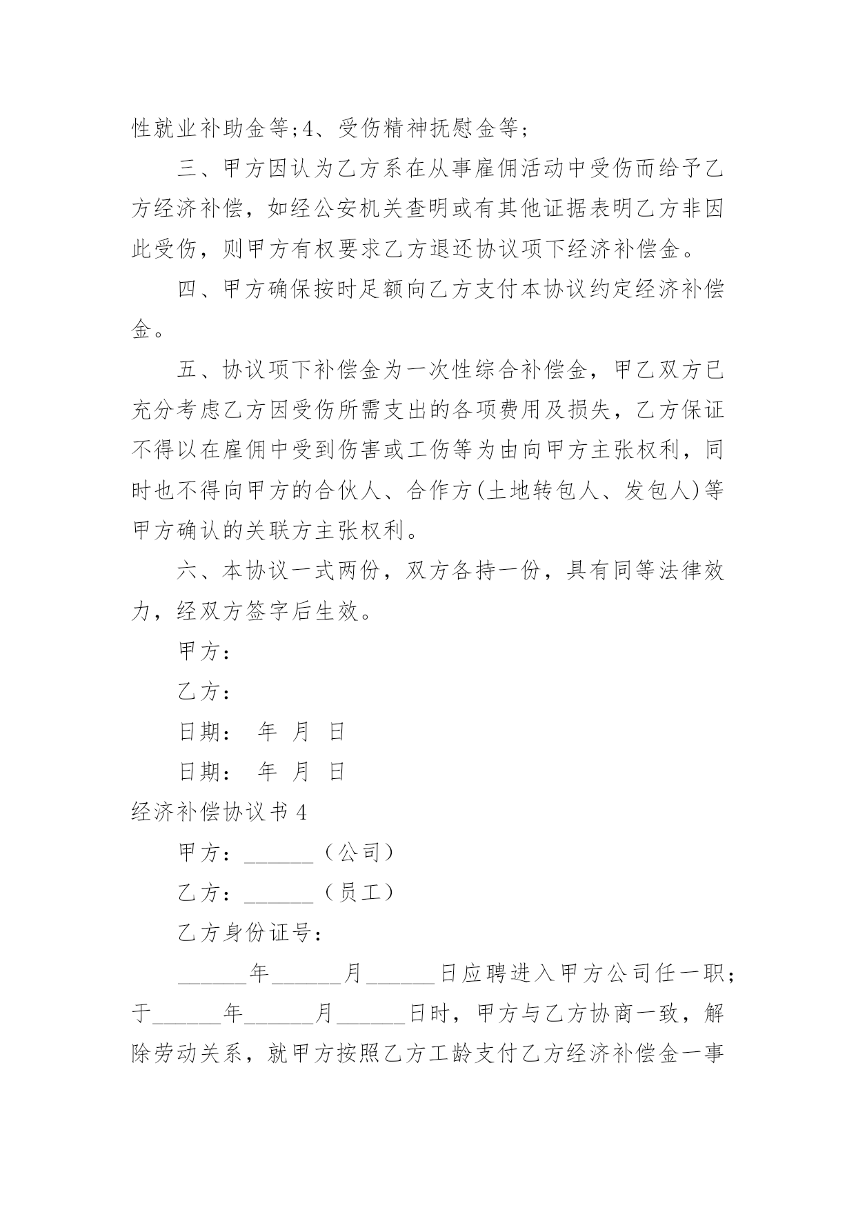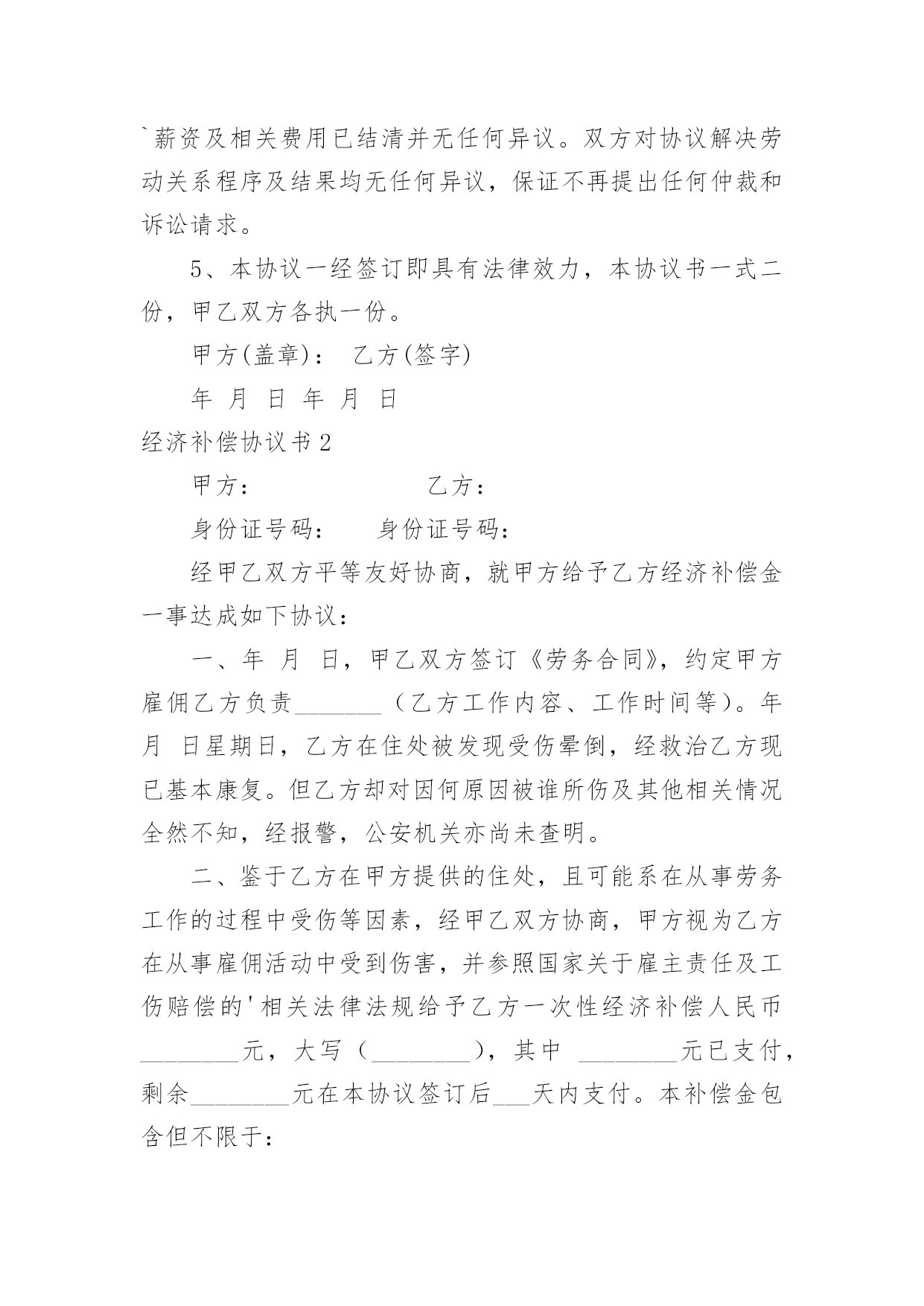 经济补偿协议书经济补偿协议书15篇随着社会一步步向前发展,协议使用的频率越来越高,签订协议可以保护当事人的合法权益。那么写协议真的很难吗?下面是小编为大家整理的经济补偿协议书,欢迎阅读,希望大家能够喜欢。经济补偿协议书1甲方:乙方:(身份证号码:)双方参照《中华人民共和国劳动法》等法律法规,经协商,在互谅互让的基础上,就解除劳动关系及经济补偿事宜达成如下协议:1、甲乙双方经协商一致,同意于年月日解除劳动关系,双方劳动关系即行解除,工资结算至解除劳动关系日。2、甲方应于年月日前一次性支付给乙方人民币计:元作为经济补偿。3、乙方应于年月日前与用人单位办理好移交手续,同时对甲方应尽保密义务,保证甲方秘密资料不外泄,不在外散播损害甲方利益形象的言论,如因泄密给甲方造成重大损失,甲方将追究乙方法律责任。4、乙方确认双方劳动关系履行时的权利义务从协议签订之日起即行终止,并无任何不了事宜,确认对工作期间的`薪资及相关费用已结清并无任何异议。双方对协议解决劳动关系程序及结果均无任何异议,保证不再提出任何仲裁和诉讼请求。5、本协议一经签订即具有法律效力,本协议书一式二份,甲乙双方各执一份。甲方(盖章):乙方(签字)年月日年月日经济补偿协议书2甲方:乙方:身份证号码:身份证号码:经甲乙双方平等友好协商,就甲方给予乙方经济补偿金一事达成如下协议:一、年月日,甲乙双方签订《劳务合同》,约定甲方雇佣乙方负责_______(乙方工作内容、工作时间等)。年月日星期日,乙方在住处被发现受伤晕倒,经救治乙方现已基本康复。但乙方却对因何原因被谁所伤及其他相关情况全然不知,经报警,公安机关亦尚未查明。二、鉴于乙方在甲方提供的住处,且可能系在从事劳务工作的过程中受伤等因素,经甲乙双方协商,甲方视为乙方在从事雇佣活动中受到伤害,并参照国家关于雇主责任及工伤赔偿的'相关法律法规给予乙方一次性经济补偿人民币________元,大写(________),其中________元已支付,剩余________元在本协议签订后___天内支付。本补偿金包含但不限于:1、乙方因就医治疗支出的各项费用及因误工减少的收入:如医疗费(含已发生、后发现未发生、伤病复发等医疗费)、护理费、营养费、住院伙食补助费、交通费、治疗期间工资福利待遇等;2、乙方因伤增加的必要支出、因劳动能力下降导致的收入减少、后续治疗费等;3、一次性受伤补助金、一次性受伤津贴、gongwen。fanwen578一次性工伤医疗补助金、一次性就业补助金等;4、受伤精神抚慰金等;三、甲方因认为乙方系在从事雇佣活动中受伤而给予乙方经济补偿,如经公安机关查明或有其他证据表明乙方非因此受伤,则甲方有权要求乙方退还协议项下经济补偿金。四、甲方确保按时足额向乙方支付本协议约定经济补偿金。五、协议项下补偿金为一次性综合补偿金,甲乙双方已充分考虑乙方因受伤所需支出的各项费用及损失,乙方保证不得以在雇佣中受到伤害或工伤等为由向甲方主张权利,同时也不得向甲方的合伙人、合作方(土地转包人、发包人)等甲方确认的关联方主张权利。六、本协议一式两份,双方各持一份,具有同等法律效力,经双方签字后生效。甲方:乙方:_____年_____月_____日经济补偿协议书3甲方:乙方:身份证号码:身份证号码:经甲乙双方平等友好协商,就甲方给予乙方经济补偿金一事达成如下协议:一、年月日,甲乙双方签订《劳务合同》,约定甲方雇佣乙方负责_______(乙方工作内容、工作时间等)。年月日星期日,乙方在住处被发现受伤晕倒,经救治乙方现已基本康复。但乙方却对因何原因被谁所伤及其他相关情况全然不知,经报警,公安机关亦尚未查明。二、鉴于乙方在甲方提供的住处,且可能系在从事劳务工作的过程中受伤等因素,经甲乙双方协商,甲方视为乙方在从事雇佣活动中受到伤害,并参照国家关于雇主责任及工伤赔偿的`相关法律法规给予乙方一次性经济补偿人民币________元,大写(________),其中________元已支付,剩余________元在本协议签订后___天内支付。本补偿金包含但不限于:1、乙方因就医治疗支出的各项费用及因误工减少的收入:如医疗费(含已发生、后发现未发生、伤病复发等医疗费)、护理费、营养费、住院伙食补助费、交通费、治疗期间工资福利待遇等;2、乙方因伤增加的必要支出、因劳动能力下降导致的收入减少、后续治疗费等;3、一次性受伤补助金、一次性受伤津贴、一次性工伤医疗补助金、一次性就业补助金等;4、受伤精神抚慰金等;三、甲方因认为乙方系在从事雇佣活动中受伤而给予乙方经济补偿,如经公安机关查明或有其他证据表明乙方非因此受伤,则甲方有权要求乙方退还协议项下经济补偿金。四、甲方确保按时足额向乙方支付本协议约定经济补偿金。五、协议项下补偿金为一次性综合补偿金,甲乙双方已充分考虑乙方因受伤所