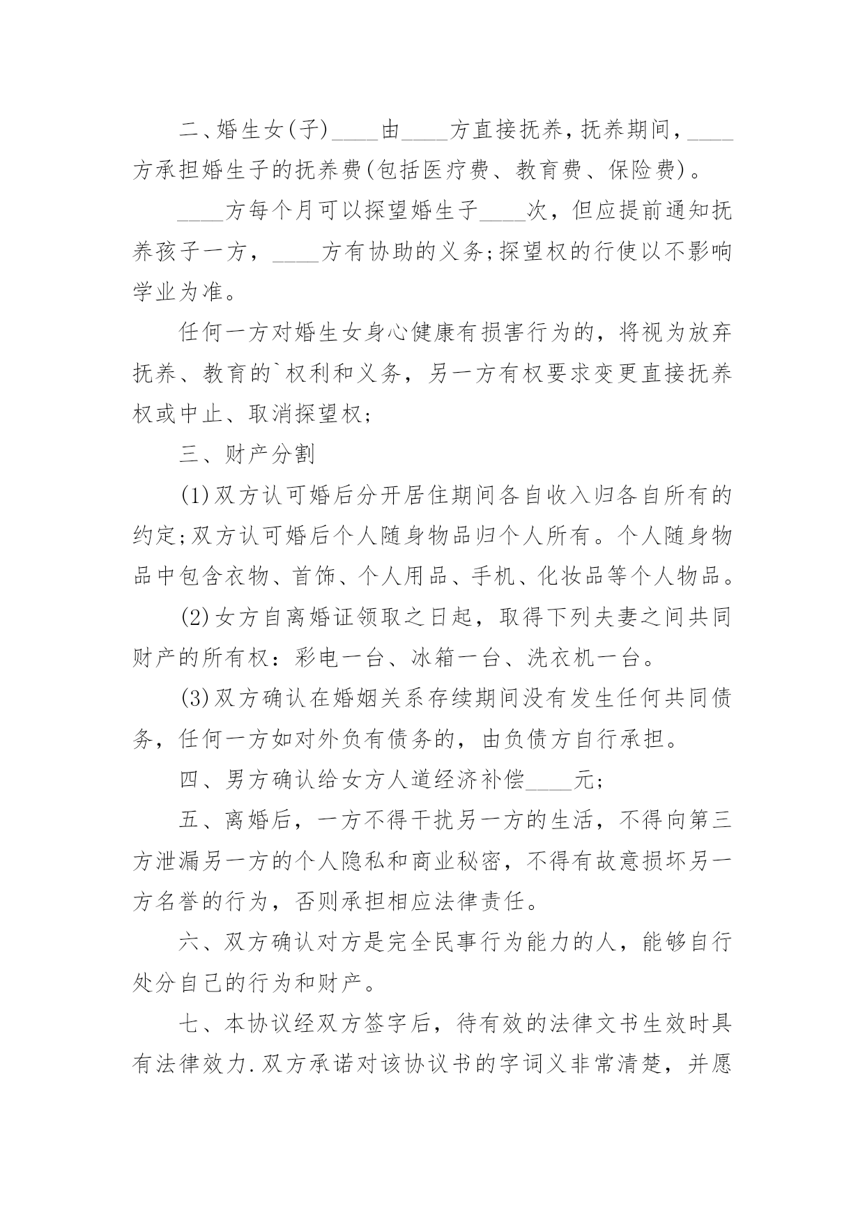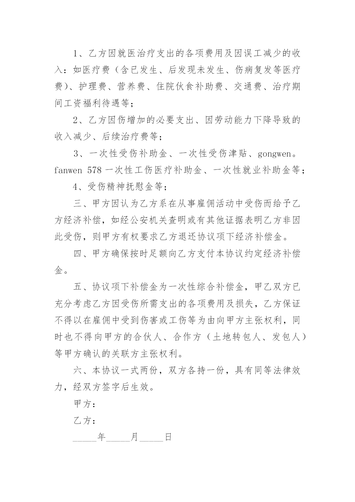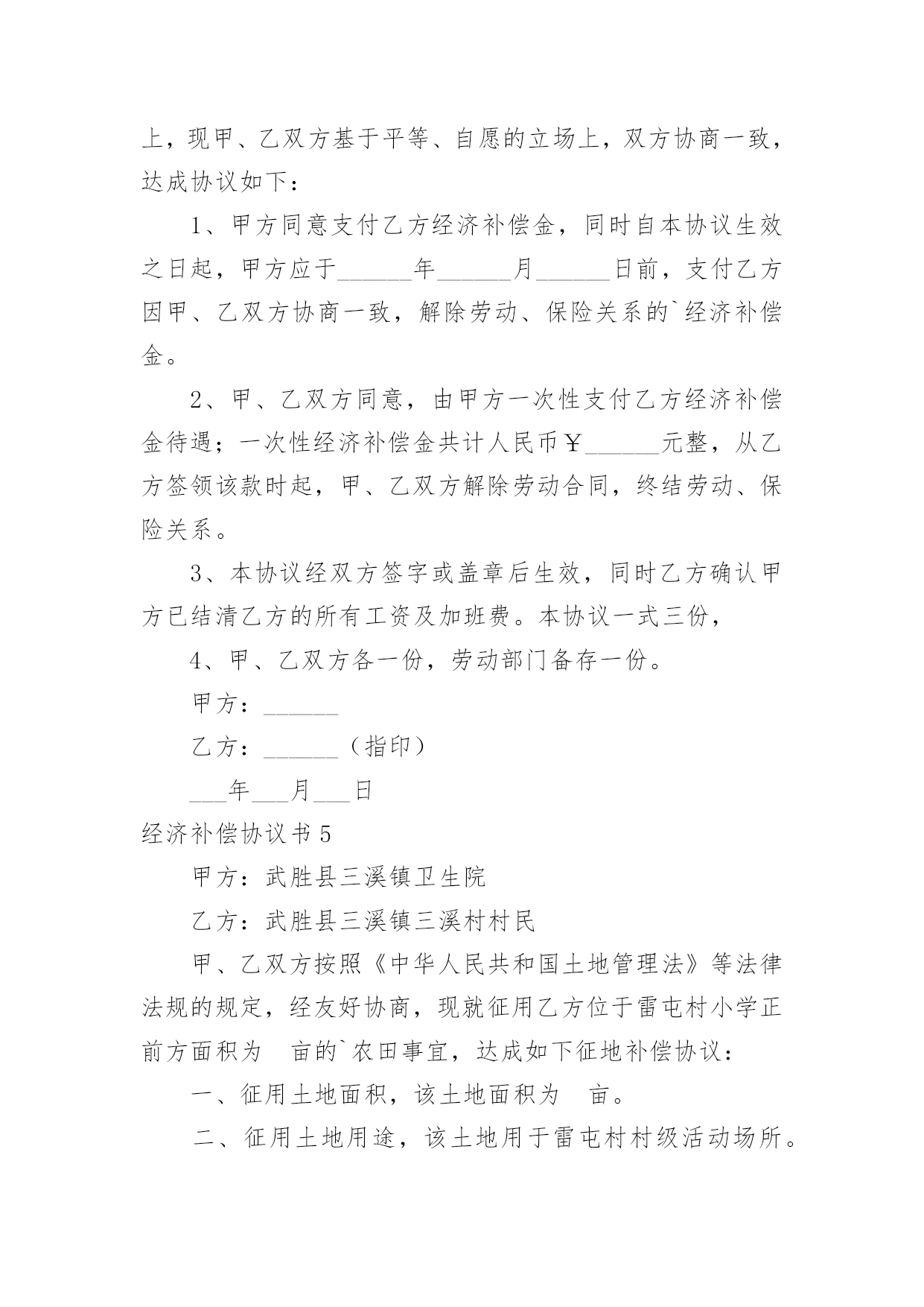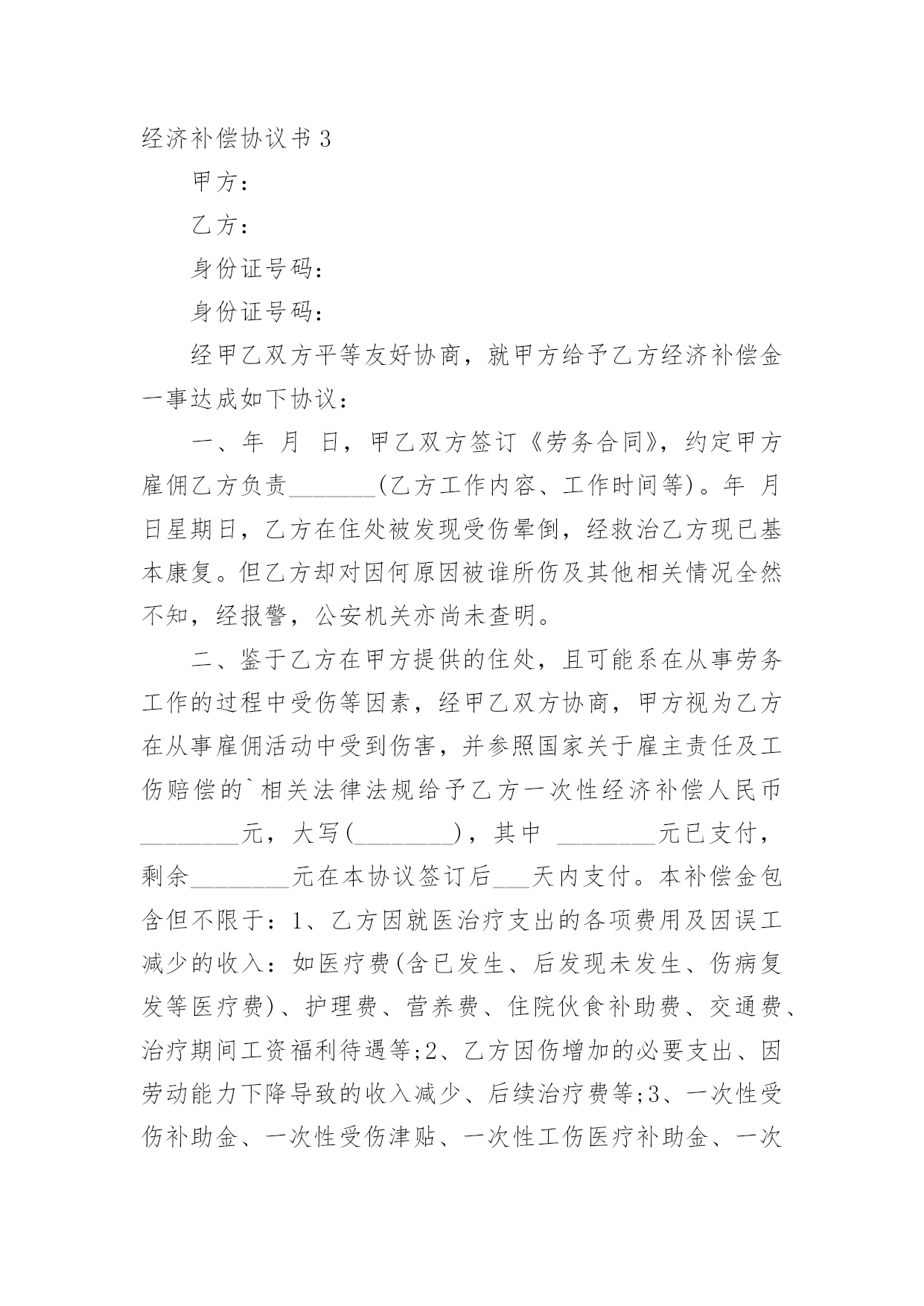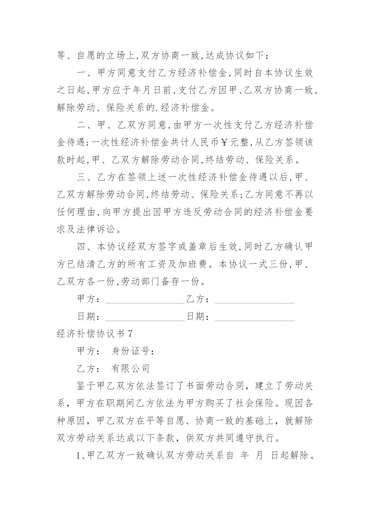 经济补偿协议书经济补偿协议书15篇随着社会一步步向前发展,协议使用的频率越来越高,签订协议可以保护当事人的合法权益。那么写协议真的很难吗?下面是小编为大家整理的经济补偿协议书,欢迎阅读,希望大家能够喜欢。经济补偿协议书1甲方:乙方:(身份证号码:)双方参照《中华人民共和国劳动法》等法律法规,经协商,在互谅互让的基础上,就解除劳动关系及经济补偿事宜达成如下协议:1、甲乙双方经协商一致,同意于年月日解除劳动关系,双方劳动关系即行解除,工资结算至解除劳动关系日。2、甲方应于年月日前一次性支付给乙方人民币计:元作为经济补偿。3、乙方应于年月日前与用人单位办理好移交手续,同时对甲方应尽保密义务,保证甲方秘密资料不外泄,不在外散播损害甲方利益形象的言论,如因泄密给甲方造成重大损失,甲方将追究乙方法律责任。4、乙方确认双方劳动关系履行时的权利义务从协议签订之日起即行终止,并无任何不了事宜,确认对工作期间的`薪资及相关费用已结清并无任何异议。双方对协议解决劳动关系程序及结果均无任何异议,保证不再提出任何仲裁和诉讼请求。5、本协议一经签订即具有法律效力,本协议书一式二份,甲乙双方各执一份。甲方(盖章):乙方(签字)年月日年月日经济补偿协议书2甲方:乙方:身份证号码:身份证号码:经甲乙双方平等友好协商,就甲方给予乙方经济补偿金一事达成如下协议:一、年月日,甲乙双方签订《劳务合同》,约定甲方雇佣乙方负责_______(乙方工作内容、工作时间等)。年月日星期日,乙方在住处被发现受伤晕倒,经救治乙方现已基本康复。但乙方却对因何原因被谁所伤及其他相关情况全然不知,经报警,公安机关亦尚未查明。二、鉴于乙方在甲方提供的住处,且可能系在从事劳务工作的过程中受伤等因素,经甲乙双方协商,甲方视为乙方在从事雇佣活动中受到伤害,并参照国家关于雇主责任及工伤赔偿的'相关法律法规给予乙方一次性经济补偿人民币________元,大写(________),其中________元已支付,剩余________元在本协议签订后___天内支付。本补偿金包含但不限于:1、乙方因就医治疗支出的各项费用及因误工减少的收入:如医疗费(含已发生、后发现未发生、伤病复发等医疗费)、护理费、营养费、住院伙食补助费、交通费、治疗期间工资福利待遇等;2、乙方因伤增加的必要支出、因劳动能力下降导致的收入减少、后续治疗费等;3、一次性受伤补助金、一次性受伤津贴、gongwen。fanwen578一次性工伤医疗补助金、一次性就业补助金等;4、受伤精神抚慰金等;三、甲方因认为乙方系在从事雇佣活动中受伤而给予乙方经济补偿,如经公安机关查明或有其他证据表明乙方非因此受伤,则甲方有权要求乙方退还协议项下经济补偿金。四、甲方确保按时足额向乙方支付本协议约定经济补偿金。五、协议项下补偿金为一次性综合补偿金,甲乙双方已充分考虑乙方因受伤所需支出的各项费用及损失,乙方保证不得以在雇佣中受到伤害或工伤等为由向甲方主张权利,同时也不得向甲方的合伙人、合作方(土地转包人、发包人)等甲方确认的关联方主张权利。六、本协议一式两份,双方各持一份,具有同等法律效力,经双方签字后生效。甲方:乙方:_____年_____月_____日经济补偿协议书3甲方:乙方:身份证号码:身份证号码:经甲乙双方平等友好协商,就甲方给予乙方经济补偿金一事达成如下协议:一、年月日,甲乙双方签订《劳务合同》,约定甲方雇佣乙方负责_______(乙方工作内容、工作时间等)。年月日星期日,乙方在住处被发现受伤晕倒,经救治乙方现已基本康复。但乙方却对因何原因被谁所伤及其他相关情况全然不知,经报警,公安机关亦尚未查明。二、鉴于乙方在甲方提供的住处,且可能系在从事劳务工作的过程中受伤等因素,经甲乙双方协商,甲方视为乙方在从事雇佣活动中受到伤害,并参照国家关于雇主责任及工伤赔偿的`相关法律法规给予乙方一次性经济补偿人民币________元,大写(________),其中________元已支付,剩余________元在本协议签订后___天内支付。本补偿金包含但不限于:1、乙方因就医治疗支出的各项费用及因误工减少的收入:如医疗费(含已发生、后发现未发生、伤病复发等医疗费)、护理费、营养费、住院伙食补助费、交通费、治疗期间工资福利待遇等;2、乙方因伤增加的必要支出、因劳动能力下降导致的收入减少、后续治疗费等;3、一次性受伤补助金、一次性受伤津贴、一次性工伤医疗补助金、一次性就业补助金等;4、受伤精神抚慰金等;三、甲方因认为乙方系在从事雇佣活动中受伤而给予乙方经济补偿,如经公安机关查明或有其他证据表明乙方非因此受伤,则甲方有权要求乙方退还协议项下经济补偿金。四、甲方确保按时足额向乙方支付本协议约定经济补偿金。五、协议项下补偿金为一次性综合补偿金,甲乙双方已充分考虑乙方因受伤所