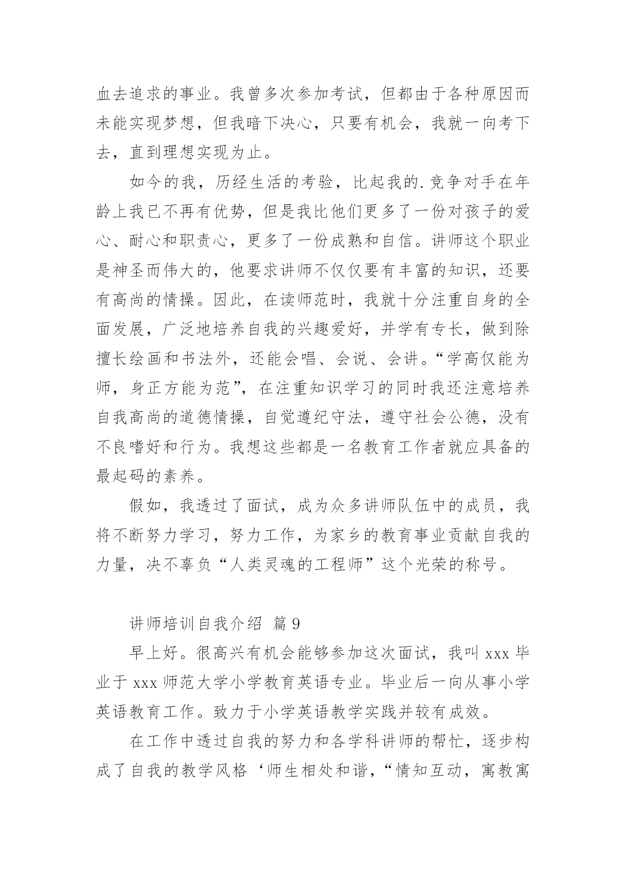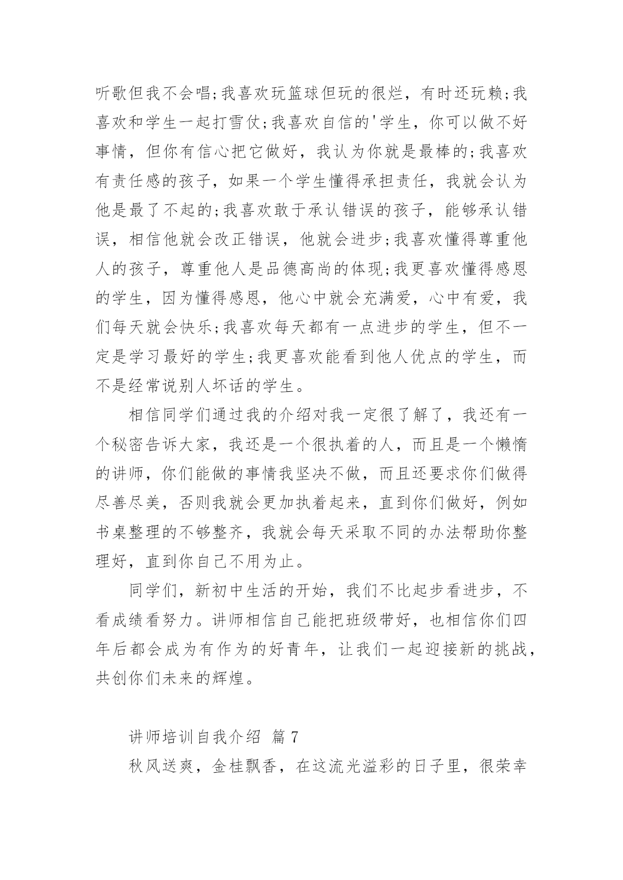 讲师培训自我介绍当到达一个新的环境后,通常需要我们进行自我介绍,自我介绍是一种认识自我的手段。那么什么样的自我介绍才合适呢?以下是小编精心整理的讲师培训自我介绍,仅供参考,大家一起来看看吧。讲师培训自我介绍篇1我的名字叫X,来自X,今年X岁,毕业于X学院汽车建筑工程系。昨天在X信息中看到贵公司发布了聘请广告,我很喜爱这个职位。三载匆忙,如今的我深深懂得:昨天的成果已成为历史,将来的辉煌要用今天脚踏实地锲而不舍地努力去完成。在我离校的时分,我携带着学到的学问和年轻人满腔的热忱与幻想,真诚而又诚心地向贵单位求职。在校期间我也常常阅读课外书物,以增长学问,还学到了许多做人的道理,只有老实努力才能胜利。也阅读了许多关于销售的书籍,积累了一些学问,只是还没有验证的时机,希望领导赐予我一个展现自己的舞台。我非常喜爱汽车销售这个工作,我会用我全部的'学问和热忱来完成这个工作。我之所以应聘这份工作,由于我具有以下条件:丰富的理论学问和娴熟的实践技能;良好的顺应力量,能吃苦,做事认真、踏实;充实的头脑、健康的体魄和充分的精力。讲师培训自我介绍篇2各位同学好,我是你们班的新语文讲师,以后负责上你们班的语文课。目前虽然大家对我并不熟悉,但是我希望以后各位同学都支持我的工作,好好学习。我的名字叫XX,毕业于XX师范大学汉语言文学专业,很高兴我能成为一名讲师,尤其是当你们这么聪明的同学的讲师。我教的是语文,但是我的风格不是枯燥的,我要把语文课上得像历史课一样具备趣味性。请大家以后的学习中积极给我提意见,我第一次做讲师,有很多都不懂,我也是一个学习的`过程,向你们学习如何做一个好讲师,合格的讲师。我相信只要经过我们共同的努力,我会学到如何做好一个讲师的经验以及能力,你们也会在新一学期的学习成绩里面创一新高。讲师培训自我介绍篇3各位领导,各位伙伴:大家上午好!我是一名来自一线的普通教师xxx,能作为一名培训教师站在这里发言,既兴奋又深感责任重大,我此时的心情归结为两个字就是“感谢”。感谢各位领导为大家教师队伍注入新的血液、并为大家搭建了这样的学习、交流平台,感谢各位伙伴在这个物欲横流的时代,选择了教师这个高尚而有相对清贫的行业,感谢大家冒着酷暑参加大家这次培训。各位伙伴,你们都是层层选拔出来的精英,你们也将带领大家磁县的教育事业走向新的高峰,在大家面前我不敢以老师自称。即将走向三尺讲台,也许有些忐忑,也许有些迷茫,没关系,大家将会帮助你们顺利完成老师到学生的完美变身,我定会和所有的培训老师将大家多年的`经验毫不保留地传授给大家,大家愿意作你们快速成长的引路人,这几天的培训,大家都做了精心的准备,大家将和大家一起从教师专业理念与师德修养,教师专业知识,教师专业技能等方面进行交流讨论,大家一定不会失望。讲师培训自我介绍篇4我叫XXX,今年27岁。XX年7月我从XX师范学校艺师美术专业计划内自费毕业。由于从XX年起国家不再对自费生包分配,使我与“太阳底下最光辉的职业”失之交臂。幸好,当时河西马厂完小师资不足,经人介绍,我在该完小担任了一年的临时代课讲师。回想起那段时光真是既甜蜜又完美,虽然代课工资很低,但听着同学们围在身旁“讲师”、“讲师”的叫个不停,看着那一双双充满信任的眼睛,那一张张稚气的小脸,生活中的所有不快都顿时烟消云散了。我原想,即使不能转正,只要学校需要,就是当一辈子代课讲师我也心甘情愿。不料,XX年起国家开始清退临时工和代课讲师,接到了学校的口头通知后,我怀着恋恋不舍的情绪,悄悄地离开了学校。这天,我想通过此次考试重新走上讲坛的愿望是那样迫切!我家共有三姊妹,两个姐姐在外打工,为了照顾已上了年纪的`父母,我一向留在他们身边。我曾开过铺子,先是经营工艺品,后又经营服装。但不论生意做得如何得心应手,当一名光荣的人民讲师始终是我心向往之并愿倾尽毕生心血去追求的事业。我曾多次参加考试,但都由于各种原因而未能实现梦想,但我暗下决心,只要有机会,我就一向考下去,直到理想实现为止。如今的我,历经生活的考验,比起我的竞争对手在年龄上我已不再有优势,但是我比他们更多了一份对孩子的爱心、耐心和职责心,更多了一份成熟和自信。讲师这个职业是神圣而伟大的,他要求讲师不仅仅要有丰富的知识,还要有高尚的情操。因此,在读师范时,我就十分注重自身的全面发展,广泛地培养自我的兴趣爱好,并学有专长,做到除擅长绘画和书法外,还能会唱、会说、会讲。“学高仅能为师,身正方能为范”,在注重知识学习的同时我还注意培养自我高尚的道德情操,自觉遵纪守法,遵守社会公德,没有不良嗜好和行为。我想这些都是一名教育工作者就应具备的最起码的素养。假如,我通过了面试,成为众多讲师队伍中的成员,我将不断努力学习,努力工作,为家乡的教育事业贡献自我的力量,决不辜负“人类灵魂的工程师”这个光荣的称号。讲师培训自我
