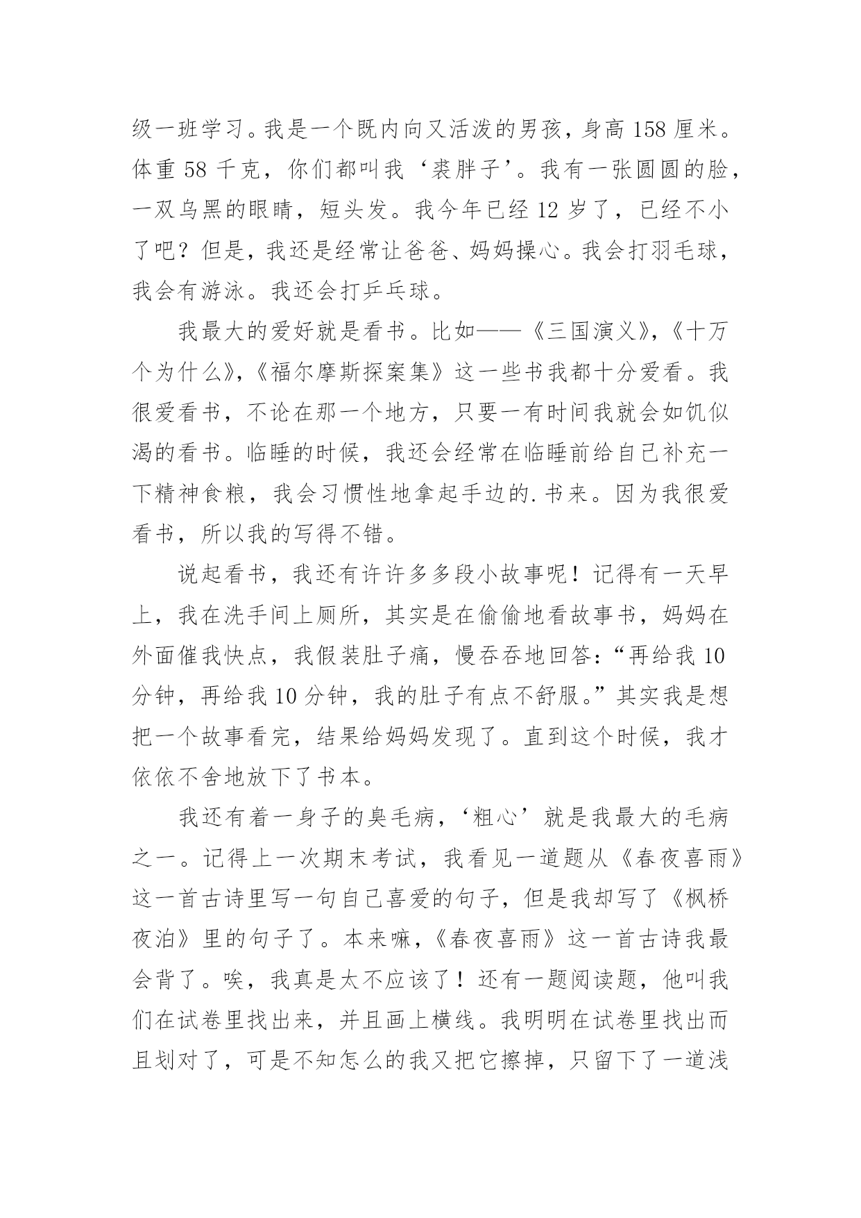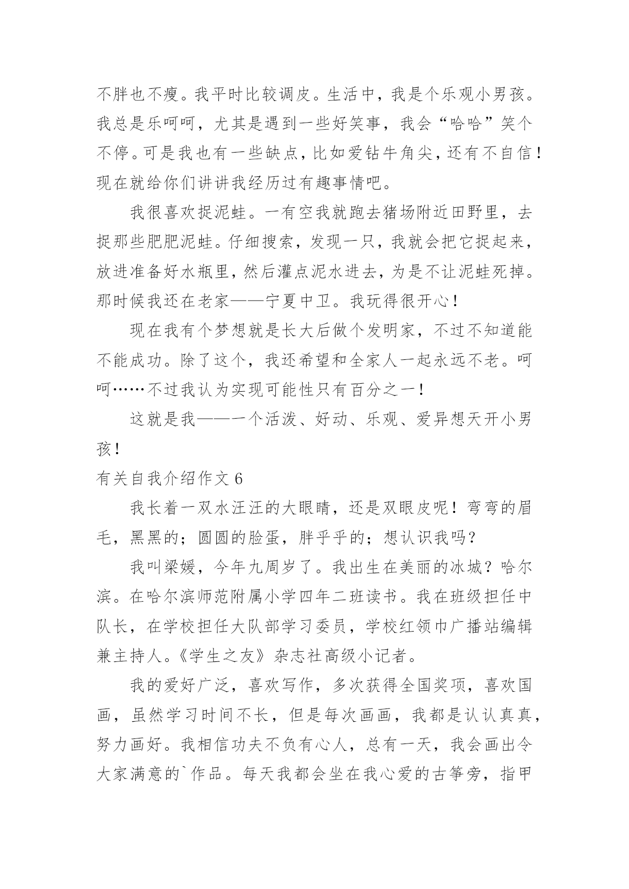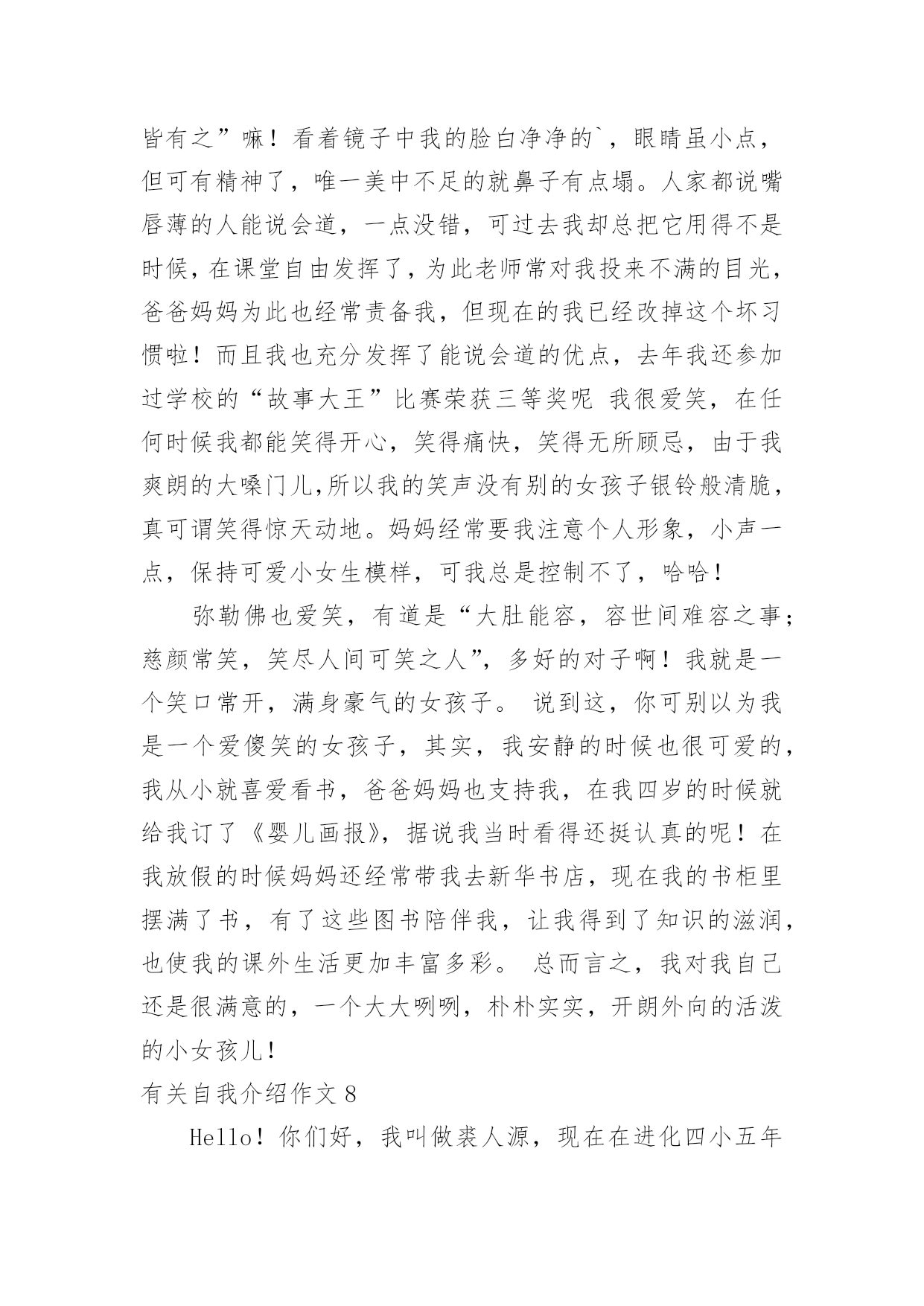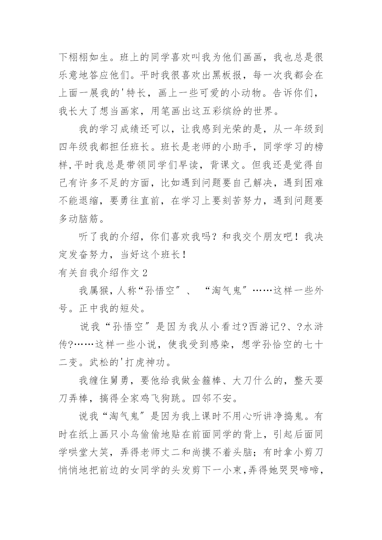 自我介绍作文有关自我介绍作文当到达一个陌生的环境后,我们总归要向他人介绍自己,自我介绍可以满足我们渴望得到尊重的心理。你所见过的自我介绍是什么样的呢?以下是小编为大家整理的有关自我介绍作文,仅供参考,大家一起来看看吧。有关自我介绍作文1Hello!大家好,我是一个活泼好动的小男孩,叫邹熠。我名字后面的这个字,很多人都会读错,告诉你们,这个字读yì,是代表光耀、鲜明的意思,不是有个成语叫“光彩熠熠”吗?爸爸妈妈为我取这个名字,就是希望我的一生像无数颗明亮的星星闪闪发亮。我今年11岁啦!上小学四年级,我是只机灵的“小老鼠”。人们都说老鼠胆小,爱偷东西吃,这可把我的形象给损坏了。你们看过动画片“猫和老鼠”吗?里面的小老鼠可机灵了,把猫整得可惨了,我就是这只可爱、机灵的“小老鼠”。我性格开朗,留着一个小平头,圆圆的脸上嵌着一双珍珠般的大眼睛,忽闪忽闪的,好像会说话。我爱好很多,画画,看书,下棋……我特别喜欢绘画,只要一有空,我就会拿起画笔,“高达”、“名侦探柯南”、“数码宝贝”在我的笔下栩栩如生。班上的同学喜欢叫我为他们画画,我也总是很乐意地答应他们。平时我很喜欢出黑板报,每一次我都会在上面一展我的'特长,画上一些可爱的小动物。告诉你们,我长大了想当画家,用笔画出这五彩缤纷的世界。我的学习成绩还可以,让我感到光荣的是,从一年级到四年级我都担任班长。班长是老师的小助手,同学学习的榜样,平时我总是带领同学们早读,背课文。但我还是觉得自己有许多不足的方面,比如遇到问题要自己解决,遇到困难不能退缩,要勇往直前,在学习上要刻苦努力,遇到问题要多动脑筋。听了我的介绍,你们喜欢我吗?和我交个朋友吧!我决定发奋努力,当好这个班长!有关自我介绍作文2我属猴,人称“孙悟空〞、“淘气鬼〞……这样一些外号。正中我的短处。说我“孙悟空〞是因为我从小看过?西游记?、?水浒传?……这样一些小说,使我受到感染,想学孙恰空的七十二变。武松的'打虎神功。我缠住舅勇,要他给我做金箍棒、大刀什么的,整天耍刀弄棒,搞得全家鸡飞狗跳。四邻不安。说我“淘气鬼〞是因为我上课时不用心听讲净捣鬼。有时在纸上画只小乌偷偷地贴在前面同学的背上,引起后面同学哄堂大笑,弄得老师丈二和尚摸不着头脑;有时拿小剪刀悄悄地把前边的女同学的头发剪下一小束,弄得她哭哭啼啼,我也下不了台。由于学习随随便便,作业马马虎虎,所以成绩总是中等偏下,常常弄得同学烦,老师火,家长恨。我还迷上了电子游戏,一放学就去玩,不到天黑不回家,还变着法儿骗家里的钱,今天说要交资料费,明天说要买书本。这样,不仅浪费了不少钱,而且视力也从1.5下降到0.5。现在想起,后侮不已。为此,我曾下决心改正自新,有几次我还偷偷地流过泪哩!要知道我是多么想改正这些缺点和锗误呀!同学,让我们交个知心朋友吧,希望得到你的帮助和支待。我决心自己编一个紧箍咒来约束自己言行,做一个既有本领又有规矩的小毛猴!我是一个对理想有着执着追求的人,坚信是金子总会发光。大学毕业后的工作,让我在文案筹划方面有了很大的提高,文笔流畅,熟悉传媒工作、广告学制作与设计等工作方面。为人热情,活泼,大方,本人好学上进,诚信、敬业、责任心强,有强烈的团体精神,对工作认真积极,严谨负责。有关自我介绍作文3同学们,大家好!我叫覃伯清,今年14岁。有一头乌黑而卷卷的头发,一双大大的眼睛,一个扁扁的鼻子,一张特别喜欢说笑话、爱笑的嘴巴,同学都说很搞笑。有两只灵巧的耳朵。我的爱好是喜欢打羽毛球,阅读课外书,爱唱歌。有很多缺点,优点倒没有多少。其中日常生活中最大的两个缺点就是粗心大意和上课的时候不想回答问题。记得有一次,在小学的时候,某天睡觉不知醒,奶奶叫醒,急急忙忙起床刷呀洗脸,急到连早餐也不吃了,拿起书包就跑去学校,到了学校打开书包想拿出语文书来读,但是语文书没有在书包里,这时才想起是昨晚写作业的时候忘记放入书包了。无论是在家,还是在学校,都是很粗心,这令在日常生活中带来很多不便。不知怎么的,在上课的时候,很不想回答问题。大概是因为的胆量不够大,一到回答问题的时候,的.心就砰砰直跳,自己既想回答问题又不敢站起来回答,只是看着别人回答问题时快乐样子。而只能在旁边羡慕别人,经常对自己说:“如果自己有别人一半的胆量该是多好啊!”一直都想改掉这个坏习惯,可是一直都不能实现。有时自己又想,不敢回答问题这个是不是的个性?但是,在学习中是不应该有这种问题存在的。希望同学们能够一起帮助改掉这个不好的毛病。从小就有一个愿望,就是长大后作一名出色的教师。为了能够实现这个愿望,从现在起,要好好的学习,在学习上遇到不懂的问题,要独立思考,思考不出来就问问同学或老师,一定要把它弄懂。同学们,希望在今后的日子们能够和睦相处,团结友爱,大家一起共同努力学习,争取拿个好成绩。有一个心愿,就是改掉粗心大意和上课不敢回
