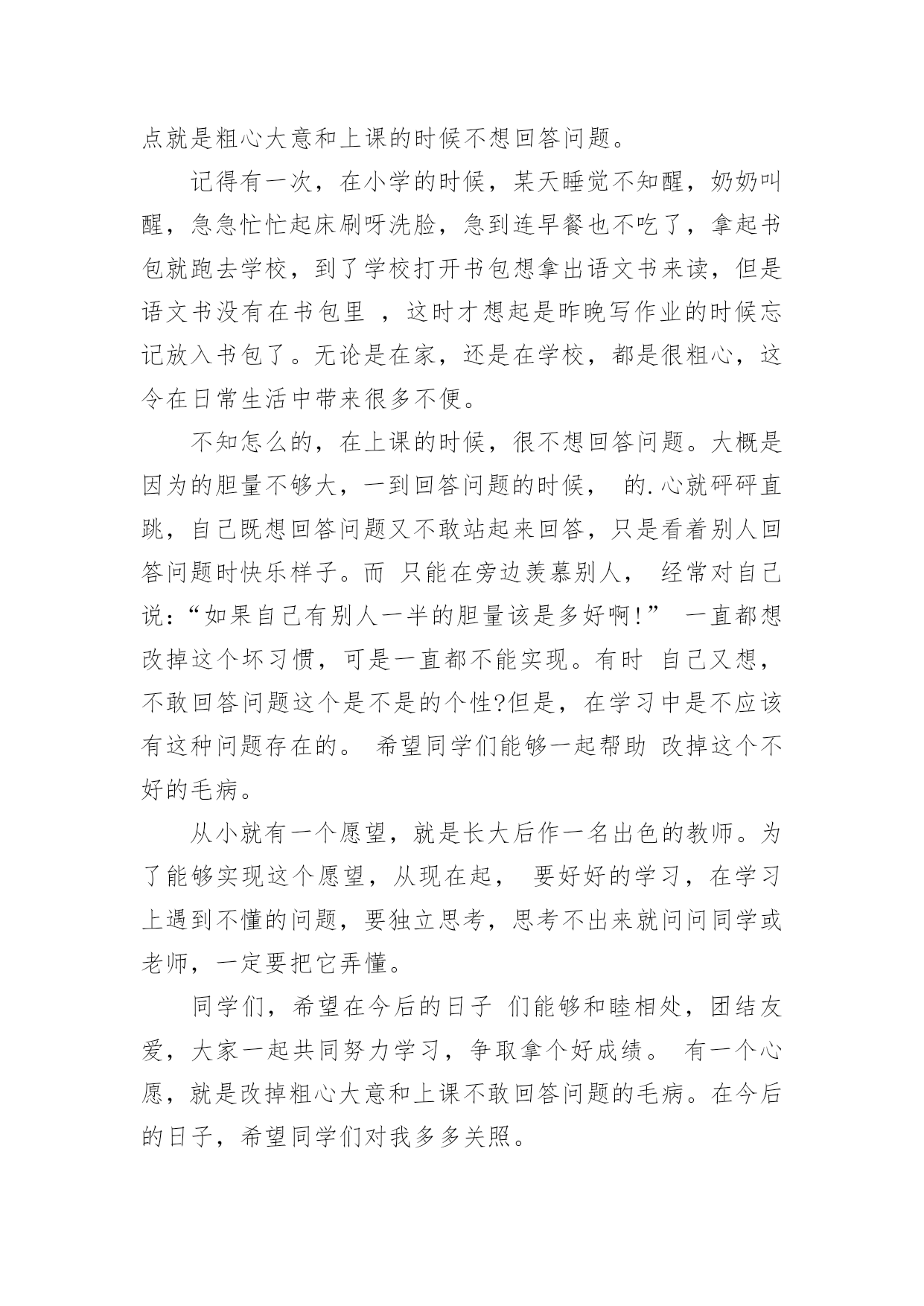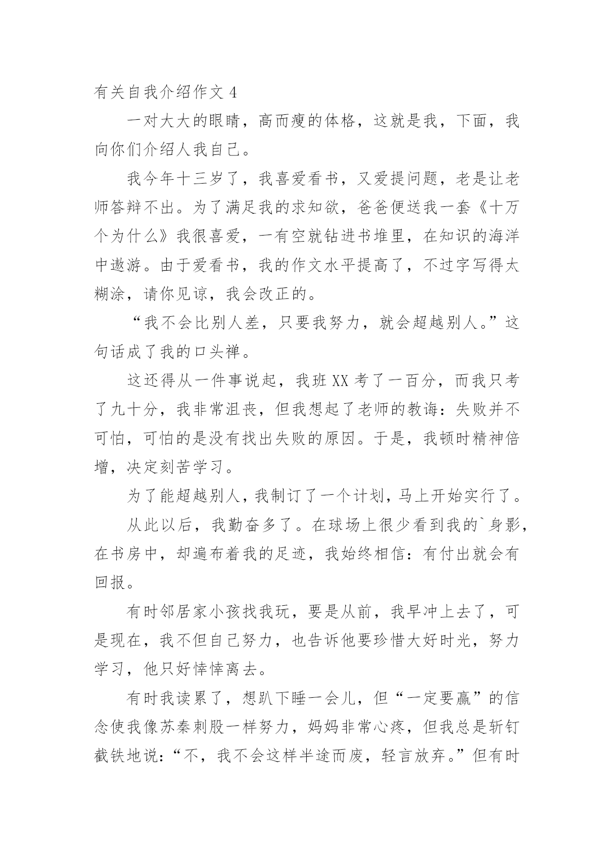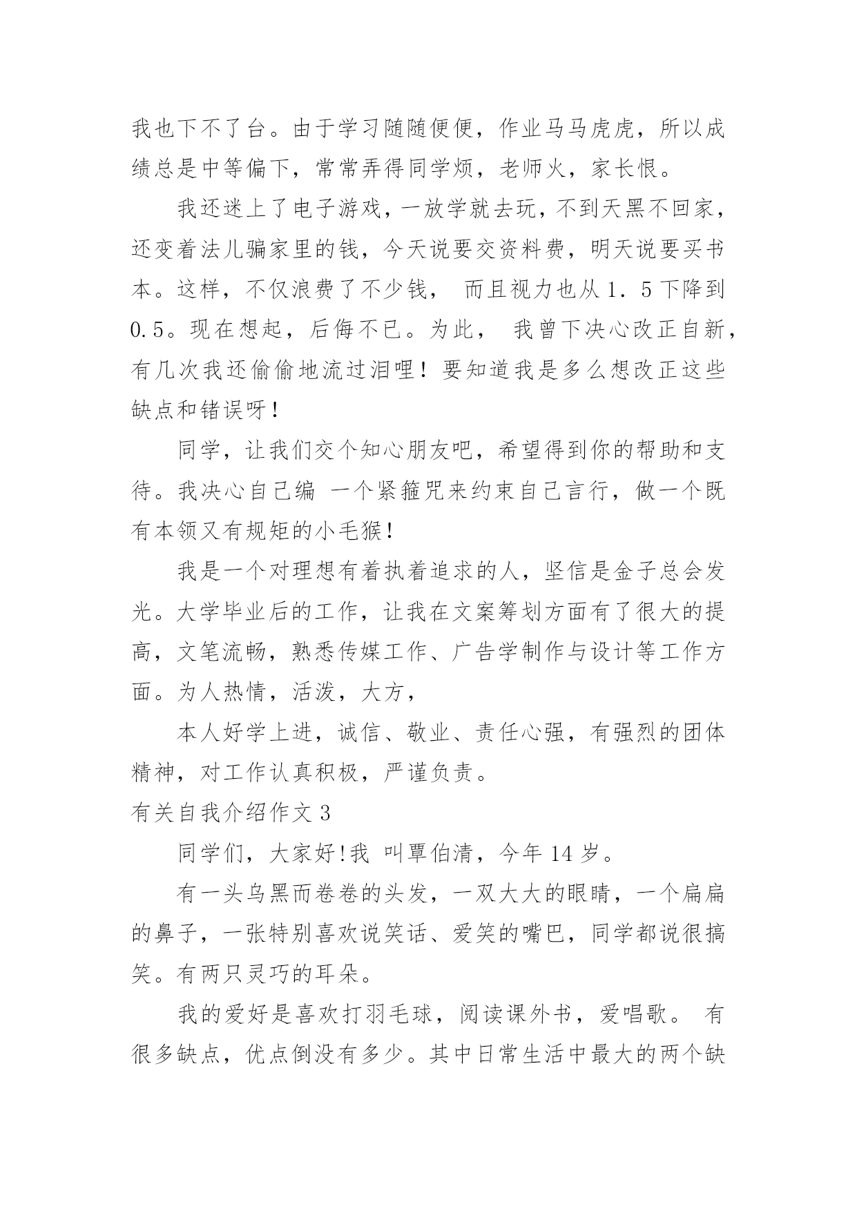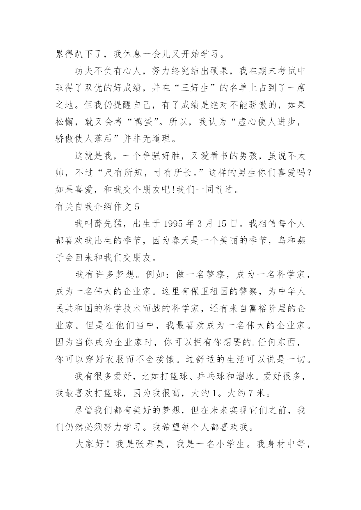 自我介绍作文有关自我介绍作文当到达一个陌生的环境后,我们总归要向他人介绍自己,自我介绍可以满足我们渴望得到尊重的心理。你所见过的自我介绍是什么样的呢?以下是小编为大家整理的有关自我介绍作文,仅供参考,大家一起来看看吧。有关自我介绍作文1Hello!大家好,我是一个活泼好动的小男孩,叫邹熠。我名字后面的这个字,很多人都会读错,告诉你们,这个字读yì,是代表光耀、鲜明的意思,不是有个成语叫“光彩熠熠”吗?爸爸妈妈为我取这个名字,就是希望我的一生像无数颗明亮的星星闪闪发亮。我今年11岁啦!上小学四年级,我是只机灵的“小老鼠”。人们都说老鼠胆小,爱偷东西吃,这可把我的形象给损坏了。你们看过动画片“猫和老鼠”吗?里面的小老鼠可机灵了,把猫整得可惨了,我就是这只可爱、机灵的“小老鼠”。我性格开朗,留着一个小平头,圆圆的脸上嵌着一双珍珠般的大眼睛,忽闪忽闪的,好像会说话。我爱好很多,画画,看书,下棋……我特别喜欢绘画,只要一有空,我就会拿起画笔,“高达”、“名侦探柯南”、“数码宝贝”在我的笔下栩栩如生。班上的同学喜欢叫我为他们画画,我也总是很乐意地答应他们。平时我很喜欢出黑板报,每一次我都会在上面一展我的'特长,画上一些可爱的小动物。告诉你们,我长大了想当画家,用笔画出这五彩缤纷的世界。我的学习成绩还可以,让我感到光荣的是,从一年级到四年级我都担任班长。班长是老师的小助手,同学学习的榜样,平时我总是带领同学们早读,背课文。但我还是觉得自己有许多不足的方面,比如遇到问题要自己解决,遇到困难不能退缩,要勇往直前,在学习上要刻苦努力,遇到问题要多动脑筋。听了我的介绍,你们喜欢我吗?和我交个朋友吧!我决定发奋努力,当好这个班长!有关自我介绍作文2我属猴,人称“孙悟空〞、“淘气鬼〞……这样一些外号。正中我的短处。说我“孙悟空〞是因为我从小看过?西游记?、?水浒传?……这样一些小说,使我受到感染,想学孙恰空的七十二变。武松的'打虎神功。我缠住舅勇,要他给我做金箍棒、大刀什么的,整天耍刀弄棒,搞得全家鸡飞狗跳。四邻不安。说我“淘气鬼〞是因为我上课时不用心听讲净捣鬼。有时在纸上画只小乌偷偷地贴在前面同学的背上,引起后面同学哄堂大笑,弄得老师丈二和尚摸不着头脑;有时拿小剪刀悄悄地把前边的女同学的头发剪下一小束,弄得她哭哭啼啼,我也下不了台。由于学习随随便便,作业马马虎虎,所以成绩总是中等偏下,常常弄得同学烦,老师火,家长恨。我还迷上了电子游戏,一放学就去玩,不到天黑不回家,还变着法儿骗家里的钱,今天说要交资料费,明天说要买书本。这样,不仅浪费了不少钱,而且视力也从1.5下降到0.5。现在想起,后侮不已。为此,我曾下决心改正自新,有几次我还偷偷地流过泪哩!要知道我是多么想改正这些缺点和锗误呀!同学,让我们交个知心朋友吧,希望得到你的帮助和支待。我决心自己编一个紧箍咒来约束自己言行,做一个既有本领又有规矩的小毛猴!我是一个对理想有着执着追求的人,坚信是金子总会发光。大学毕业后的工作,让我在文案筹划方面有了很大的提高,文笔流畅,熟悉传媒工作、广告学制作与设计等工作方面。为人热情,活泼,大方,本人好学上进,诚信、敬业、责任心强,有强烈的团体精神,对工作认真积极,严谨负责。有关自我介绍作文3同学们,大家好!我叫覃伯清,今年14岁。有一头乌黑而卷卷的头发,一双大大的眼睛,一个扁扁的鼻子,一张特别喜欢说笑话、爱笑的嘴巴,同学都说很搞笑。有两只灵巧的耳朵。我的爱好是喜欢打羽毛球,阅读课外书,爱唱歌。有很多缺点,优点倒没有多少。其中日常生活中最大的两个缺点就是粗心大意和上课的时候不想回答问题。记得有一次,在小学的时候,某天睡觉不知醒,奶奶叫醒,急急忙忙起床刷呀洗脸,急到连早餐也不吃了,拿起书包就跑去学校,到了学校打开书包想拿出语文书来读,但是语文书没有在书包里,这时才想起是昨晚写作业的时候忘记放入书包了。无论是在家,还是在学校,都是很粗心,这令在日常生活中带来很多不便。不知怎么的,在上课的时候,很不想回答问题。大概是因为的胆量不够大,一到回答问题的时候,的.心就砰砰直跳,自己既想回答问题又不敢站起来回答,只是看着别人回答问题时快乐样子。而只能在旁边羡慕别人,经常对自己说:“如果自己有别人一半的胆量该是多好啊!”一直都想改掉这个坏习惯,可是一直都不能实现。有时自己又想,不敢回答问题这个是不是的个性?但是,在学习中是不应该有这种问题存在的。希望同学们能够一起帮助改掉这个不好的毛病。从小就有一个愿望,就是长大后作一名出色的教师。为了能够实现这个愿望,从现在起,要好好的学习,在学习上遇到不懂的问题,要独立思考,思考不出来就问问同学或老师,一定要把它弄懂。同学们,希望在今后的日子们能够和睦相处,团结友爱,大家一起共同努力学习,争取拿个好成绩。有一个心愿,就是改掉粗心大意和上课不敢回