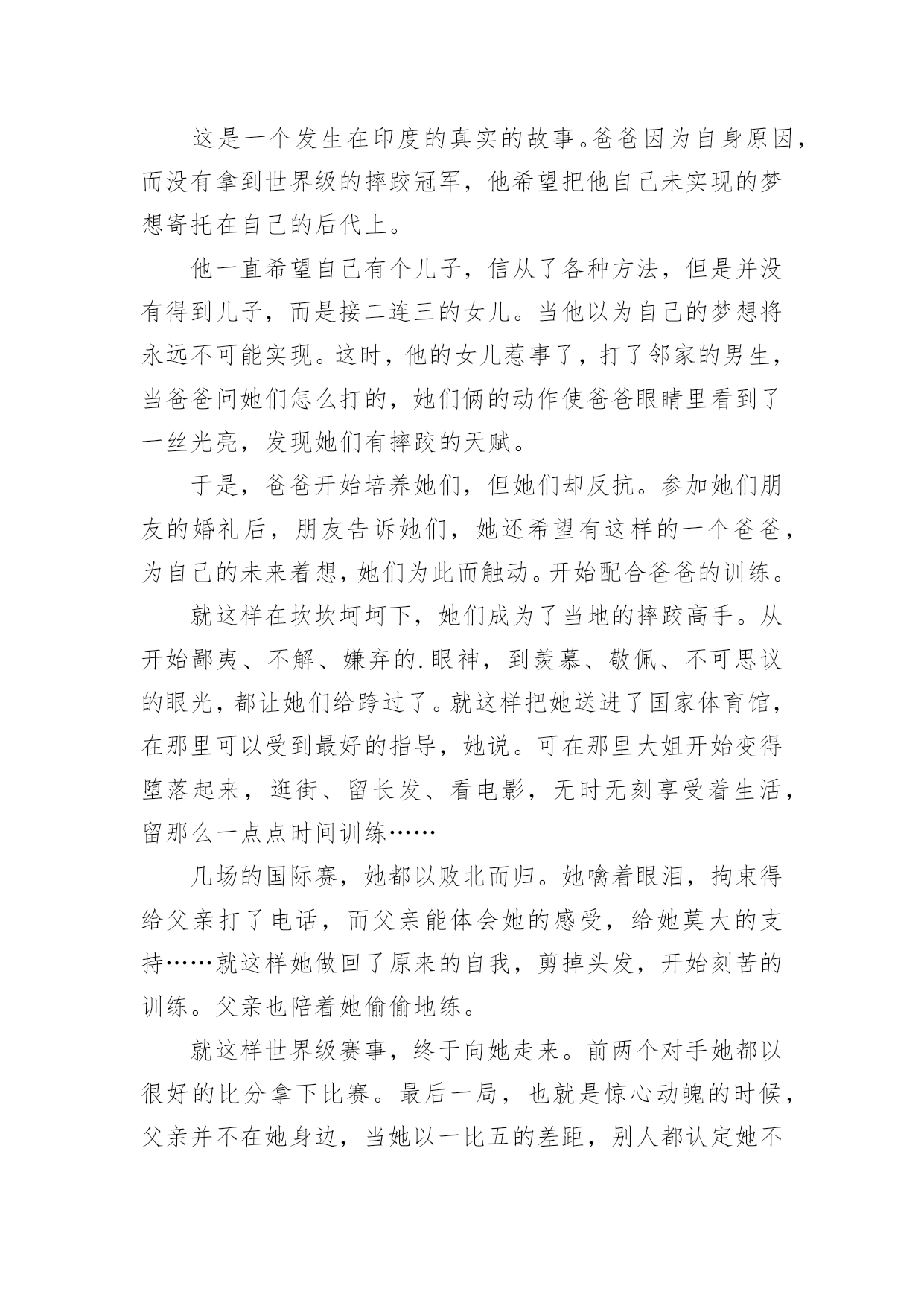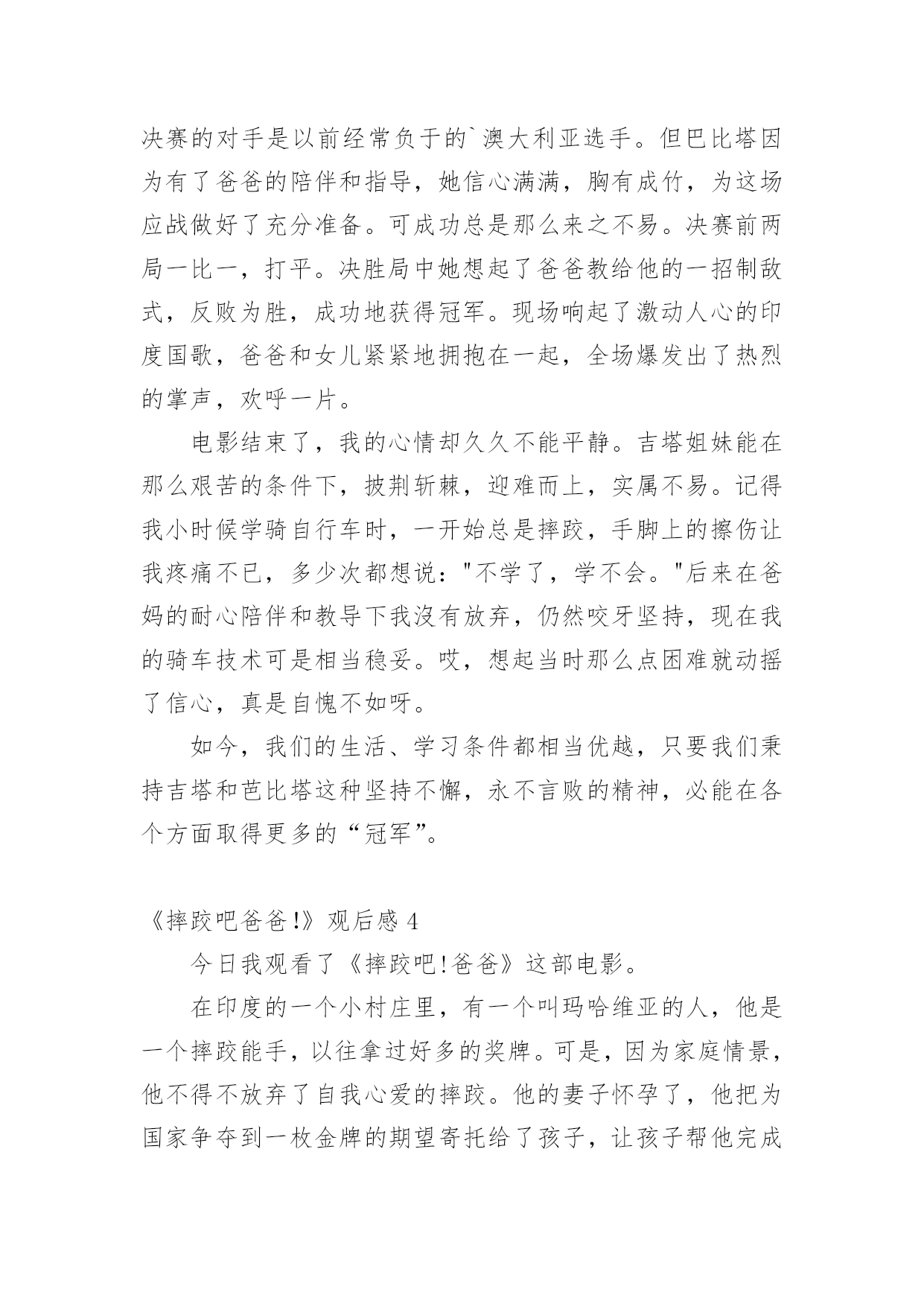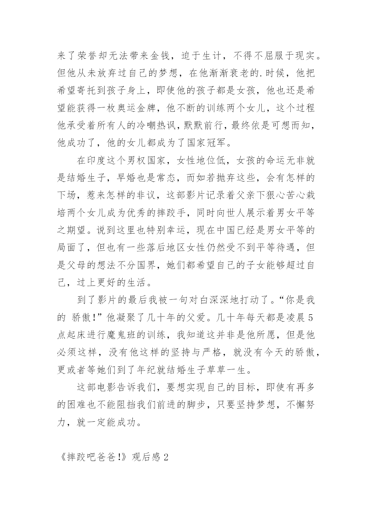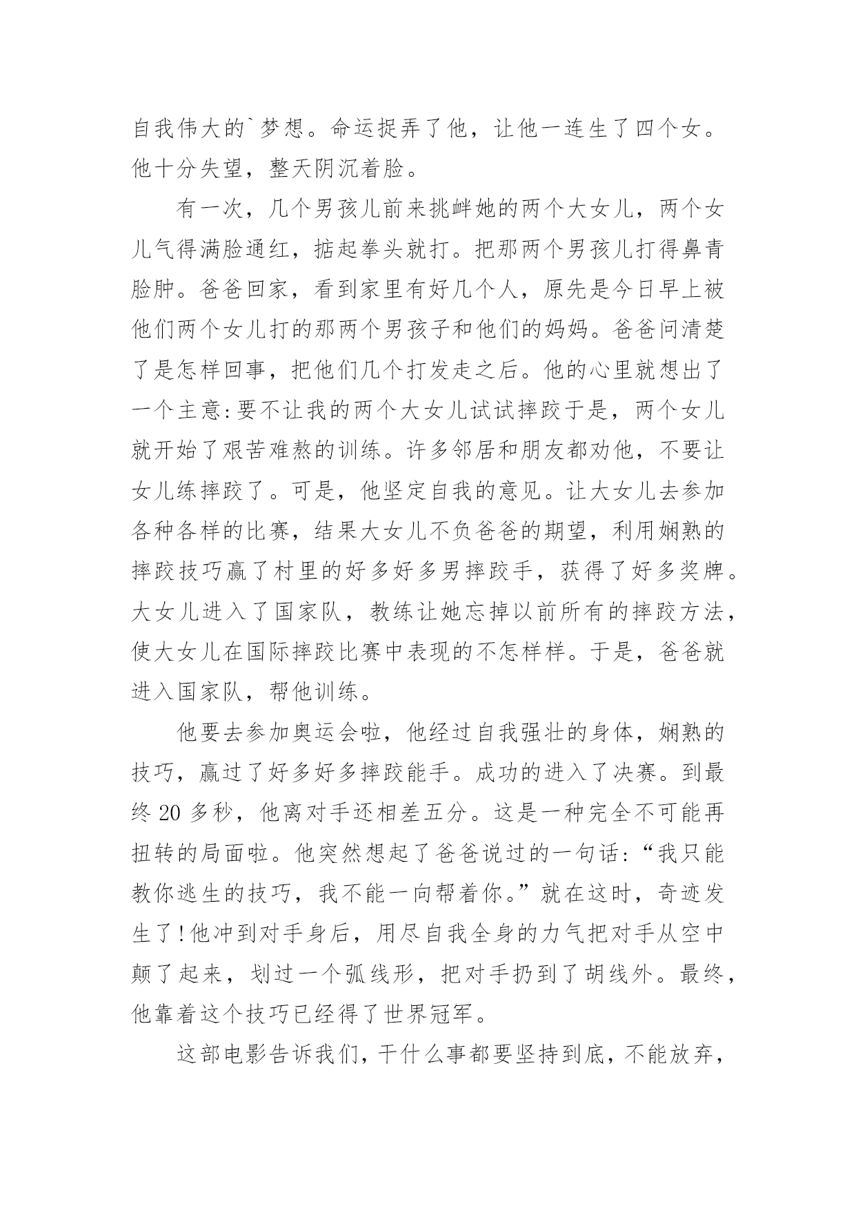 《摔跤吧爸爸!》观后感看完一部经典作品以后,相信大家增长不少见闻吧,不妨坐下来好好写写观后感吧。那么你真的懂得怎么写观后感吗?下面是小编帮大家整理的《摔跤吧爸爸!》观后感,仅供参考,欢迎大家阅读。《摔跤吧爸爸!》观后感1我是公司的一名普通员工,昨天下午我们包装组车间阻止观看了一部名为摔跤吧爸爸的印度电影,其实作为一个中年的普通工人,很少在有空闲时间去看电影,更何况是一部由从未听闻的外国演员主演的,于是刚开始的时候心里没有任何期待。但是我错了,影片开始了短短几分钟我便被剧中严厉的父亲形象所吸引,剧情并不是那种大开大飞的剧情,也正是因为这种平民般的剧情更容易使人产生代人感,我也是一名父亲,同样是两个女儿的父亲,剧中父亲的想法也正是我的想法。这部影片全面展示了如今社会的平民状况,更显的而亲切,这样的无距离感使得每一个人就如同看身边的普通人的故事一样。虽然这部电影使人没有距离感,但是这部电影对我的影响很大,我看到了一位父亲对梦想的不懈追求和对女儿无私的爱。影片叙述的是一个国家冠军摔跤手因为摔跤只给他带来了荣誉却无法带来金钱,迫于生计,不得不屈服于现实。但他从未放弃过自己的梦想,在他渐渐衰老的.时候,他把希望寄托到孩子身上,即使他的孩子都是女孩,他也还是希望能获得一枚奥运金牌,他不断的训练两个女儿,这个过程他承受着所有人的冷嘲热讽,默默前行,最终依是可想而知,他成功了,他的女儿都成为了国家冠军。在印度这个男权国家,女性地位低,女孩的命运无非就是结婚生子,早婚也是常态,而如若抛弃这些,会有怎样的下场,惹来怎样的非议,这部影片记录着父亲下狠心苦心栽培两个女儿成为优秀的摔跤手,同时向世人展示着男女平等之期望。说到这里也特别幸运,现在中国已经是男女平等的局面了,但也有一些落后地区女性仍然受不到平等待遇,但是父母的想法不分国界,她们都希望自己的子女能够超过自己,过上更好的生活。到了影片的最后我被一句对白深深地打动了。“你是我的骄傲!”他凝聚了几十年的父爱。几十年每天都是凌晨5点起床进行魔鬼班的训练,我知道这并非是他所愿,但是他必须这样,没有他这样的坚持与严格,就没有今天的骄傲,更或者等她们到了年纪就结婚生子草草一生。这部电影告诉我们,要想实现自己的目标,即使有再多的困难也不能阻挡我们前进的脚步,只要坚持梦想,不懈努力,就一定能成功。《摔跤吧爸爸!》观后感2这是一个发生在印度的真实的故事。爸爸因为自身原因,而没有拿到世界级的摔跤冠军,他希望把他自己未实现的梦想寄托在自己的后代上。他一直希望自己有个儿子,信从了各种方法,但是并没有得到儿子,而是接二连三的女儿。当他以为自己的梦想将永远不可能实现。这时,他的女儿惹事了,打了邻家的男生,当爸爸问她们怎么打的,她们俩的动作使爸爸眼睛里看到了一丝光亮,发现她们有摔跤的天赋。于是,爸爸开始培养她们,但她们却反抗。参加她们朋友的婚礼后,朋友告诉她们,她还希望有这样的一个爸爸,为自己的未来着想,她们为此而触动。开始配合爸爸的训练。就这样在坎坎坷坷下,她们成为了当地的摔跤高手。从开始鄙夷、不解、嫌弃的.眼神,到羡慕、敬佩、不可思议的眼光,都让她们给跨过了。就这样把她送进了国家体育馆,在那里可以受到最好的指导,她说。可在那里大姐开始变得堕落起来,逛街、留长发、看电影,无时无刻享受着生活,留那么一点点时间训练……几场的国际赛,她都以败北而归。她噙着眼泪,拘束得给父亲打了电话,而父亲能体会她的感受,给她莫大的支持……就这样她做回了原来的自我,剪掉头发,开始刻苦的训练。父亲也陪着她偷偷地练。就这样世界级赛事,终于向她走来。前两个对手她都以很好的比分拿下比赛。最后一局,也就是惊心动魄的时候,父亲并不在她身边,当她以一比五的差距,别人都认定她不可能成功的时候,她想起爸爸的话:孩子爸爸不可能随时随地的保护你,最关键的时候还是要靠自己,然而她又想起爸爸说的五分那一个高难度的动作,这个五分很难,但不是不肯能……她做到了,赢得了世界冠军,被关在屋子里的爸爸听到国歌声,眼里留下了感动的泪水。他快速的冲进赛场,抱住女儿:你是爸爸的骄傲!这个摔跤手多么不容易啊!历经沧桑、历经坎坷,如同西天取经般的困难,最后她做到了。人生就是这样的非凡,在逆境中成长。《摔跤吧爸爸!》观后感3前几天,我去看了一场电影――《摔跤吧,爸爸》。故事讲述了这样的一个故事:印度女孩吉塔和巴比塔的爸爸在还没生下她们之前,一直希望生个儿子,因为他是一个摔跤手,曾经拿过全国冠军,他想把儿子培养成世界冠军,实现他的梦想。可惜他生了三个都是女儿,但是后来他无意中发现两个大女儿不仅会打,而且还打得有招有式,于是他下定决心一定要把女儿们培养成专业的摔跤手。没多久,吉塔和巴比塔就被高强度的魔鬼训练折磨得叫苦连天,甚至想方设法来逃避训练,结果被爸爸严惩,剪掉了那美丽的秀发。经过刻苦的训