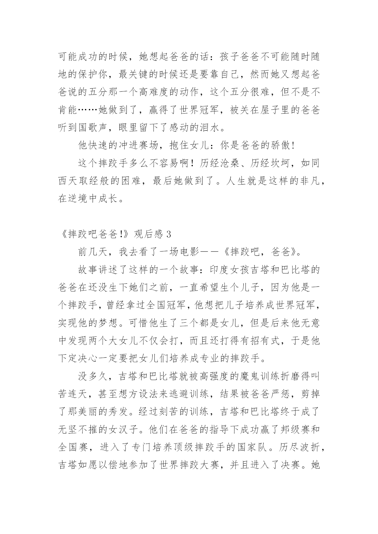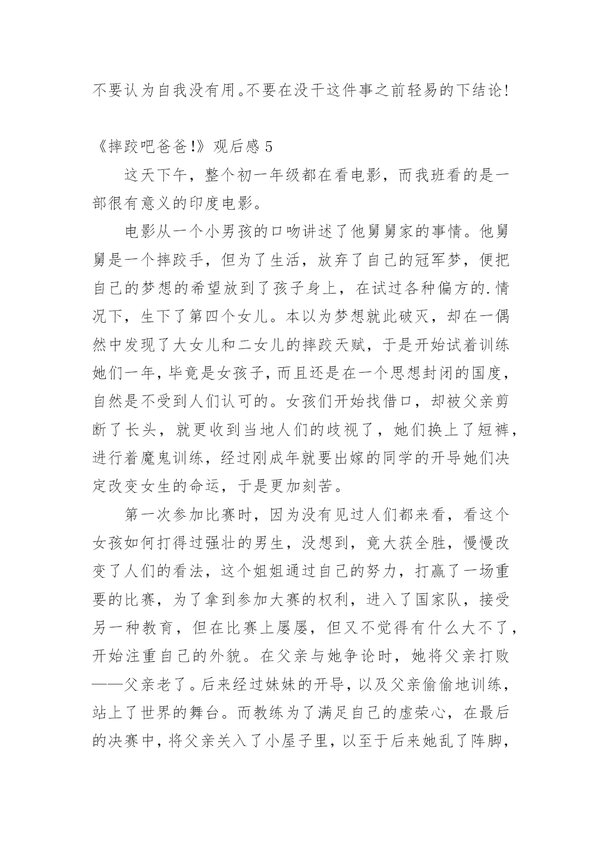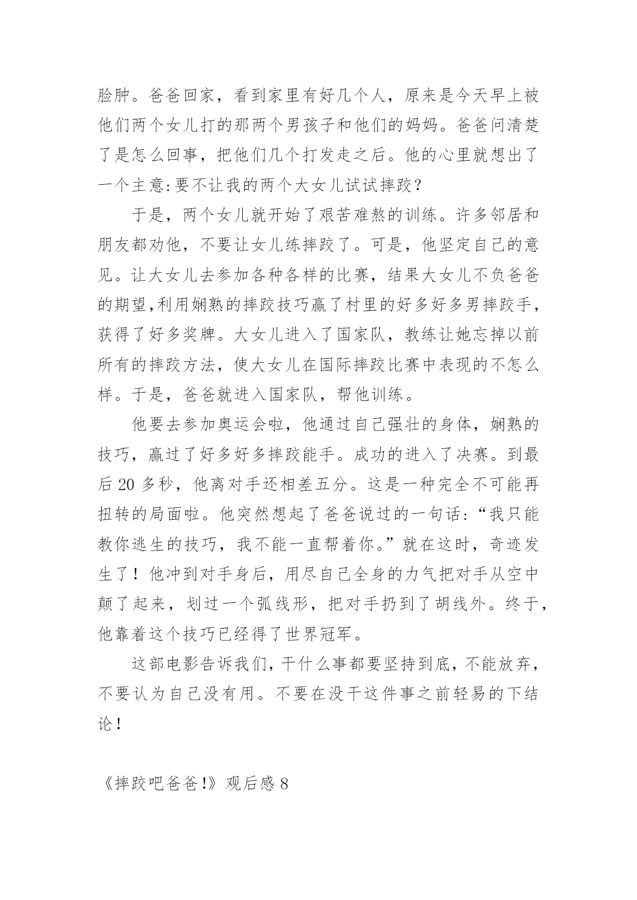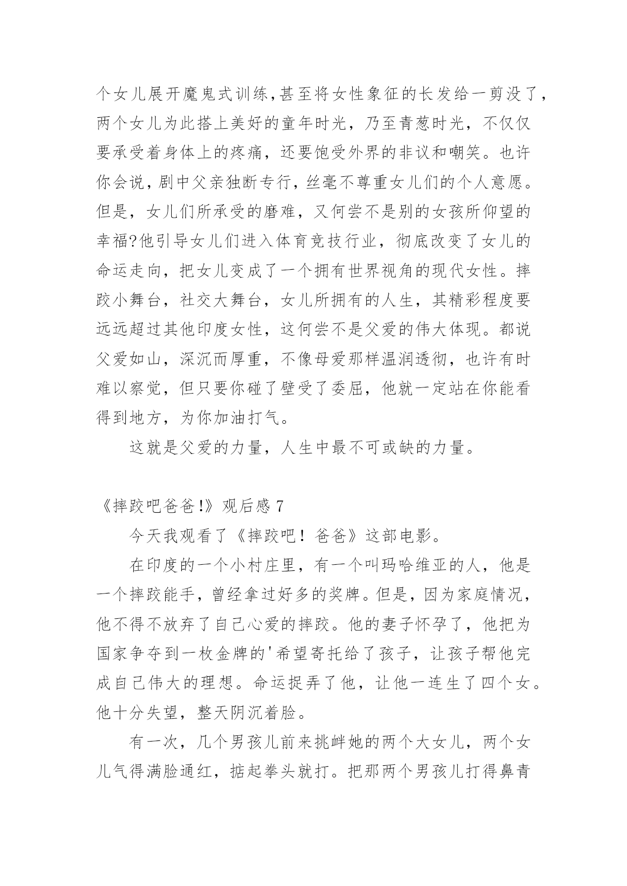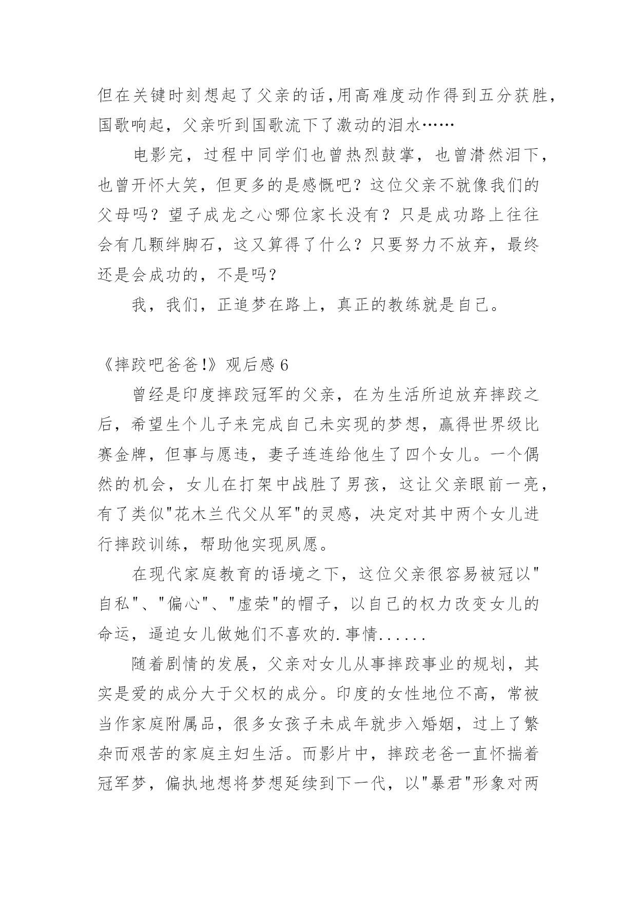 《摔跤吧爸爸!》观后感看完一部经典作品以后,相信大家增长不少见闻吧,不妨坐下来好好写写观后感吧。那么你真的懂得怎么写观后感吗?下面是小编帮大家整理的《摔跤吧爸爸!》观后感,仅供参考,欢迎大家阅读。《摔跤吧爸爸!》观后感1我是公司的一名普通员工,昨天下午我们包装组车间阻止观看了一部名为摔跤吧爸爸的印度电影,其实作为一个中年的普通工人,很少在有空闲时间去看电影,更何况是一部由从未听闻的外国演员主演的,于是刚开始的时候心里没有任何期待。但是我错了,影片开始了短短几分钟我便被剧中严厉的父亲形象所吸引,剧情并不是那种大开大飞的剧情,也正是因为这种平民般的剧情更容易使人产生代人感,我也是一名父亲,同样是两个女儿的父亲,剧中父亲的想法也正是我的想法。这部影片全面展示了如今社会的平民状况,更显的而亲切,这样的无距离感使得每一个人就如同看身边的普通人的故事一样。虽然这部电影使人没有距离感,但是这部电影对我的影响很大,我看到了一位父亲对梦想的不懈追求和对女儿无私的爱。影片叙述的是一个国家冠军摔跤手因为摔跤只给他带来了荣誉却无法带来金钱,迫于生计,不得不屈服于现实。但他从未放弃过自己的梦想,在他渐渐衰老的.时候,他把希望寄托到孩子身上,即使他的孩子都是女孩,他也还是希望能获得一枚奥运金牌,他不断的训练两个女儿,这个过程他承受着所有人的冷嘲热讽,默默前行,最终依是可想而知,他成功了,他的女儿都成为了国家冠军。在印度这个男权国家,女性地位低,女孩的命运无非就是结婚生子,早婚也是常态,而如若抛弃这些,会有怎样的下场,惹来怎样的非议,这部影片记录着父亲下狠心苦心栽培两个女儿成为优秀的摔跤手,同时向世人展示着男女平等之期望。说到这里也特别幸运,现在中国已经是男女平等的局面了,但也有一些落后地区女性仍然受不到平等待遇,但是父母的想法不分国界,她们都希望自己的子女能够超过自己,过上更好的生活。到了影片的最后我被一句对白深深地打动了。“你是我的骄傲!”他凝聚了几十年的父爱。几十年每天都是凌晨5点起床进行魔鬼班的训练,我知道这并非是他所愿,但是他必须这样,没有他这样的坚持与严格,就没有今天的骄傲,更或者等她们到了年纪就结婚生子草草一生。这部电影告诉我们,要想实现自己的目标,即使有再多的困难也不能阻挡我们前进的脚步,只要坚持梦想,不懈努力,就一定能成功。《摔跤吧爸爸!》观后感2这是一个发生在印度的真实的故事。爸爸因为自身原因,而没有拿到世界级的摔跤冠军,他希望把他自己未实现的梦想寄托在自己的后代上。他一直希望自己有个儿子,信从了各种方法,但是并没有得到儿子,而是接二连三的女儿。当他以为自己的梦想将永远不可能实现。这时,他的女儿惹事了,打了邻家的男生,当爸爸问她们怎么打的,她们俩的动作使爸爸眼睛里看到了一丝光亮,发现她们有摔跤的天赋。于是,爸爸开始培养她们,但她们却反抗。参加她们朋友的婚礼后,朋友告诉她们,她还希望有这样的一个爸爸,为自己的未来着想,她们为此而触动。开始配合爸爸的训练。就这样在坎坎坷坷下,她们成为了当地的摔跤高手。从开始鄙夷、不解、嫌弃的.眼神,到羡慕、敬佩、不可思议的眼光,都让她们给跨过了。就这样把她送进了国家体育馆,在那里可以受到最好的指导,她说。可在那里大姐开始变得堕落起来,逛街、留长发、看电影,无时无刻享受着生活,留那么一点点时间训练……几场的国际赛,她都以败北而归。她噙着眼泪,拘束得给父亲打了电话,而父亲能体会她的感受,给她莫大的支持……就这样她做回了原来的自我,剪掉头发,开始刻苦的训练。父亲也陪着她偷偷地练。就这样世界级赛事,终于向她走来。前两个对手她都以很好的比分拿下比赛。最后一局,也就是惊心动魄的时候,父亲并不在她身边,当她以一比五的差距,别人都认定她不可能成功的时候,她想起爸爸的话:孩子爸爸不可能随时随地的保护你,最关键的时候还是要靠自己,然而她又想起爸爸说的五分那一个高难度的动作,这个五分很难,但不是不肯能……她做到了,赢得了世界冠军,被关在屋子里的爸爸听到国歌声,眼里留下了感动的泪水。他快速的冲进赛场,抱住女儿:你是爸爸的骄傲!这个摔跤手多么不容易啊!历经沧桑、历经坎坷,如同西天取经般的困难,最后她做到了。人生就是这样的非凡,在逆境中成长。《摔跤吧爸爸!》观后感3前几天,我去看了一场电影――《摔跤吧,爸爸》。故事讲述了这样的一个故事:印度女孩吉塔和巴比塔的爸爸在还没生下她们之前,一直希望生个儿子,因为他是一个摔跤手,曾经拿过全国冠军,他想把儿子培养成世界冠军,实现他的梦想。可惜他生了三个都是女儿,但是后来他无意中发现两个大女儿不仅会打,而且还打得有招有式,于是他下定决心一定要把女儿们培养成专业的摔跤手。没多久,吉塔和巴比塔就被高强度的魔鬼训练折磨得叫苦连天,甚至想方设法来逃避训练,结果被爸爸严惩,剪掉了那美丽的秀发。经过刻苦的训