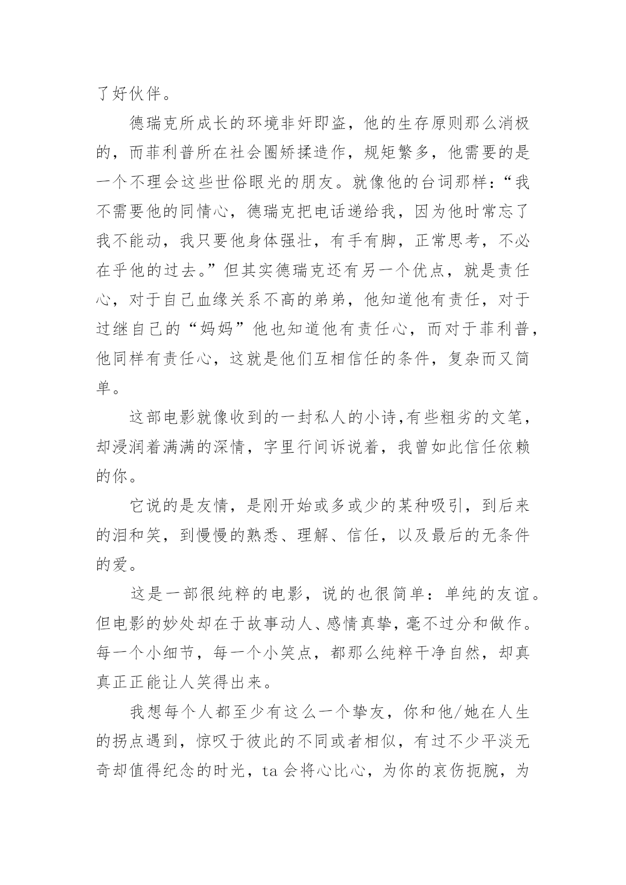 《触不可及》观后感当认真看完一部影视作品后,相信大家有很多值得分享的东西吧,写一份观后感,记录收获与付出。那么你真的会写观后感吗?以下是小编为大家整理的《触不可及》观后感,仅供参考,希望能够帮助到大家。付出总能点燃生活,带来温暖。在爱好、性格甚至整个世界都没有交集的两个人,只因人性的尊重和那些略带邪恶的笑容,就足以成就一份难以割舍的友情。看完后才察觉片名之意,现实所能触及的大都是那些自私的、吹嘘的.、功利的……而那种难以触及的真诚,吾将继续虔诚信仰。其实联系太多并不一定是最糟的原因,关键是联系的动机。当你不想从他身上获取任何东西(包括驱赶寂寞),却还是愿意跟他保持联系时,那应该才是真的朋友吧。知心,不是只有他知你,或者只有你知他,而是彼此互相知心,交谈之间不必害怕会说错什么话会伤害对方,而能知道对方真正需要些什么,人生得一如此知己,足矣!但是,这都是有条件的。条件非常苛刻。既然要知心便没有任何障碍,不涉及触及底线的领域,彼此之间甚至可能是完全不同的两个世界。触不可及,多恰到好处的名字。德瑞克和菲利普在身边都没有自己的知己,反而是两个完全不在同一世界的人成为了好伙伴。德瑞克所成长的环境非奸即盗,他的生存原则那么消极的,而菲利普所在社会圈矫揉造作,规矩繁多,他需要的是一个不理会这些世俗眼光的朋友。就像他的台词那样:“我不需要他的同情心,德瑞克把电话递给我,因为他时常忘了我不能动,我只要他身体强壮,有手有脚,正常思考,不必在乎他的过去。”但其实德瑞克还有另一个优点,就是责任心,对于自己血缘关系不高的弟弟,他知道他有责任,对于过继自己的“妈妈”他也知道他有责任心,而对于菲利普,他同样有责任心,这就是他们互相信任的条件,复杂而又简单。这部电影就像收到的一封私人的小诗,有些粗劣的文笔,却浸润着满满的深情,字里行间诉说着,我曾如此信任依赖的你。它说的是友情,是刚开始或多或少的某种吸引,到后来的泪和笑,到慢慢的熟悉、理解、信任,以及最后的无条件的爱。这是一部很纯粹的电影,说的也很简单:单纯的友谊。但电影的妙处却在于故事动人、感情真挚,毫不过分和做作。每一个小细节,每一个小笑点,都那么纯粹干净自然,却真真正正能让人笑得出来。我想每个人都至少有这么一个挚友,你和他/她在人生的拐点遇到,惊叹于彼此的不同或者相似,有过不少平淡无奇却值得纪念的时光,ta会将心比心,为你的哀伤扼腕,为你的快慰击节,更会在ta的心里,为你留下那么一块永恒的位置,任白云苍狗,风云变幻。只叹今生,得缘遇见你。