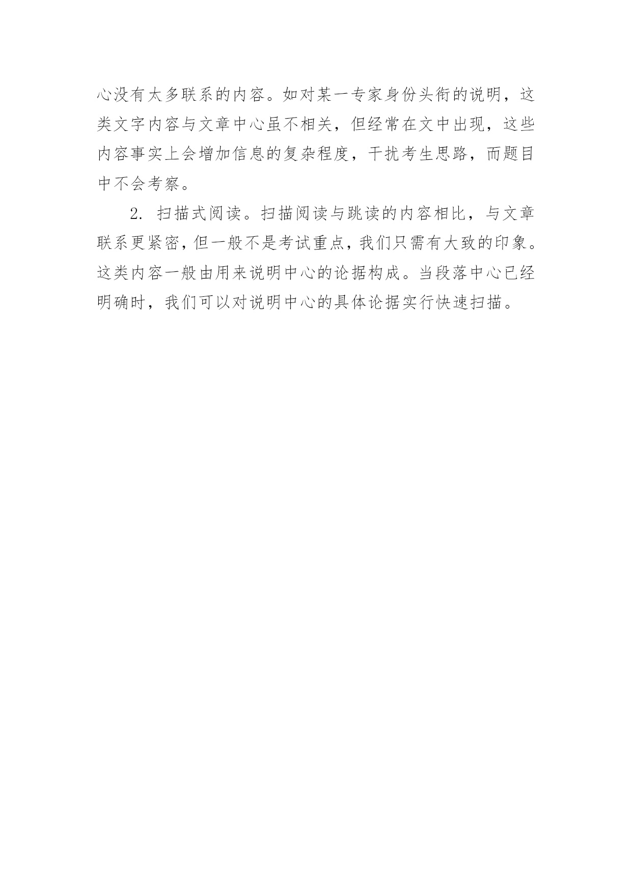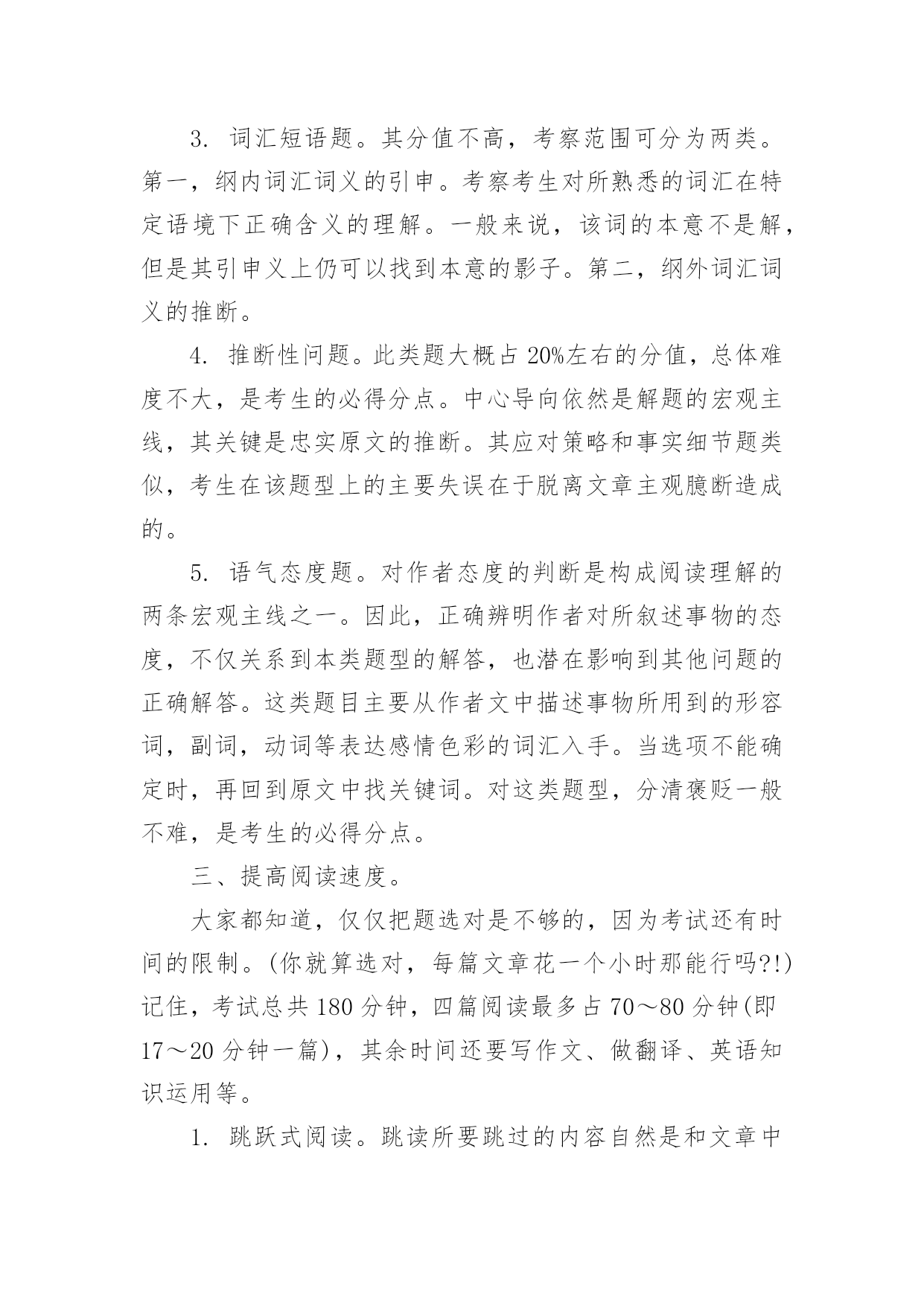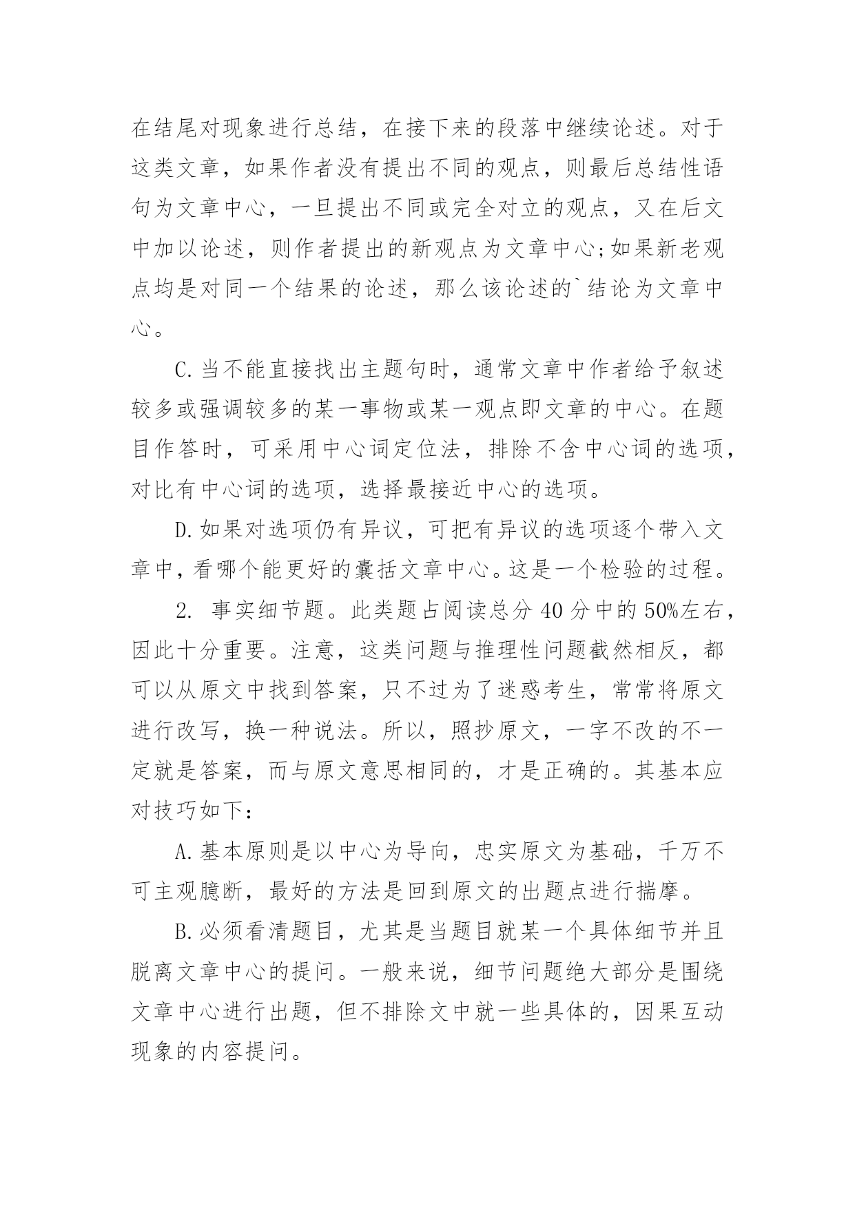 英语考试的阅读技巧英语考试的阅读技巧英语考试中阅读的考试是少不了的,而相关的英语阅读技巧又有哪些呢?下面是小编想跟大家分享的英语考试的阅读技巧,欢迎大家浏览。一、通读全文,注重理解。阅读理解其实主要考的是"阅读"之后的"理解"。任何一篇文章,若要能看懂它,至少需要两个条件:认识单词和看明白句子。考研词汇大约为5500个,这不是一个小数字,也并非三两天时间可以记住的,所以,考生必须先买一本考研英语词汇书进行系统、长期的学习和记忆。除单词外,有时句子太长也会对阅读造成致命的伤害。这就要求同学们在日常学习英语的过程中,注意长难句的分析,记住一些固定的搭配,熟悉掌握句子结构。二、了解题型。阅读理解的问题基本分为五大类:1.主旨大意题。这类题实质考察考生对中心思想的理解,难度不高,具体应对技巧如下:A.关注各段落首句,尤其是第一段首句,这与西方人思维相关,他们习惯开门见山表达出自己的观点,然后广泛引用材料去论述。因此,一般而言首段的首句构成文章的中心句,而各段的首句构成各段的中心。B.关注首段末句。有些作者习惯先列出一些传统的观点或先对一些具体现象进行说明,然后提出与之不同的观点或在结尾对现象进行总结,在接下来的段落中继续论述。对于这类文章,如果作者没有提出不同的观点,则最后总结性语句为文章中心,一旦提出不同或完全对立的观点,又在后文中加以论述,则作者提出的新观点为文章中心;如果新老观点均是对同一个结果的论述,那么该论述的`结论为文章中心。C.当不能直接找出主题句时,通常文章中作者给予叙述较多或强调较多的某一事物或某一观点即文章的中心。在题目作答时,可采用中心词定位法,排除不含中心词的选项,对比有中心词的选项,选择最接近中心的选项。D.如果对选项仍有异议,可把有异议的选项逐个带入文章中,看哪个能更好的囊括文章中心。这是一个检验的过程。2.事实细节题。此类题占阅读总分40分中的50%左右,因此十分重要。注意,这类问题与推理性问题截然相反,都可以从原文中找到答案,只不过为了迷惑考生,常常将原文进行改写,换一种说法。所以,照抄原文,一字不改的不一定就是答案,而与原文意思相同的,才是正确的。其基本应对技巧如下:A.基本原则是以中心为导向,忠实原文为基础,千万不可主观臆断,最好的方法是回到原文的出题点进行揣摩。B.必须看清题目,尤其是当题目就某一个具体细节并且脱离文章中心的提问。一般来说,细节问题绝大部分是围绕文章中心进行出题,但不排除文中就一些具体的,因果互动现象的内容提问。3.词汇短语题。其分值不高,考察范围可分为两类。第一,纲内词汇词义的引申。考察考生对所熟悉的词汇在特定语境下正确含义的理解。一般来说,该词的本意不是解,但是其引申义上仍可以找到本意的影子。第二,纲外词汇词义的推断。4.推断性问题。此类题大概占20%左右的分值,总体难度不大,是考生的必得分点。中心导向依然是解题的宏观主线,其关键是忠实原文的推断。其应对策略和事实细节题类似,考生在该题型上的主要失误在于脱离文章主观臆断造成的。5.语气态度题。对作者态度的判断是构成阅读理解的两条宏观主线之一。因此,正确辨明作者对所叙述事物的态度,不仅关系到本类题型的解答,也潜在影响到其他问题的正确解答。这类题目主要从作者文中描述事物所用到的形容词,副词,动词等表达感情色彩的词汇入手。当选项不能确定时,再回到原文中找关键词。对这类题型,分清褒贬一般不难,是考生的必得分点。三、提高阅读速度。大家都知道,仅仅把题选对是不够的,因为考试还有时间的限制。(你就算选对,每篇文章花一个小时那能行吗?!)记住,考试总共180分钟,四篇阅读最多占70~80分钟(即17~20分钟一篇),其余时间还要写作文、做翻译、英语知识运用等。1.跳跃式阅读。跳读所要跳过的内容自然是和文章中心没有太多联系的内容。如对某一专家身份头衔的说明,这类文字内容与文章中心虽不相关,但经常在文中出现,这些内容事实上会增加信息的复杂程度,干扰考生思路,而题目中不会考察。2.扫描式阅读。扫描阅读与跳读的内容相比,与文章联系更紧密,但一般不是考试重点,我们只需有大致的印象。这类内容一般由用来说明中心的论据构成。当段落中心已经明确时,我们可以对说明中心的具体论据实行快速扫描。