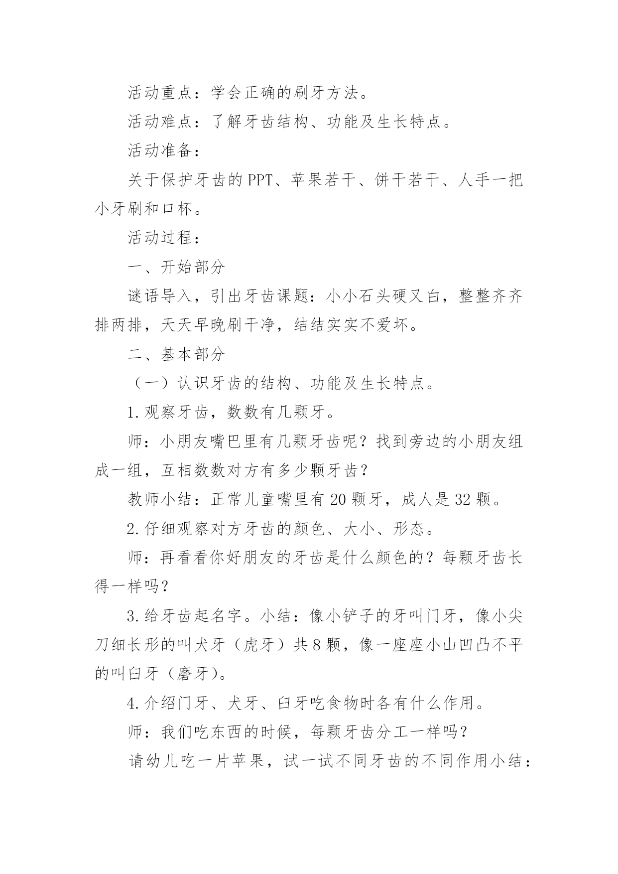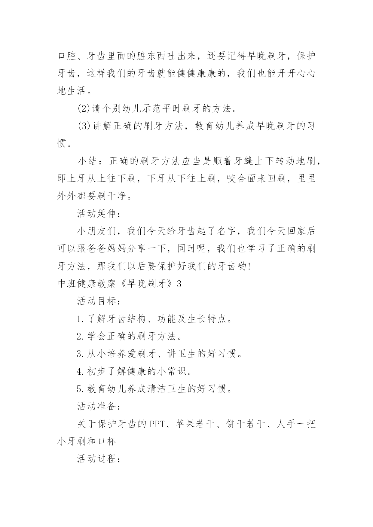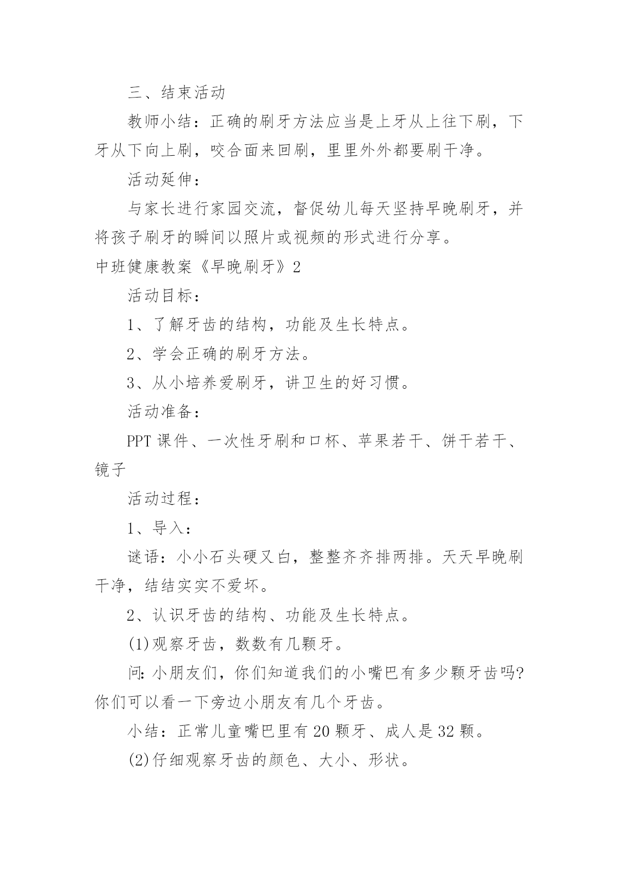 中班健康教案《早晚刷牙》中班健康教案《早晚刷牙》作为一位杰出的教职工,很有必要精心设计一份教案,借助教案可以提高教学质量,收到预期的教学效果。那么应当如何写教案呢?以下是小编整理的中班健康教案《早晚刷牙》,供大家参考借鉴,希望可以帮助到有需要的朋友。中班健康教案《早晚刷牙》1设计意图:在幼儿园,有很多幼儿家长会跟老师反应说自己的孩子比较贪吃,但是不喜欢刷牙,不知道如何保护牙齿,希望老师能帮忙教育一下。对于中班的幼儿来说,自我控制力发展不完善,导致很多幼儿存在龋齿问题,因此幼儿园的牙齿健康教育很重要。此次教育活动的设计充分考虑了中班幼儿的年龄特点和发展水平,通过采用故事,以小熊的故事使幼儿进入情境,让小熊一角色贯穿课堂,抓住幼儿的兴趣点和注意力,让幼儿充分认识到牙齿的重要性,从而学会保护牙齿,养成早晚刷牙的好习惯。活动目标:1.了解牙齿结构、功能及生长特点。2.学会正确的刷牙方法。3.从小培养爱刷牙、讲卫生的好习惯。活动重点:学会正确的刷牙方法。活动难点:了解牙齿结构、功能及生长特点。活动准备:关于保护牙齿的PPT、苹果若干、饼干若干、人手一把小牙刷和口杯。活动过程:一、开始部分谜语导入,引出牙齿课题:小小石头硬又白,整整齐齐排两排,天天早晚刷干净,结结实实不爱坏。二、基本部分(一)认识牙齿的结构、功能及生长特点。1.观察牙齿,数数有几颗牙。师:小朋友嘴巴里有几颗牙齿呢?找到旁边的小朋友组成一组,互相数数对方有多少颗牙齿?教师小结:正常儿童嘴里有20颗牙,成人是32颗。2.仔细观察对方牙齿的颜色、大小、形态。师:再看看你好朋友的牙齿是什么颜色的?每颗牙齿长得一样吗?3.给牙齿起名字。小结:像小铲子的牙叫门牙,像小尖刀细长形的叫犬牙(虎牙)共8颗,像一座座小山凹凸不平的叫臼牙(磨牙)。4.介绍门牙、犬牙、臼牙吃食物时各有什么作用。师:我们吃东西的时候,每颗牙齿分工一样吗?请幼儿吃一片苹果,试一试不同牙齿的不同作用小结:门牙比其它牙齿薄,它们能够切开和咬断食物;犬牙比较尖、长,粗壮有力,能够撕裂食物;臼牙又宽又厚,能够磨碎食物。(二)认识到龋齿的危害。1.透过故事引出龋齿的危害。师:有一只小熊却要去拔牙,这是为什么呢?2.找龋齿。两个小朋友互相观察,看看对方是否有龋齿。3.组织幼儿讨论龋齿构成的原因。(1)发给幼儿每人一块饼干品尝,饼干什么滋味?(2)回答问题:两个小朋友互相观察牙齿上有什么?牙缝里多了什么?(粘在牙缝上的.饼干渣)(3)讲解食物残渣中的糖在细菌作用下会分解成酸,酸会腐蚀牙齿变黑,成为龋齿。(三)预防龋齿,保护牙齿,学会正确的刷牙方法。1.讨论保护牙齿的方法。师:我们平时要怎样保护牙齿呢?教师小结:我们就应少吃甜食,吃完东西记得漱口,把留在口腔、牙齿里面的脏东西吐出来,还要记得早晚刷牙,保护牙齿,这样我们的牙齿就能健健康康的,我们也能开开心心的生活。2.请个别幼儿示范平时刷牙的方法。3.教师讲解正确的刷牙方法,教育幼儿养成早晚刷牙的习惯。三、结束活动教师小结:正确的刷牙方法应当是上牙从上往下刷,下牙从下向上刷,咬合面来回刷,里里外外都要刷干净。活动延伸:与家长进行家园交流,督促幼儿每天坚持早晚刷牙,并将孩子刷牙的瞬间以照片或视频的形式进行分享。中班健康教案《早晚刷牙》2活动目标:1、了解牙齿的结构,功能及生长特点。2、学会正确的刷牙方法。3、从小培养爱刷牙,讲卫生的好习惯。活动准备:PPT课件、一次性牙刷和口杯、苹果若干、饼干若干、镜子活动过程:1、导入:谜语:小小石头硬又白,整整齐齐排两排。天天早晚刷干净,结结实实不爱坏。2、认识牙齿的结构、功能及生长特点。(1)观察牙齿,数数有几颗牙。问:小朋友们,你们知道我们的小嘴巴有多少颗牙齿吗?你们可以看一下旁边小朋友有几个牙齿。小结:正常儿童嘴巴里有20颗牙、成人是32颗。(2)仔细观察牙齿的颜色、大小、形状。问:刚才呢,已经看过我们的牙齿有几颗,那你们可以再看一下牙齿是什么颜色的.?它们的大小一样么?每颗牙齿长的一样么?(3)给牙齿起名字。小结:像小铲子的牙叫切牙,像小尖刀细长形的叫尖牙(虎牙)共8颗,像一座座小山凹凸不平的叫臼牙(磨牙)。(4)介绍切牙,尖牙,臼牙吃食物时有什么作用。请幼儿吃一片苹果,试一试不同牙齿的不同。小结:切牙比其他牙齿薄,它们可以切开和咬断食物;尖牙比较尖、长,粗壮有力,可以撕裂食物;臼牙又宽又厚,可以磨碎食物。3、认识龋齿。(1)找龋齿。两个小朋友互相观察,看看对方是否有龋齿。(2)讨论(龋齿形成的原因)①发给幼儿每人一块饼干品尝,饼干什么滋味?②问:两小朋友互相观察牙齿上有什么?牙缝里多了什么?③讲解食物残渣中的糖在细菌作用下会分解成酸,酸会腐蚀牙齿变黑,成为龋齿。4、预防龋齿,保护牙齿,学会正确的刷牙方法。(1)讨论保护牙齿的方式。问