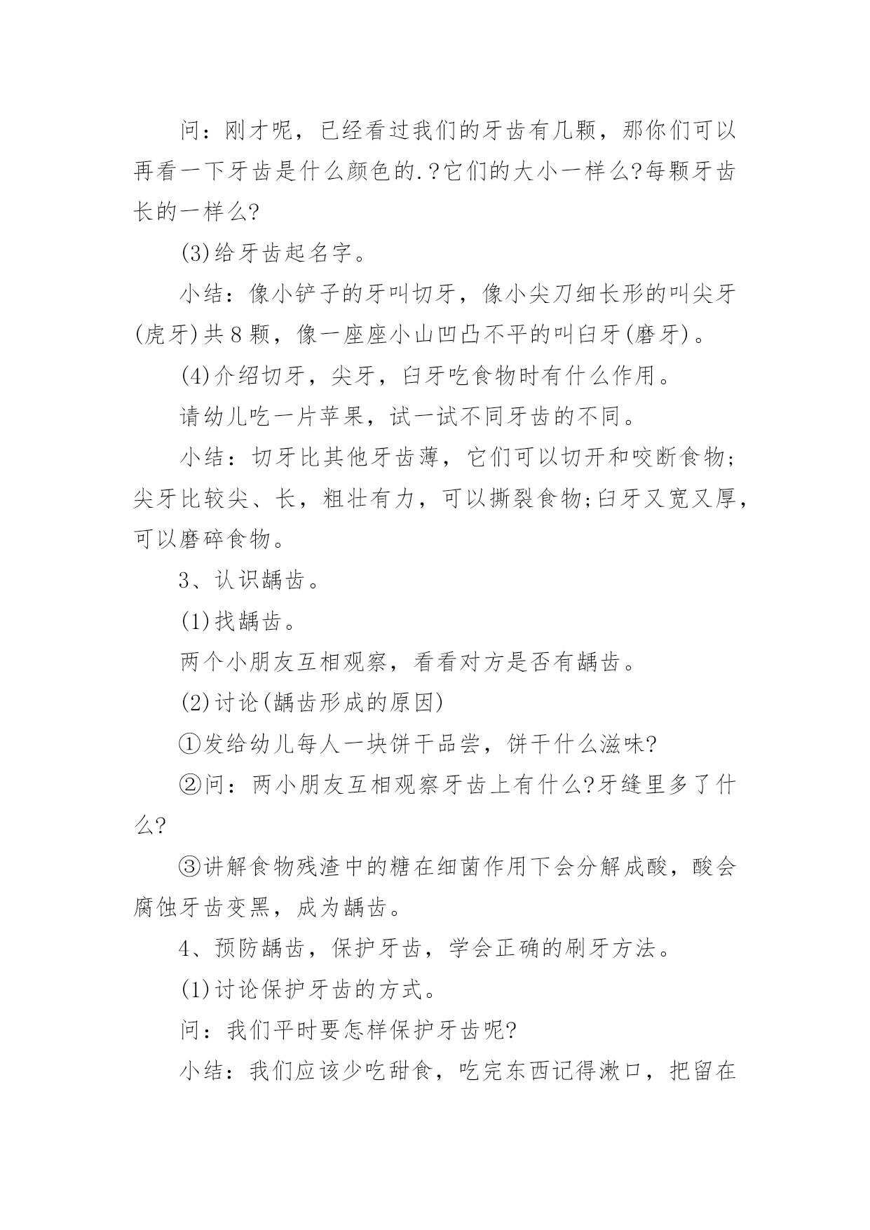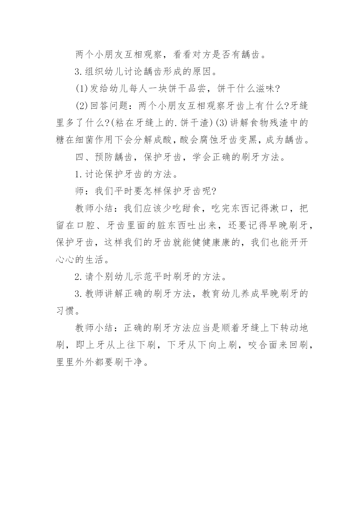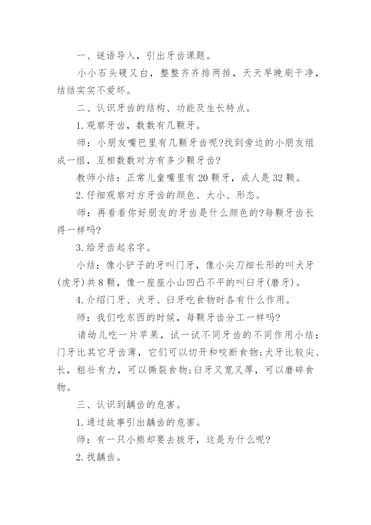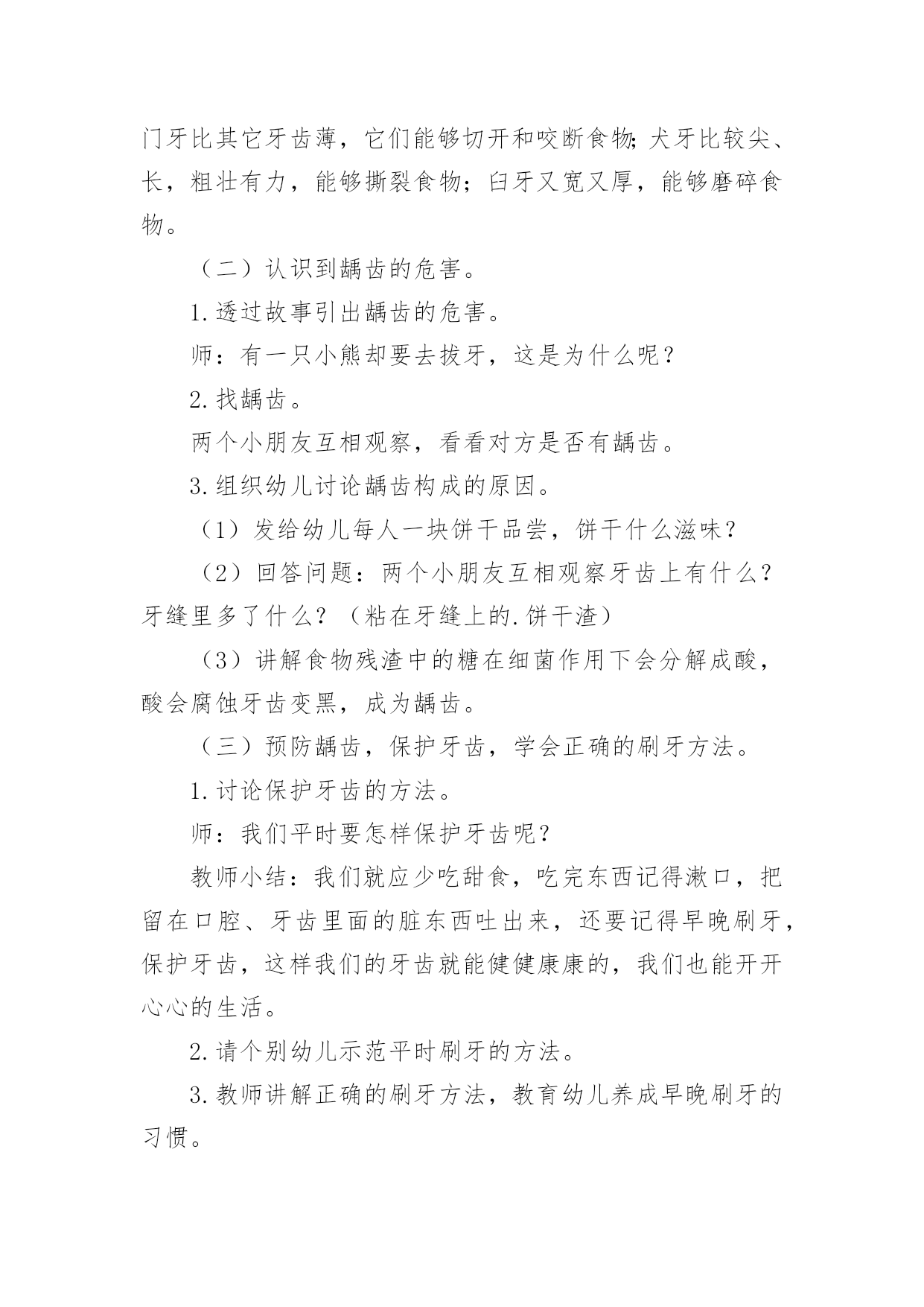 中班健康教案《早晚刷牙》中班健康教案《早晚刷牙》作为一位杰出的教职工,很有必要精心设计一份教案,借助教案可以提高教学质量,收到预期的教学效果。那么应当如何写教案呢?以下是小编整理的中班健康教案《早晚刷牙》,供大家参考借鉴,希望可以帮助到有需要的朋友。中班健康教案《早晚刷牙》1设计意图:在幼儿园,有很多幼儿家长会跟老师反应说自己的孩子比较贪吃,但是不喜欢刷牙,不知道如何保护牙齿,希望老师能帮忙教育一下。对于中班的幼儿来说,自我控制力发展不完善,导致很多幼儿存在龋齿问题,因此幼儿园的牙齿健康教育很重要。此次教育活动的设计充分考虑了中班幼儿的年龄特点和发展水平,通过采用故事,以小熊的故事使幼儿进入情境,让小熊一角色贯穿课堂,抓住幼儿的兴趣点和注意力,让幼儿充分认识到牙齿的重要性,从而学会保护牙齿,养成早晚刷牙的好习惯。活动目标:1.了解牙齿结构、功能及生长特点。2.学会正确的刷牙方法。3.从小培养爱刷牙、讲卫生的好习惯。活动重点:学会正确的刷牙方法。活动难点:了解牙齿结构、功能及生长特点。活动准备:关于保护牙齿的PPT、苹果若干、饼干若干、人手一把小牙刷和口杯。活动过程:一、开始部分谜语导入,引出牙齿课题:小小石头硬又白,整整齐齐排两排,天天早晚刷干净,结结实实不爱坏。二、基本部分(一)认识牙齿的结构、功能及生长特点。1.观察牙齿,数数有几颗牙。师:小朋友嘴巴里有几颗牙齿呢?找到旁边的小朋友组成一组,互相数数对方有多少颗牙齿?教师小结:正常儿童嘴里有20颗牙,成人是32颗。2.仔细观察对方牙齿的颜色、大小、形态。师:再看看你好朋友的牙齿是什么颜色的?每颗牙齿长得一样吗?3.给牙齿起名字。小结:像小铲子的牙叫门牙,像小尖刀细长形的叫犬牙(虎牙)共8颗,像一座座小山凹凸不平的叫臼牙(磨牙)。4.介绍门牙、犬牙、臼牙吃食物时各有什么作用。师:我们吃东西的时候,每颗牙齿分工一样吗?请幼儿吃一片苹果,试一试不同牙齿的不同作用小结:门牙比其它牙齿薄,它们能够切开和咬断食物;犬牙比较尖、长,粗壮有力,能够撕裂食物;臼牙又宽又厚,能够磨碎食物。(二)认识到龋齿的危害。1.透过故事引出龋齿的危害。师:有一只小熊却要去拔牙,这是为什么呢?2.找龋齿。两个小朋友互相观察,看看对方是否有龋齿。3.组织幼儿讨论龋齿构成的原因。(1)发给幼儿每人一块饼干品尝,饼干什么滋味?(2)回答问题:两个小朋友互相观察牙齿上有什么?牙缝里多了什么?(粘在牙缝上的.饼干渣)(3)讲解食物残渣中的糖在细菌作用下会分解成酸,酸会腐蚀牙齿变黑,成为龋齿。(三)预防龋齿,保护牙齿,学会正确的刷牙方法。1.讨论保护牙齿的方法。师:我们平时要怎样保护牙齿呢?教师小结:我们就应少吃甜食,吃完东西记得漱口,把留在口腔、牙齿里面的脏东西吐出来,还要记得早晚刷牙,保护牙齿,这样我们的牙齿就能健健康康的,我们也能开开心心的生活。2.请个别幼儿示范平时刷牙的方法。3.教师讲解正确的刷牙方法,教育幼儿养成早晚刷牙的习惯。三、结束活动教师小结:正确的刷牙方法应当是上牙从上往下刷,下牙从下向上刷,咬合面来回刷,里里外外都要刷干净。活动延伸:与家长进行家园交流,督促幼儿每天坚持早晚刷牙,并将孩子刷牙的瞬间以照片或视频的形式进行分享。中班健康教案《早晚刷牙》2活动目标:1、了解牙齿的结构,功能及生长特点。2、学会正确的刷牙方法。3、从小培养爱刷牙,讲卫生的好习惯。活动准备:PPT课件、一次性牙刷和口杯、苹果若干、饼干若干、镜子活动过程:1、导入:谜语:小小石头硬又白,整整齐齐排两排。天天早晚刷干净,结结实实不爱坏。2、认识牙齿的结构、功能及生长特点。(1)观察牙齿,数数有几颗牙。问:小朋友们,你们知道我们的小嘴巴有多少颗牙齿吗?你们可以看一下旁边小朋友有几个牙齿。小结:正常儿童嘴巴里有20颗牙、成人是32颗。(2)仔细观察牙齿的颜色、大小、形状。问:刚才呢,已经看过我们的牙齿有几颗,那你们可以再看一下牙齿是什么颜色的.?它们的大小一样么?每颗牙齿长的一样么?(3)给牙齿起名字。小结:像小铲子的牙叫切牙,像小尖刀细长形的叫尖牙(虎牙)共8颗,像一座座小山凹凸不平的叫臼牙(磨牙)。(4)介绍切牙,尖牙,臼牙吃食物时有什么作用。请幼儿吃一片苹果,试一试不同牙齿的不同。小结:切牙比其他牙齿薄,它们可以切开和咬断食物;尖牙比较尖、长,粗壮有力,可以撕裂食物;臼牙又宽又厚,可以磨碎食物。3、认识龋齿。(1)找龋齿。两个小朋友互相观察,看看对方是否有龋齿。(2)讨论(龋齿形成的原因)①发给幼儿每人一块饼干品尝,饼干什么滋味?②问:两小朋友互相观察牙齿上有什么?牙缝里多了什么?③讲解食物残渣中的糖在细菌作用下会分解成酸,酸会腐蚀牙齿变黑,成为龋齿。4、预防龋齿,保护牙齿,学会正确的刷牙方法。(1)讨论保护牙齿的方式。问