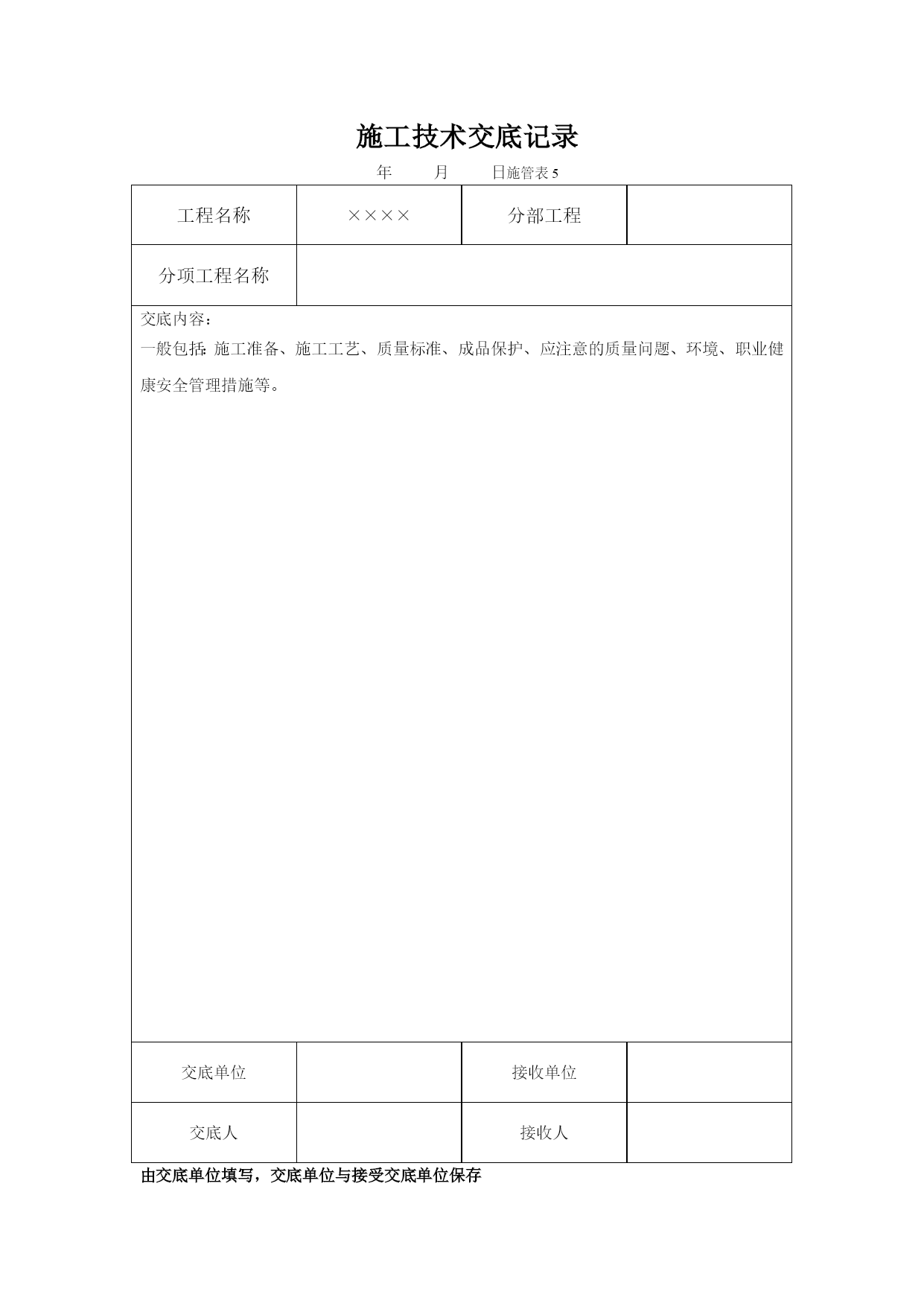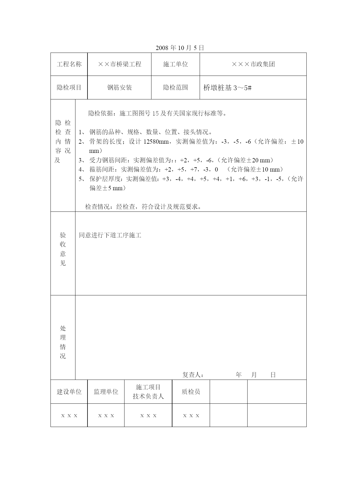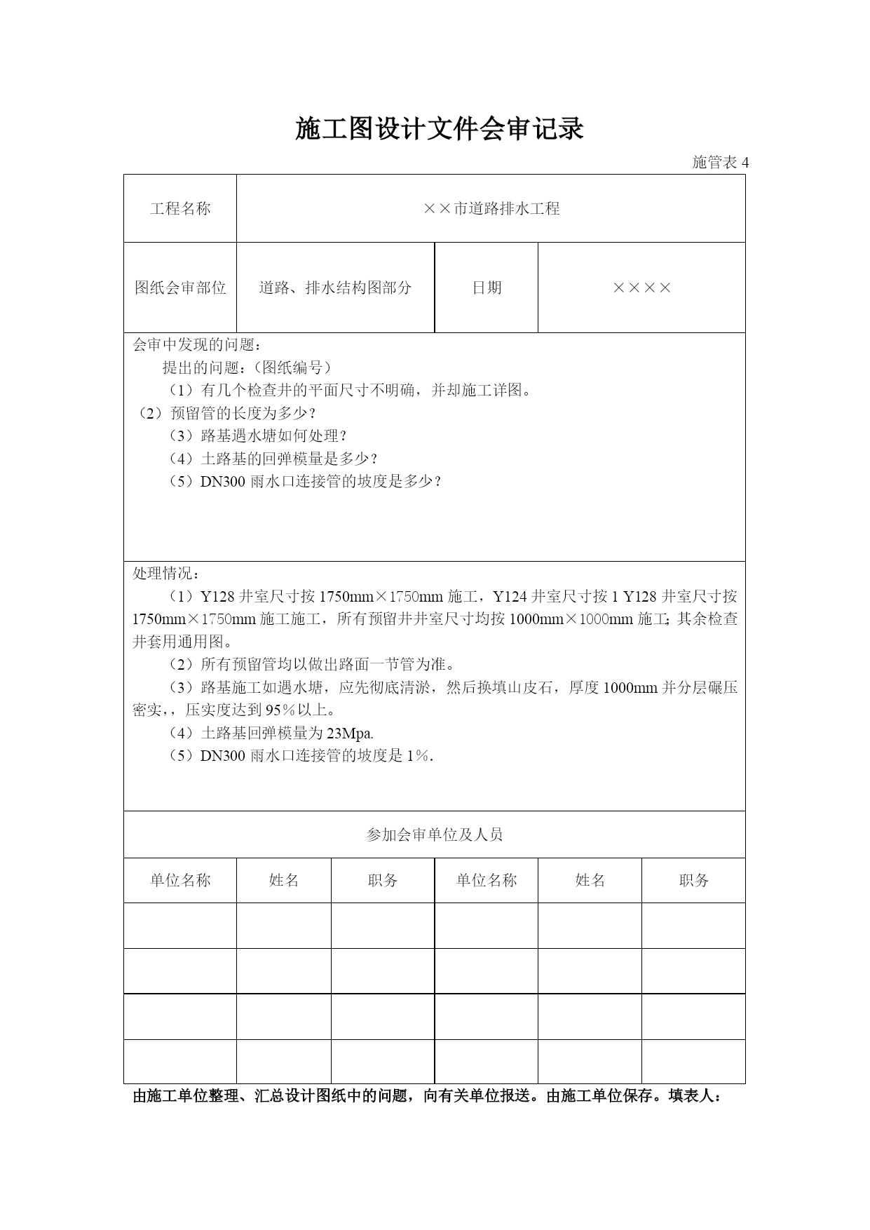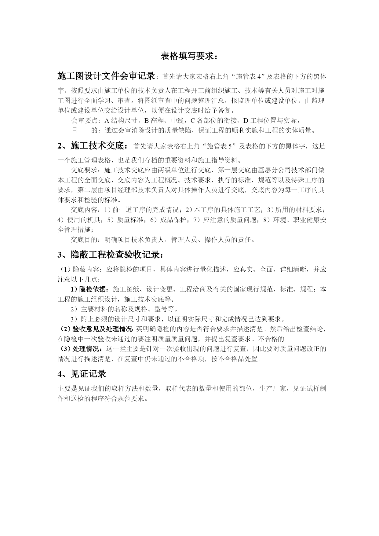 资料表格填写范例优质资料(可以直接使用,可编辑优质资料,欢迎下载)第一部分市政工程通用表格沈阳市政集团技术质量部2021年启用表格填写要求:施工图设计文件会审记录:首先请大家表格右上角“施管表4”及表格的下方的黑体字,按照要求由施工单位的技术负责人在工程开工前组织施工、技术等有关人员对施工对施工图进行全面学习、审查。将图纸审查中的问题整理汇总,报监理单位或建设单位,由监理单位或建设单位交给设计单位,以便在设计交底时给予答复。会审要点:A结构尺寸,B高程、中线。C各部位的衔接,D工程位置与实际。目的:通过会审消除设计的质量缺陷,保证工程的顺利实施和工程的实体质量。2、施工技术交底:首先请大家表格右上角“施管表5”及表格的下方的黑体字,这是一个施工管理表格,也是我们存档的重要资料和施工指导资料。交底要求:施工技术交底应由两级单位进行交底、第一层交底由基层分公司技术部门做本工程的全面交底,交底内容为工程概况、技术要求、执行的标准、规范等以及特殊工序的要求,第二层由项目经理部技术负责人对具体操作人员进行交底,交底内容为每一工序的具体要求和检验的标准。交底内容:1)前一道工序的完成情况;2)本工序的具体施工工艺;3)所用的材料要求;4)使用的机具;5)质量标准;6)成品保护;7)应注意的质量问题;8)环境、职业健康安全管理措施;交底目的:明确项目技术负责人,管理人员、操作人员的责任。3、隐蔽工程检查验收记录:(1)隐蔽内容:应将隐检的项目,具体内容进行量化描述,应真实、全面、详细清晰,并应注意以下几点:1)隐检依据:施工图纸、设计变更、工程洽商及有关的国家现行规范、标准、规程;本工程的施工组织设计,施工技术交底等。2)主要材料的名称及规格、型号等。3)附上必须的设计尺寸和要求,以证明实际尺寸和完成情况已达到要求。(2)验收意见及处理情况:英明确隐检的内容是否符合要求并描述清楚。然后给出检查结论,在隐检中一次验收未通过的要注明质量质量问题,并提出复查要求。不合格的(3)处理情况:这一拦主要是针对一次验收出现的问题进行复查,因此要对质量问题改正的情况进行描述清楚,在复查中仍未通过的不合格项,按不合格品处置。4、见证记录主要是见证我们的取样方法和数量,取样代表的数量和使用的部位,生产厂家,见证试样制作和送检的程序符合规范要求。施工图设计文件会审记录施管表4工程名称××市道路排水工程图纸会审部位道路、排水结构图部分日期××××会审中发现的问题:提出的问题:(图纸编号)(1)有几个检查井的平面尺寸不明确,并却施工详图。(2)预留管的长度为多少?(3)路基遇水塘如何处理?(4)土路基的回弹模量是多少?(5)DN300雨水口连接管的坡度是多少?处理情况:(1)Y128井室尺寸按1750mm×1750mm施工,Y124井室尺寸按1Y128井室尺寸按1750mm×1750mm施工施工,所有预留井井室尺寸均按1000mm×1000mm施工;其余检查井套用通用图。(2)所有预留管均以做出路面一节管为准。(3)路基施工如遇水塘,应先彻底清淤,然后换填山皮石,厚度1000mm并分层碾压密实,,压实度达到95%以上。(4)土路基回弹模量为23Mpa.(5)DN300雨水口连接管的坡度是1%.参加会审单位及人员单位名称姓名职务单位名称姓名职务由施工单位整理、汇总设计图纸中的问题,向有关单位报送。由施工单位保存。填表人:施工技术交底记录年月日施管表5工程名称××××分部工程分项工程名称交底内容:一般包括:施工准备、施工工艺、质量标准、成品保护、应注意的质量问题、环境、职业健康安全管理措施等。交底单位接收单位交底人接收人由交底单位填写,交底单位与接受交底单位保存表B.0.1分项工程(验收批)质量验收记录编号:—————工程名称分部工程名称土方工程分项工程名称施工单位专业工长项目经理验收批名称、部位A分包单位分包项目经理施工班组长主控项目质量验收规范规定的检查项目及验收标准施工单位检查评定记录监理(建设)单位验收记录1234合格率5合格率6一般项目123合格率合格率合格率合格率合格率合格率合格率合格率合格率合格率合格率施工单位检查评定结果合格项目专业质量检查员:年月日监理(建设)单位验收结论合格监理工程师(建设单位项目专业技术负责人)年月日表B.0.1分项工程(验收批)质量验收记录表编号:工程名称分部工程名称分项工程名称施工单位专业工长项目经理验收批名称、部位分包单位分包项目经理施工班组长主控项目质量验收规范规定的检查项目及验收标准施工单位检查评定记录符合《给水排水管道工程施工及验收规范》G